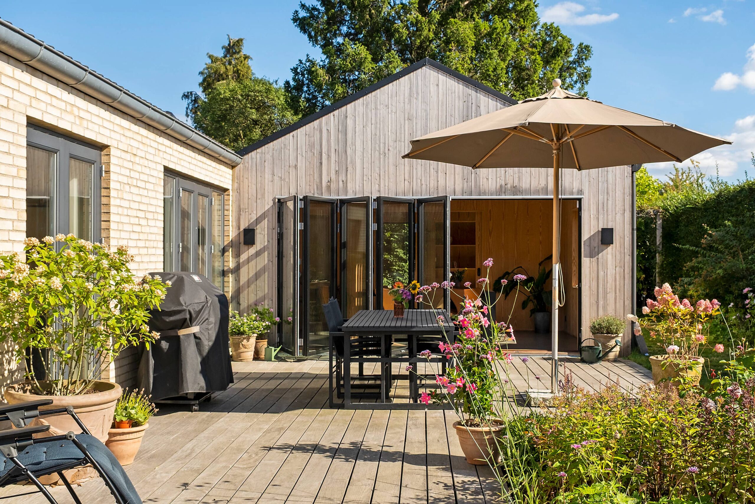 Lige om lidt er der blade på træerne og fest på terrassen med urter og blomster i krukkerne.