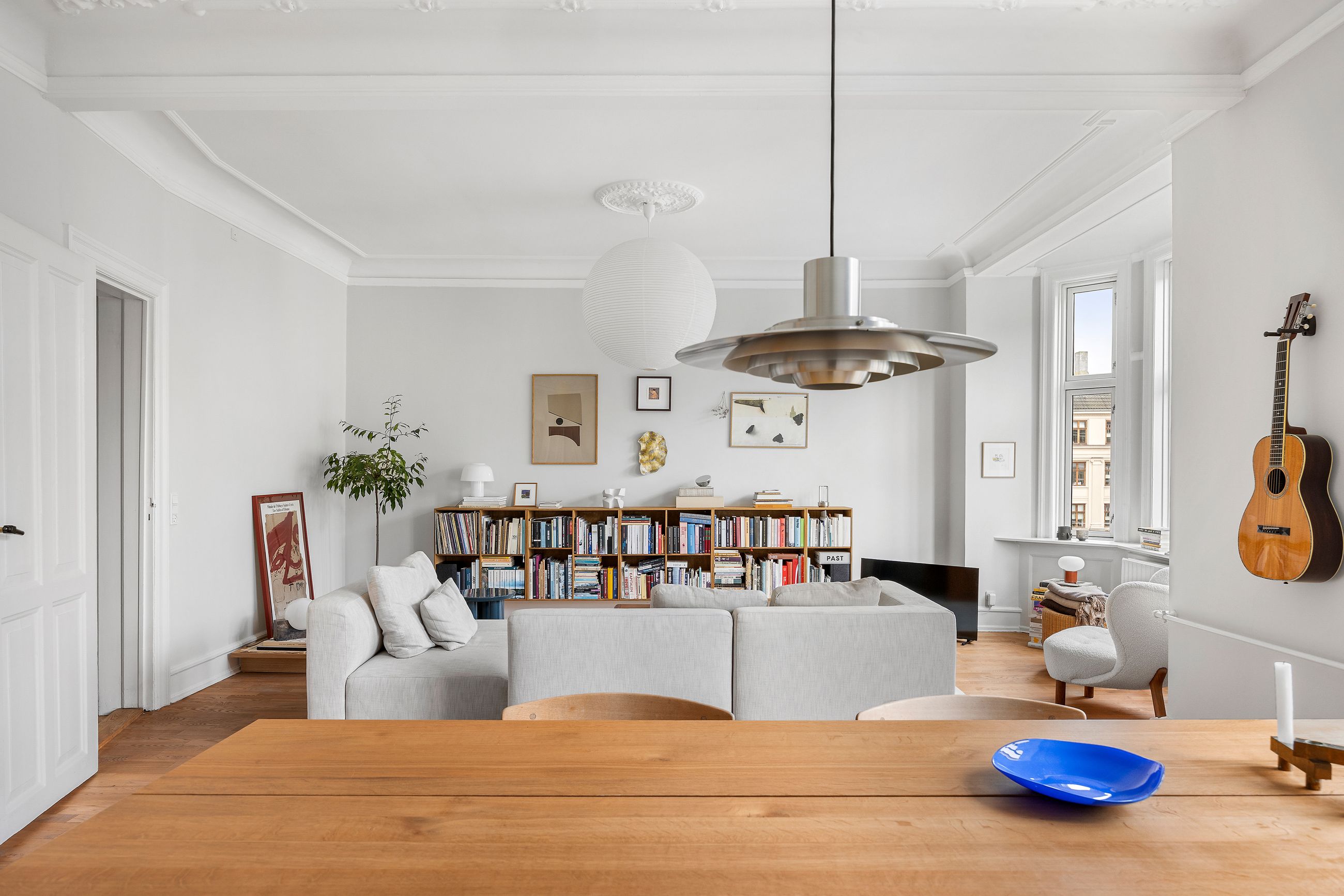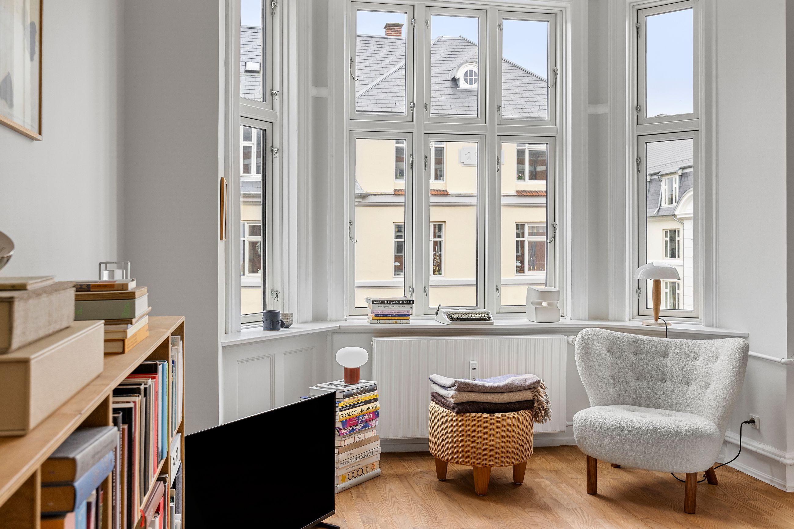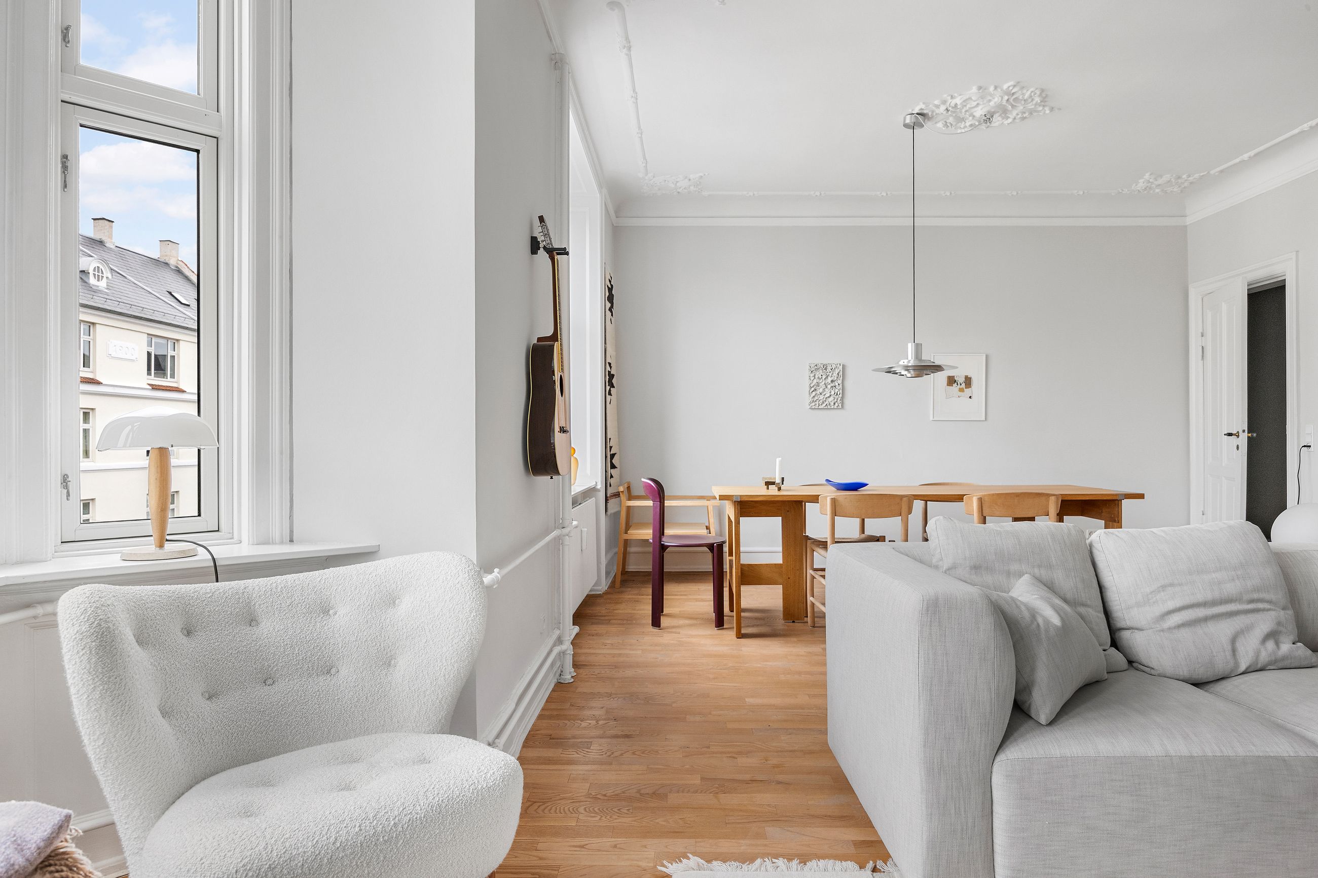 Den tidligere matematiker og politiker Adolph Steen er manden bag vejskiltet Adolph Steens Allé. Vejene i kvarteret er opkaldt efter videnskabsmænd, eller videnskabspersoner, som man med et overbærende smil på læben siger i dag. Vejen er lille og stille, ikke meget trafik her. Selvtak. Ejendommen Adolph Steens Allé 5 er fra 1905, altså fra begyndelsen af perioden Bedre Byggeskik, som var et opgør med tidens pyntesyge og dårligt byggede ejendomme. Typisk for facaderne i Bedre Byggeskik er den ærlige, røde mursten med farvede gesimser. Lejligheden på 3. sal er på 90 m2 med det smukkeste lysindfald fra den skeløjede karnap, hvor man kan se både til højre og venstre. Lejligheden har udsigt til grønne træer og det fine tårn på det gamle radiohus. Skøn gårdhave med græs og terrasse.