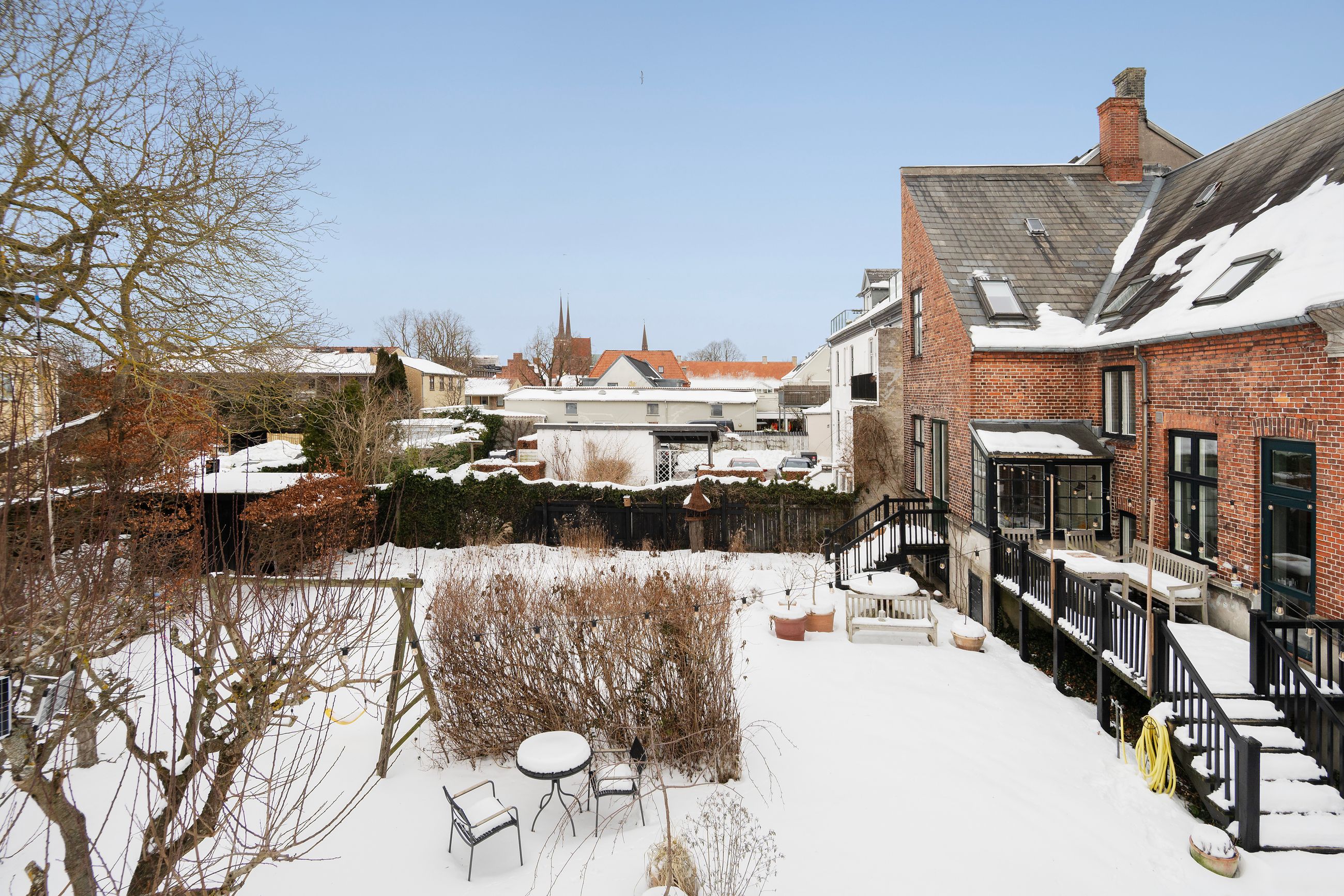 Matriklen i Allehelgensgade er på 705 m2 med en have så stille og rolig, at man kan høre, når fuglene trækker vejret. Her er bevaringsværdige træer, der kaster skygger om sommeren. Gågaden med caféerne, restauranterne og de lækre butikker er et par minutter væk. Og med Boserup Skov lige uden for byen og fjorden lige om hjørnet fylder naturen en del i Roskilde. Huset er ideelt til børnefamilien, som vægter æstetik lige så højt som praktik. For det er nemt at bo her, hverdagens logitik er på plads med toget til København på 20 minutter, institutioner og skoler er få gåminutter uden for døren. Roskilde er et godt eksempel på en by, som siden middelalderen altid har forstået at forny sig, altid at bringe sin egen fortid med ind i nutiden.