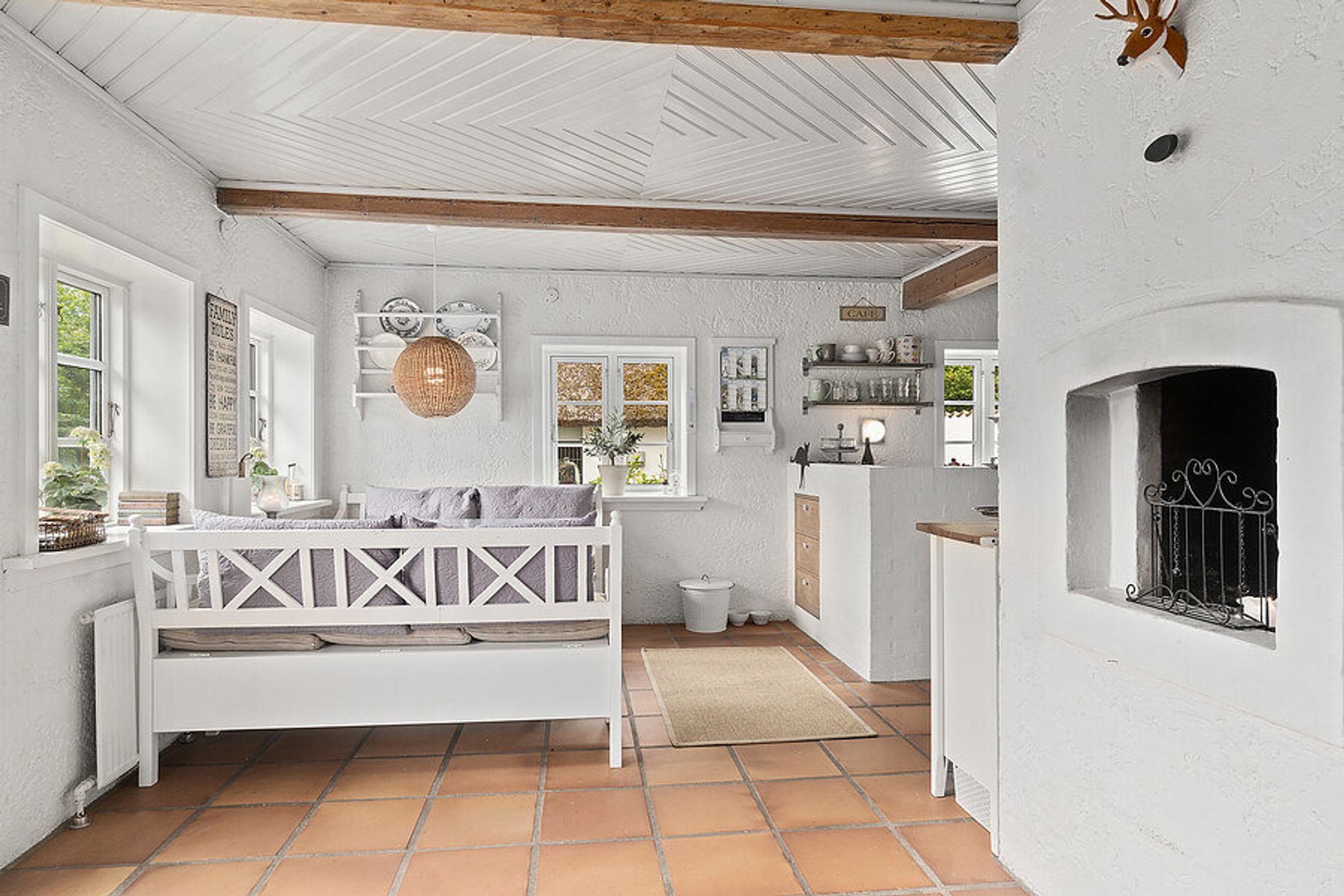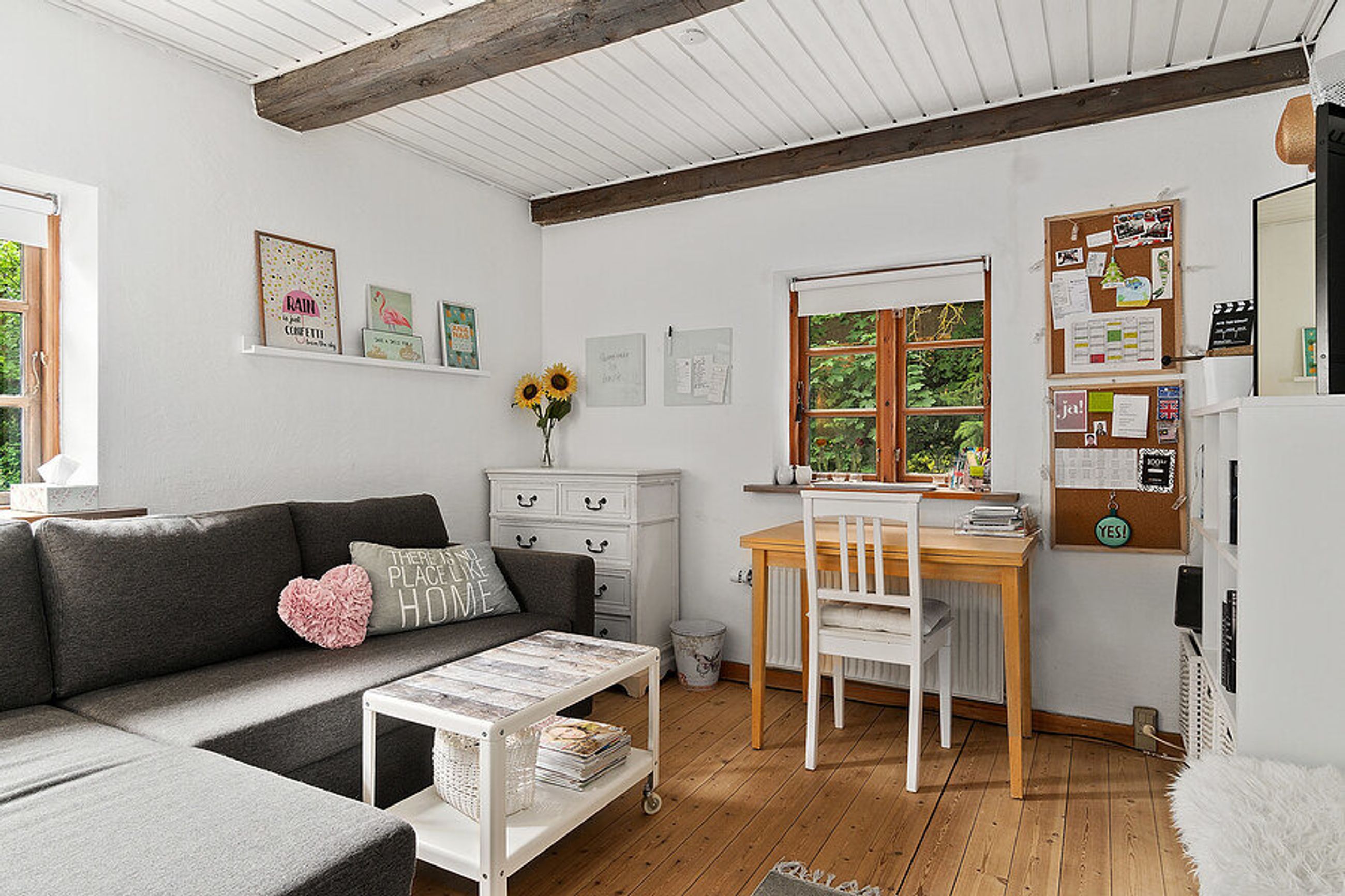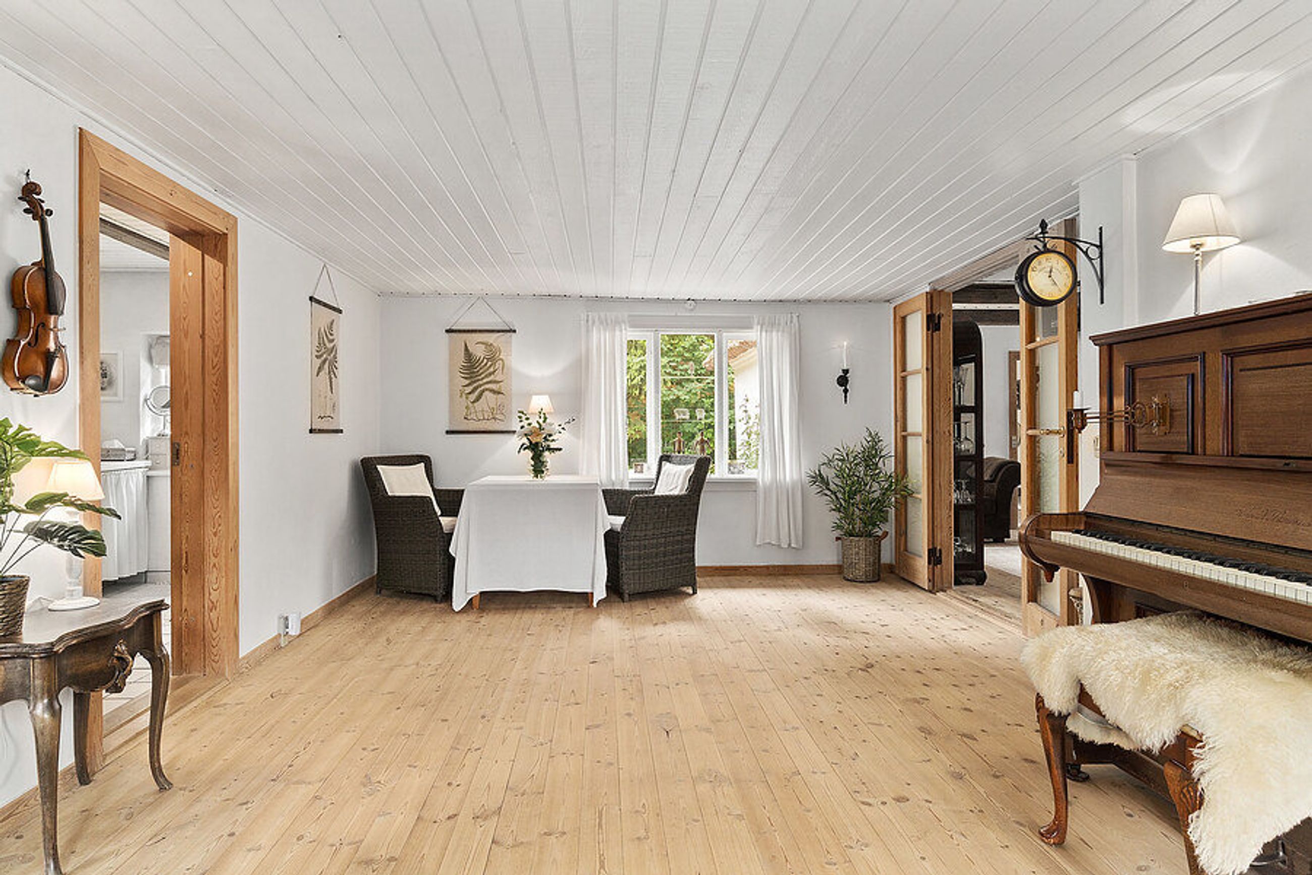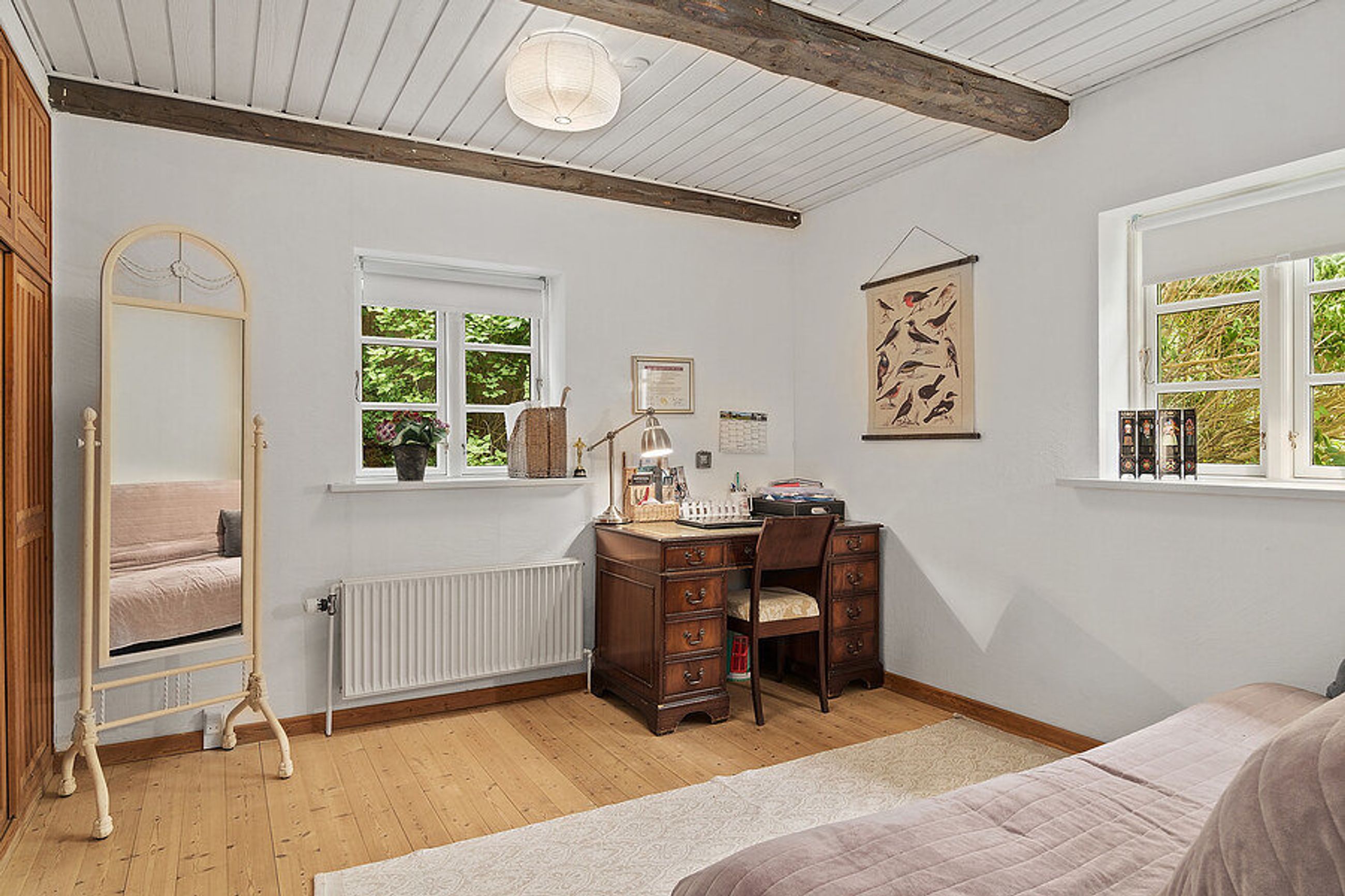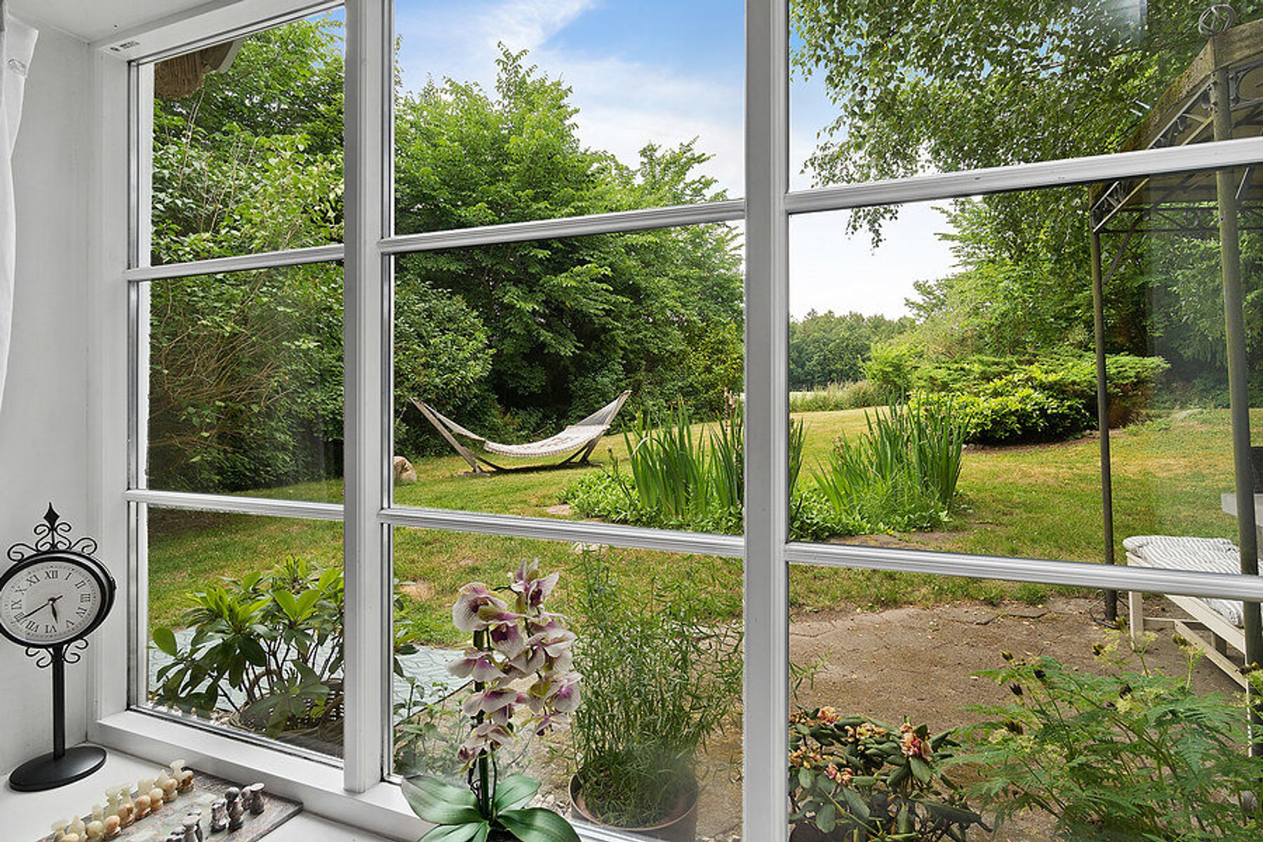 Der er 2 stuer, hvor den ene har et stort vindue der vender ud til haven – med en fantastisk udsigt til mark og skov. Her er der rig mulighed for at følge med i de forskellige årstider, og kikke på dyrelivet.