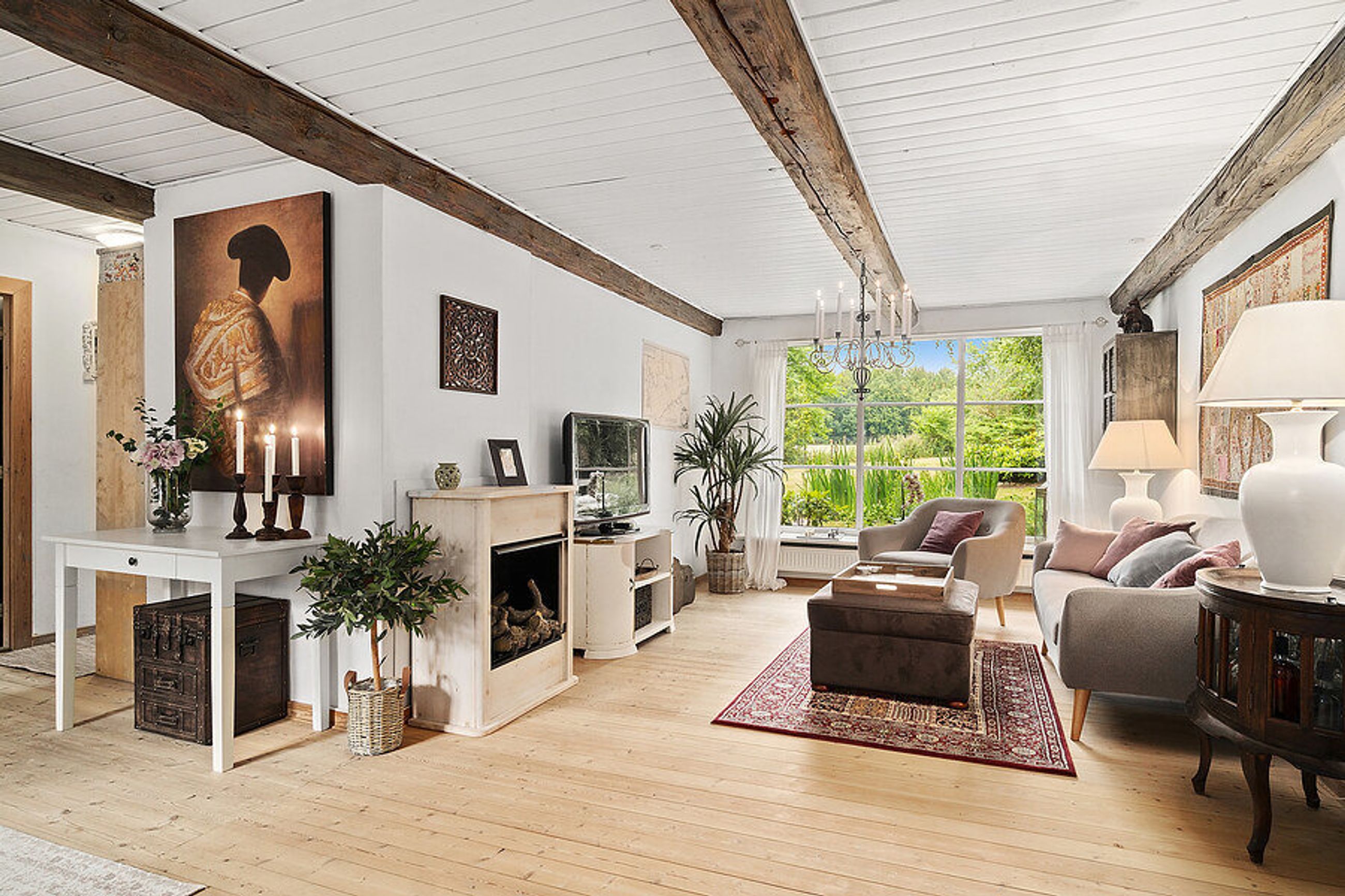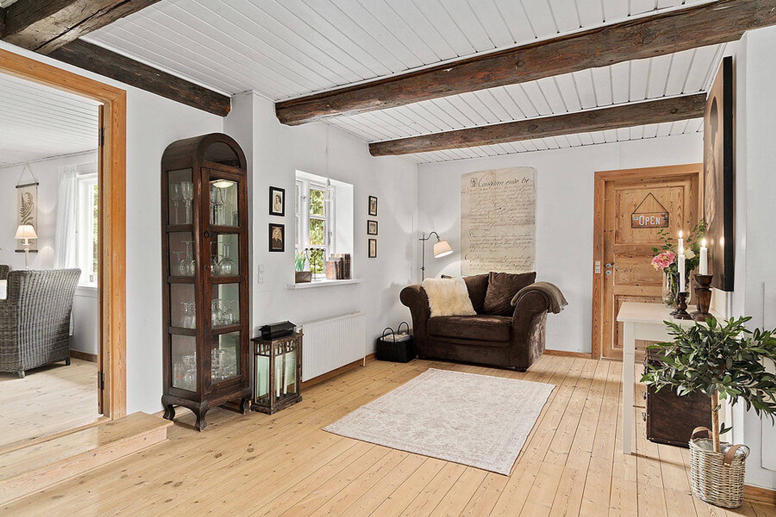 Husets stråtag giver et godt indeklima og i de fleste rum er der flotte synlige bjælker.