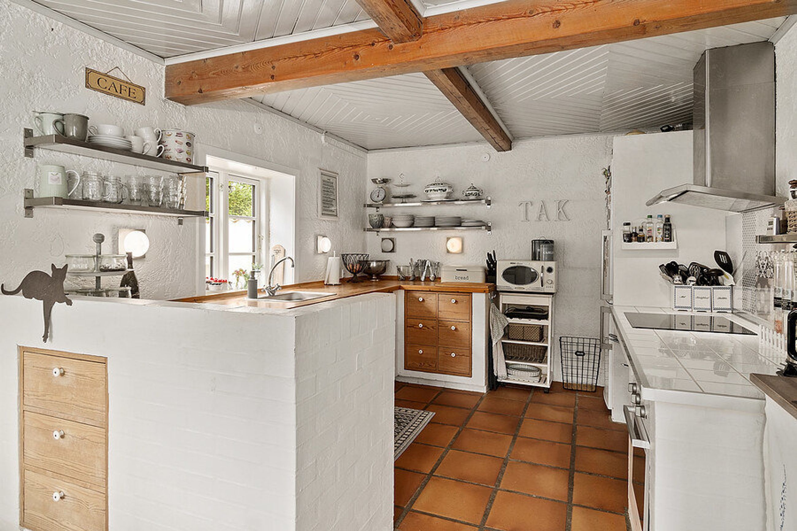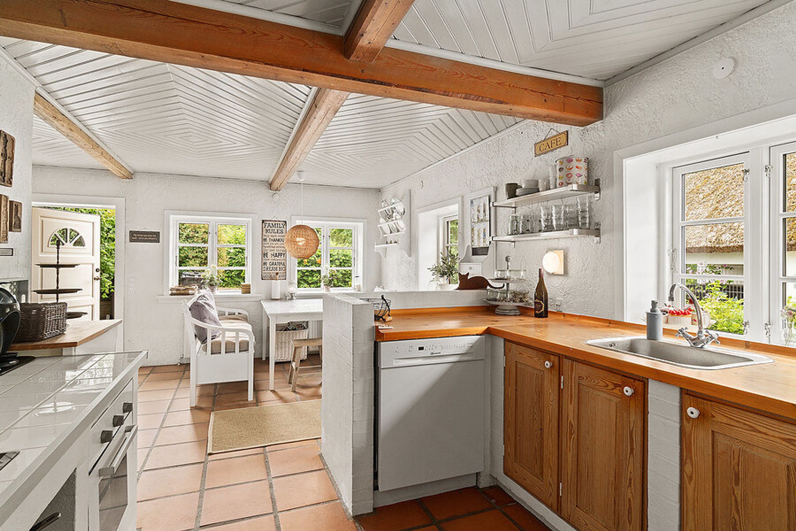 I køkkenet er der en åben pejs, køkkenbord og skabe af massivt træ og et unikt sildebens-træloft.