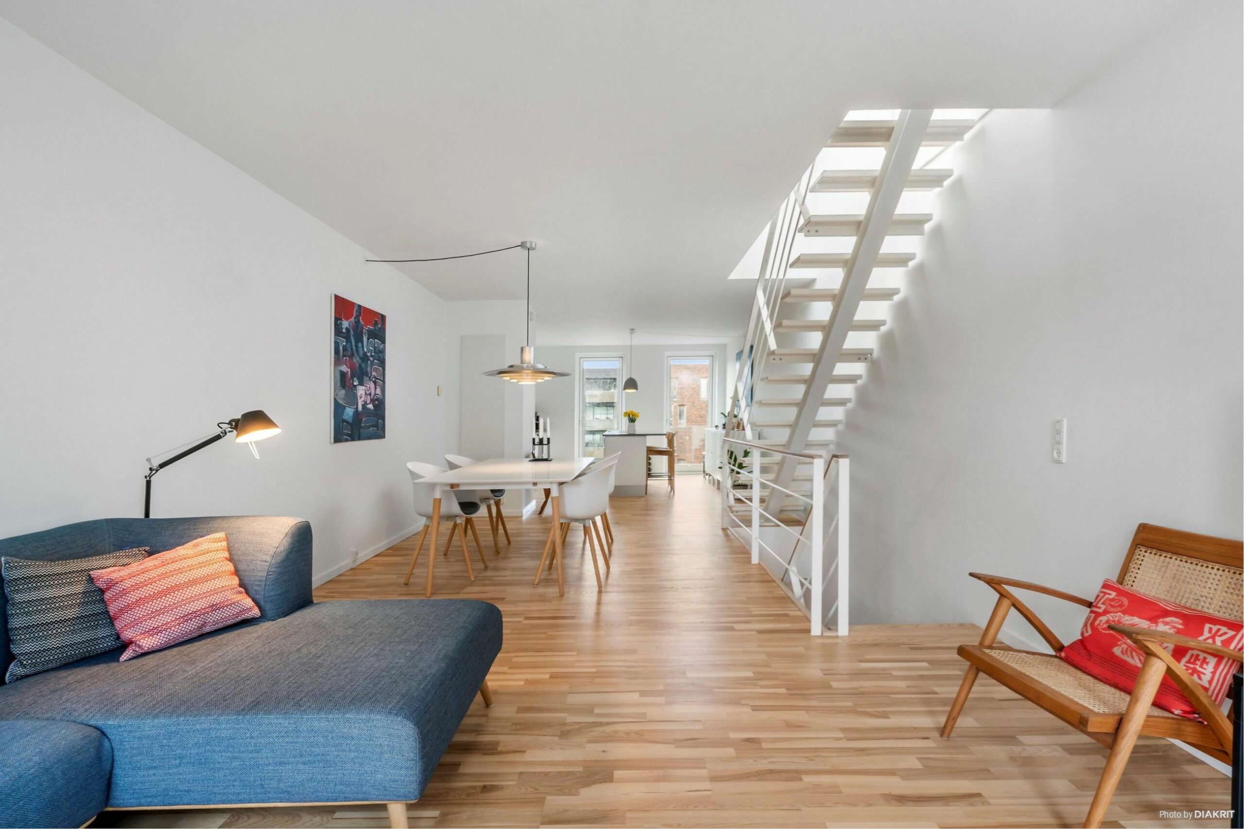 This lovely apartment located in the popular Sluseholmskvarter, surrounded by beautiful canals, offers 120 square meters of living space spread over 2 levels and approx. 35 square meters of terrace.
