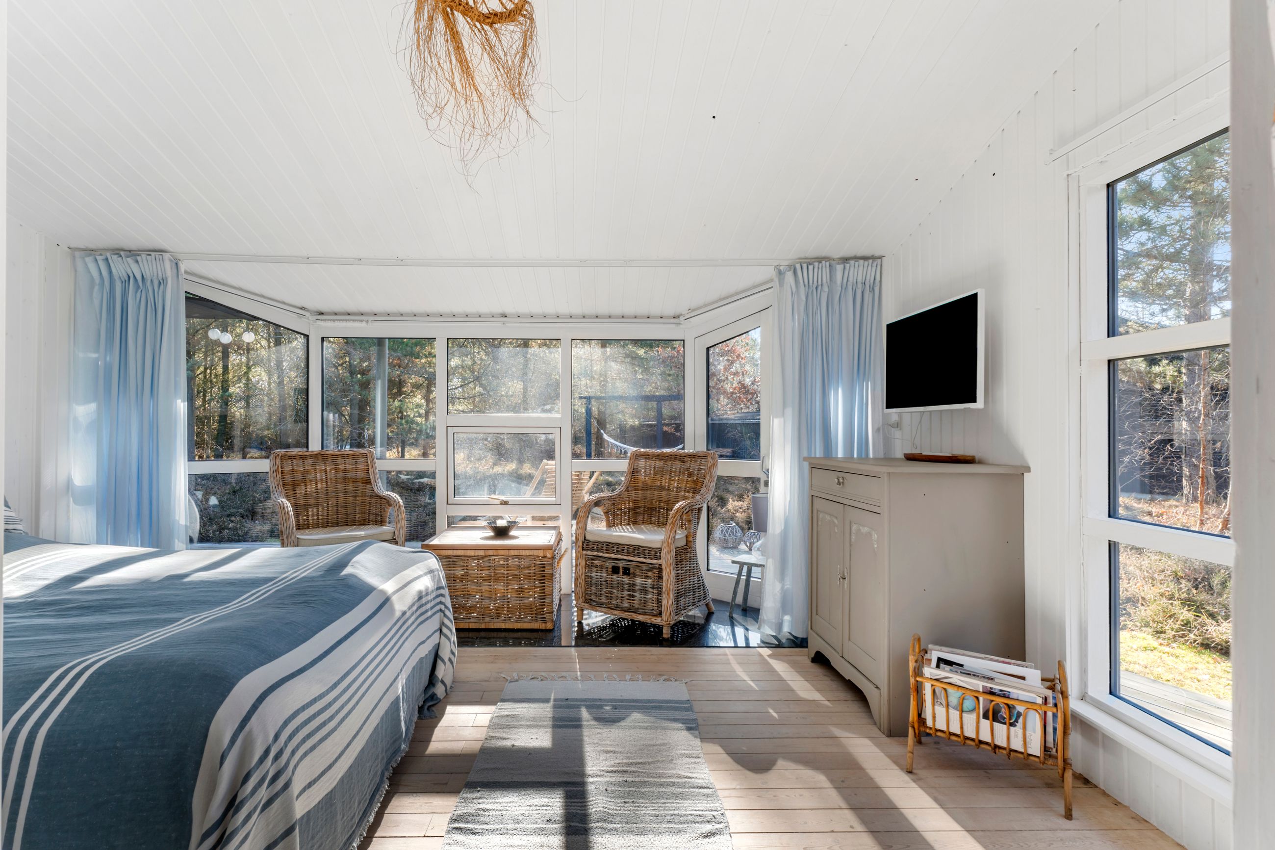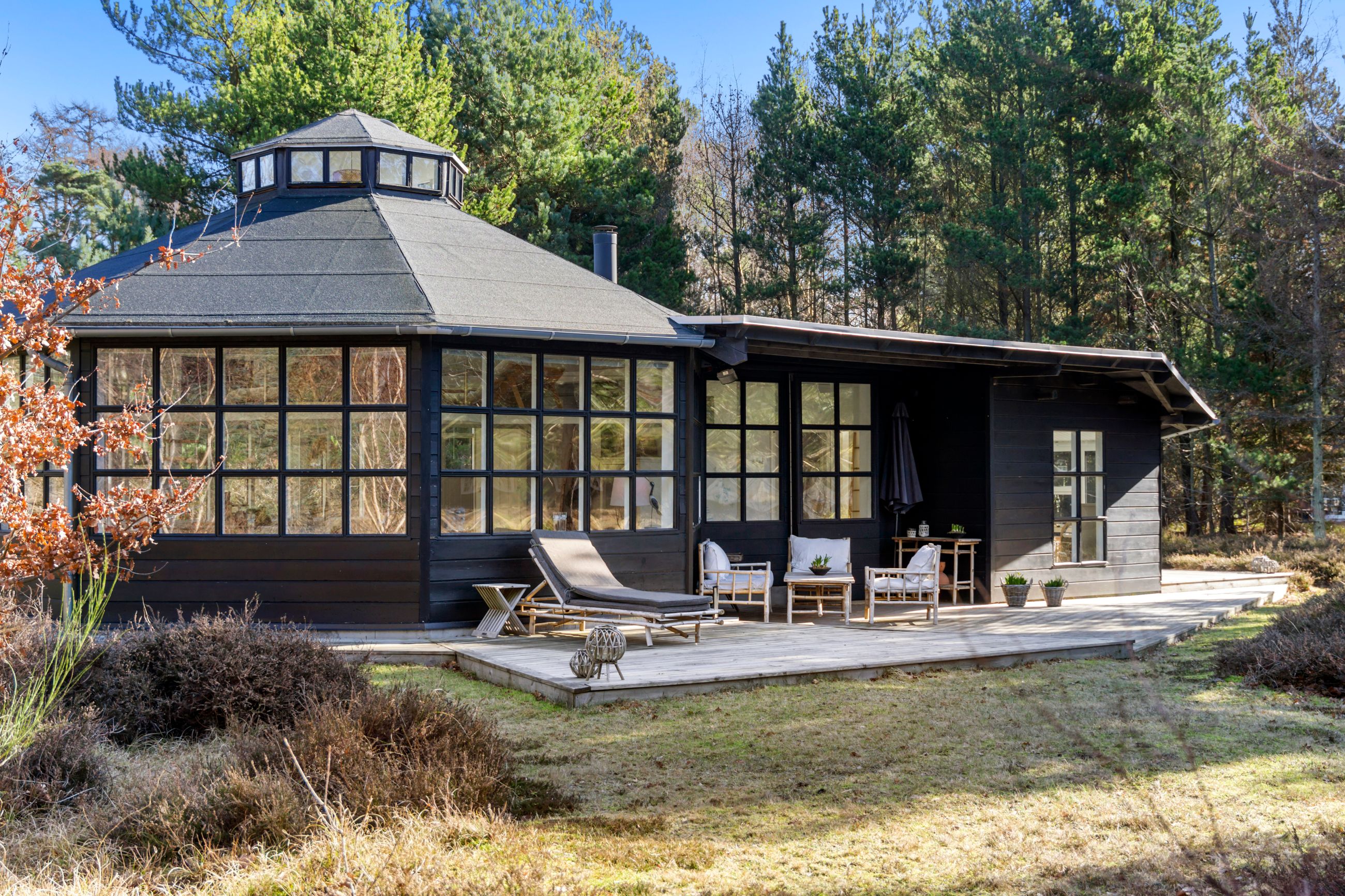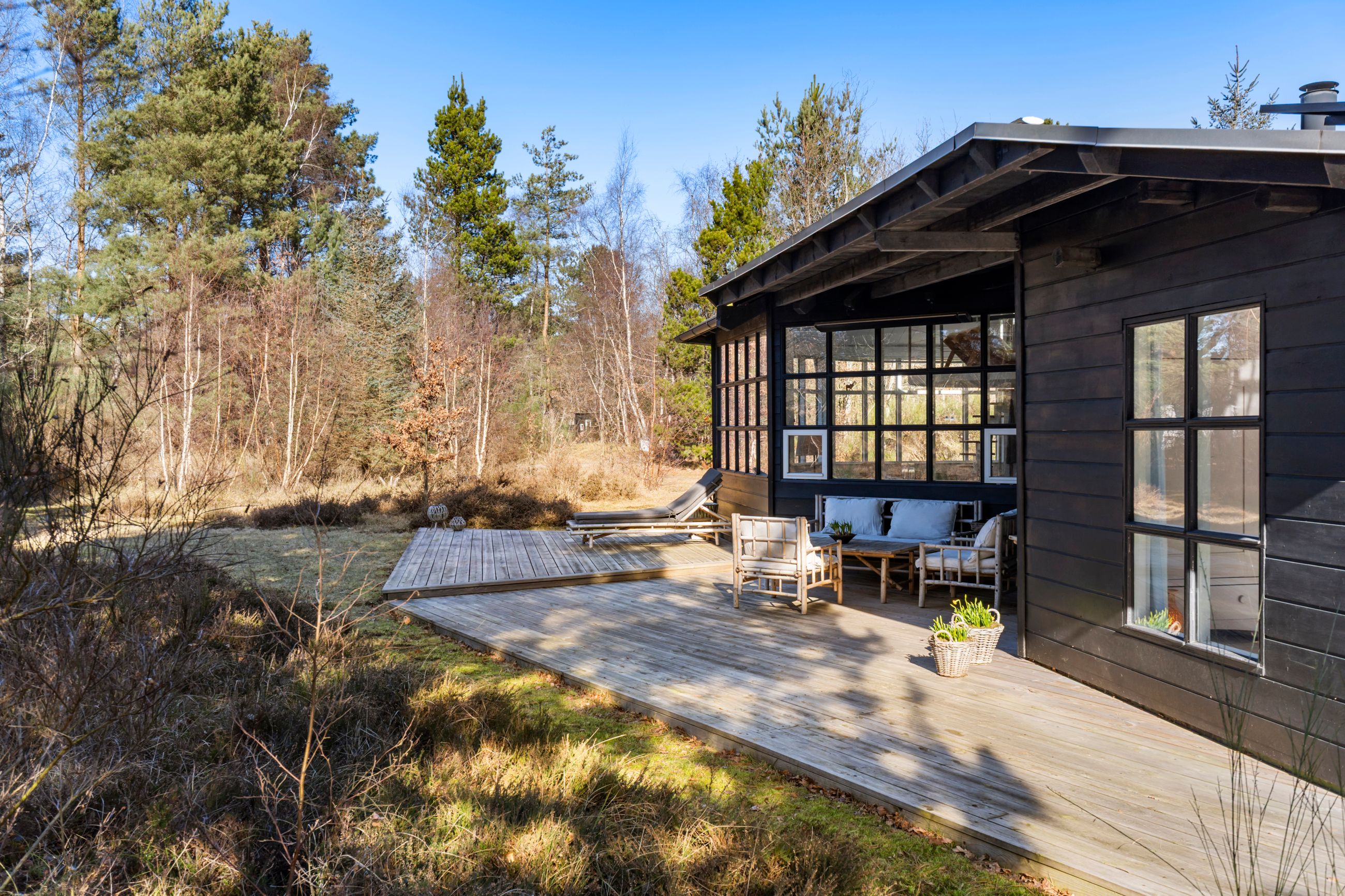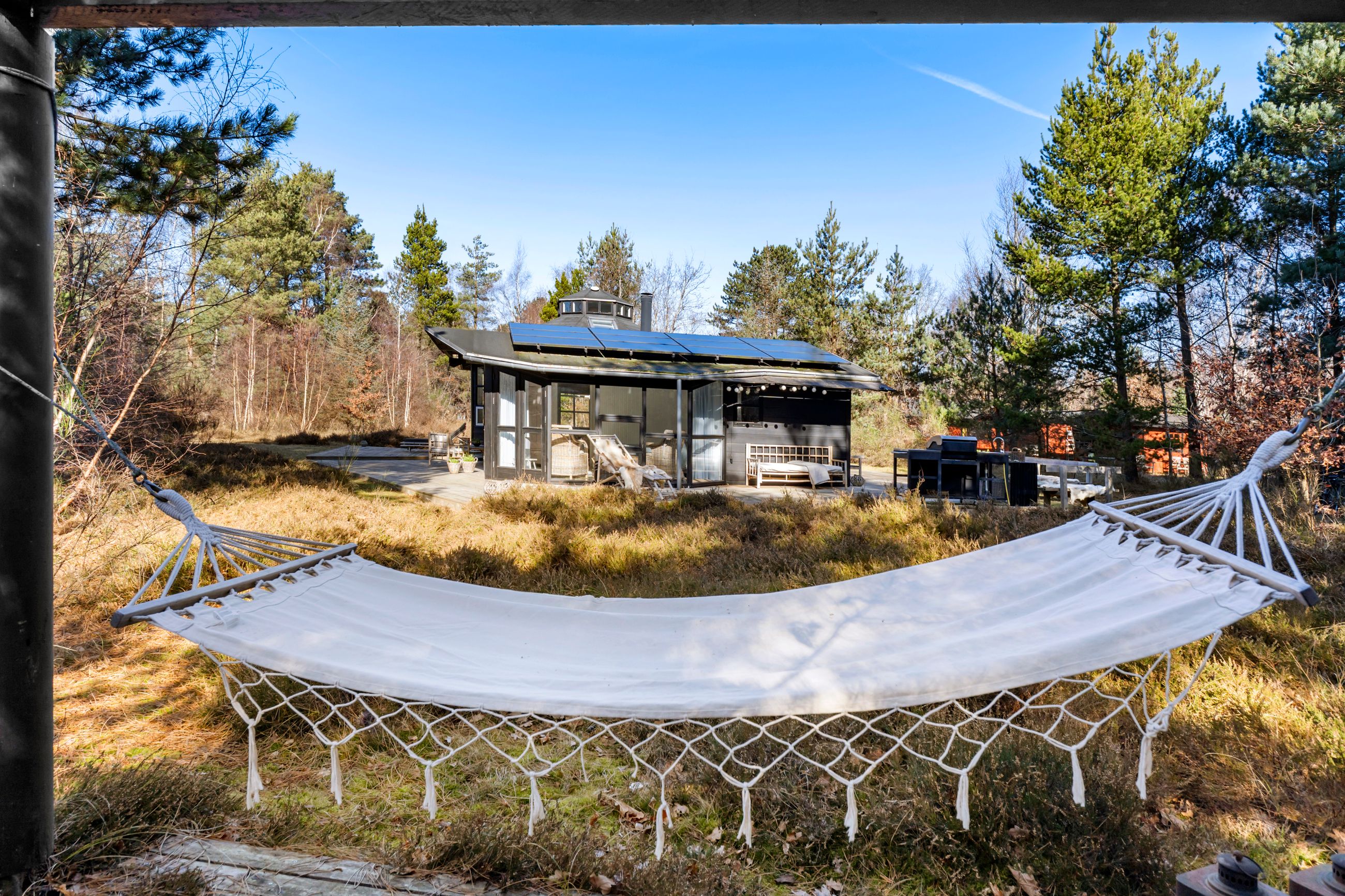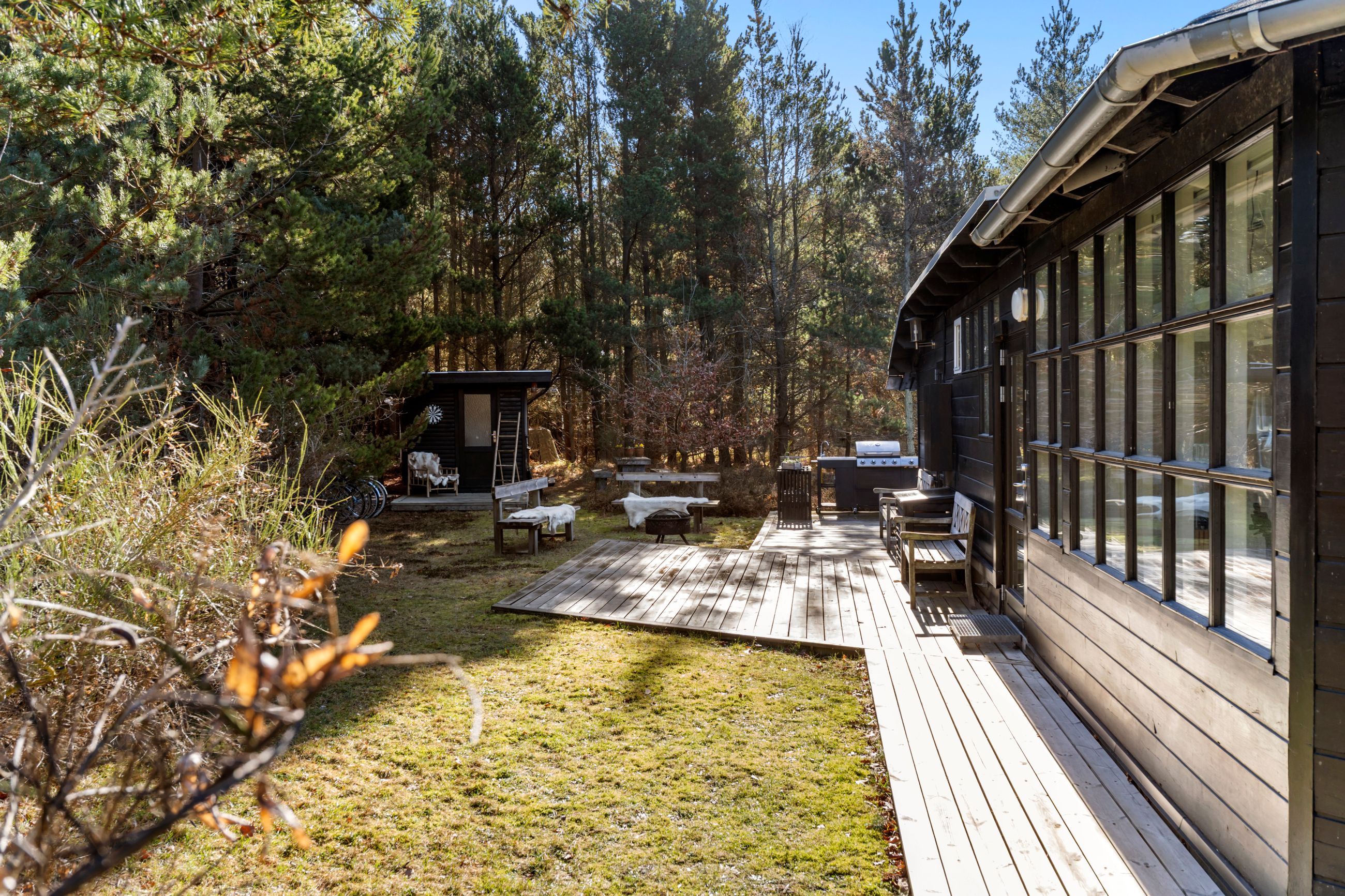Huset står på sin egen terrasseø, altså sol på maverne hele dagen. Grunden er på 1.219 m2 og vild med vilje. Der er rådyrøjne med rålam i græsserne og fugle i luften, som pifter og blinker med det ene øje, når de flyver forbi. En spætte sidder i et træ og hakker, et egern har sin faste morgenrute i træerne, en hanfasan skryder foran en hunfasan og ræven jager mus i lyngen. Stranden for enden af vejen er børnevenlig og en af de bedste på Sjælland. Alt er stille inde og ude. Uret er gået i stå. Med annekset er her 10 sovepladser.