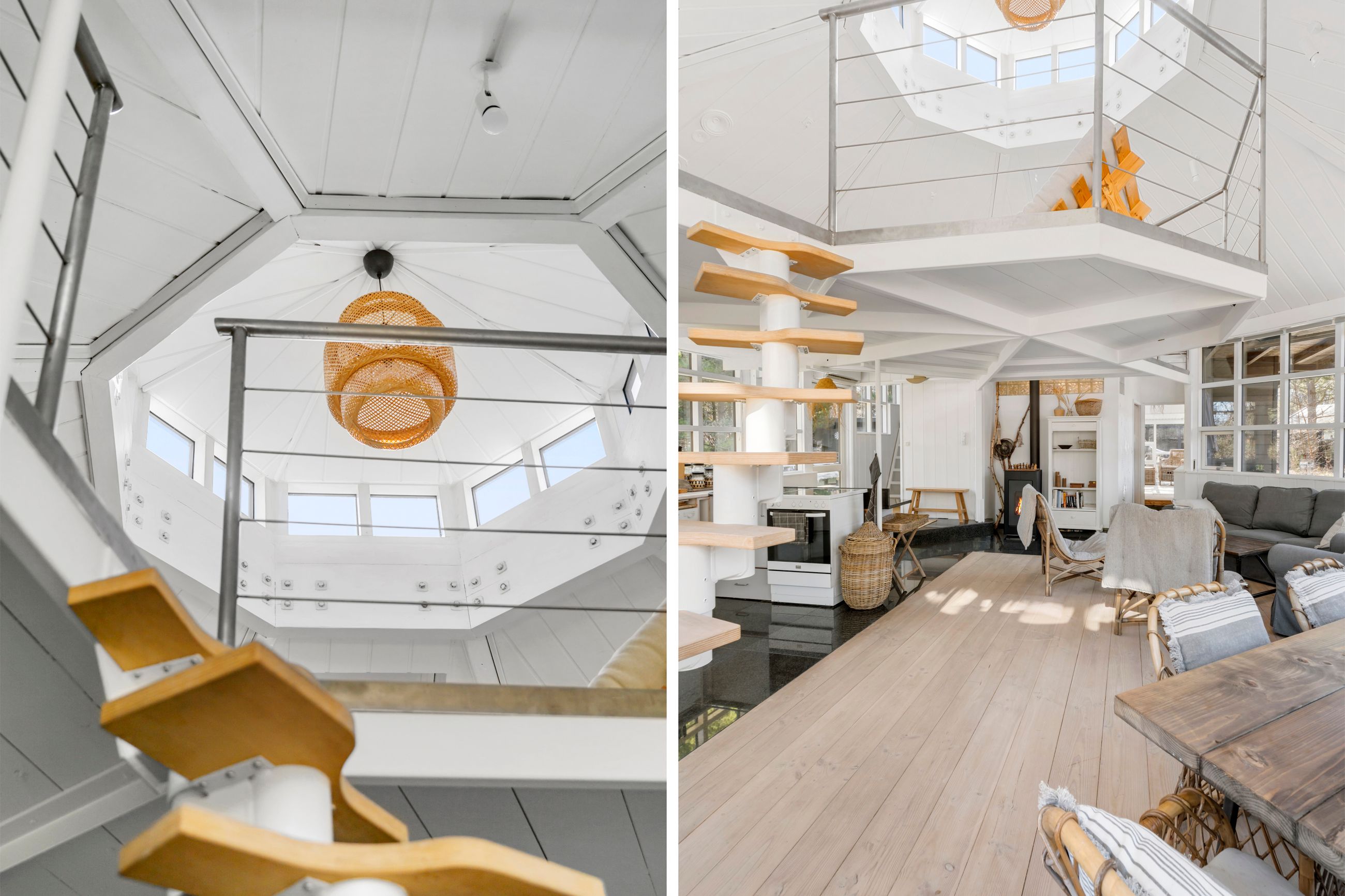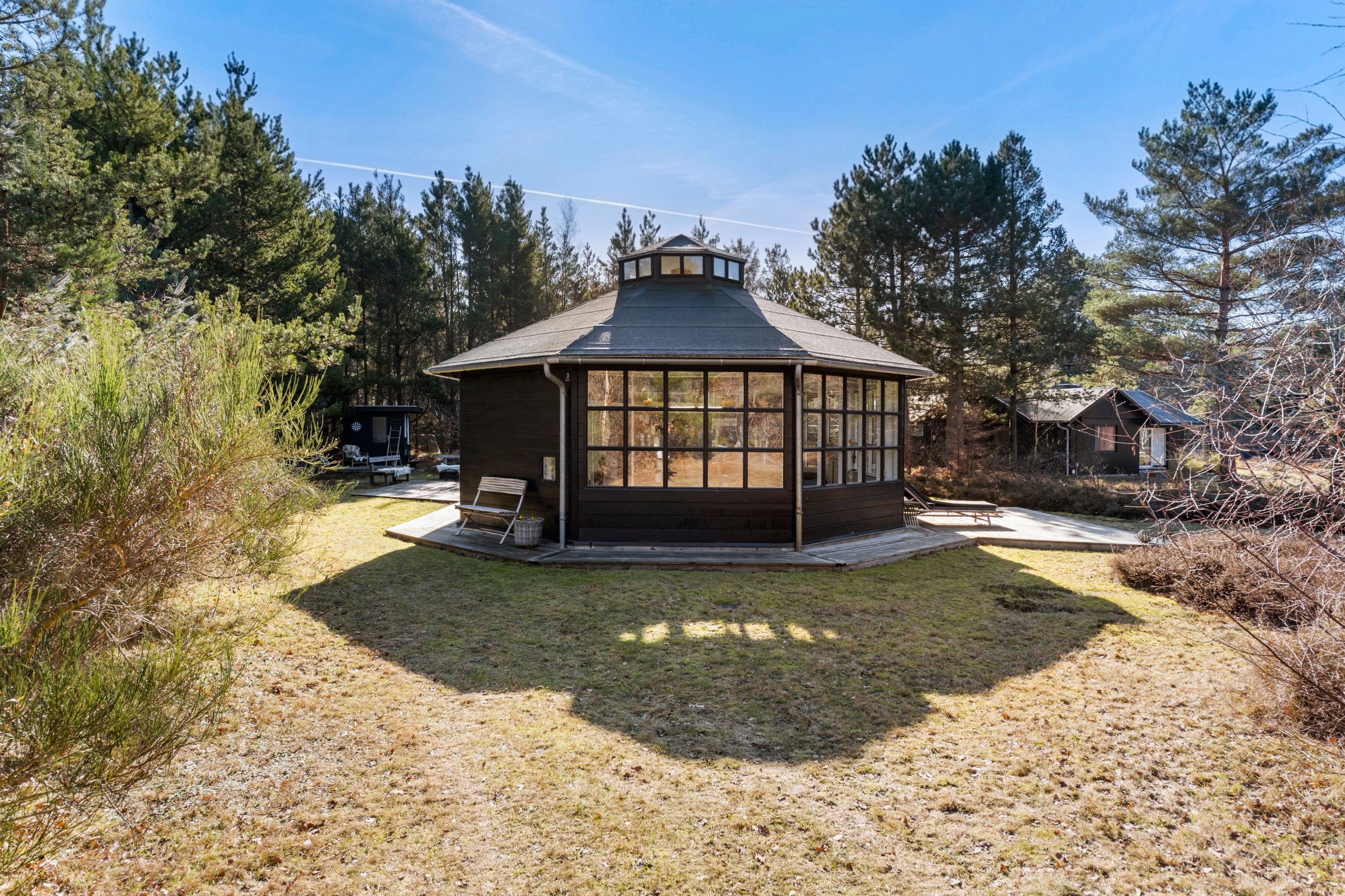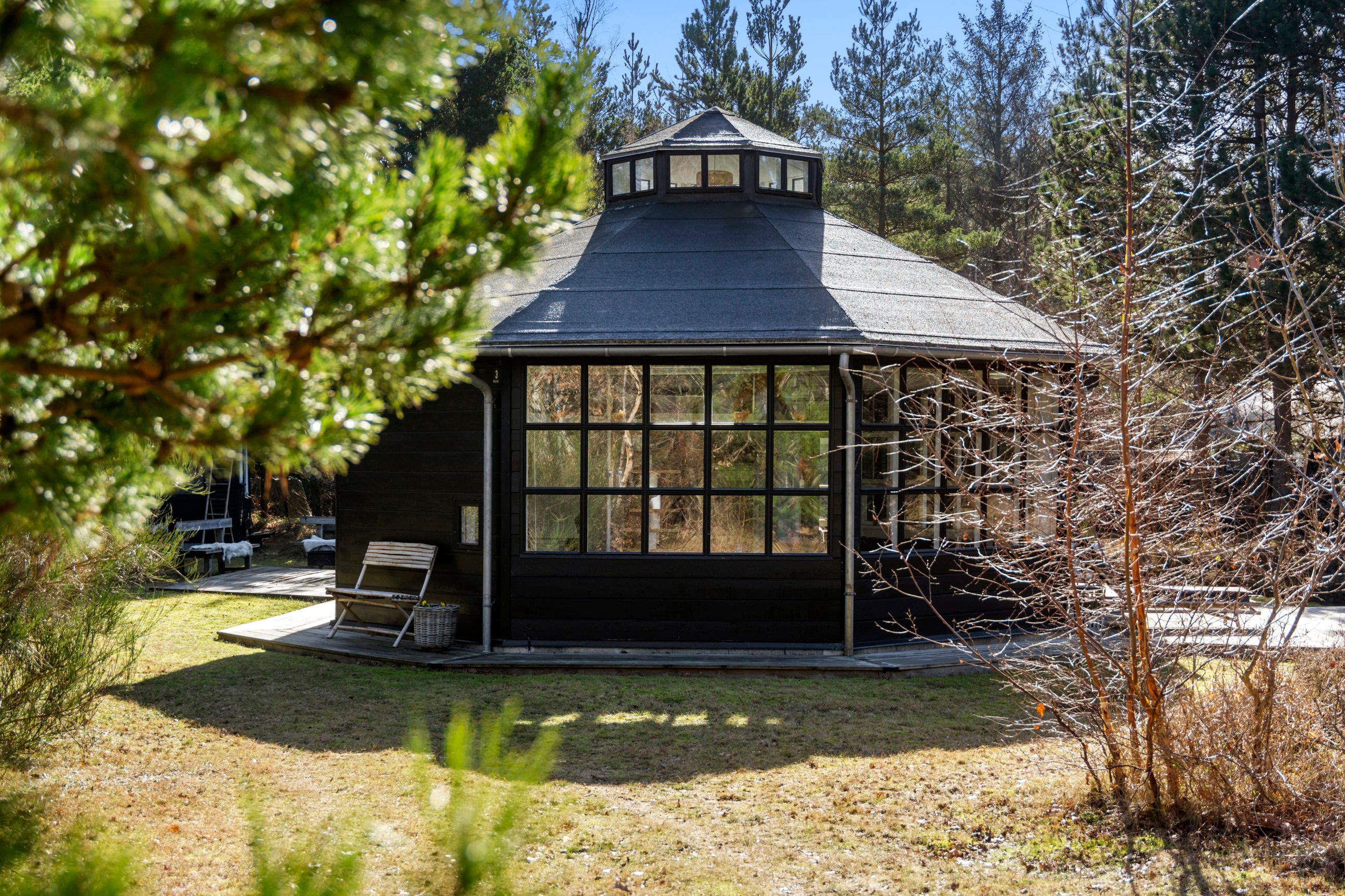 Jamen altså, har man da lige set mage, her er alt slet ikke som det plejer at være. Sådan vil de fleste nok tænke om Marcipanhuset i Højby Lyng. Ja, pudsigt navn, Marcipanhuset. Om historien kan besegles eller ej, så hviskes der i krogene, at den runde oktagon tidligere var café for de ansatte på marcipanfabrikken i Odense. Nu står caféen så her bygget til som stuen i et sommerhus fra 1968 og ombygget i 2003. Det er traditionen utro mod ethvert sommerhus i sin arkitektur og indretning. Hjerterummet er en miniaturekatedral med 138 lavenergivinduer, som får himmel, sol, dyr og natur 180 grader indenfor. Den gamle café er sommerhusets hjerterum, her har man lyst til at opholde sig mest. Smukt er det.