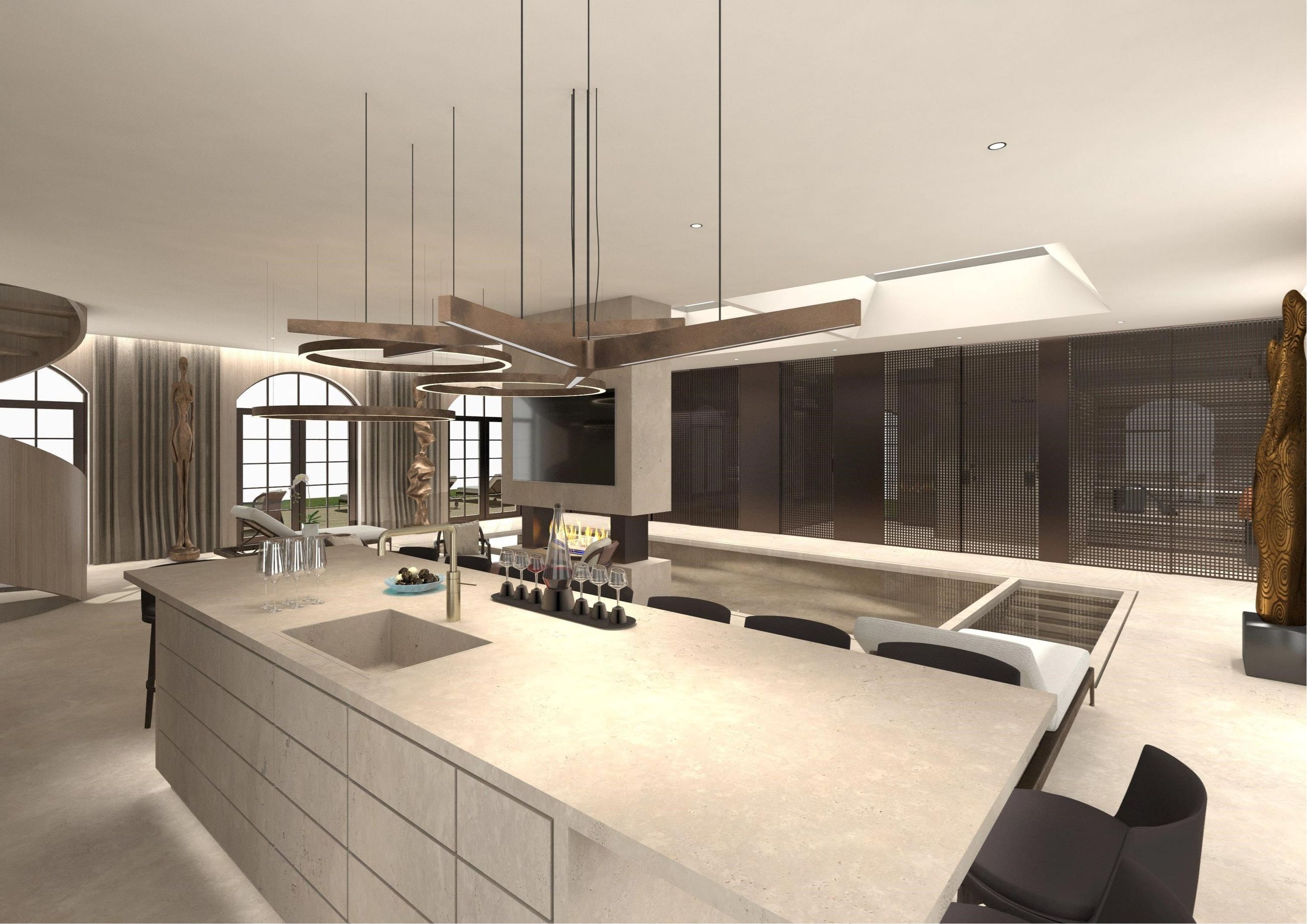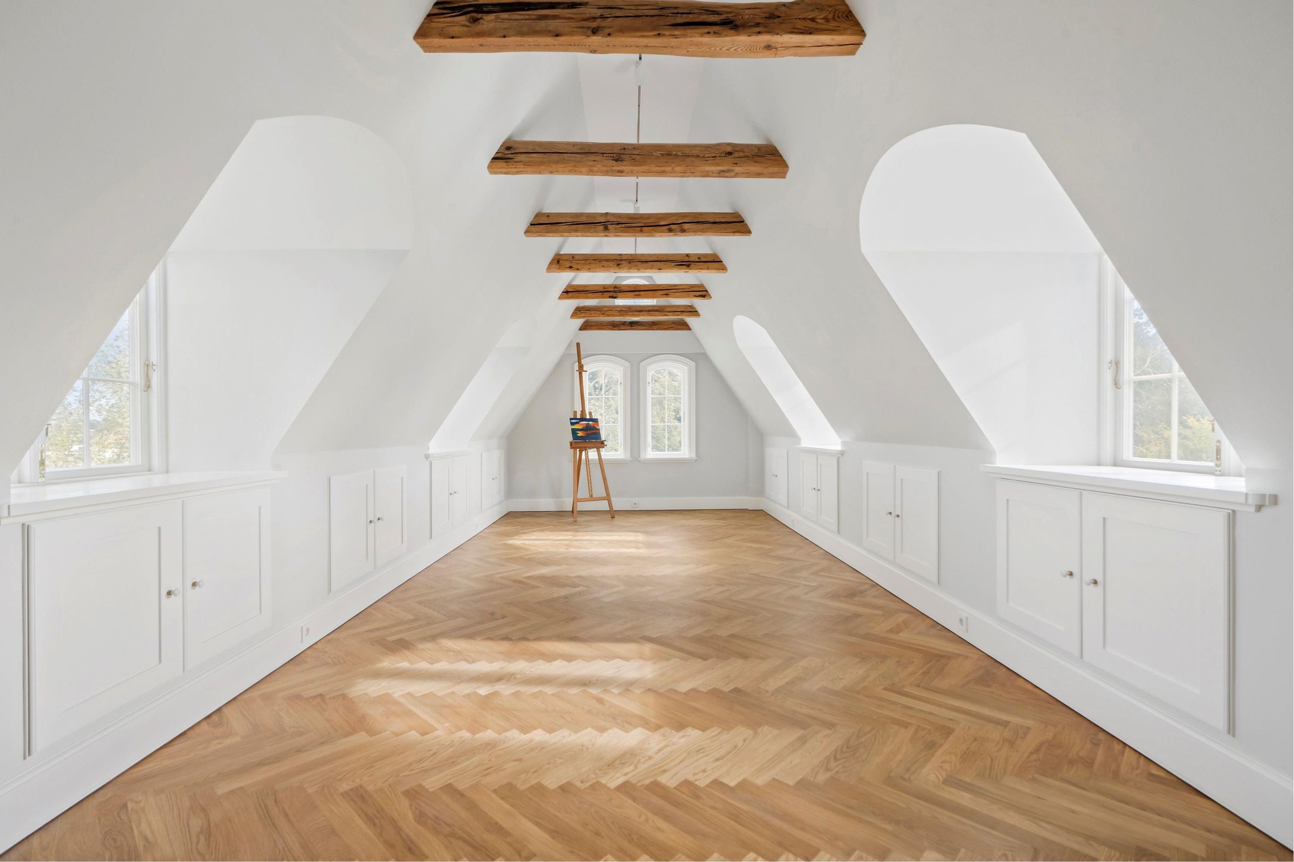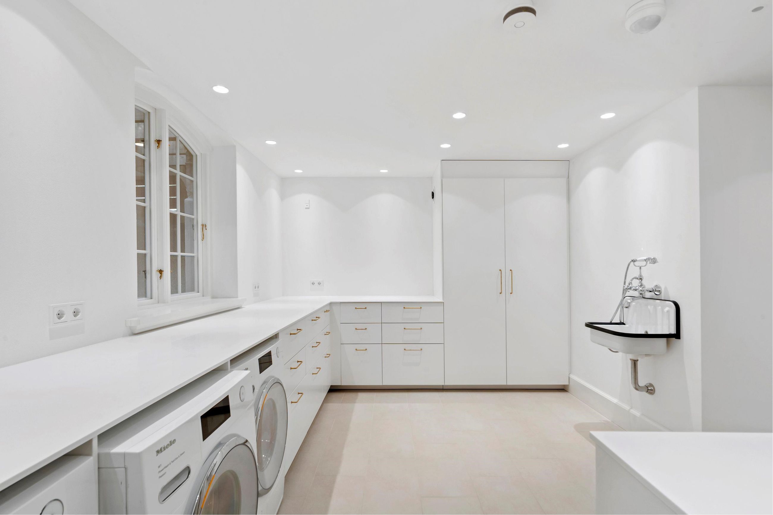 De høje paneler, snedkerlavede døre og massive gulve står i smuk kontrast til de moderne bekvemmeligheder – fra diskrete smarthouse-funktioner og jordvarme til den nyanlagte parkeringskælder gemt under græsplænen med plads til leg, hygge og hele 35 biler.