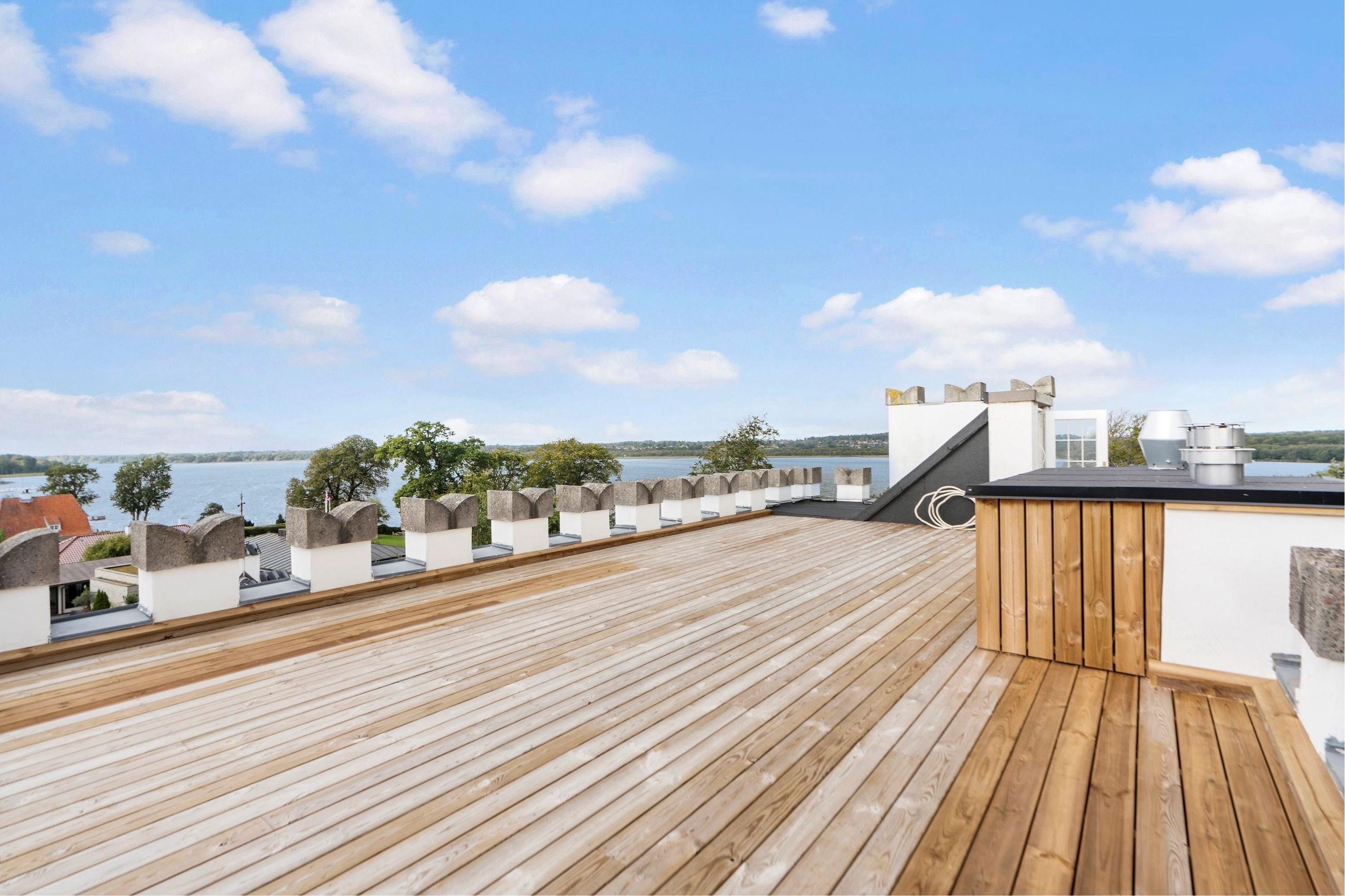 Planløsningen er skabt til både familieliv og gæstfrihed – til den store familie eller flere generationer – med lyse opholdsrum, der åbner op mod haven og søen, og det store køkken som naturligt samlingspunkt. Den ugenerte have sørger for privatliv og ro, og den mageløse tagterrasse for byens absolut bedste panoramaudsigt.