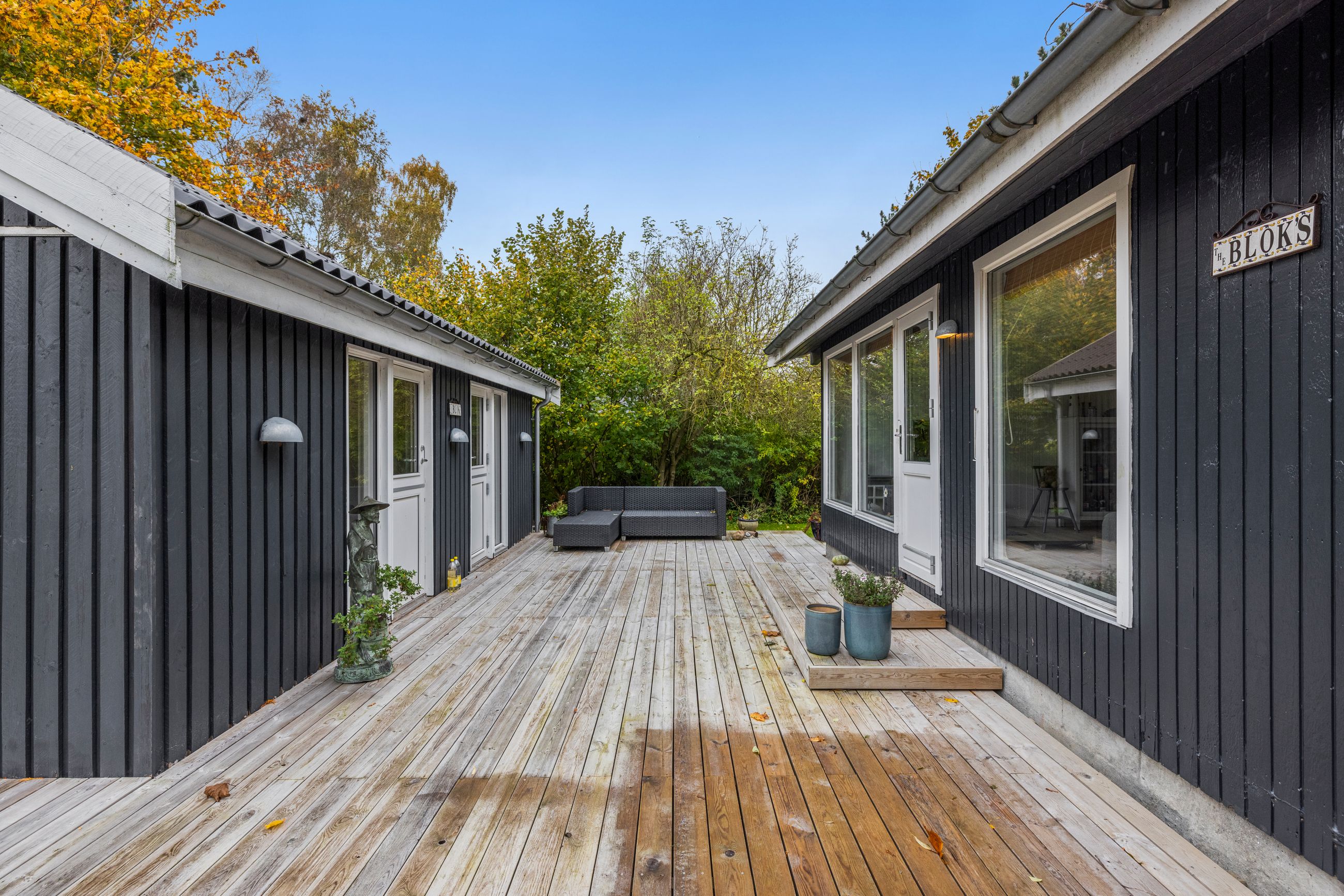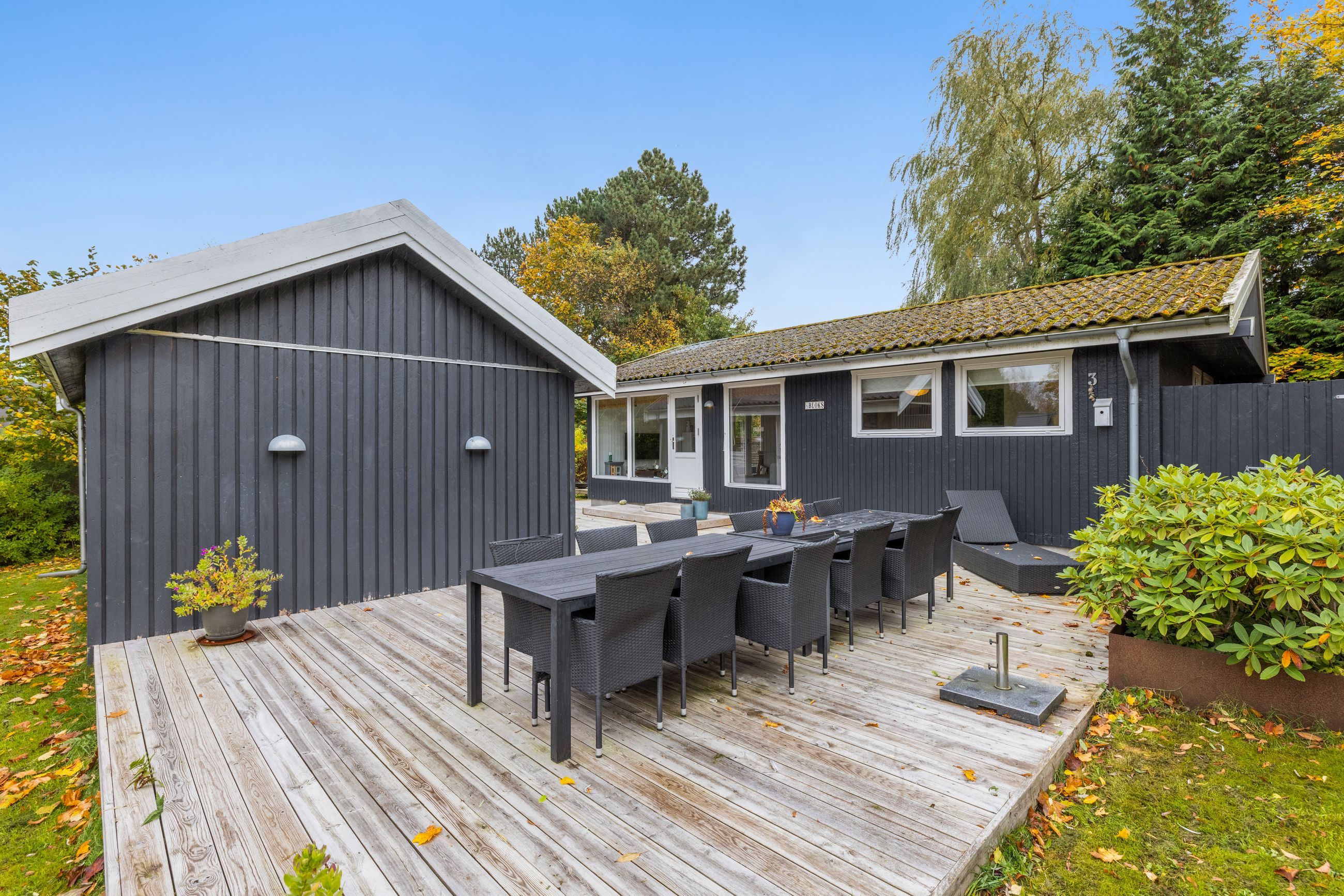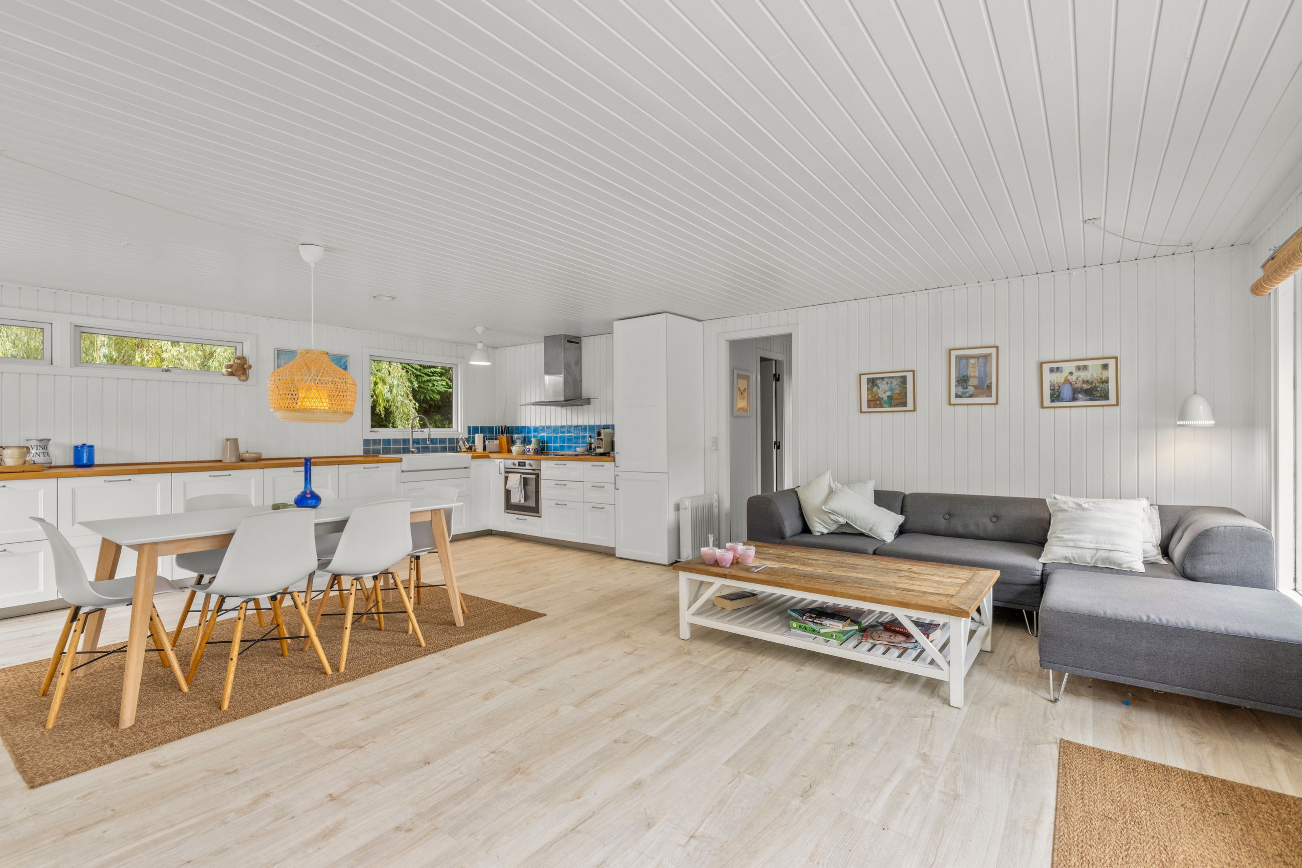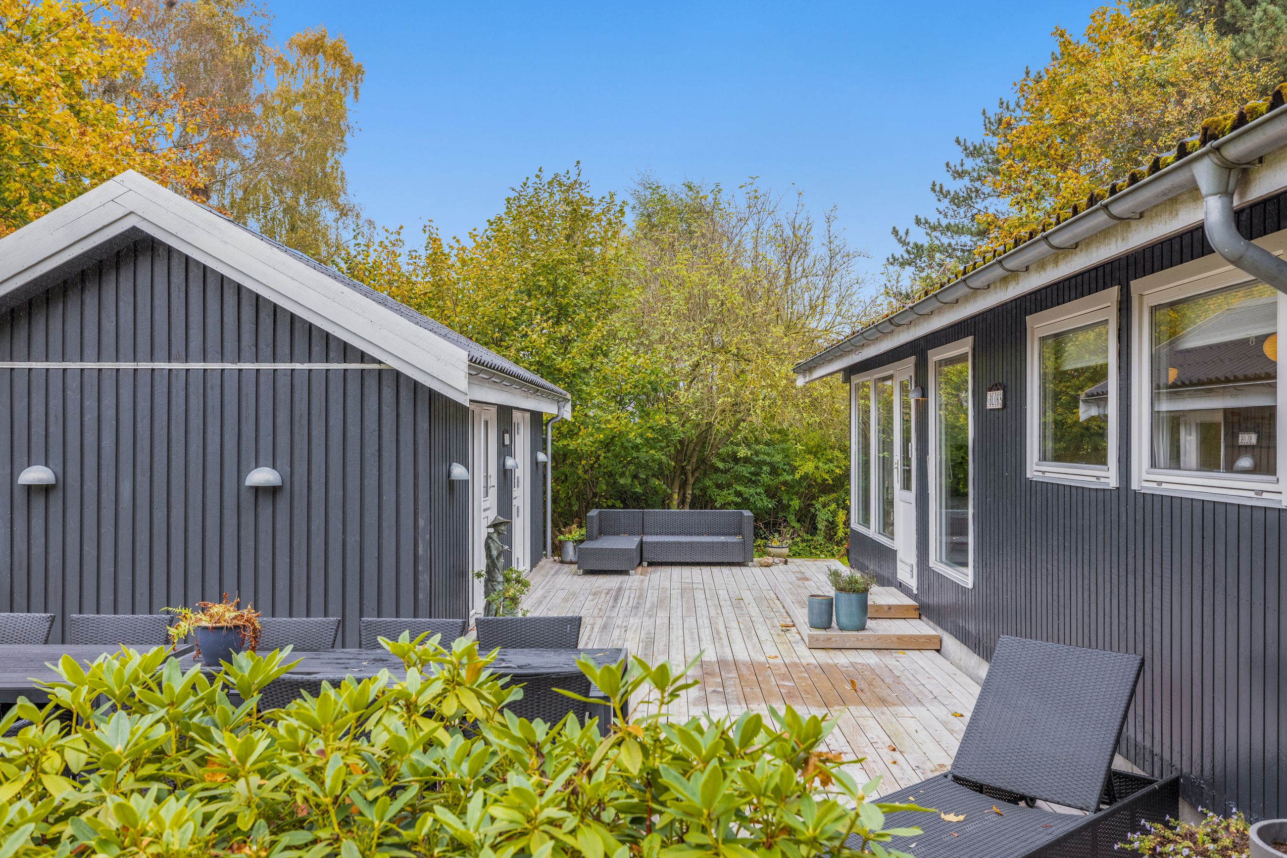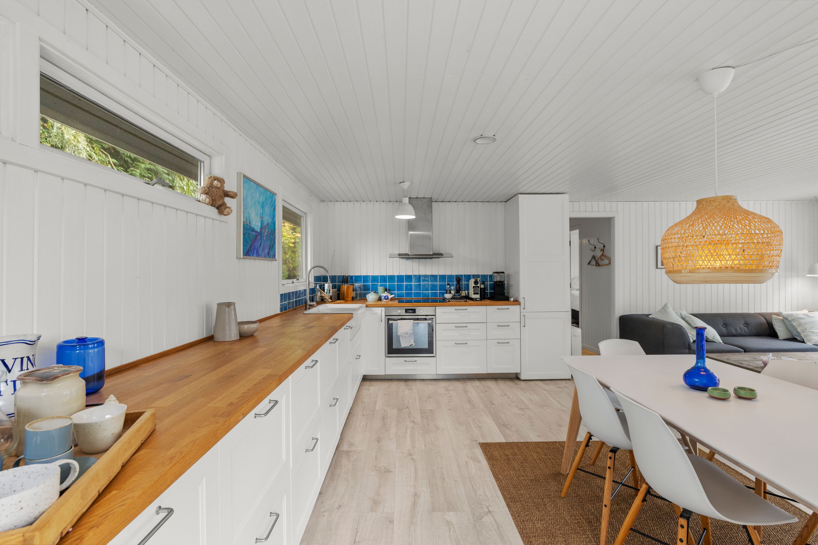 Sommerhuset på Drosselvej i Dronningmølle er oprindelig bygget i 1974 med et anneks fra 2018. Alle 98 m2 er løftet op på et nyt niveau med syd- og vestvendte terrasser, der er større end huset. Selvfølgelig skal det være sådan, fristes man til at sige. Udelivet fylder meget i et sommerhus. Grunden er på 818 m2 med en have, som er nem at holde. Annekset på 28 m2 er godkendt til beboelse. Det er selvfølgelig isoleret, så ja, her er også plads til gæster. Alt er pivlækkert, alt er klassisk sommerhushyggeligt, alt er lige til at flytte ind i. Drosselvej er en blind sidevej til sig selv, og Drosselvej 3 ligger som det sidste hus på vejen. Ingen trafik her. Mange tak. Skulpturerne i Tegners Skulptur Park står lige om hjørnet, det samme gør stien ned til iskagehuset på stranden. Lige ud, det er turen til Horneby. Naboerne er køerne på marken, økologiske er de, og de spiser og kælver i græsset.