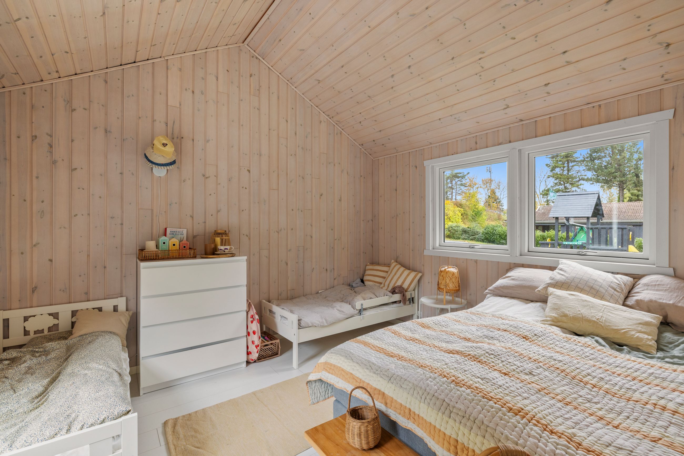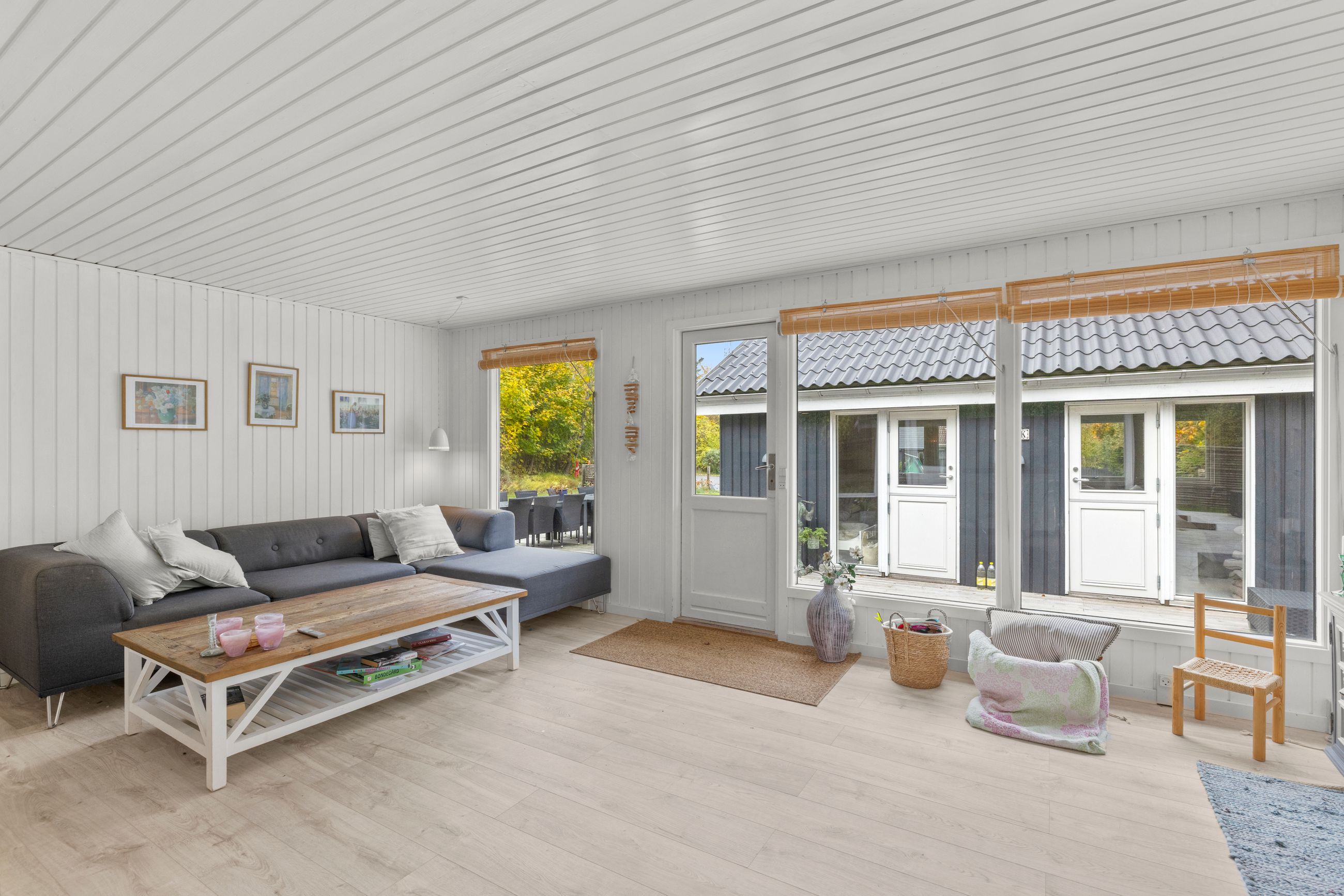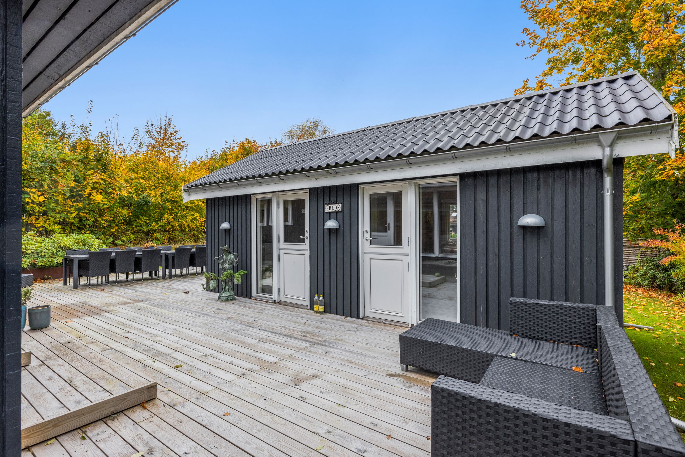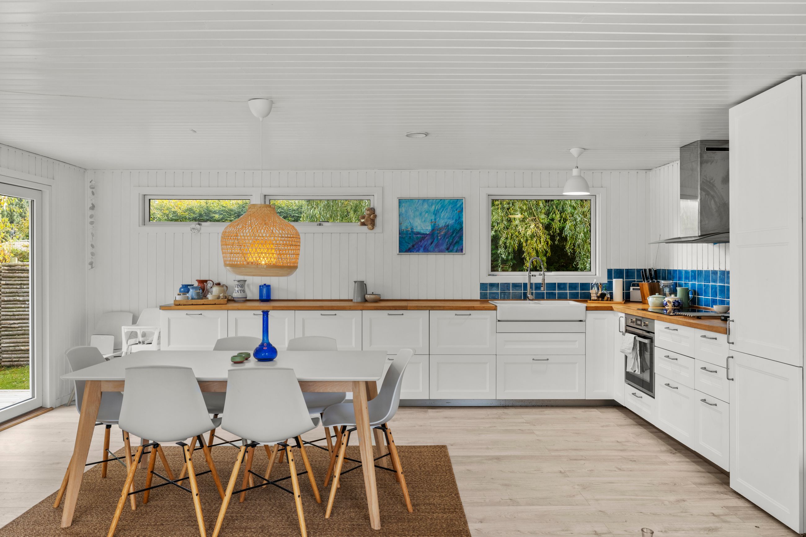 Sommerhuset på Drosselvej i Dronningmølle er oprindelig bygget i 1974 med et anneks fra 2018. Alle 98 m2 er løftet op på et nyt niveau med syd- og vestvendte terrasser, der er større end huset. Selvfølgelig skal det være sådan, fristes man til at sige. Udelivet fylder meget i et sommerhus. Grunden er på 818 m2 med en have, som er nem at holde. Annekset på 28 m2 er godkendt til beboelse. Det er selvfølgelig isoleret, så ja, her er også plads til gæster. Alt er pivlækkert, alt er klassisk sommerhushyggeligt, alt er lige til at flytte ind i. Drosselvej er en blind sidevej til sig selv, og Drosselvej 3 ligger som det sidste hus på vejen. Ingen trafik her. Mange tak. Skulpturerne i Tegners Skulptur Park står lige om hjørnet, det samme gør stien ned til iskagehuset på stranden. Lige ud, det er turen til Horneby. Naboerne er køerne på marken, økologiske er de, og de spiser og kælver i græsset.