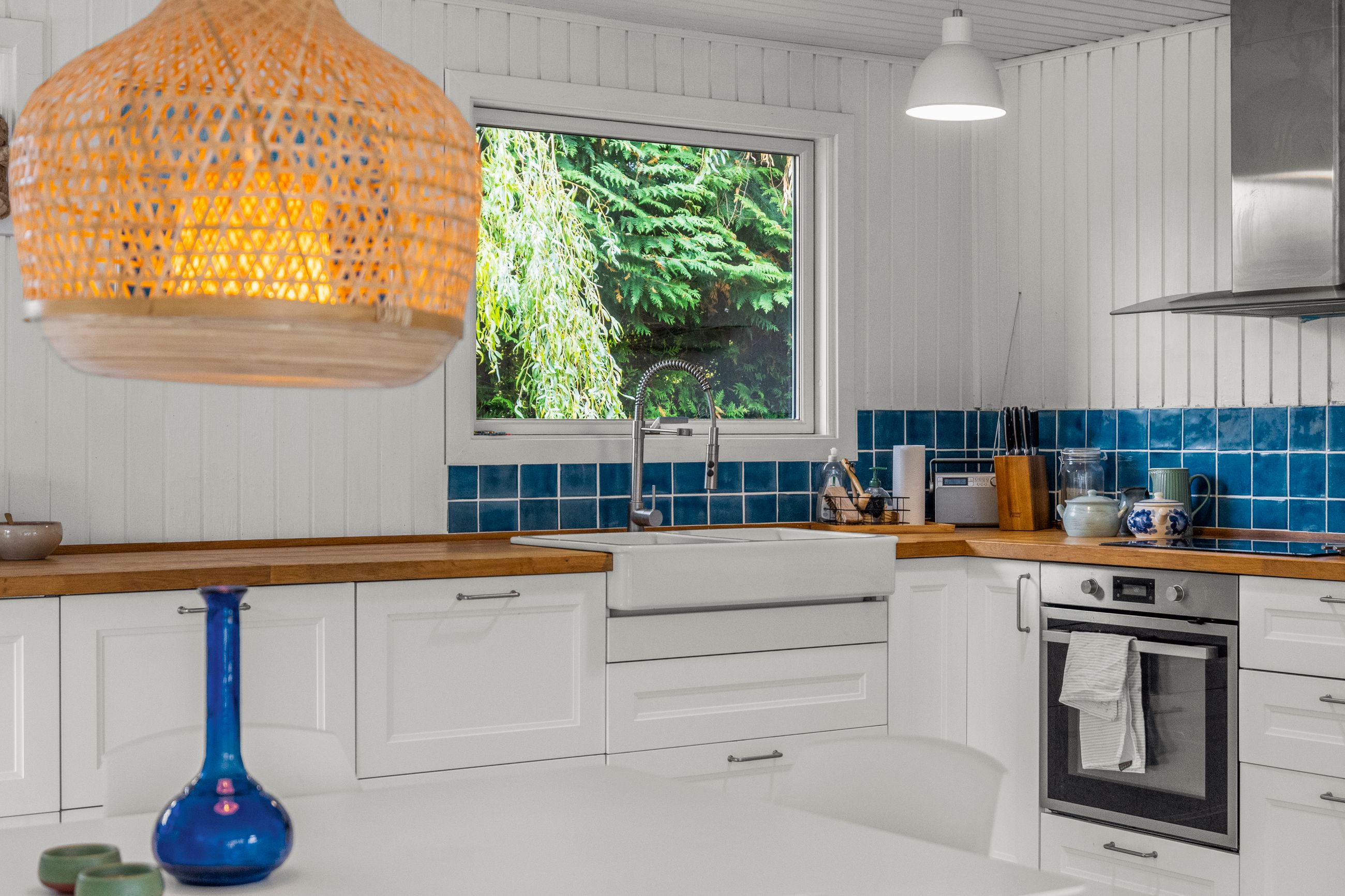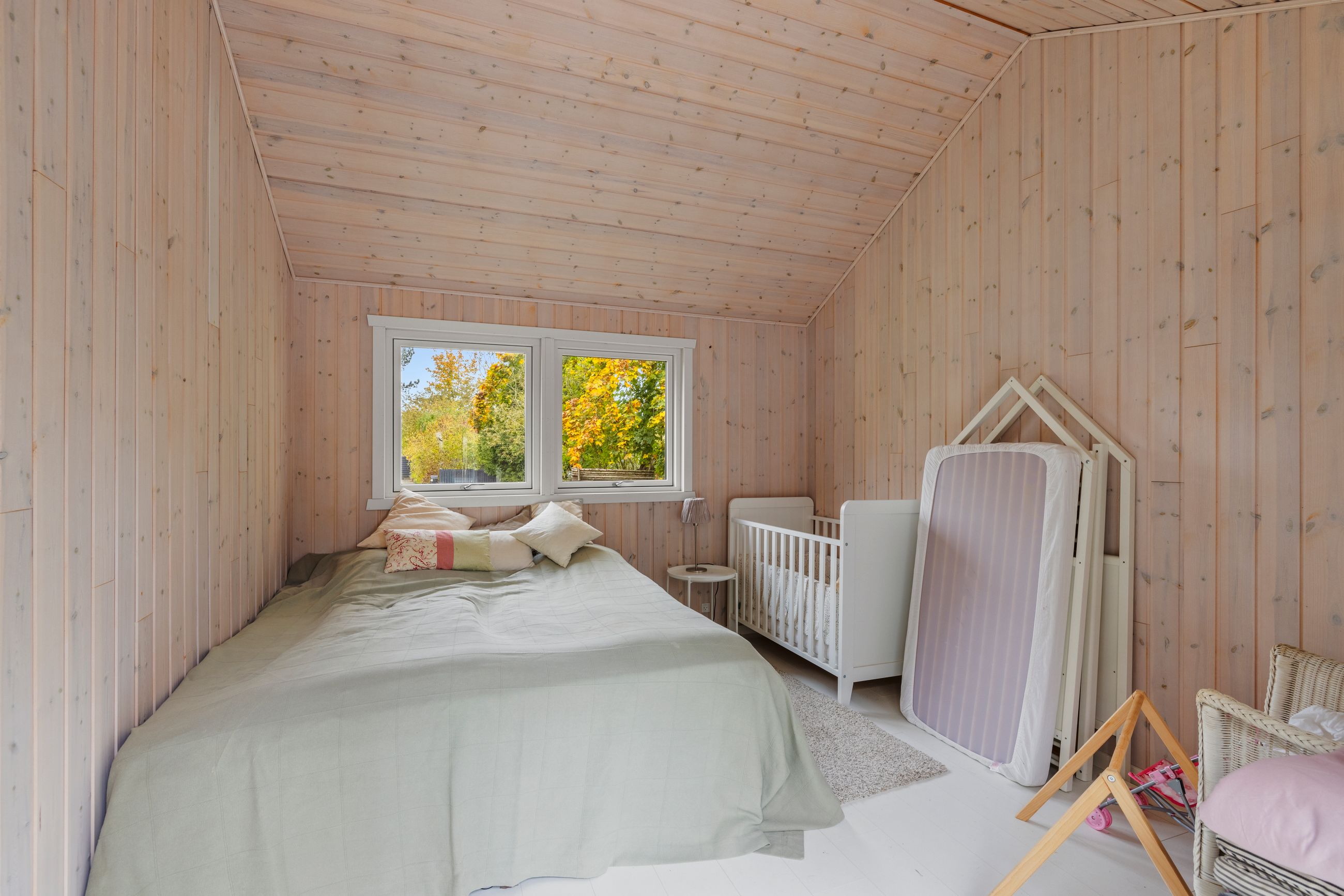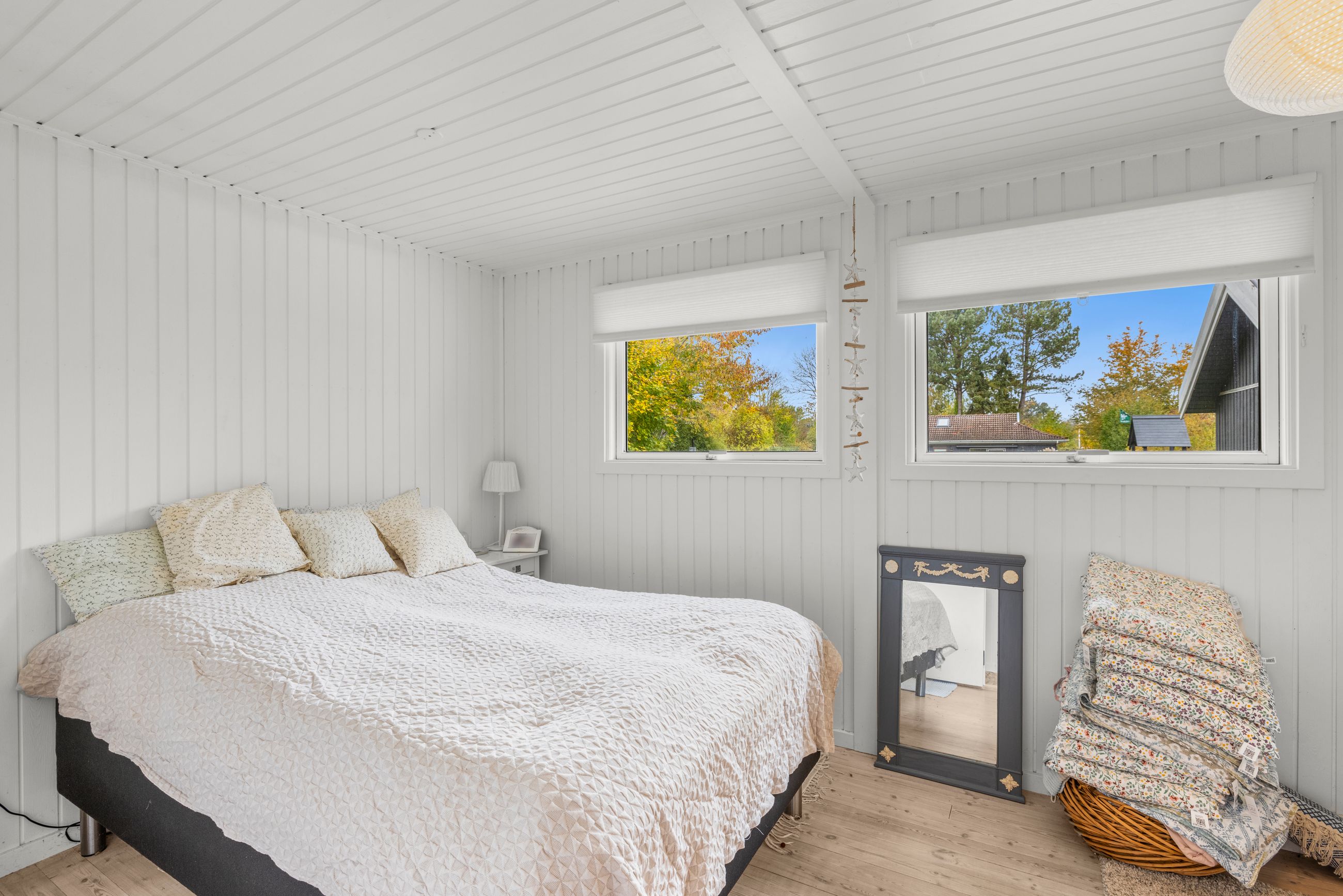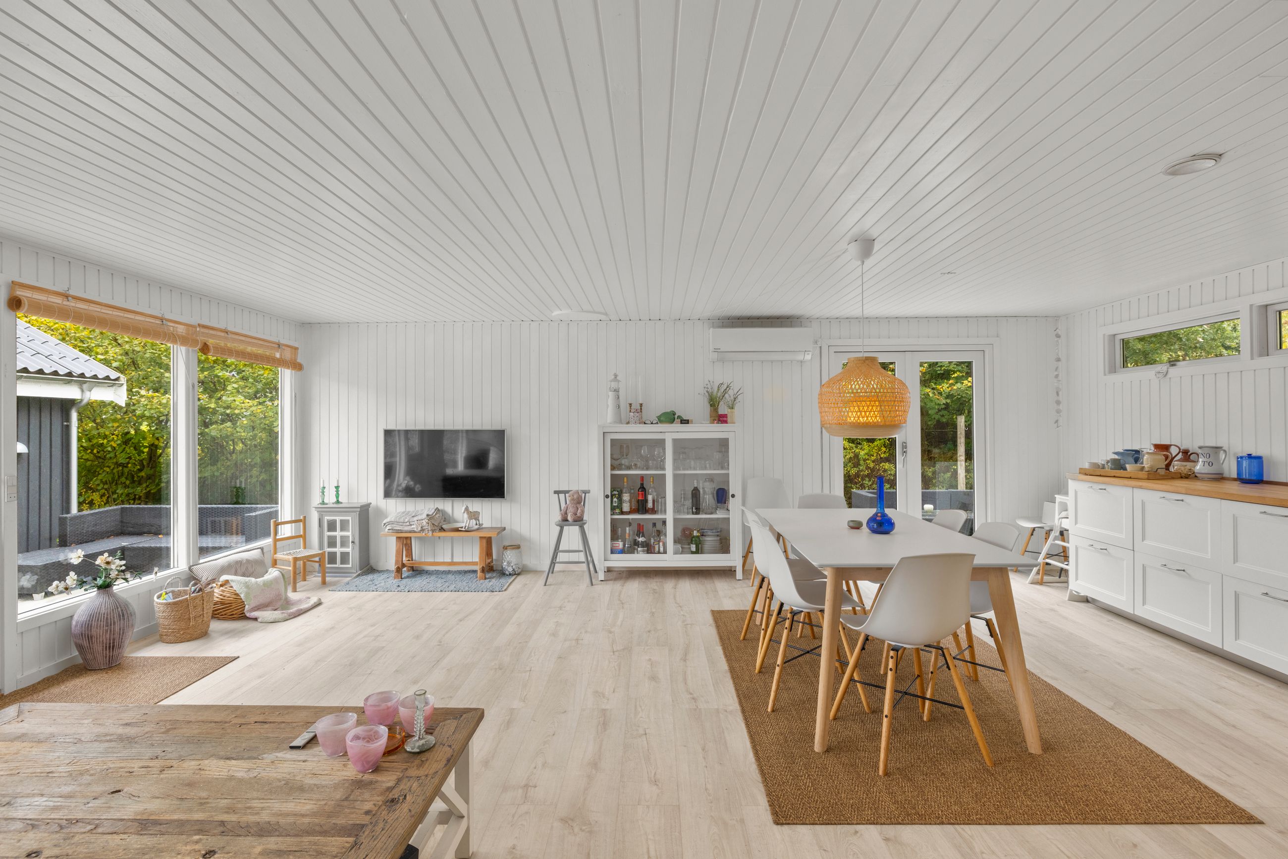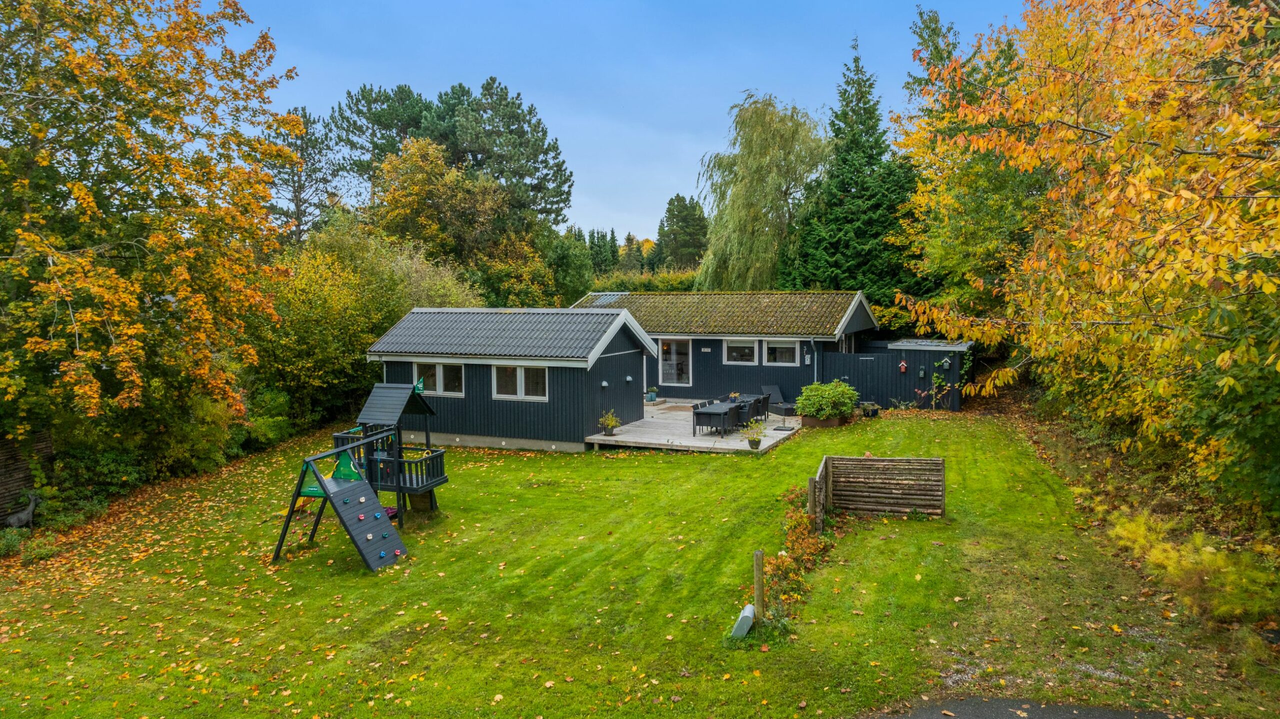 Sommerhuset på Drosselvej i Dronningmølle er oprindelig bygget i 1974 med et anneks fra 2018. Alle 98 m2 er løftet op på et nyt niveau med syd- og vestvendte terrasser, der er større end huset. Selvfølgelig skal det være sådan, fristes man til at sige. Udelivet fylder meget i et sommerhus. Grunden er på 818 m2 med en have, som er nem at holde. Annekset på 28 m2 er godkendt til beboelse. Det er selvfølgelig isoleret, så ja, her er også plads til gæster. Alt er pivlækkert, alt er klassisk sommerhushyggeligt, alt er lige til at flytte ind i. Drosselvej er en blind sidevej til sig selv, og Drosselvej 3 ligger som det sidste hus på vejen. Ingen trafik her. Mange tak. Skulpturerne i Tegners Skulptur Park står lige om hjørnet, det samme gør stien ned til iskagehuset på stranden. Lige ud, det er turen til Horneby. Naboerne er køerne på marken, økologiske er de, og de spiser og kælver i græsset.