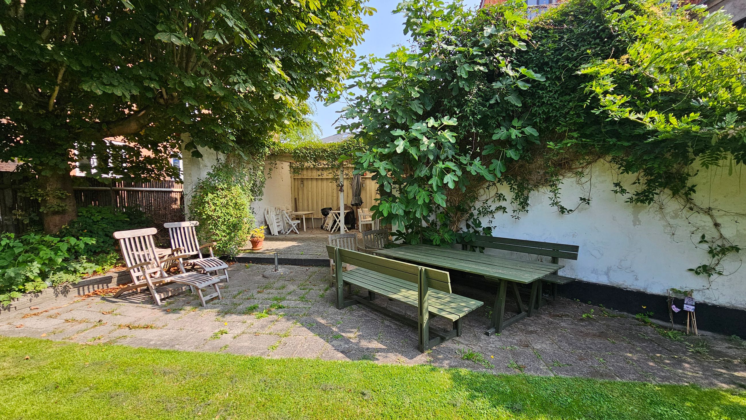 When you are more into homely comfort, you can relax in the beautiful garden, which is shared with the other residents of the property. Here you can enjoy the sun, grill a good steak and have dinner under the covered terrace while enjoying the beautifully planted flower beds.