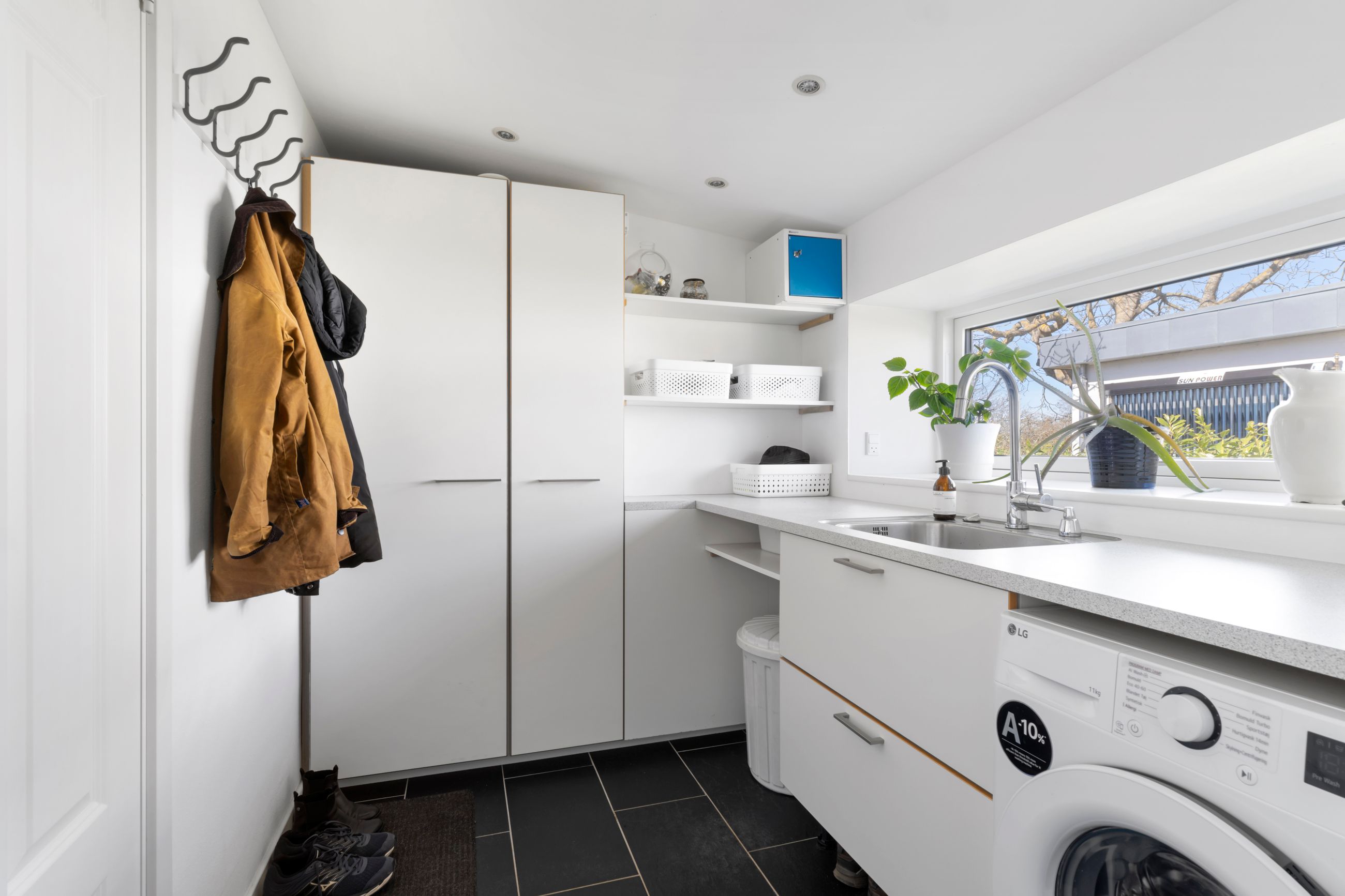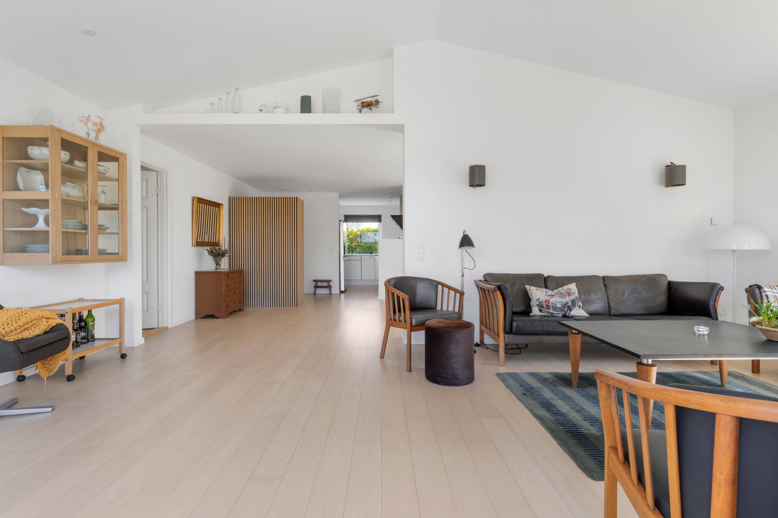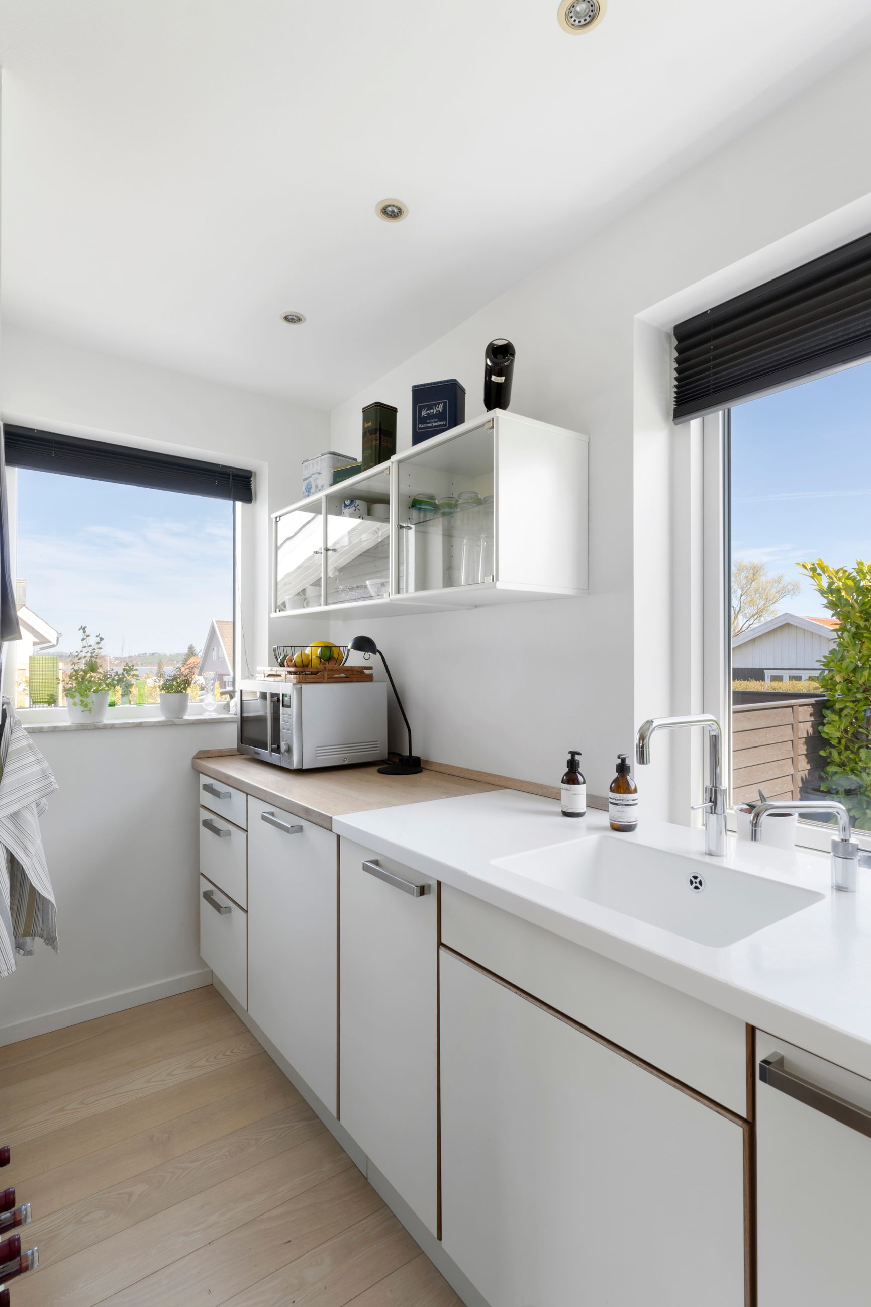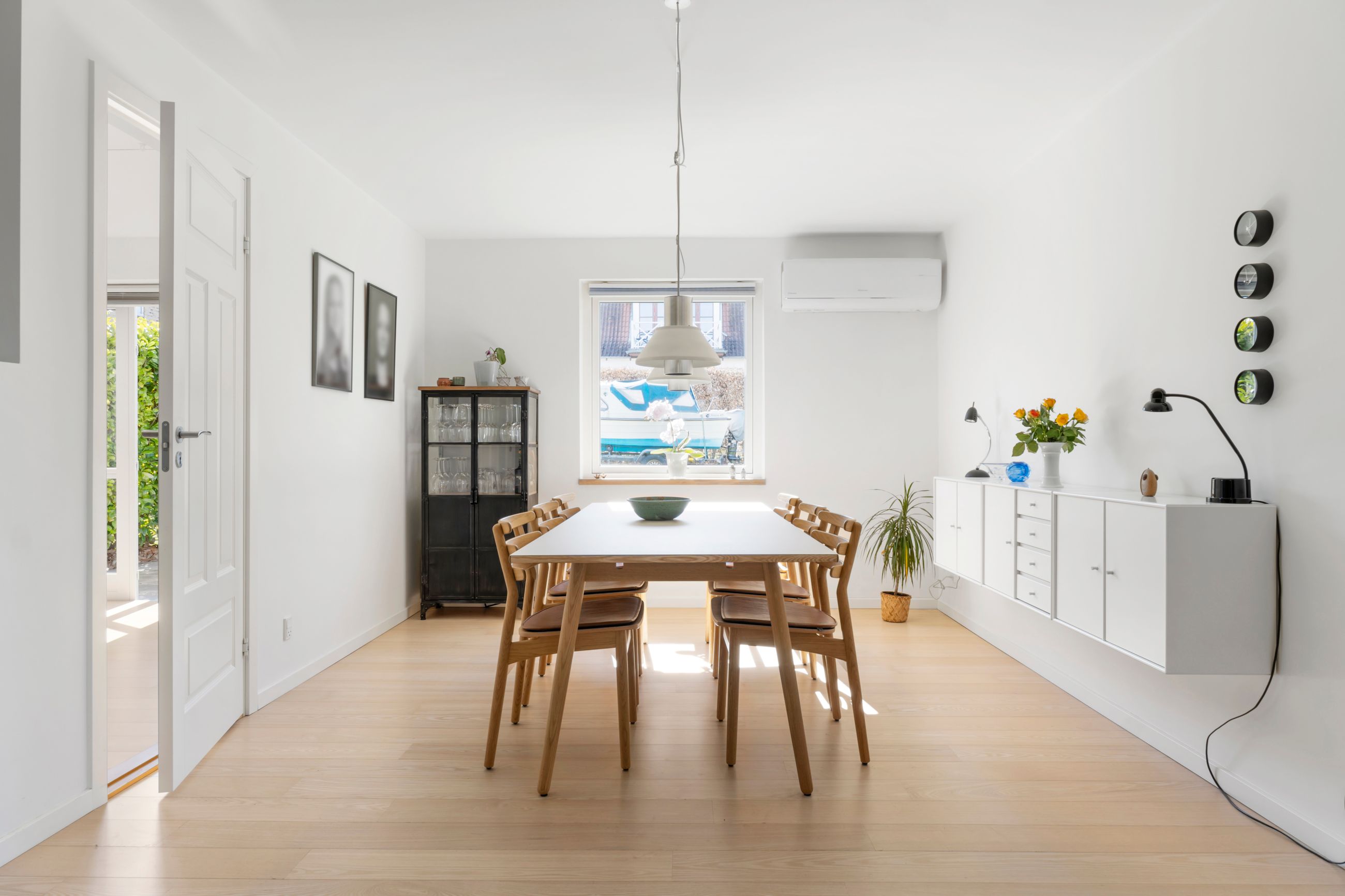 På Fr. Olsensvej 1 står et hus fra 1951 på kanten af Holbæk by, bare 100 meter fra Holbæk Fjord. Det er et charmerende hus, ombygget i 2012. Det eneste der er tilbage af det oprindelige hus, er ydermurene, som tidligere var røde mursten, men nu pudset hvide. Huset er nu en moderne bolig med gulvvarme overalt på 132 m2. Solpaneler på taget bidrager med varmt brugsvand og et blødgøringsanlæg forbedrer vandets hårdhed. Her er udsigt til fjordvandet i Holbæk Fjord, masser af lys, luft og aftensol på terrassen. I annekset er der blandt andet mulighed for havestue, atelier eller andet. Haven er nem at holde, tak for det.