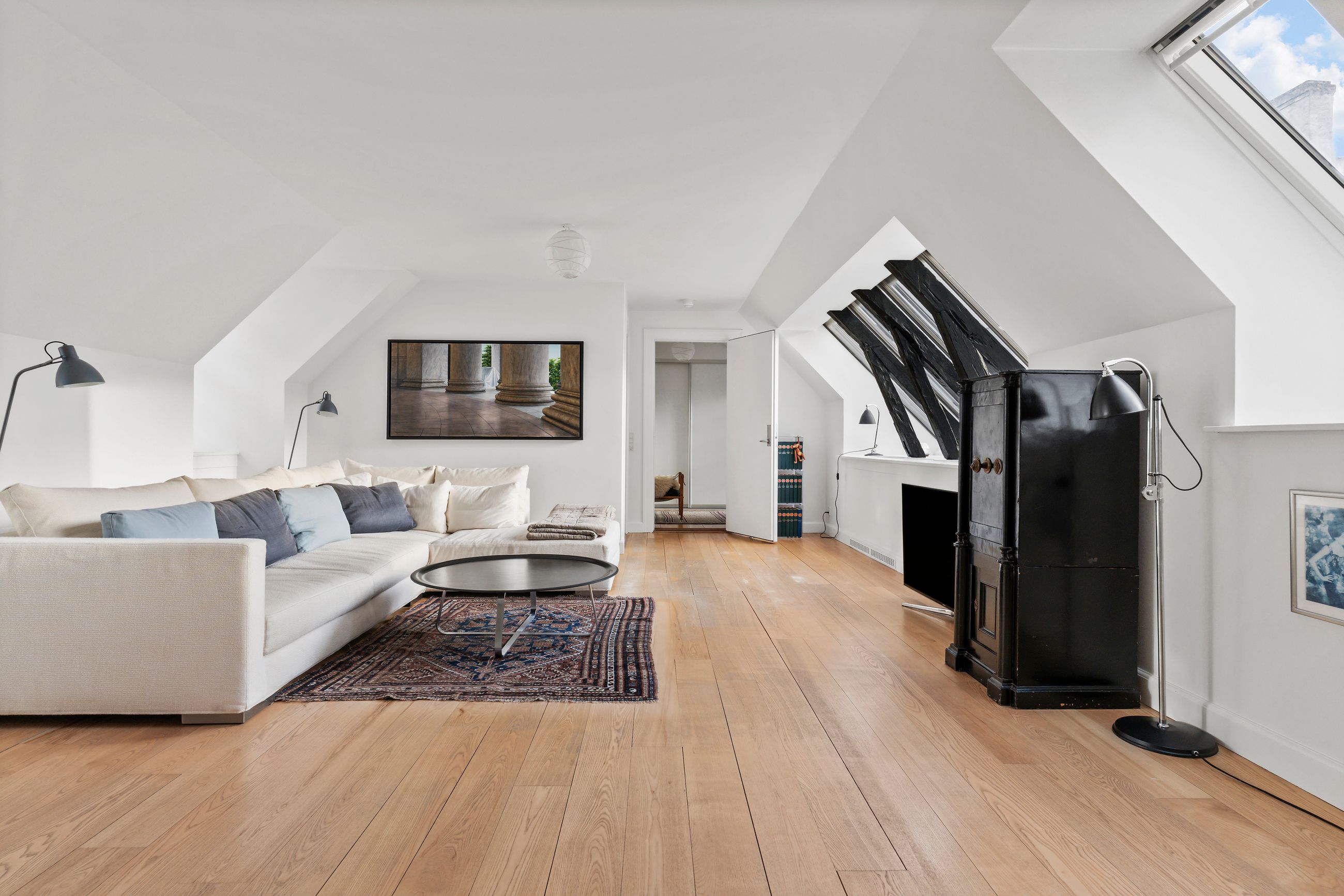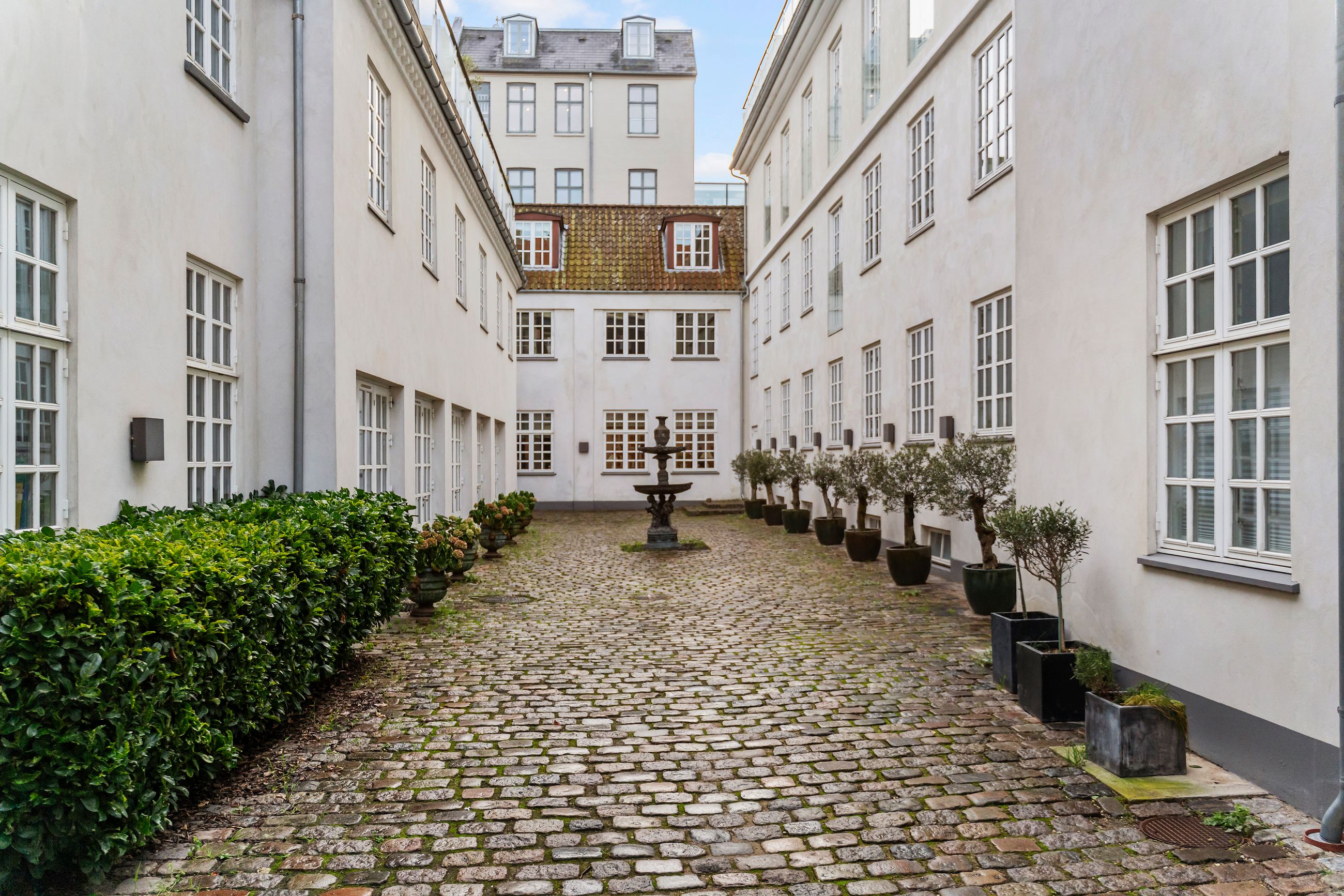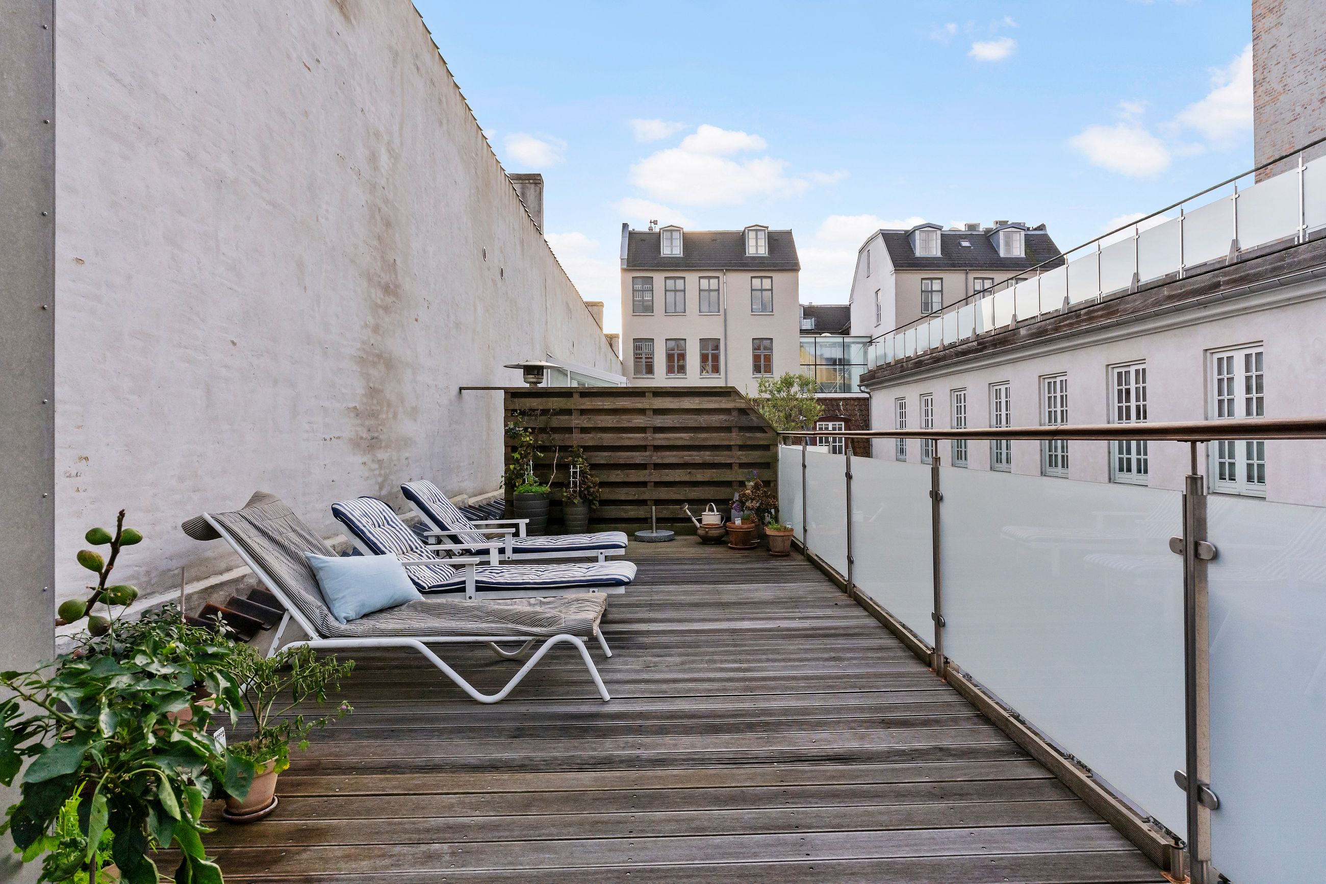 Frederik III er kongen bag vejnavnet Fredericiagade. Kvarteret er Frederiksstaden anlagt i 1700-tallet, i dag som et af Europas smukkeste rokokokvarterer. Arkitekten Nikolai Eigtved havde travlt. Lige gader, symmetriske palæer, høje vinduer, Amalienborgs elegante palæer og den fine akse mellem Marmorkirken og Langelinie. Lejligheden i Fredericiagade 11 ligger som nabo til Kongen og Dronningen. Fint og fornemt er det. Ejendommen er fra 1758, og med 153 m2 er den en stor lejlighed gemt godt væk oppe under taget med direkte adgang til en privat, øst- og sydvendt tagterrasse på 37 m2. Nemlig, luft og sol det meste af dagen. Her er fred og ro, som der altid er i en lille landsby.
