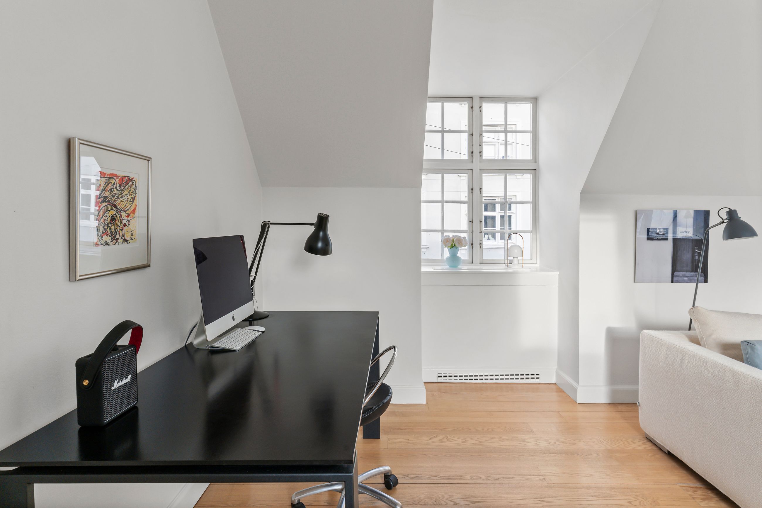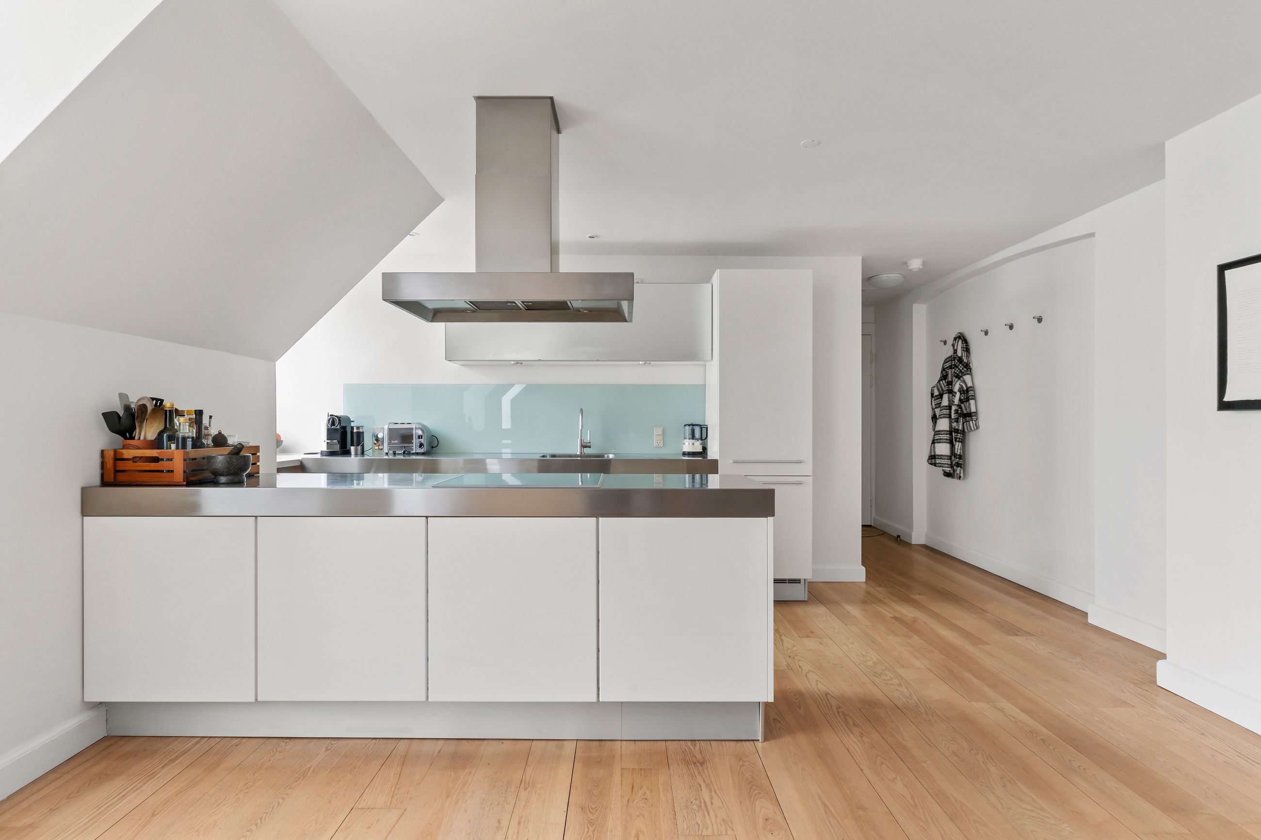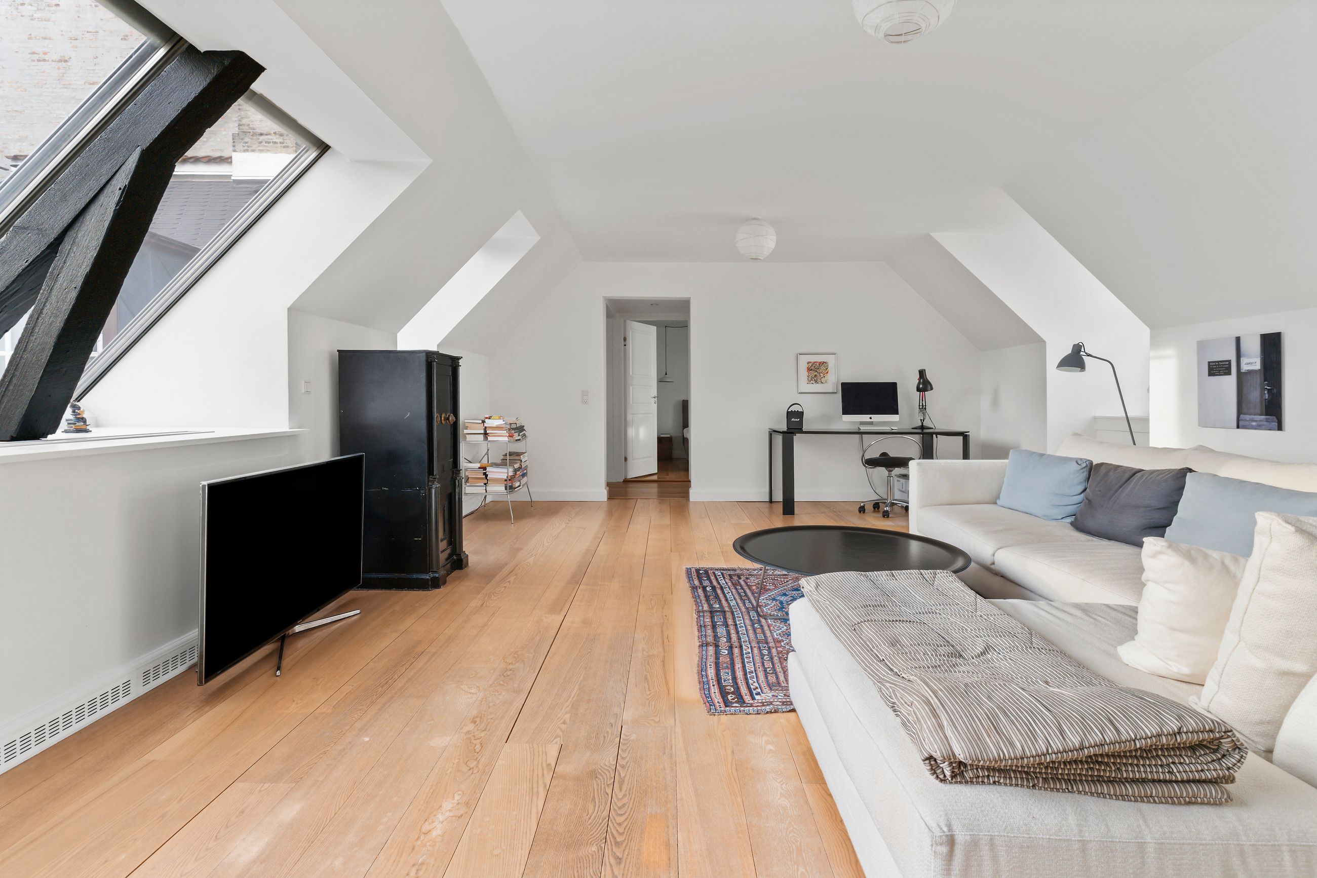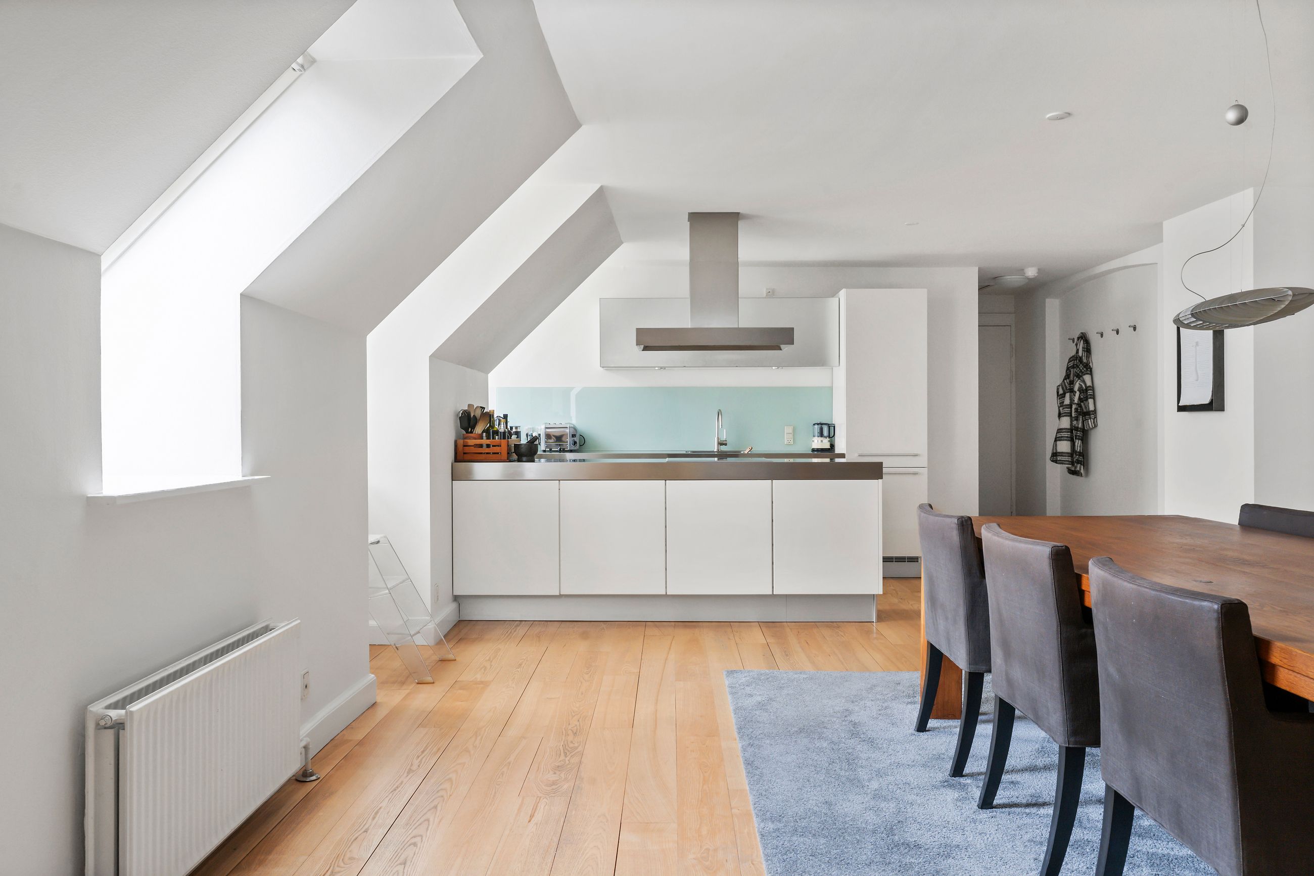 Frederik III er kongen bag vejnavnet Fredericiagade. Kvarteret er Frederiksstaden anlagt i 1700-tallet, i dag som et af Europas smukkeste rokokokvarterer. Arkitekten Nikolai Eigtved havde travlt. Lige gader, symmetriske palæer, høje vinduer, Amalienborgs elegante palæer og den fine akse mellem Marmorkirken og Langelinie. Lejligheden i Fredericiagade 11 ligger som nabo til Kongen og Dronningen. Fint og fornemt er det. Ejendommen er fra 1758, og med 153 m2 er den en stor lejlighed gemt godt væk oppe under taget med direkte adgang til en privat, øst- og sydvendt tagterrasse på 37 m2. Nemlig, luft og sol det meste af dagen. Her er fred og ro, som der altid er i en lille landsby.