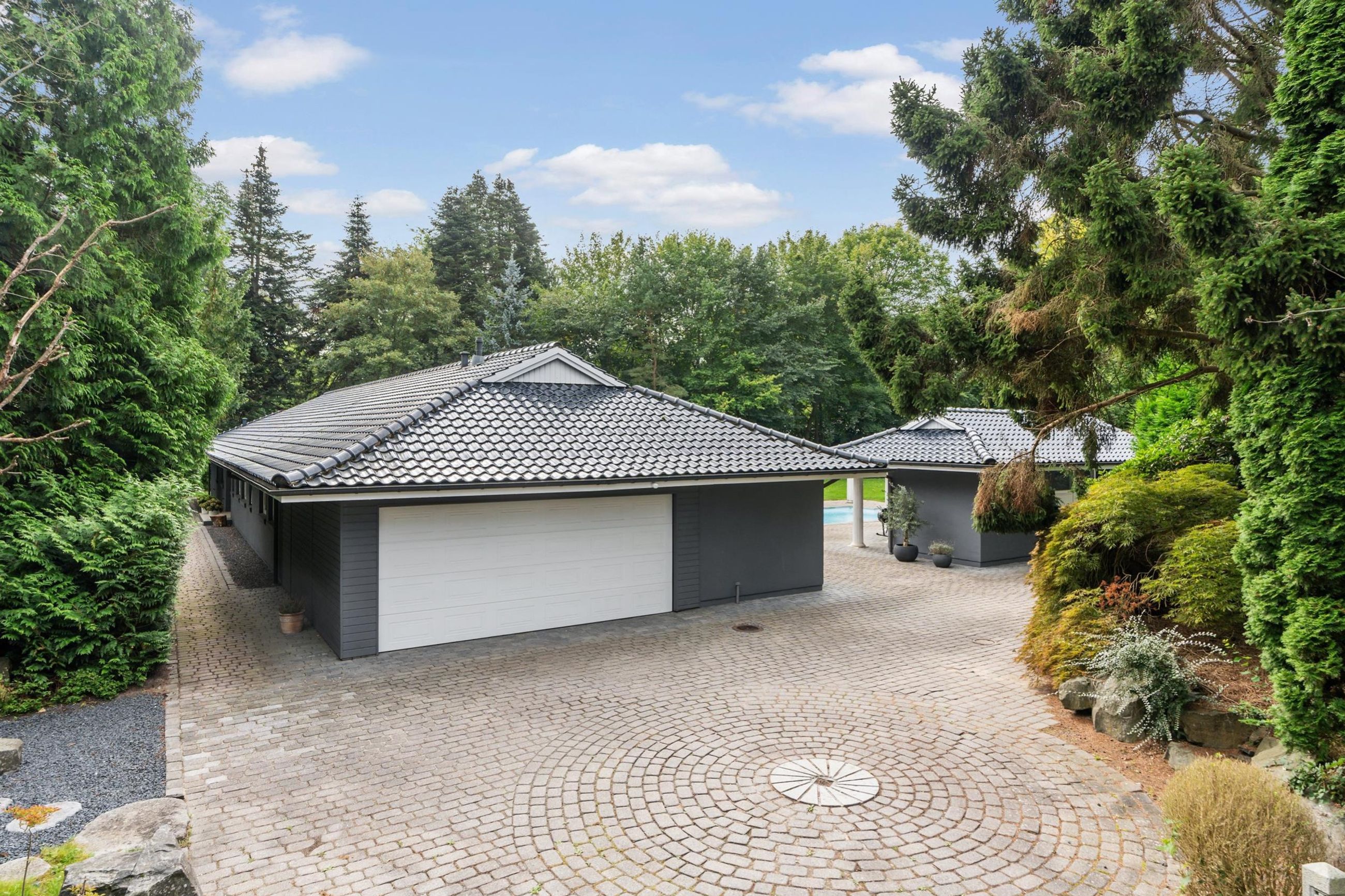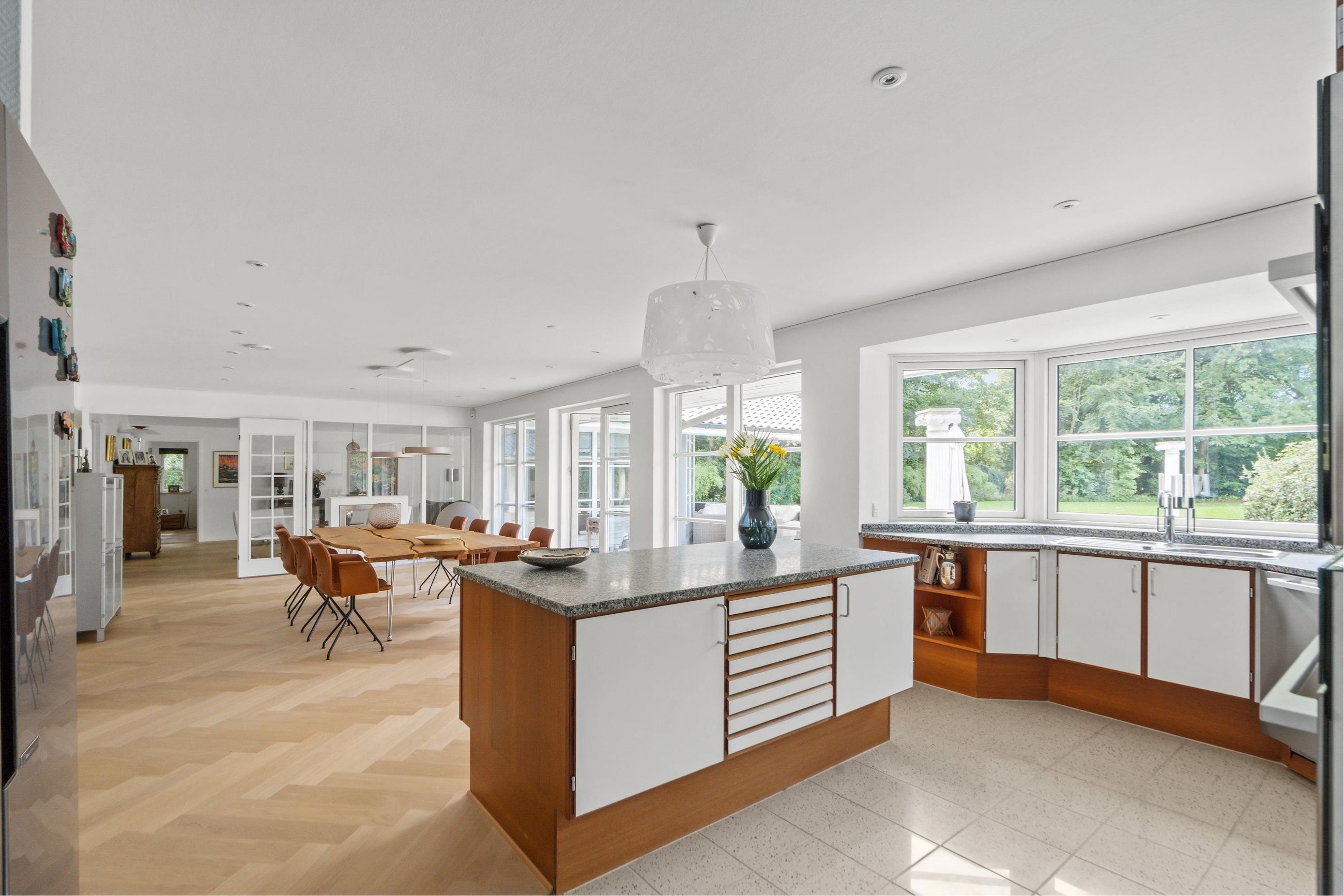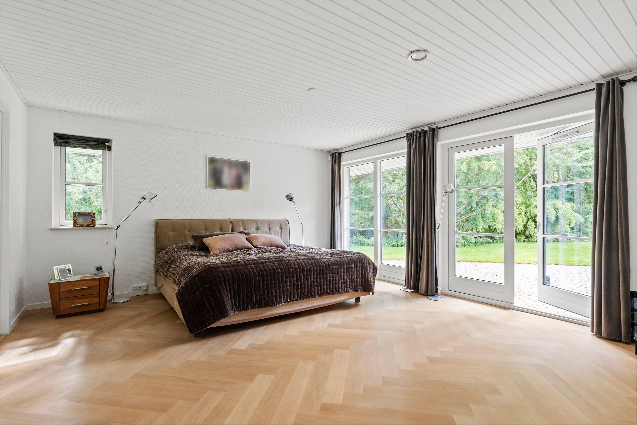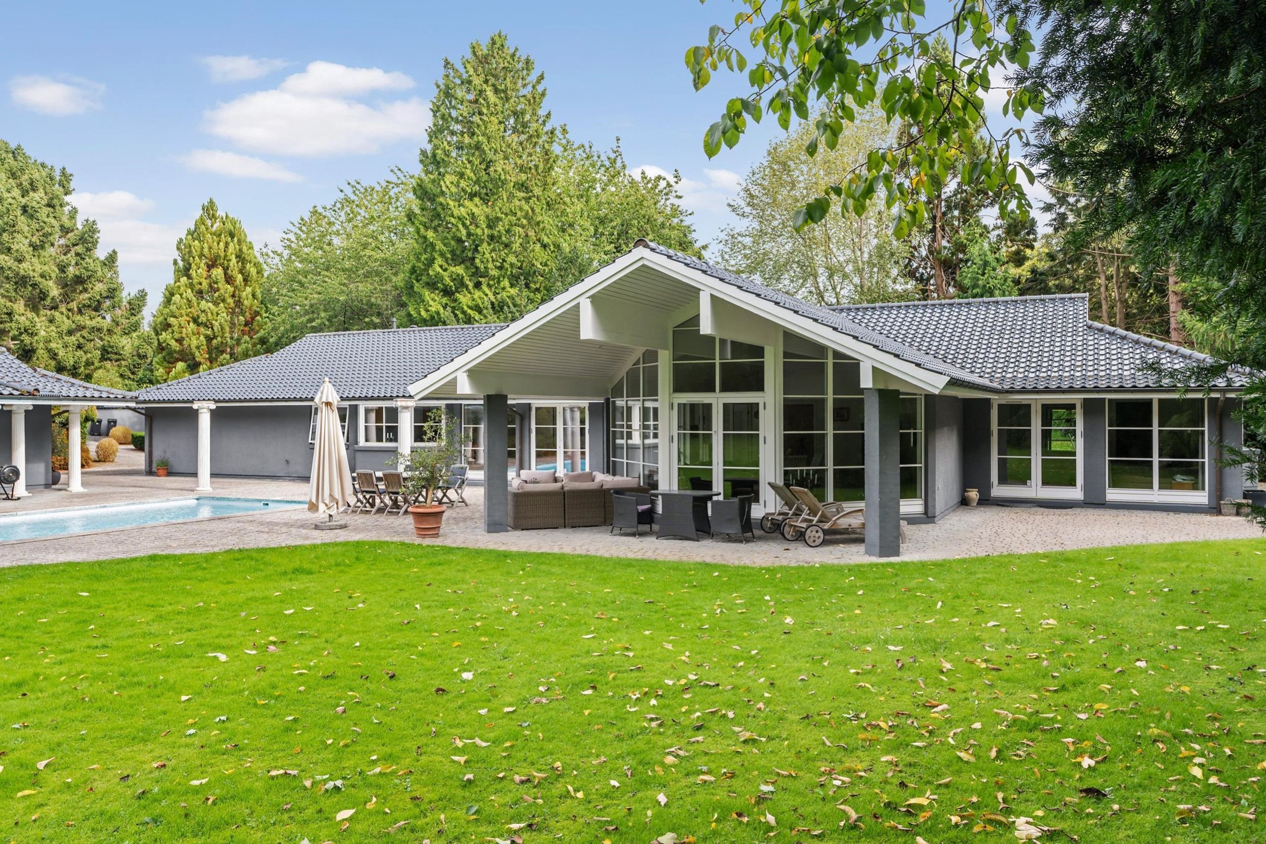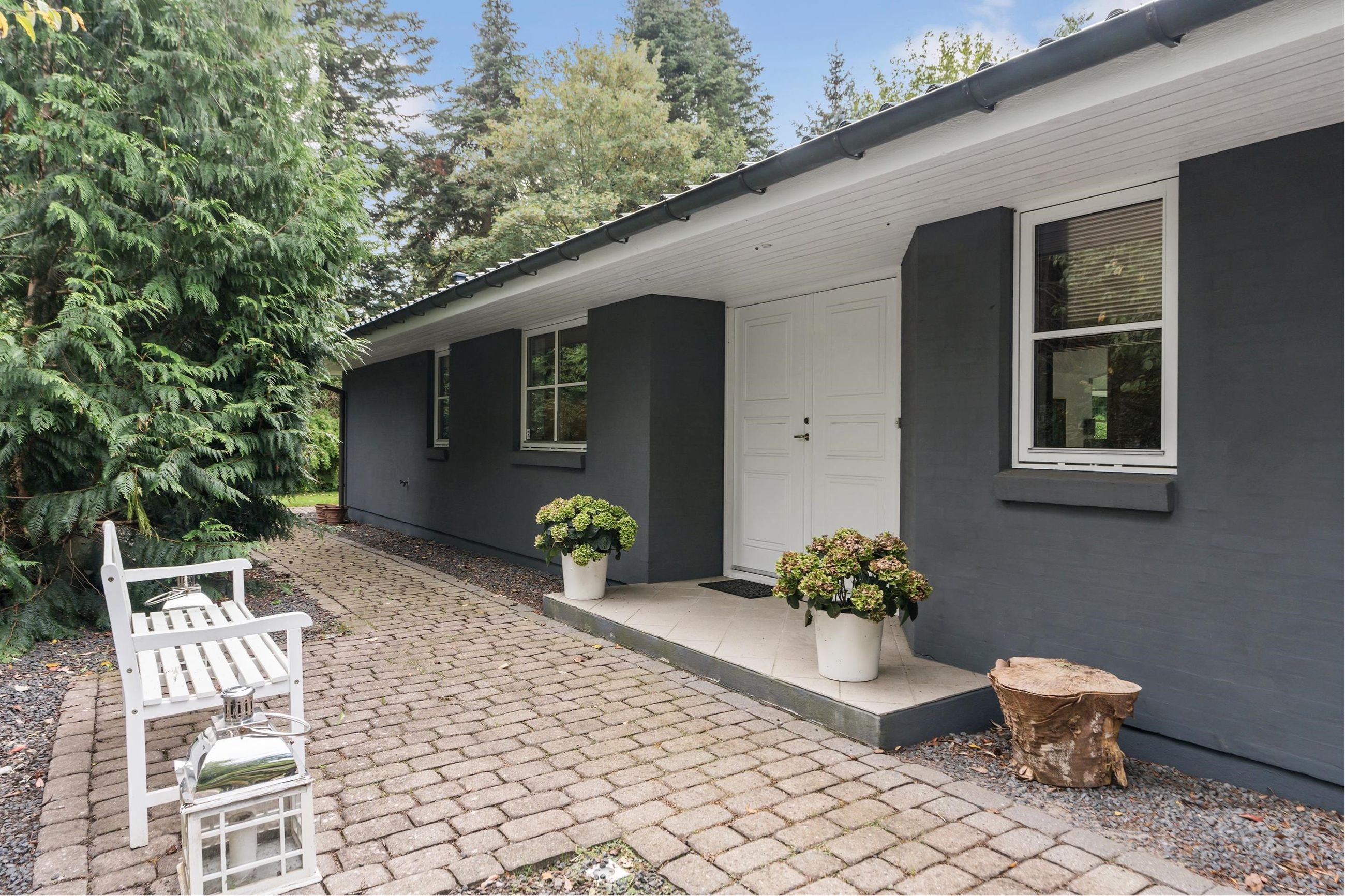 The single-level home is distributed over 282 square meters of living space as well as a double garage and pool house. In addition, there is a parents’ section with a large bedroom, walk-in closet and bathroom with spa. Impressive west-facing living room with fireplace connecting the dining room and kitchen. In addition, there are 3 good bedrooms, 2 bathrooms, utility room and 2 storage rooms. The house has a beautiful garden, gate/driveway, pool and pool house with bathroom.