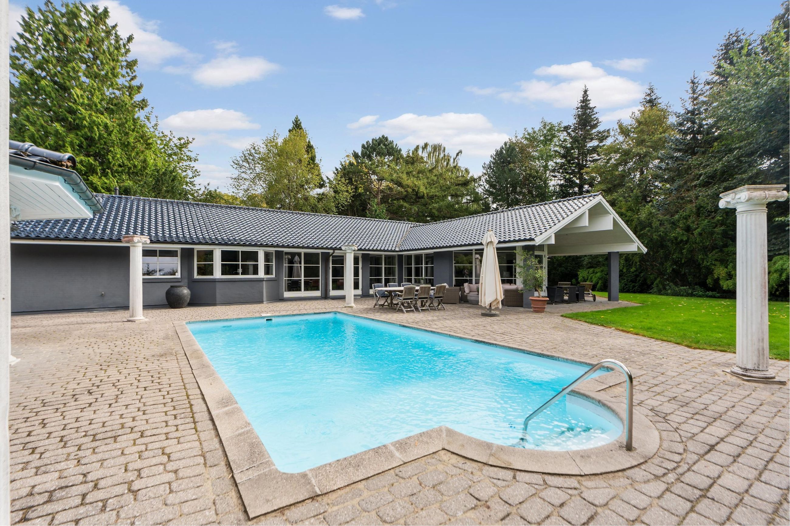 Boligen i et plan er fordelt over 282 kvadratmeter bolig samt dobbelt garage og poolhus. Herudover finder man forældre-afdeling med stort soveværelse, walk-in samt badeværelse med spa. Imponerende vestvendt stue med pejs som forbinder spisestuen samt køkken. Ydermere findes 3 gode soveværelser, 2 badeværelser, bryggers, samt 2 opbevaringsrum. Til huset hører flot have, port/indkørsel, pool og poolhus med badeværelse.