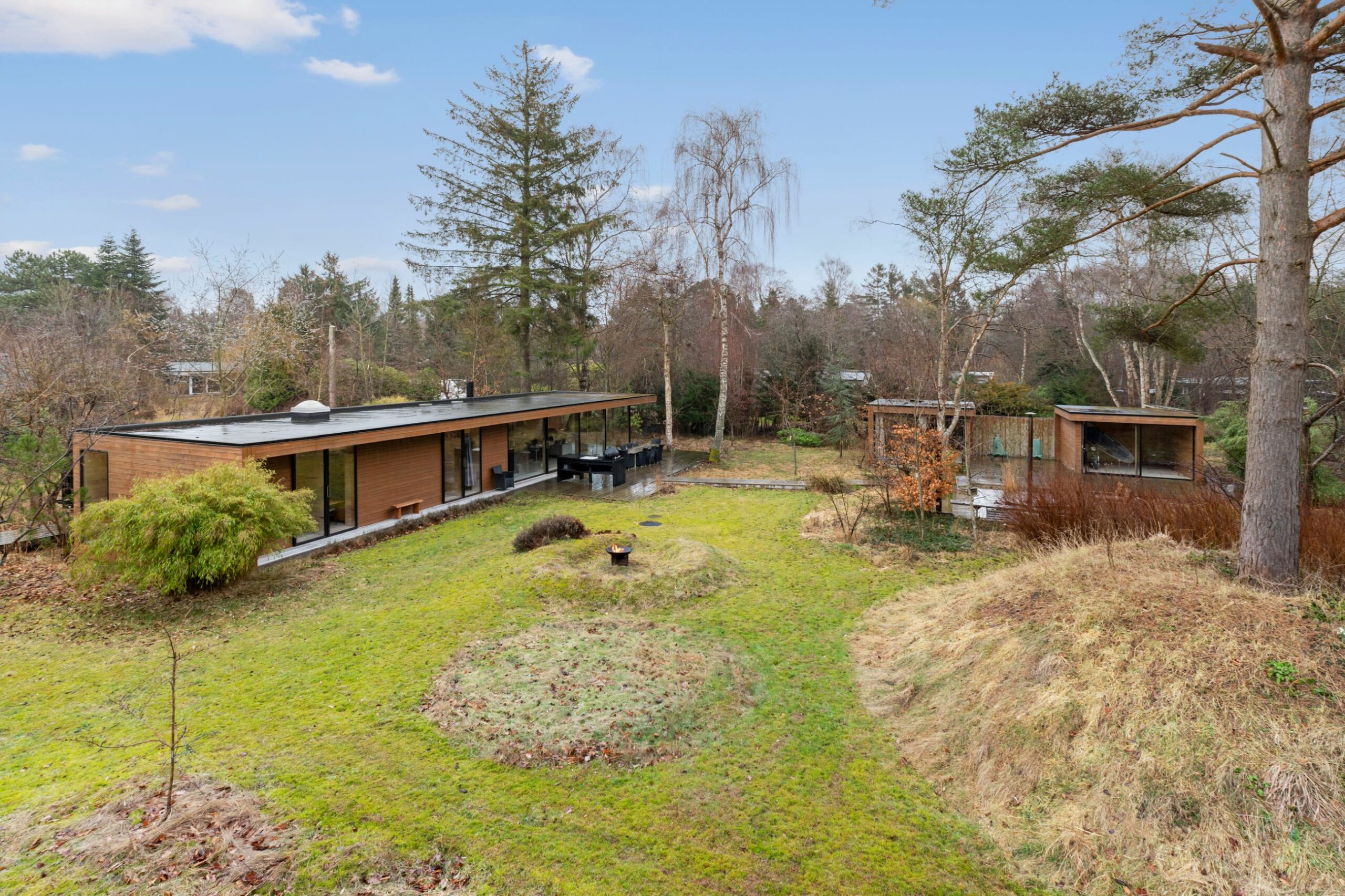 Vi er begejstret uden mådeholdenhed. Dåbsattesten på Fyrrestien 22 siger 2013. Det er bygget til familien af en tømrer, som også er arkitekt. Det er bygget med håndværk så detaljeret, at selv de usynlige vinduesrammer er en tømrers håndarbejde. Stilen er New Nordic møder Japan med sammenhængende terrasser og udebelysning. Det er et sommerhus med vinduer fra gulv til loft, altså masser af lys, masser af natur, som sad man på en overdækket terrasse. Med 105 m2 plus annekser er her plads til familien med børn og venner på besøg. Lækkert køkken, lækre badeværelser med guldvarme, varmepumpe, nedgravet vildtmarksbad, udekøkken. Og så styres udendørslyset via en app. Grunden er på 1.832 m2 og ligger som den sidste matrikel på vejen. Alt er lige til at flytte ind i.