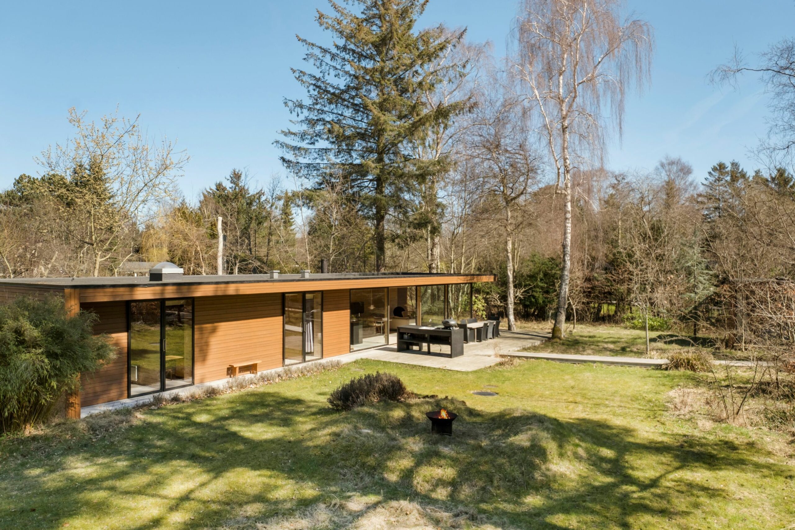Vi er begejstret uden mådeholdenhed. Dåbsattesten på Fyrrestien 22 siger 2013. Det er bygget til familien af en tømrer, som også er arkitekt. Det er bygget med håndværk så detaljeret, at selv de usynlige vinduesrammer er en tømrers håndarbejde. Stilen er New Nordic møder Japan med sammenhængende terrasser og udebelysning. Det er et sommerhus med vinduer fra gulv til loft, altså masser af lys, masser af natur, som sad man på en overdækket terrasse. Med 105 m2 boligkvadratmeter, 2 annekser og indbygget redskabsrum er der samlet 155 m2, hvorfor der er plads til den store familie med børn og venner på besøg. Lækkert køkken, lækre badeværelser med guldvarme, varmepumpe, nedgravet vildtmarksbad, udekøkken. Og så styres udendørslyset via en app. Grunden er på 1.832 m2 og ligger som den sidste matrikel på vejen. Alt er lige til at flytte ind i.