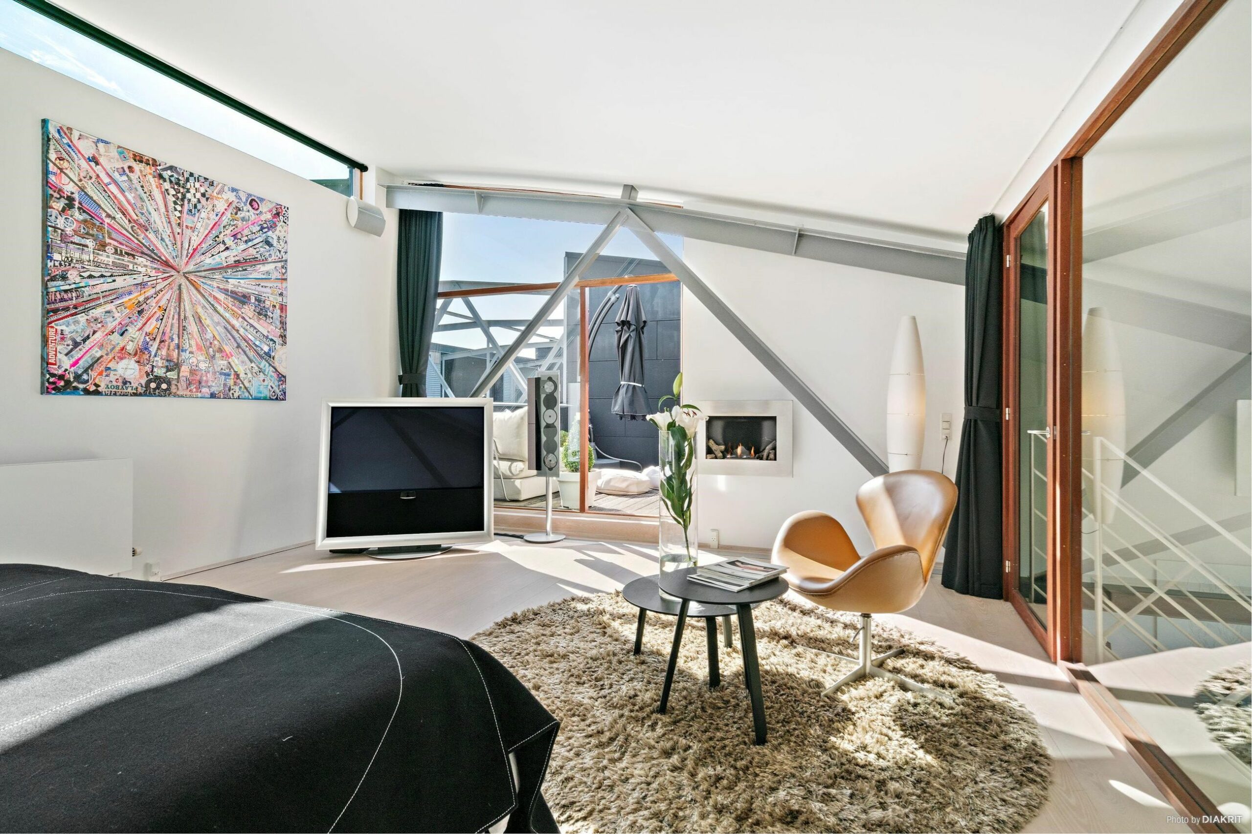 Lejligheden på Galionsvej 7 er en penthouse med øst- og sydvendt terrasse, rå og elegant er den med sit industrielle udseende, men også med den berøring, som er så dansk i dansk designkultur. Her er flere plan, hvor der i etagen med køkkenalrum og stue i åbent forløb er højt til loftet og synlige, gennemgående spær fra den oprindelige konstruktion. Bare lækkert. Her er 158 m2 med den smukkeste solopgang på altanen nede og terrassen oppe. Fred og ro, ingen biler, privat parkeringsplads i kælderen med elevator op og ned, privat bådplads lige uden for døren, 500 meter til den nye Inderbro til Nyhavn, fællesfaciliteter som gæstelejlighed, bådelaug, kajakforening og udvalg til begrønning, så der altid er grønne områder omkring Torpedohallen.