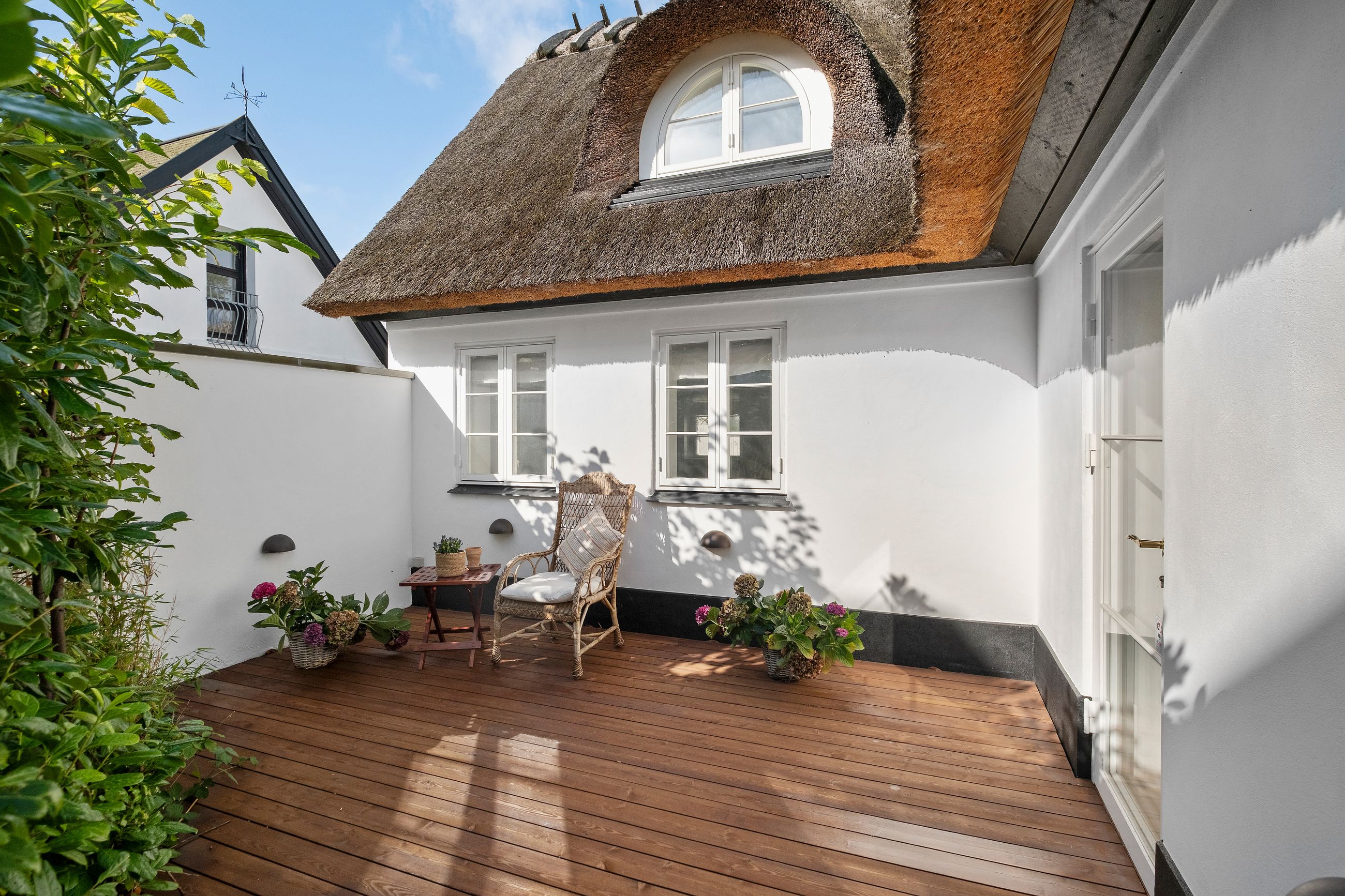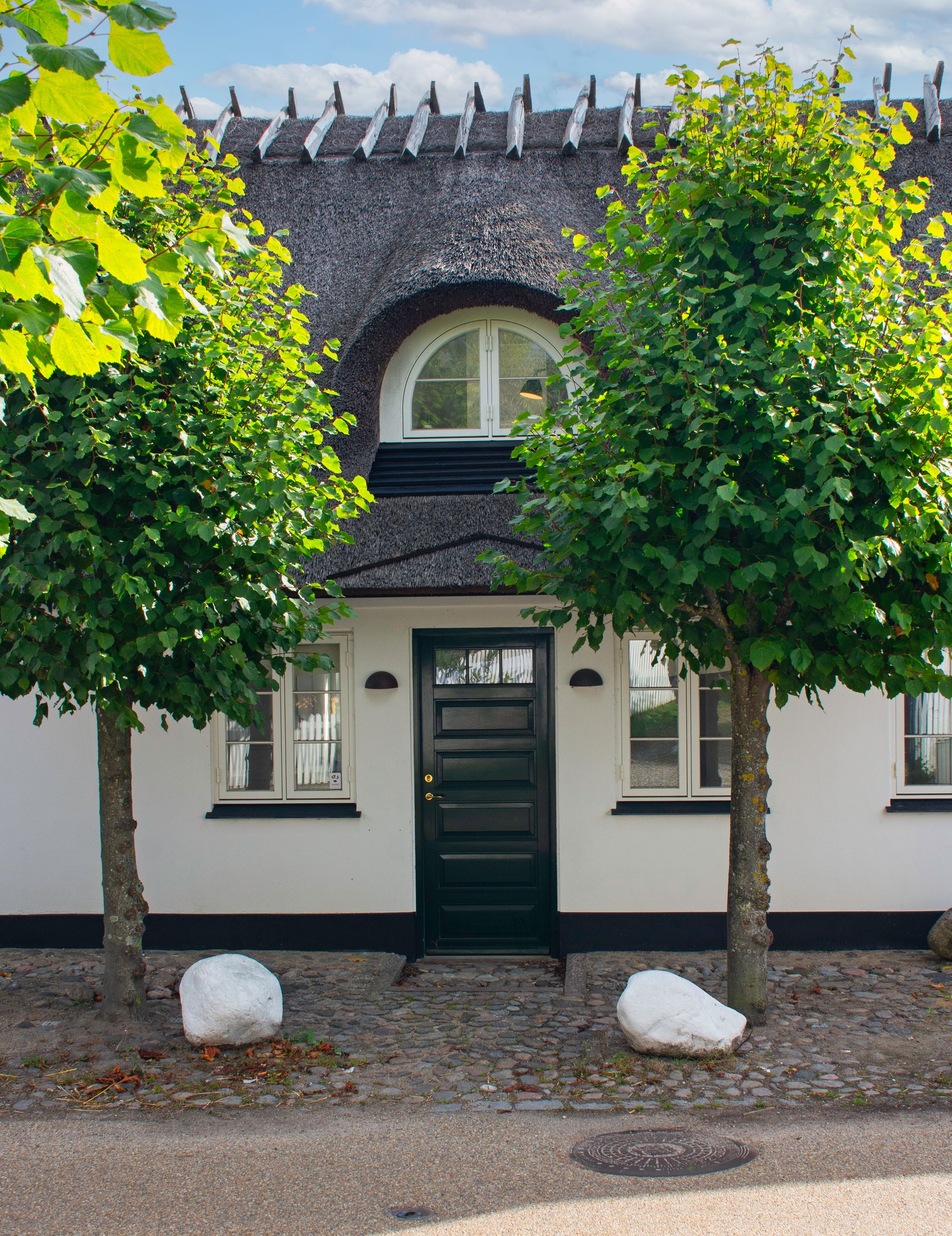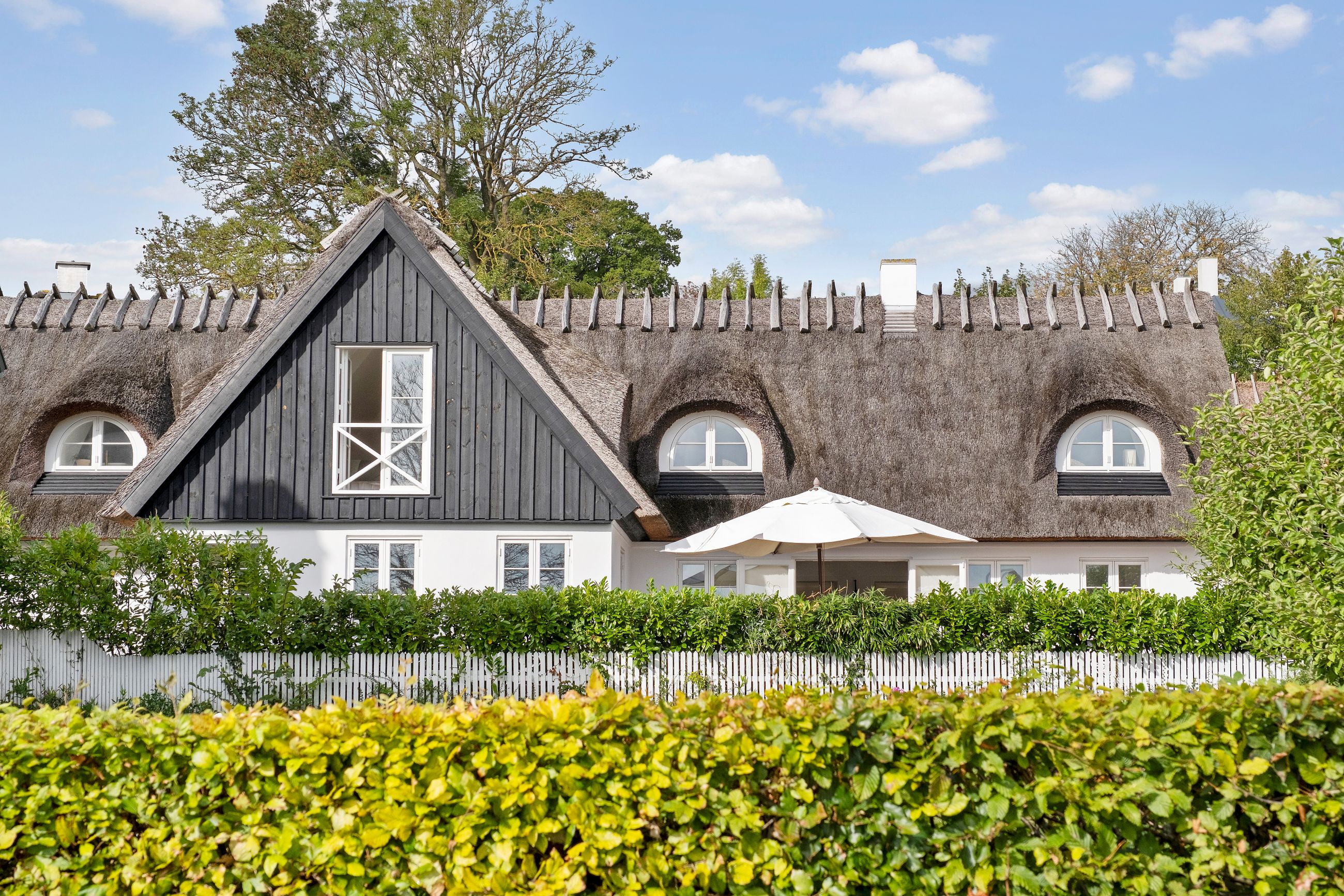Den slags idyl i metermål værnes der om. Så da huset tidligere brændte ned til grunden, blev det genopført i helt samme stil. Udefra falder det fuldstændigt ind i omgivelserne med stråtækt tag, sort træværk og fyldningsdøre, hvidkalket murværk, koblingsvinduer og landsbyhæk. Det er da et originalt hus fra 1700-tallet? Nej, det er fuldstændigt nybygget!