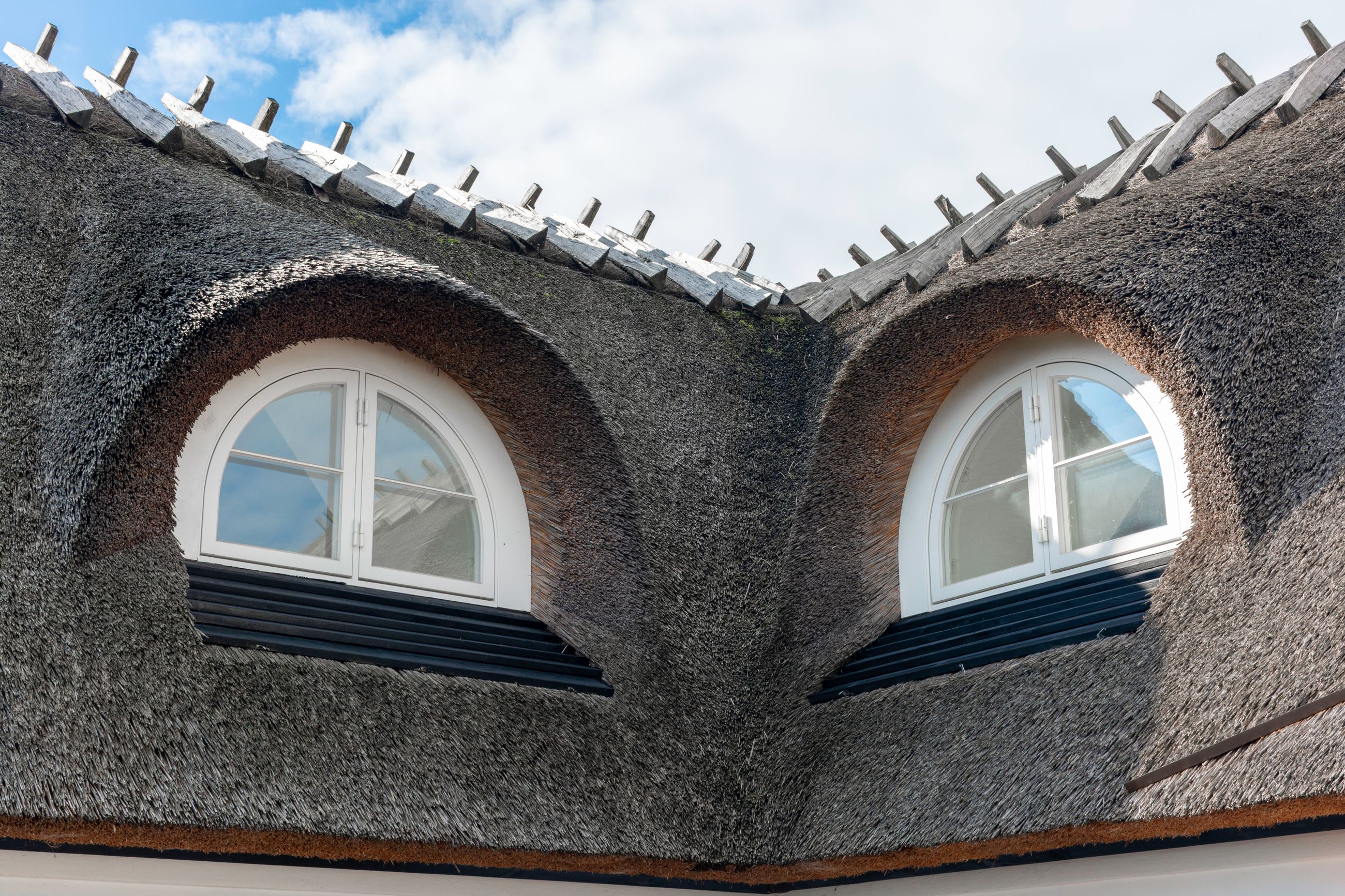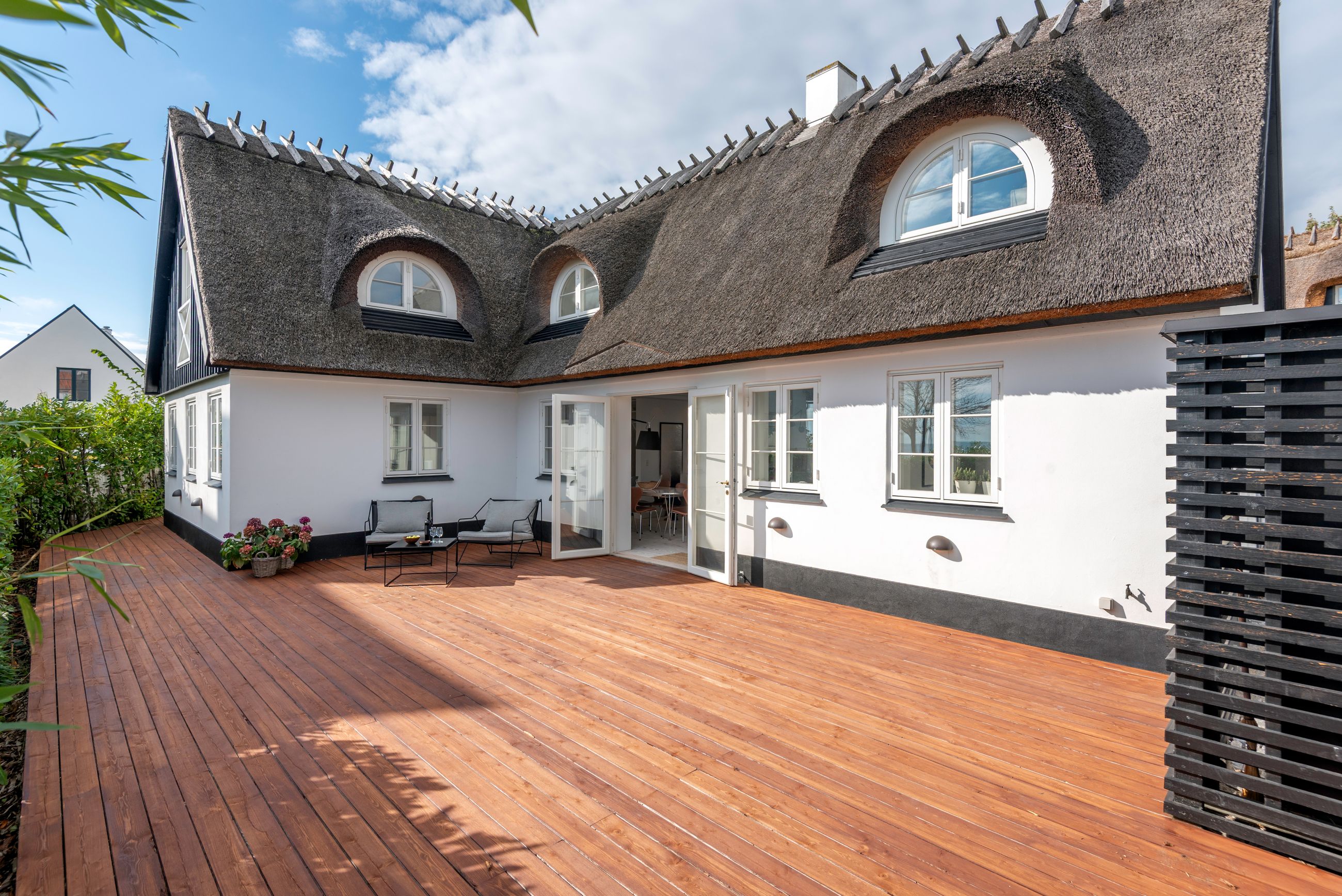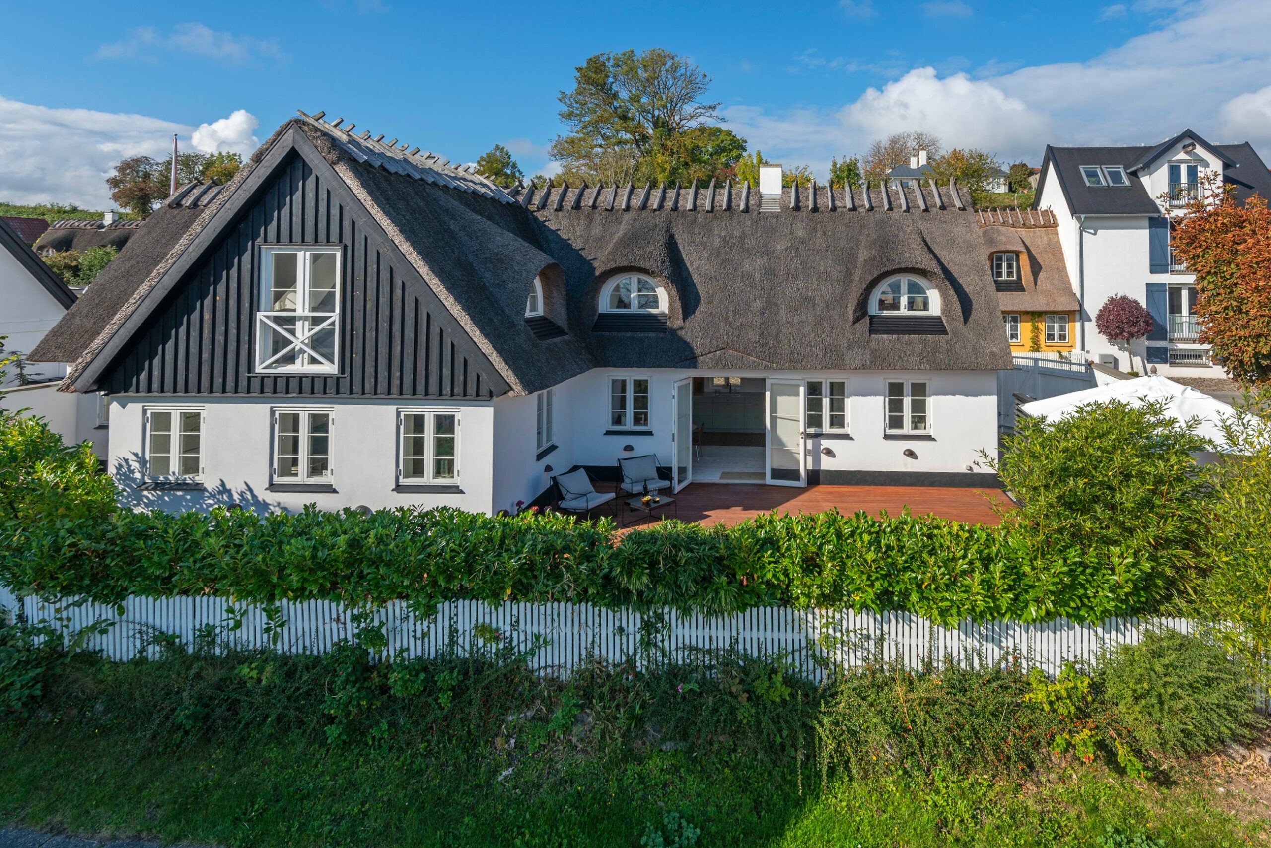 Den slags idyl i metermål værnes der om. Så da huset tidligere brændte ned til grunden, blev det genopført i helt samme stil. Udefra falder det fuldstændigt ind i omgivelserne med stråtækt tag, sort træværk og fyldningsdøre, hvidkalket murværk, koblingsvinduer og landsbyhæk. Det er da et originalt hus fra 1700-tallet? Nej, det er fuldstændigt nybygget!