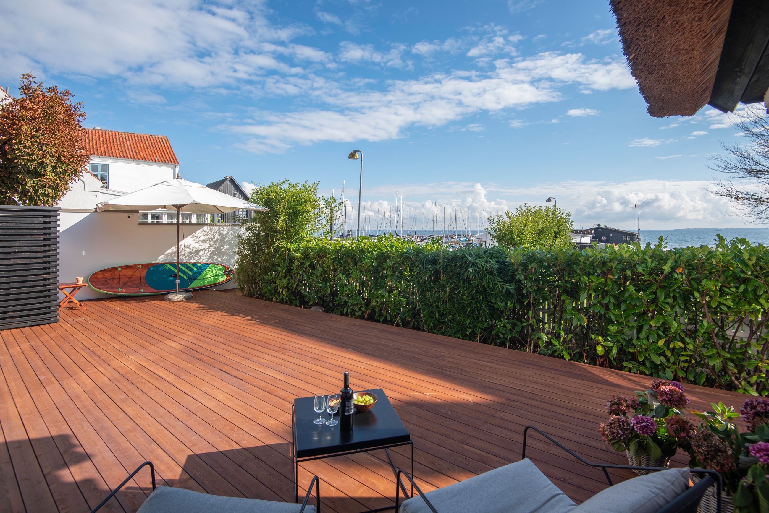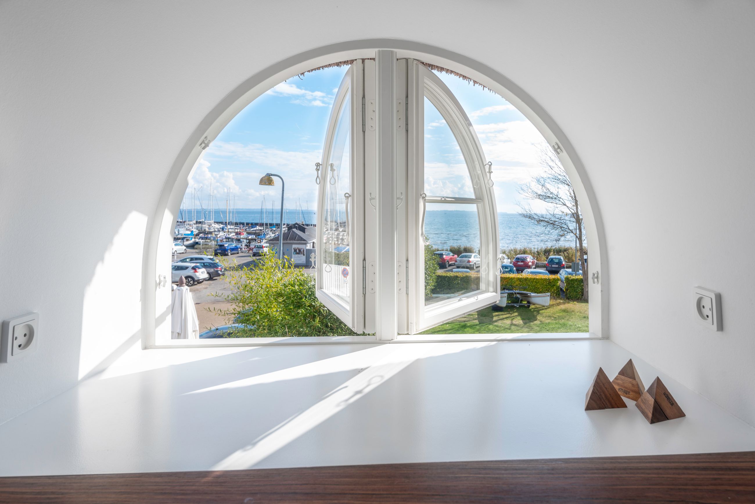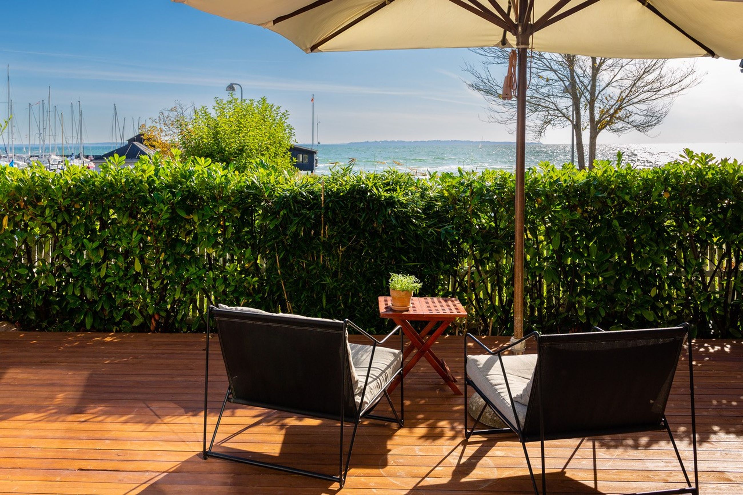 Lige ud til havnen ligger vi, der er den flotteste udsigt over vandet fra ethvert af husets rum. Her er livsbekræftende puls uden larm, vitterlig kun 60 sekunder til stranden. Tag kaffen med ud, og mærk sandet mellem tæerne. Det er så tæt på, at man ikke behøver overtøjet. Nå at se den flotteste solopgang på lufteturen med hunden om morgenen. Definitionen på nydelse.