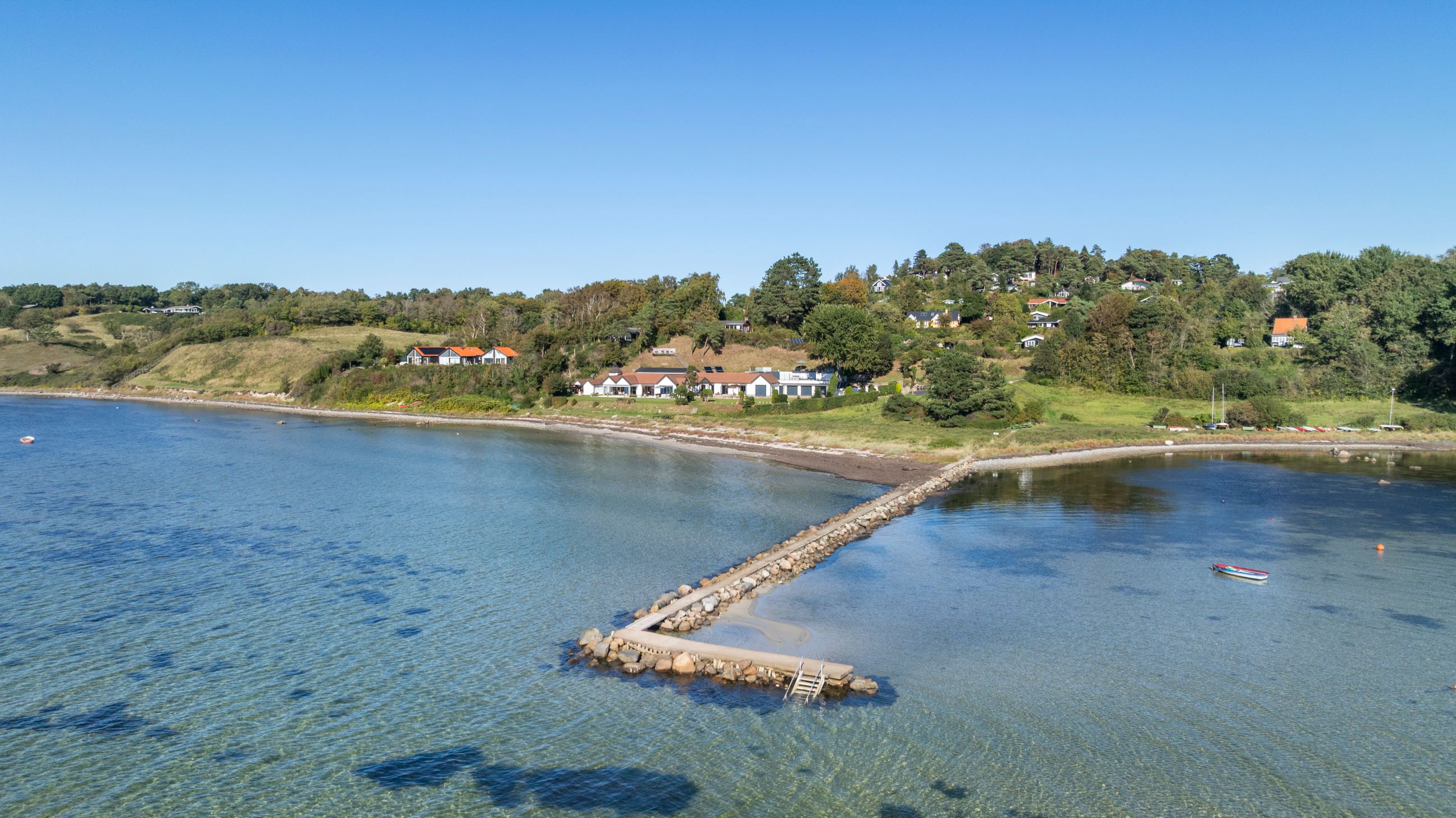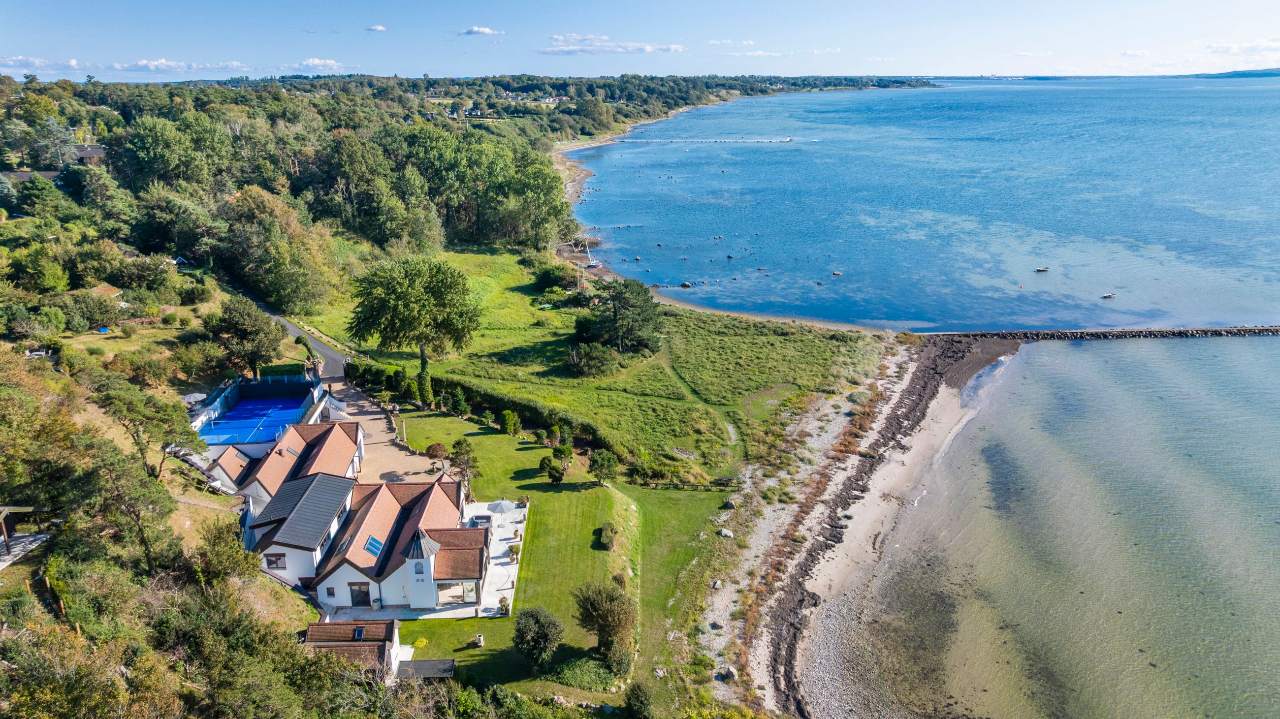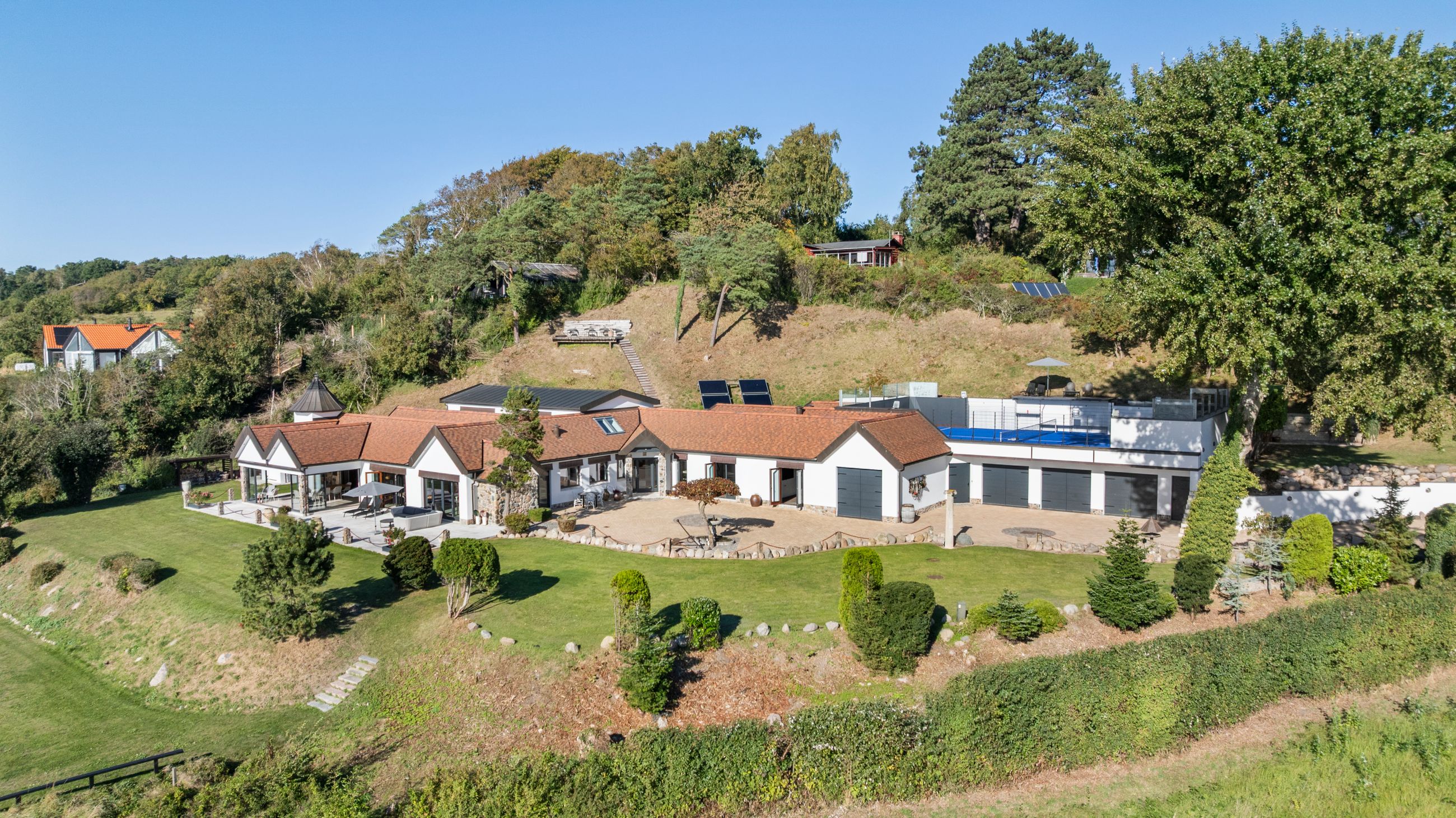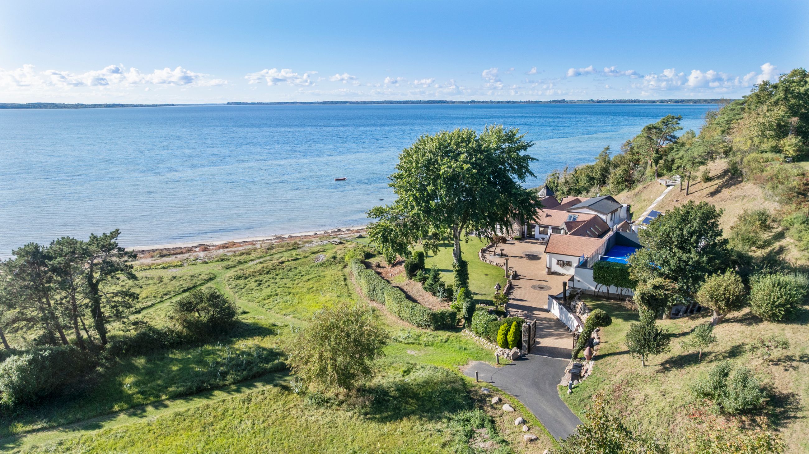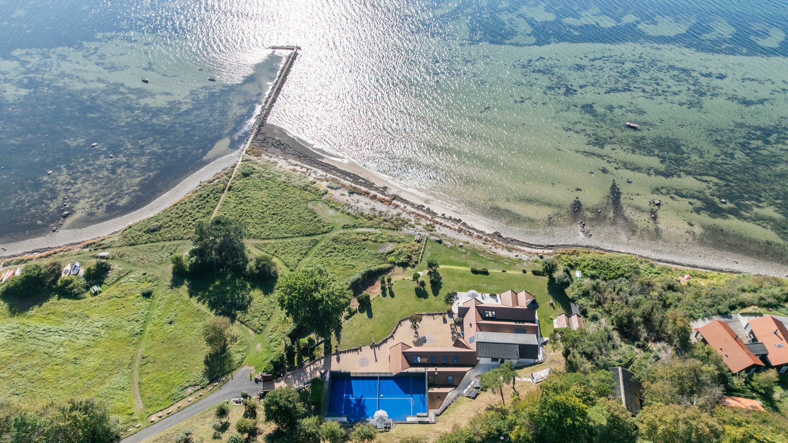 Sommerhuset på Grævlingehøjvej 48 er tilskuer til det hele. Selvfølgelig, får man lyst til at sige. Det står i 1. række til fjorden på en 3.726 m2 stor naturgrund med masser af privat fjordbred, og med 537 etagemeter er det et sommerhus, der fylder godt i terrænet. Kvarteret er kendt for sine store matrikler, men der er ingen matrikler som Grævlingehøjvej 48. Huset er inspireret af den spanske byggestil, som vi ser den i Californien. Det er tegnet af Hornbæk Gruppen og bygget i 2011 og følger organisk skræntens natur. Det er fuldmuret med travertin på gulvet ude og inde, og her er masser af plads til familiens børn, dine, mine og vores, og de får det privilegeret og luksusgodt her med paddel i baghaven og al vandsport i den maritime natur. Udsigterne er mageløse. Fjordvandet flyder op i den blå himmel, intet forstyrrer blikket, alt ligger ugeneret, måske en måge, en skarv eller sulten hejre kan kigge med, når de flyver forbi. Den stort, elektriske port er ikke sådan lige at passere, med mindre den er åben.