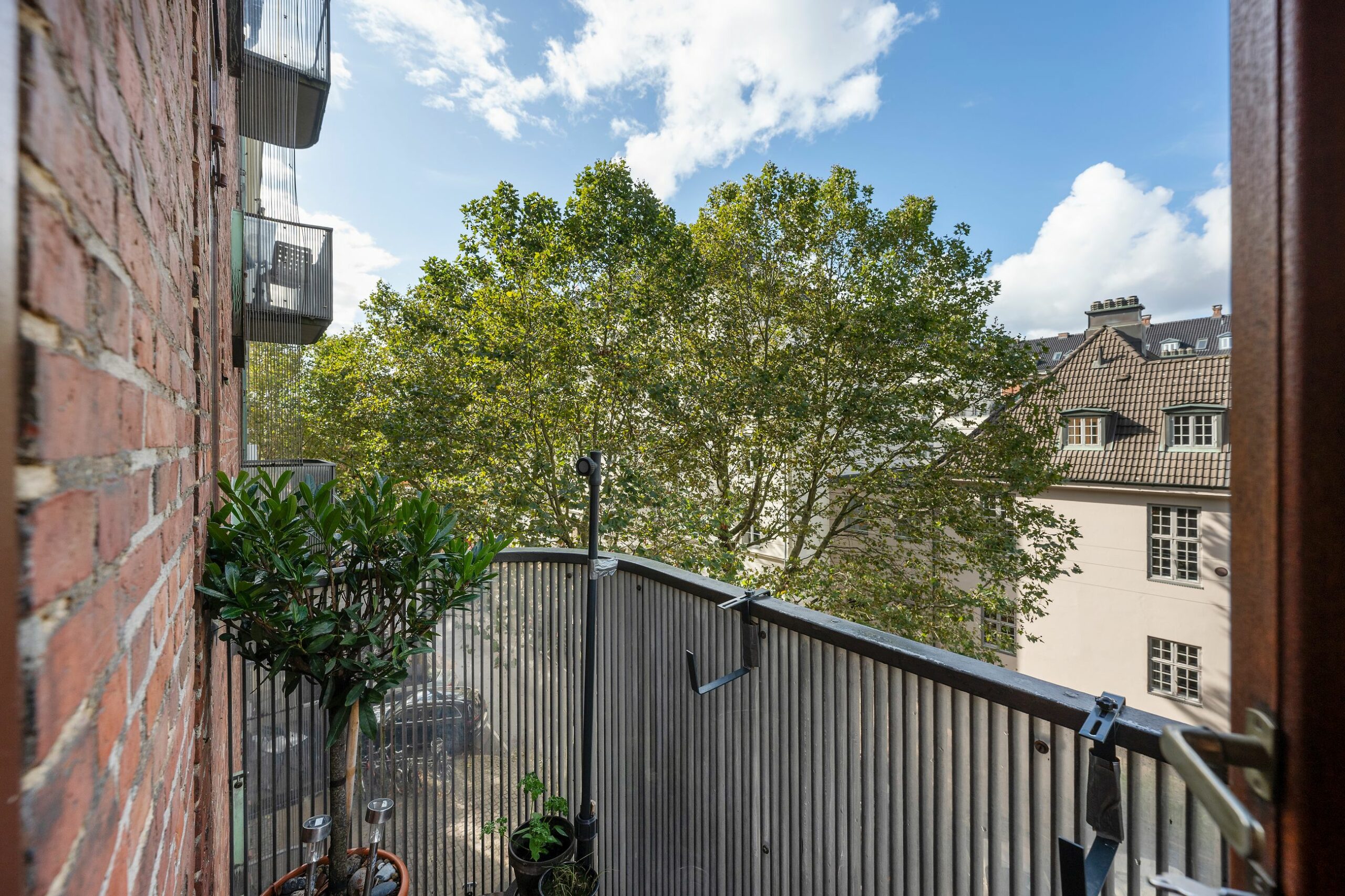 Champagnehuset er bygget i 1939 i den danske version af funkis. Lejligheden oppe på 3. sal er på 133 m2, og som en af de få lejligheder i Indre By går elevatoren lige til døren. Ja, kald på den fra en knap i lejlighedens entré. Her er dørtelefon og tænk, skab ud til trappeopgangen til mælk fra mælkemanden. Sådan var det i 1930erne, i dag en fredet nostalgi. Her er 2 balkoner, den ene med udsigt til Churchillparken, den anden til gården. Alt er velholdt, alt er lækkert, alt er lige til at flytte ind i.