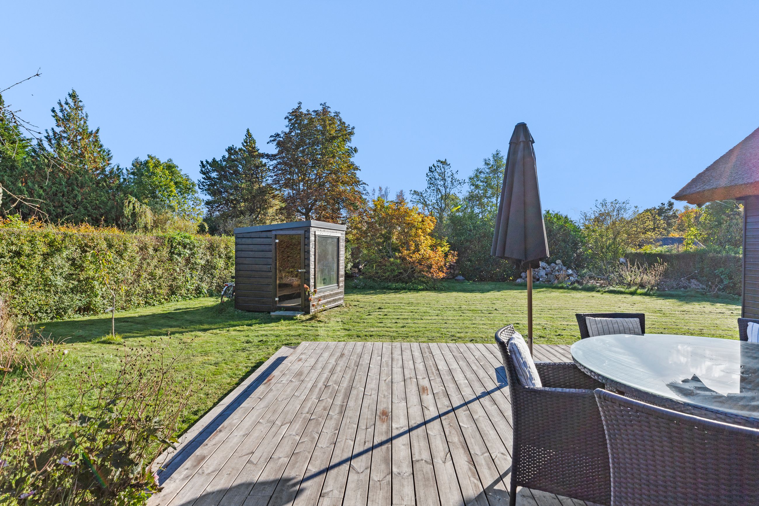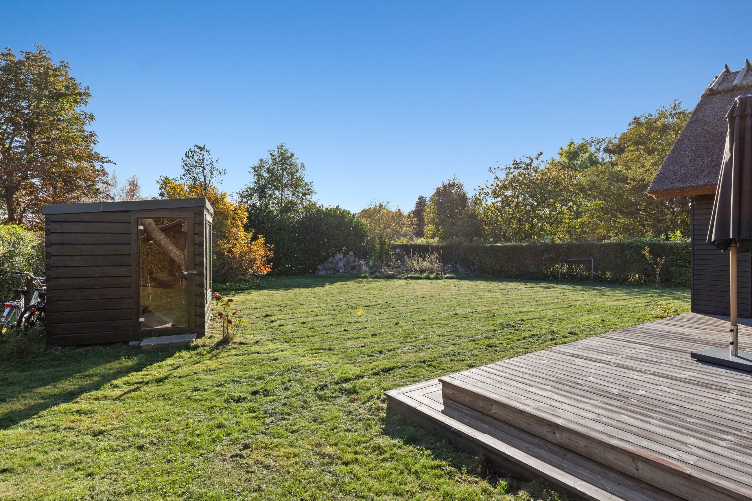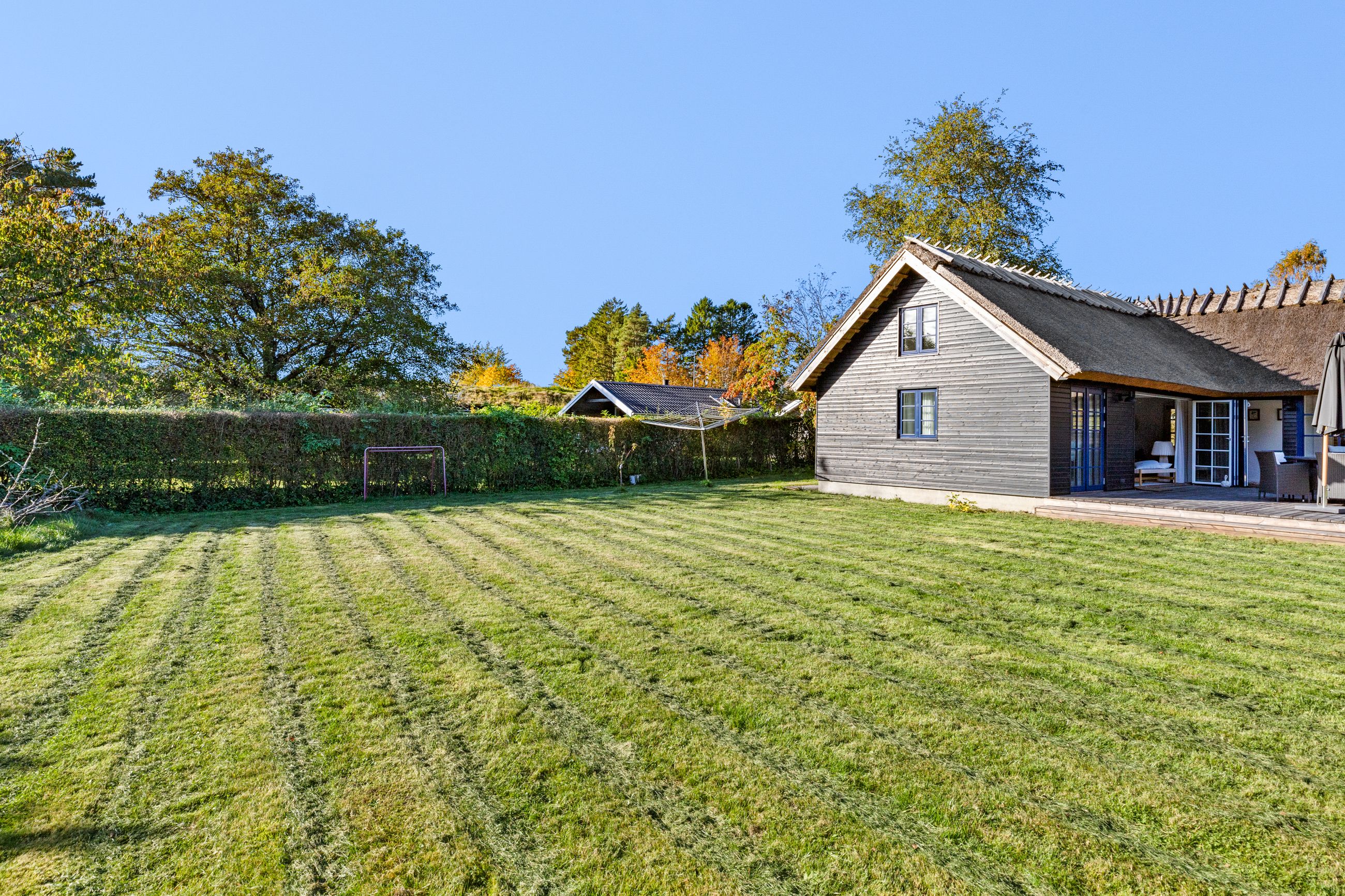 Kun nogle få fugleveje adskiller sommerhuset på Hejrevej 40 i pip-pip-kvarteret fra Ruslands Bakker. Det er et klassisk, sort træhussommerhus med det fineste stråtag fra 2023. Det er bygget i 1965, men stort set alle 92 m2 er renoveret de sidste par år. Med flere soveværelser, anneks og sauna med udsigt er her plads til familien med børn og venner på besøg. Hejrevej er en stille og rolig sommerhusvej, huset ligger som det sidste hus før svinget til endnu en fugl, Lærkevej. Grunden er på 1.212 m2 med en syd- og sydvendt terrasse, sol hele dagen. Haven? Ja, stor, som robotten ikke har noget imod at holde. Huset er godt isoleret parat til vinterbesøg. Altid læ på terrassen, ingen gadebelysning, her er mørkt, stille, mange stjerner. Glem ikke novemberlyset med de smukkeste lilla og orange farver.