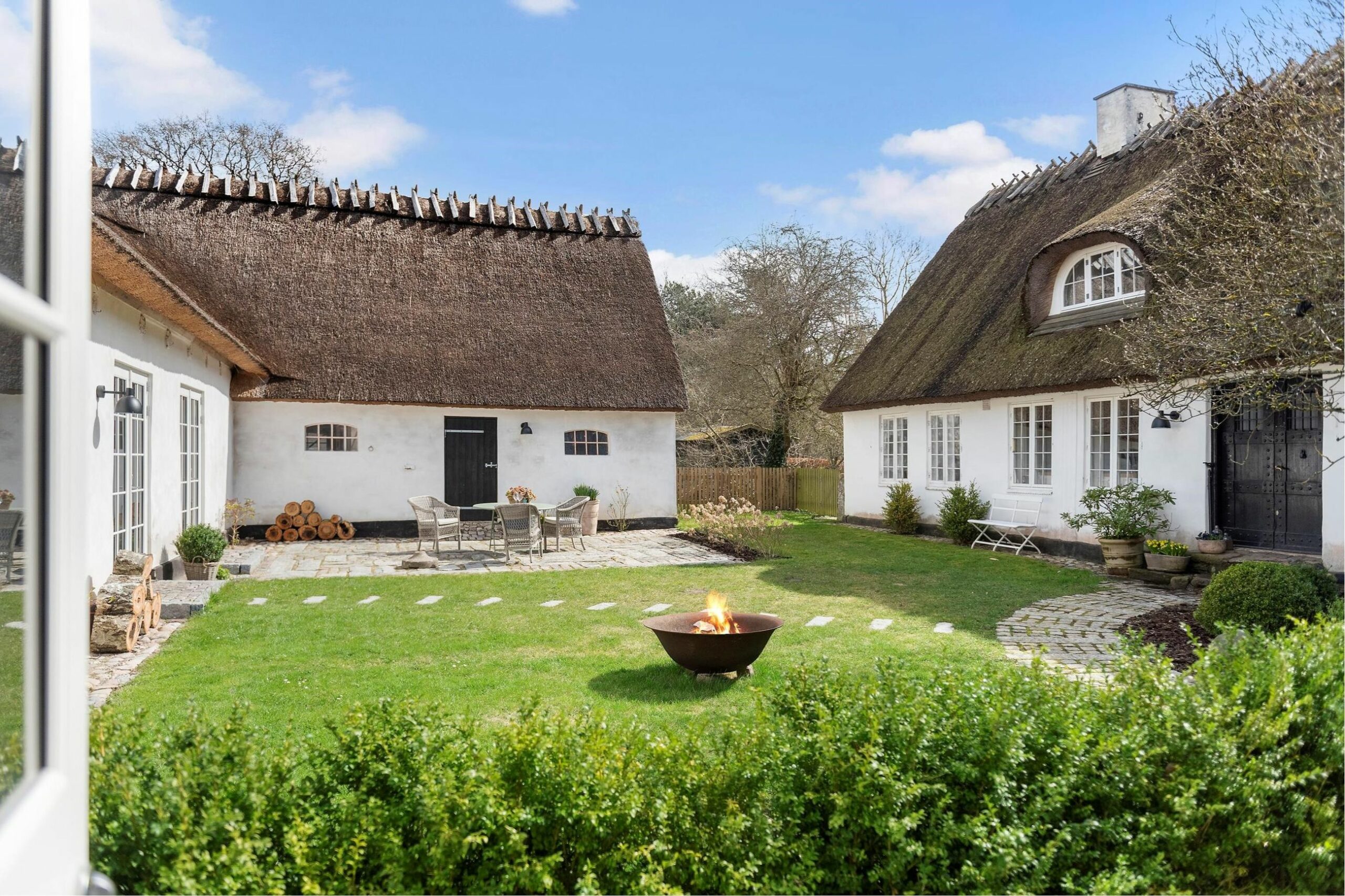 En stråtækt, tidligere ponyrideskole, det er, hvad den firlængede gård på Højleddet i Gammel Holte er. Med 324 m2 bolig og mulighed for yderligere 200 m2 er det så stort, at hele herligheden burde have sit eget postnummer. Firlængede gårde er der ikke mange tilbage af på Sjælland, og slet, slet ikke så tæt på København. Stort set alt er så sjælfuldt renoveret, som kun et hjerte og levende øjne kan renovere. Flere generationer kan bo her, eller måske lejere, men den børnerige familie kan bestemt også fylde hele gården med liv og ny energi. Med poesi, skævheder og charme, med ildsteder, sprossevinduer, det bedste indeklima under stråtaget og smukke buekviste er det i dag en lystgård, fordi man bor her for lystens og fornøjelsens skyld. Det er et spændende og inspirerende hus at vandre rundt i. Haven har en anelse af bondehusidyl, men flise-, brostens- og bordurestensbelægningen er hentet fra den civiliserede bykultur. Hyggelig, lukket gårdmiljø mellem bygningerne. Og så ligger terrassen helt rigtigt på den 2.200 m2 store grund. Mod syd og vest, naturligvis. Nå ja, og så ligger hul 12 i Søllerød Golfklub på den anden side af vejen.