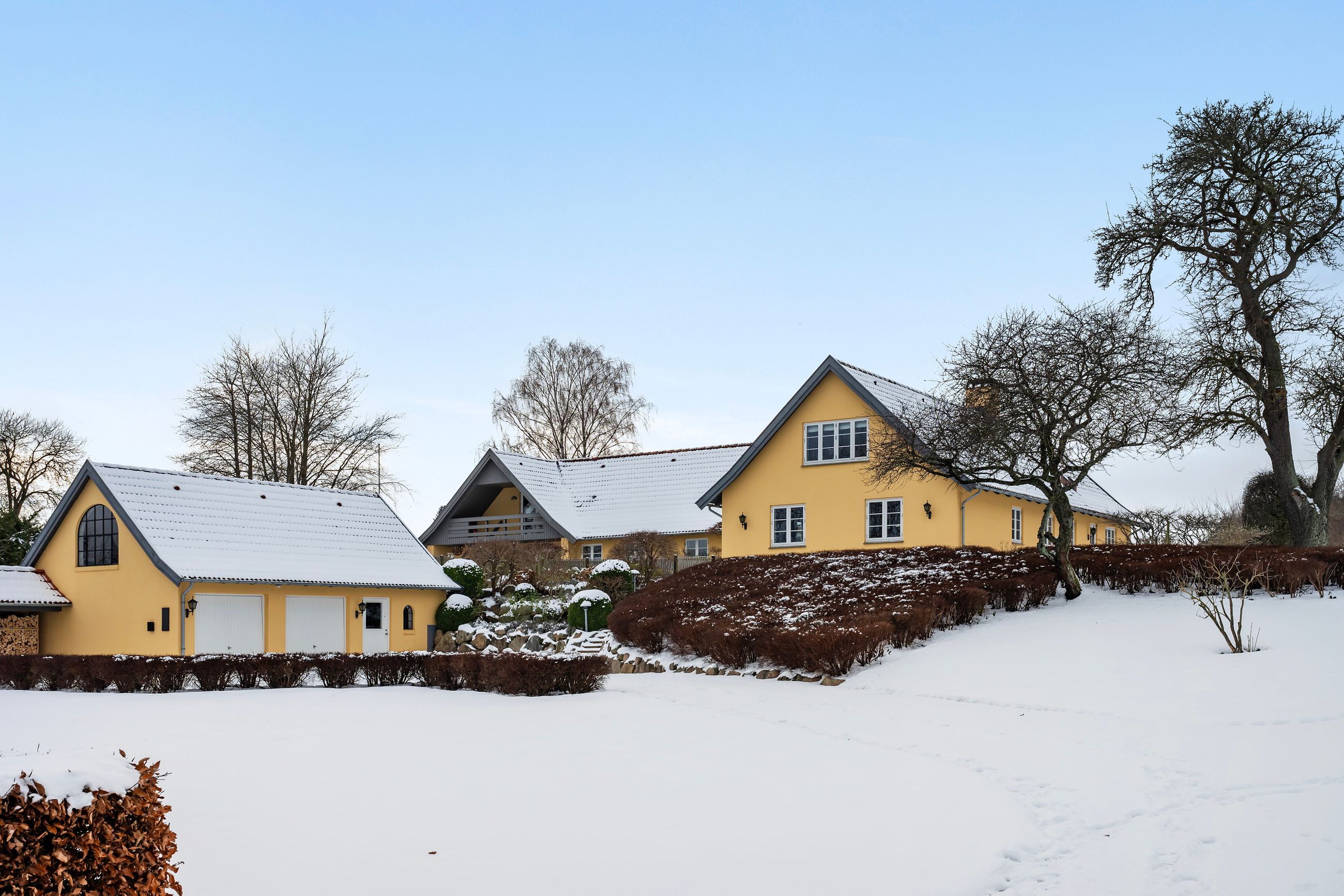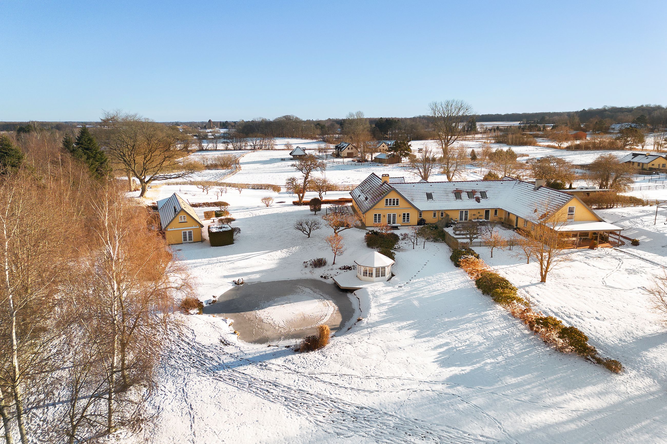 Ejendommen på Jagtvej 12A i Grønholt er ej blot til lyst, som var Ludvig Holberg stadig i live, den er også til fordybelse, ro og eftertanke. Der er heste på fold til den ene side af ejendommen og køer til den anden. De tilhører nemlig naboen. Med 309 m2 bolig i hovedhuset er her plads til lidt af hvert, sådan er det jo på landet. Ja, den er alt for den store familie, og med det selvstændige anneks på 70 m2 er her også plads til flere generationer på samme matrikel. Matriklen er på knap 3 hektar, og ejendommen er nyistandsat i 2024, så her er der ikke meget vedligeholdelse de næste mange år.