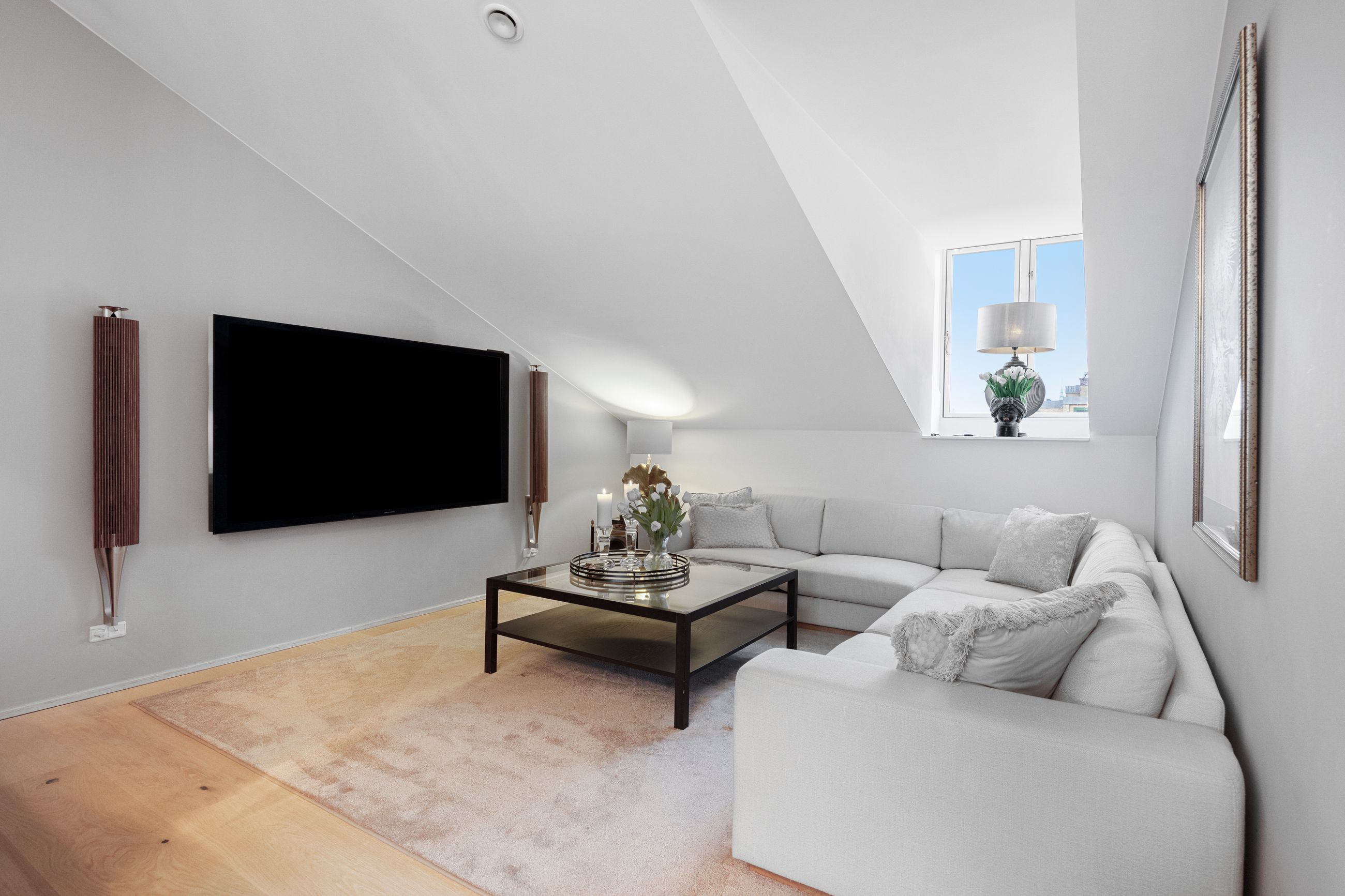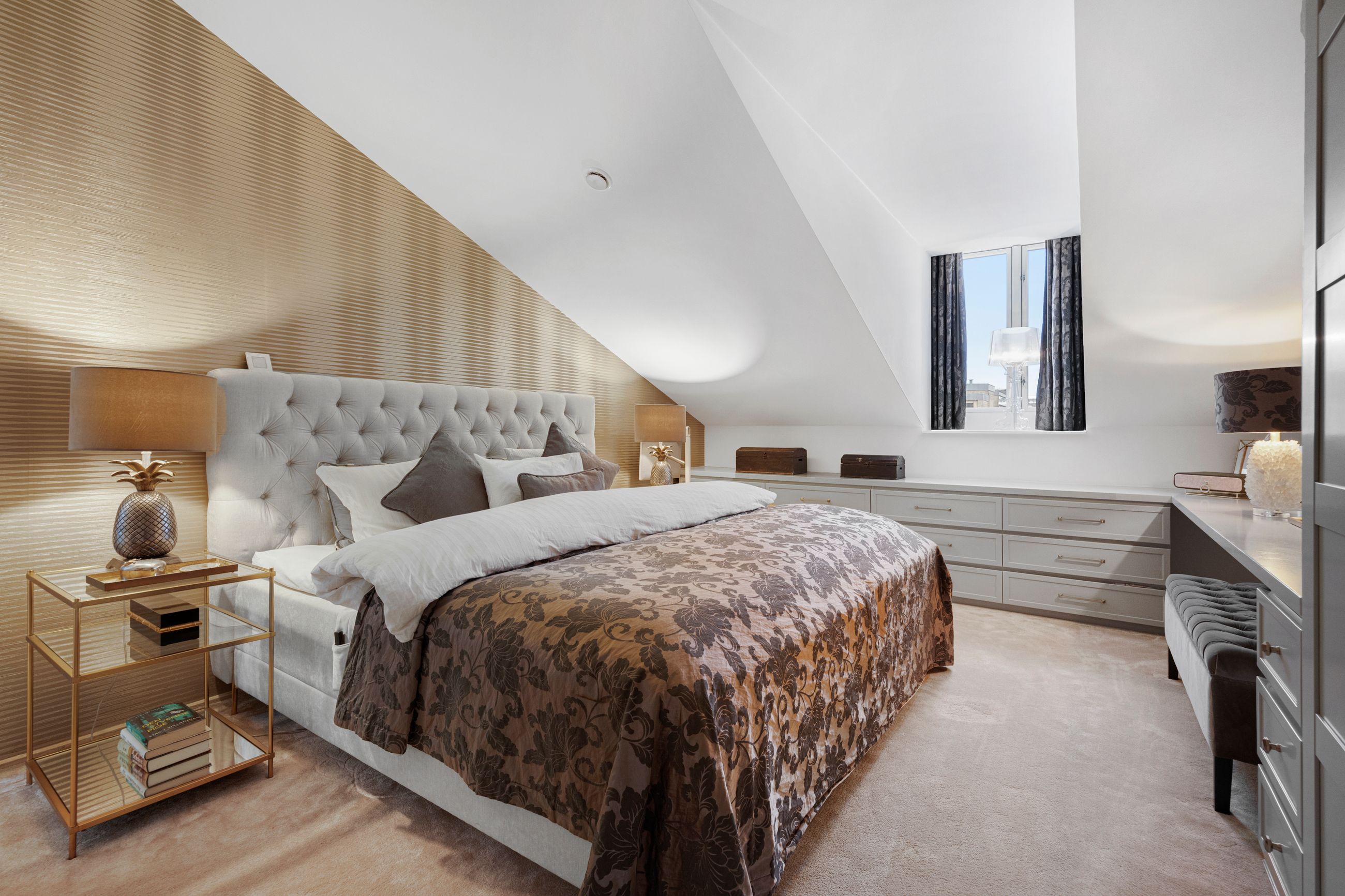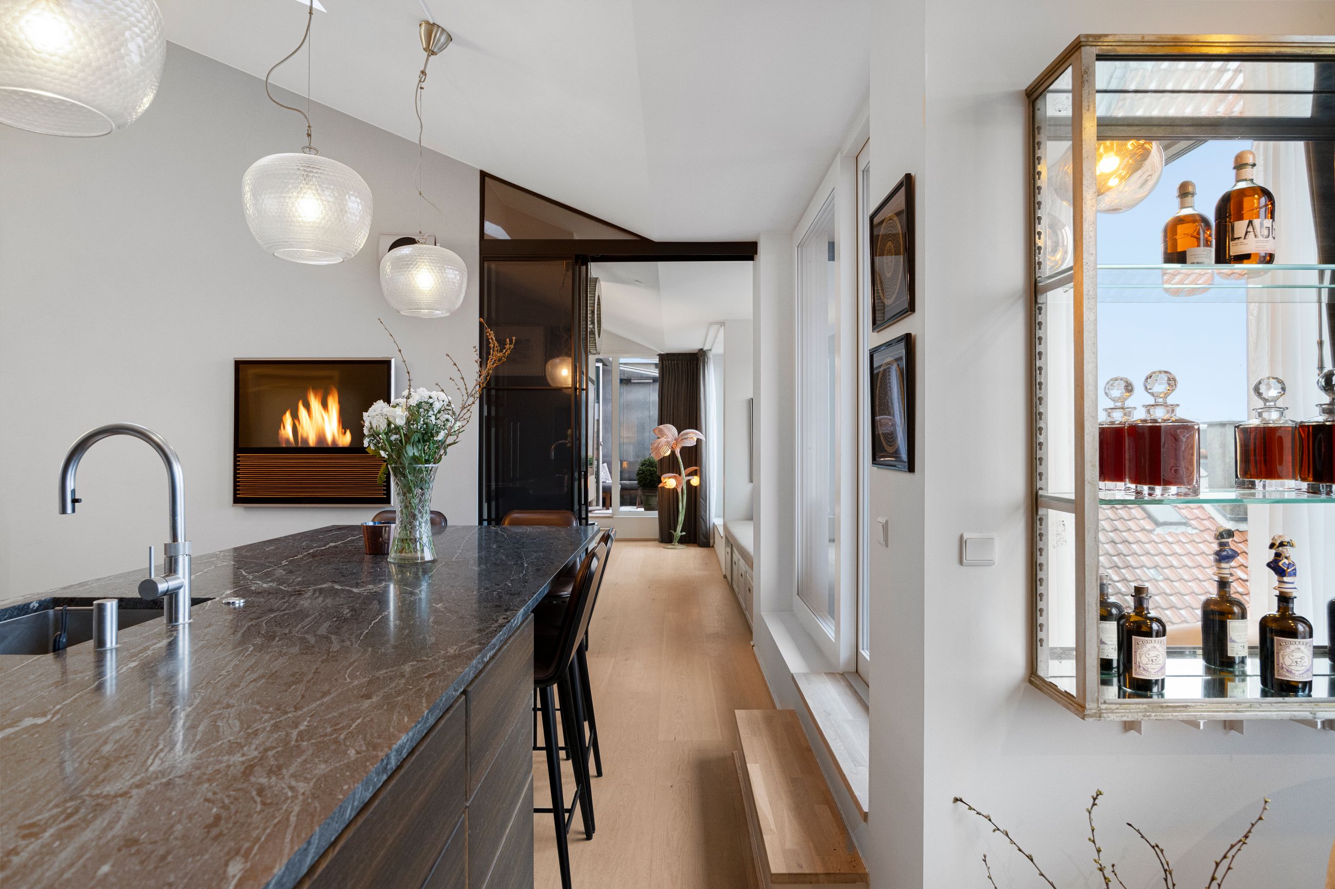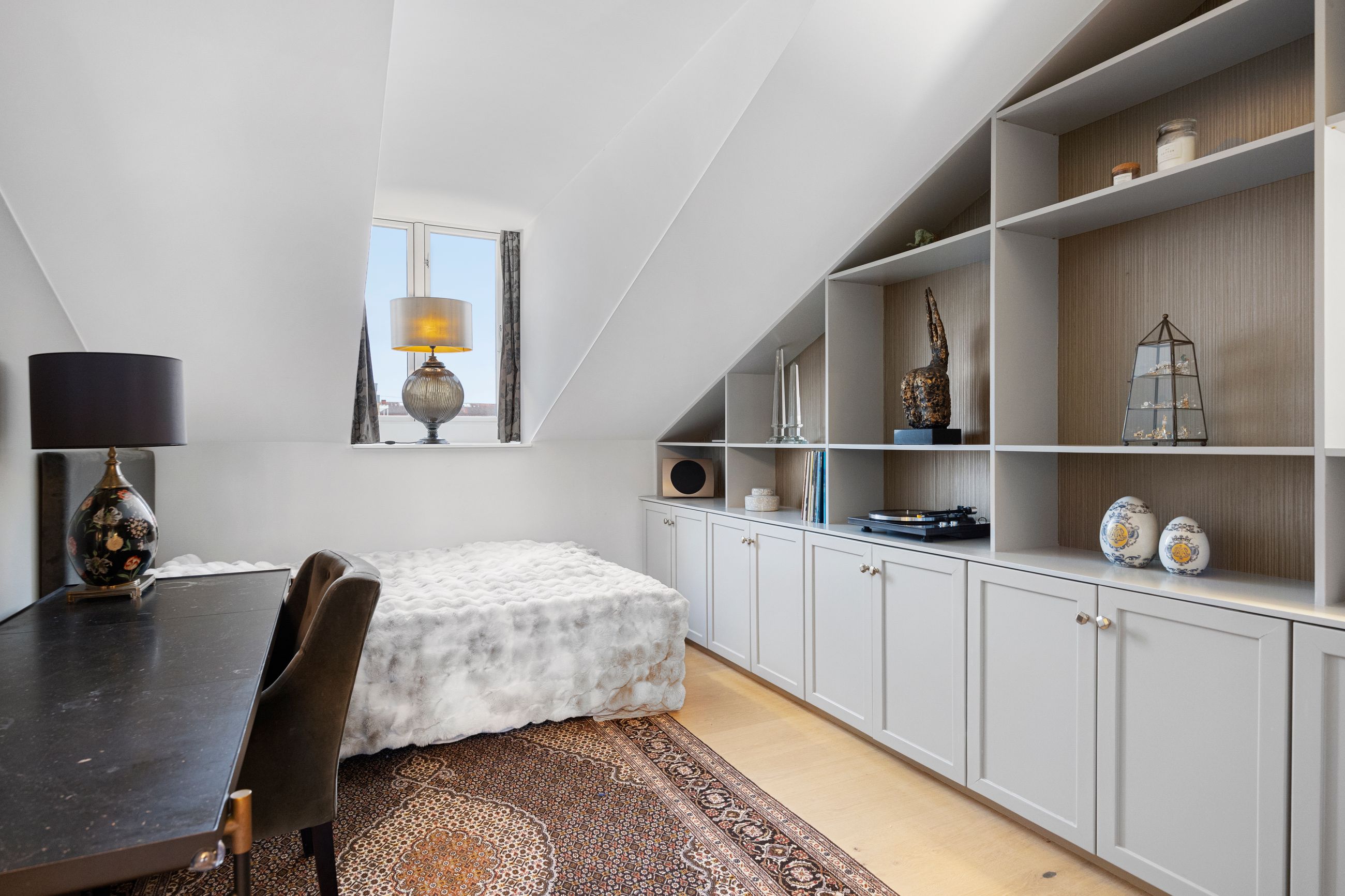 Salomons Palæ, hedder den fredede ejendom i Klerkegade, som i 2017 var igennem en foryngelseskur til 49 spitzenklasse ejerlejligheder. Én af dem ligger på 3. sal oppe under taget med højt til loftet og interessante skæve vinkler. Elevator lige til hoveddøren. Tak. Arkitekturen er livlig med et anerkendende og kærligt tyveri fra den ægyptiske kunst, fra antikken, gotikken, renæssancen og barokken. Det er bygget i 1868 i den historicistiske periode, fællesbetegnelsen for den europæiske arkitekturstrømning. Her er altan ud fra køkkenet og tagterrassen er privat, kun de byfugle, der flyver rundt som små direktører i grå jakkesæt, kan kigge med. En væg i stuen kan nemt flyttes til mere rum og plads. Er det en lejlighed med karaktér og parkeringsplads man leder efter på en af de bedste beliggenheder i Indre By, så finder man næppe noget, der er mere interessant i den bedste del af København.