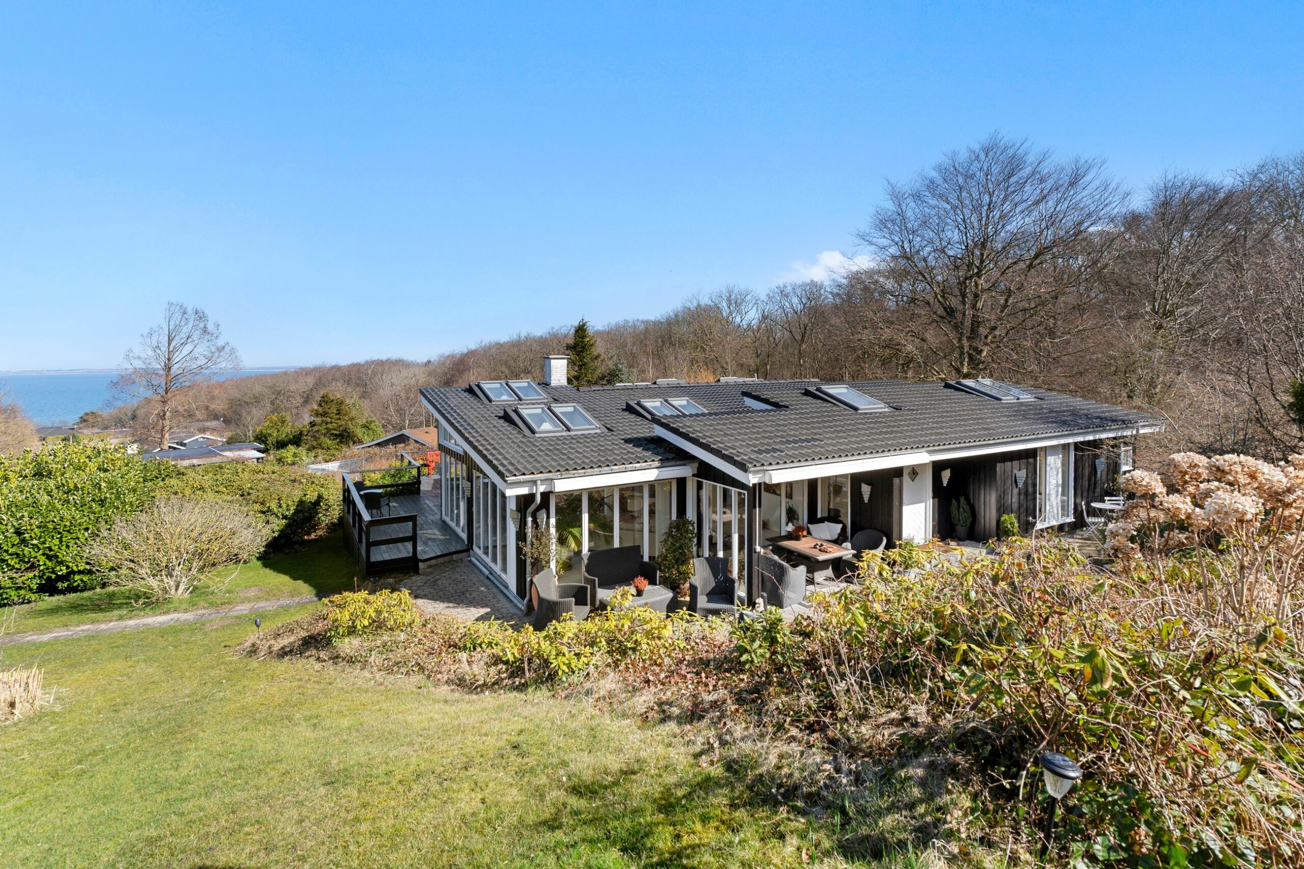 Med store vinduer og døre, som kan skubbes helt til side, er det et hus med masser af lys. Huset er ombygget i 2011 til den hyggelige sommerhusstemning på 181 m2 fordelt på underetage og stueplan. Grunden er på 2.965 m2 med rådyr, som ikke er spor generte. De har deres egen rute gennem bakkerne. Huset helt rigtigt på grunden med en stor terrasse mod syd og vest, så der er solskin på kinder og bare maver hele dagen. Fantastiske solnedgange i Kattegat.