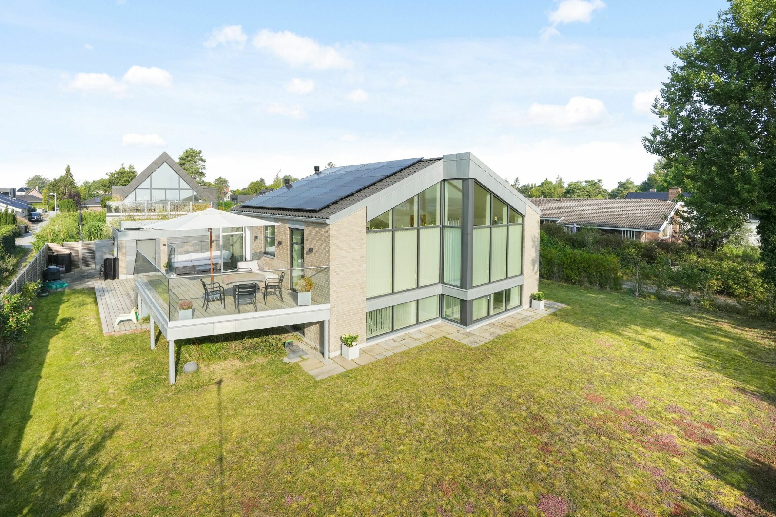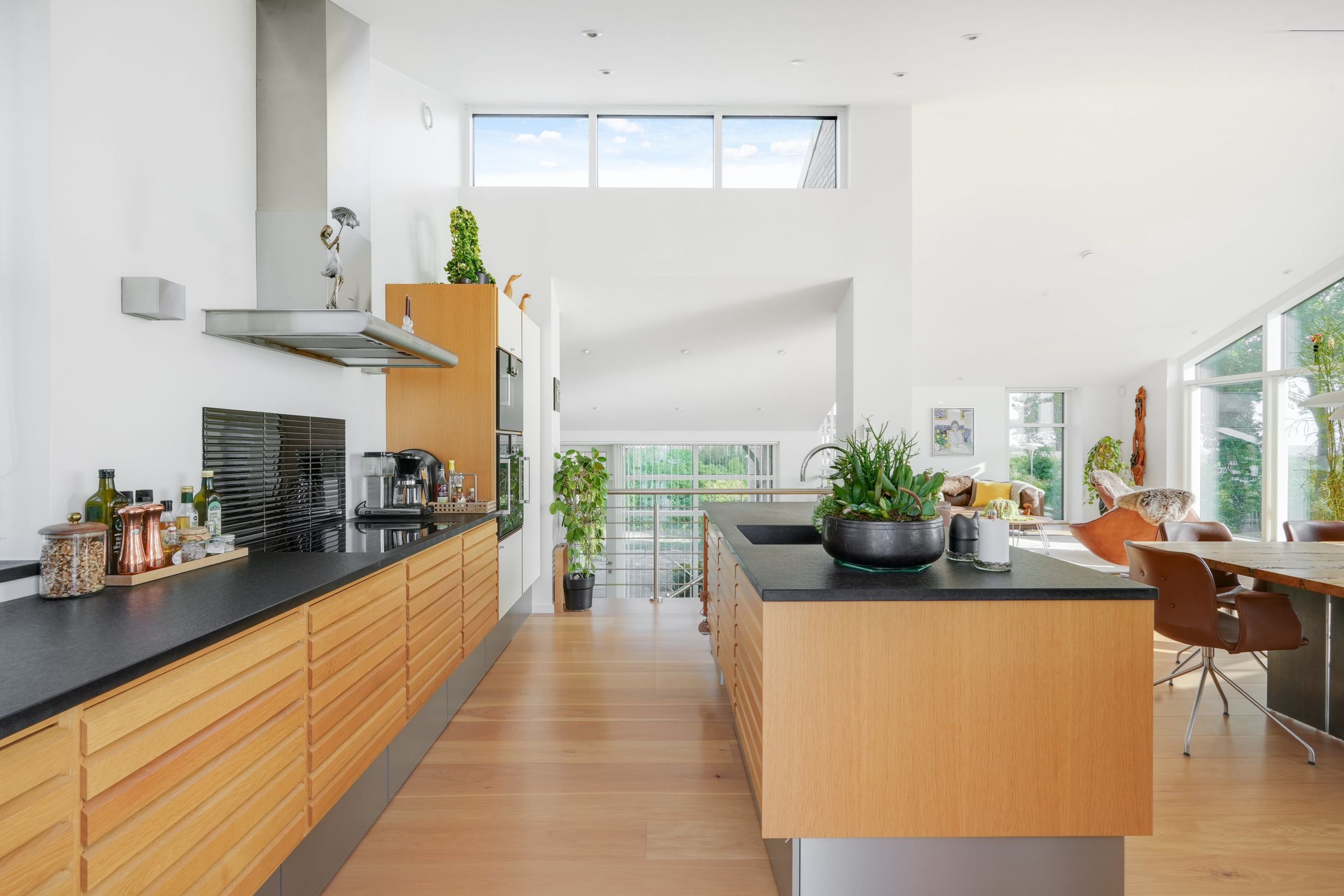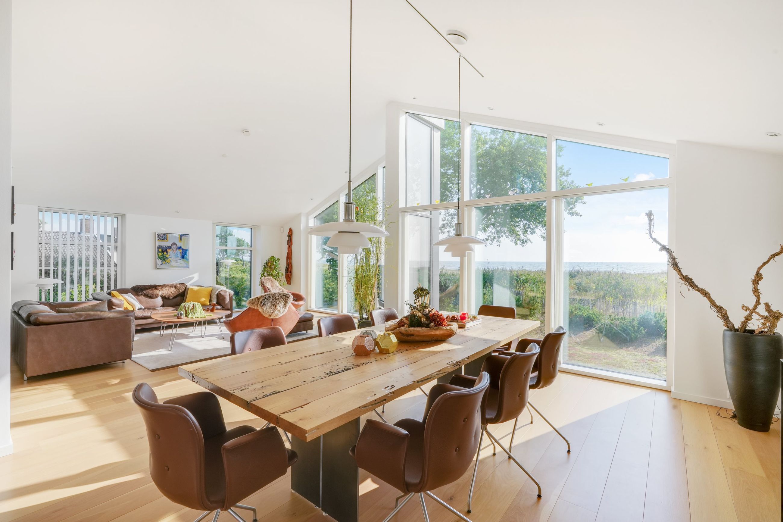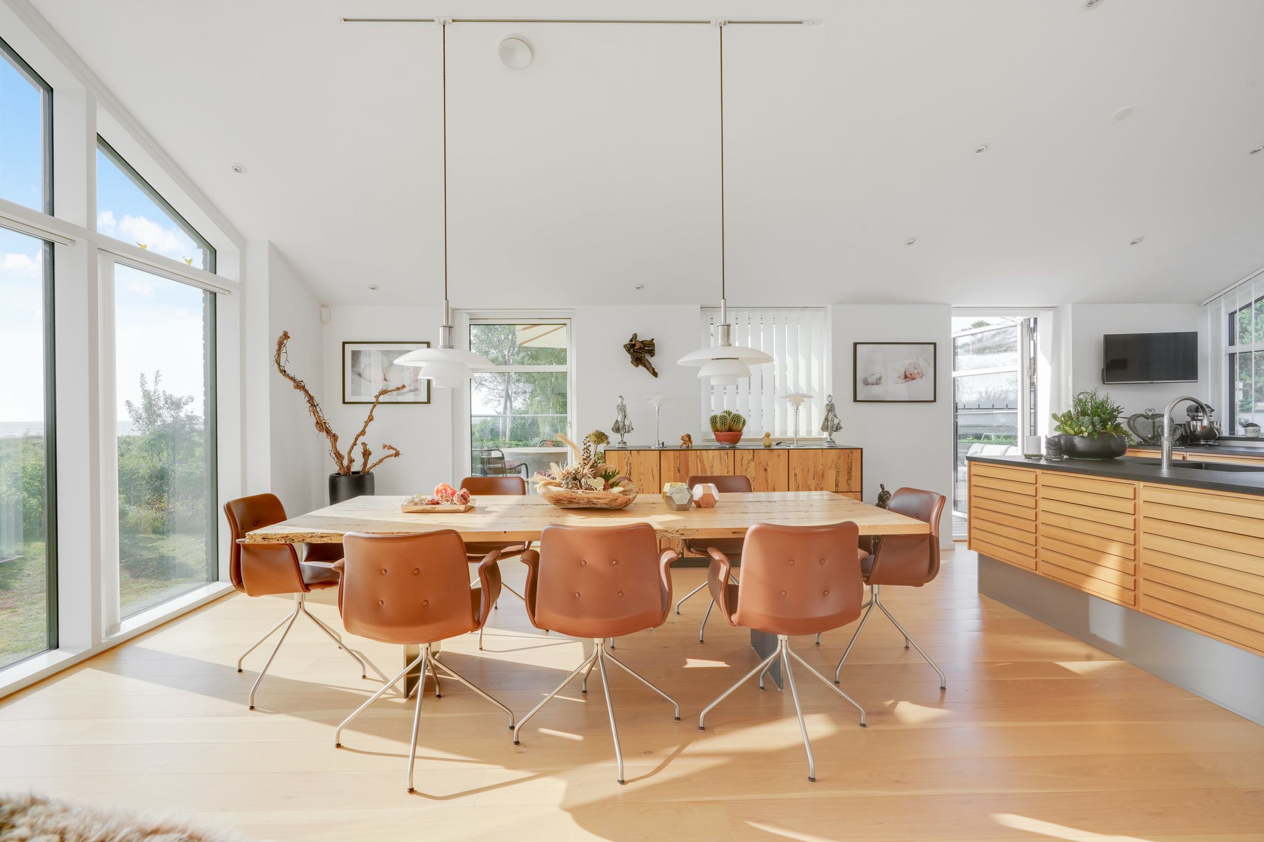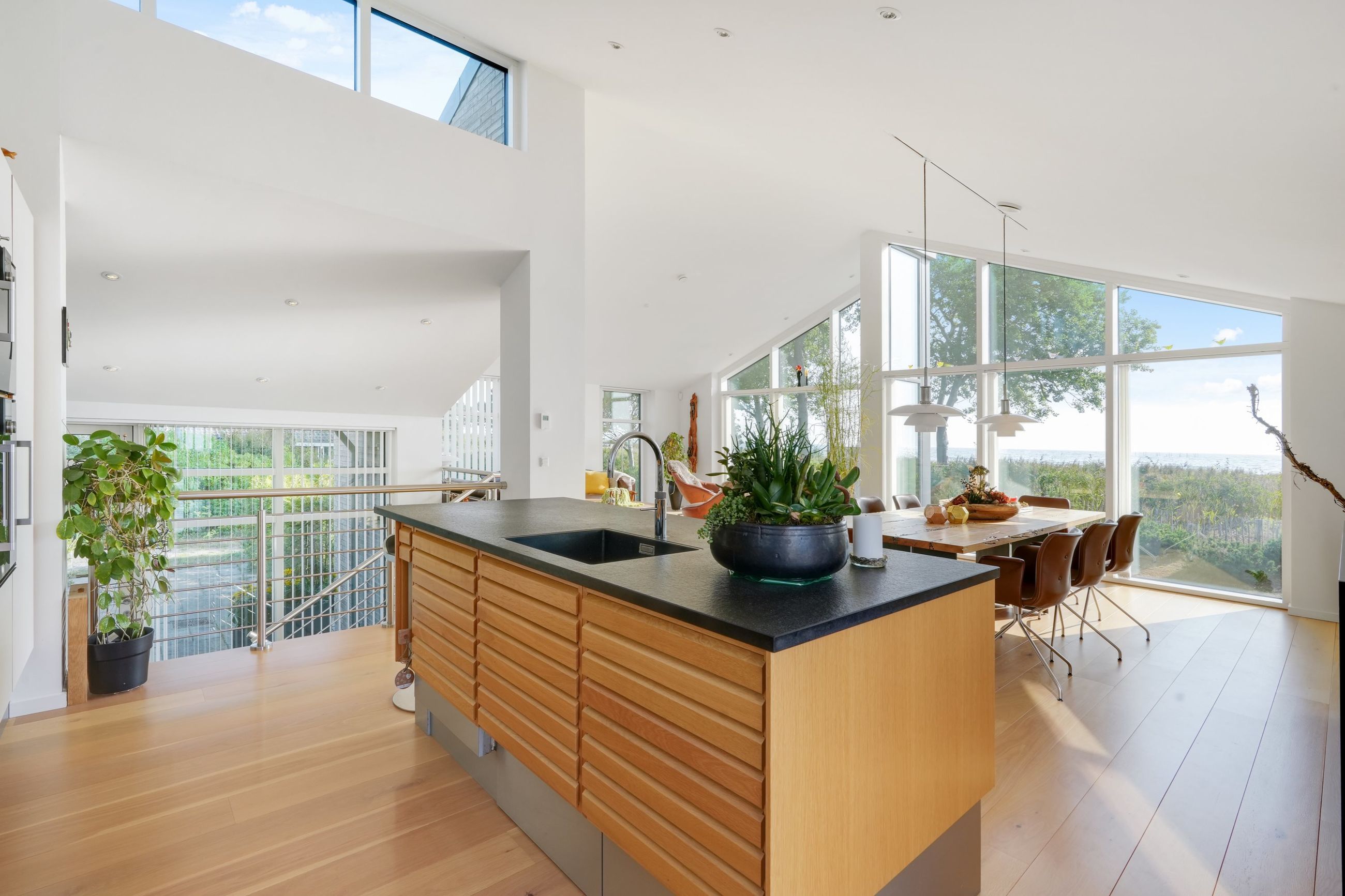 Huset er nærmest vedligeholdelsesfrit og bygget som et lavenergihjem med solceller og genvex-anlæg, der sørger for et sundt og behageligt indeklima året rundt. Gennem rummene breder massive egetræsplanker, marmor og fliser i natursten sig som et roligt bagtæppe for livet, og lyset bevæger sig let mellem planene. Den lyse entré åbner sig mod trappen og de forskudte niveauer – her mærker man straks den arkitektoniske tanke. Øverst udfolder husets hjerte sig i et stort leverum med lofter til kip, ovenlys og vinduer fra gulv til kip, hvor himmel og hav føles som en del af indretningen. Her er luft, højde og en enestående udsigt mod det blå. Sofaen finder naturligt sin plads i roen, mens langbordet samler familie og venner omkring sig – til hyggelige middage og lange snakke. Det elegante Unoform-køkken står som et samlingspunkt med smukke detaljer og luksushvidevarer fra Gaggenau. Ved den frie køkkenø er der plads til samtalerne, mens maden simrer og dagens tempo sænkes. Måske et glas vin i hånden, måske morgenkaffen, mens havet glimter i baggrunden. Forældreafdelingen er skabt til ro og nærvær – soveværelse med walk-in, eget badeværelse og direkte udgang til haven, hvor morgenbrisen står frisk gennem døren. Badeværelset er udført i Unoform-design med fritstående vask og stor bruseniche. Et ekstra værelse giver fleksibilitet – perfekt til gæster, børn eller hjemmearbejde. Syv trin fører til underetagen, som på papiret kaldes kælder, men som føles som en naturlig forlængelse af boligen. Her fortsætter de samme smukke gulve og det bløde lysindfald fra vinduerne. Et badeværelse i samme luksuriøse stil og tre disponible rum giver plads til teenageafdeling, hjemmekontor, alrum eller kreative projekter – mulighederne er mange.