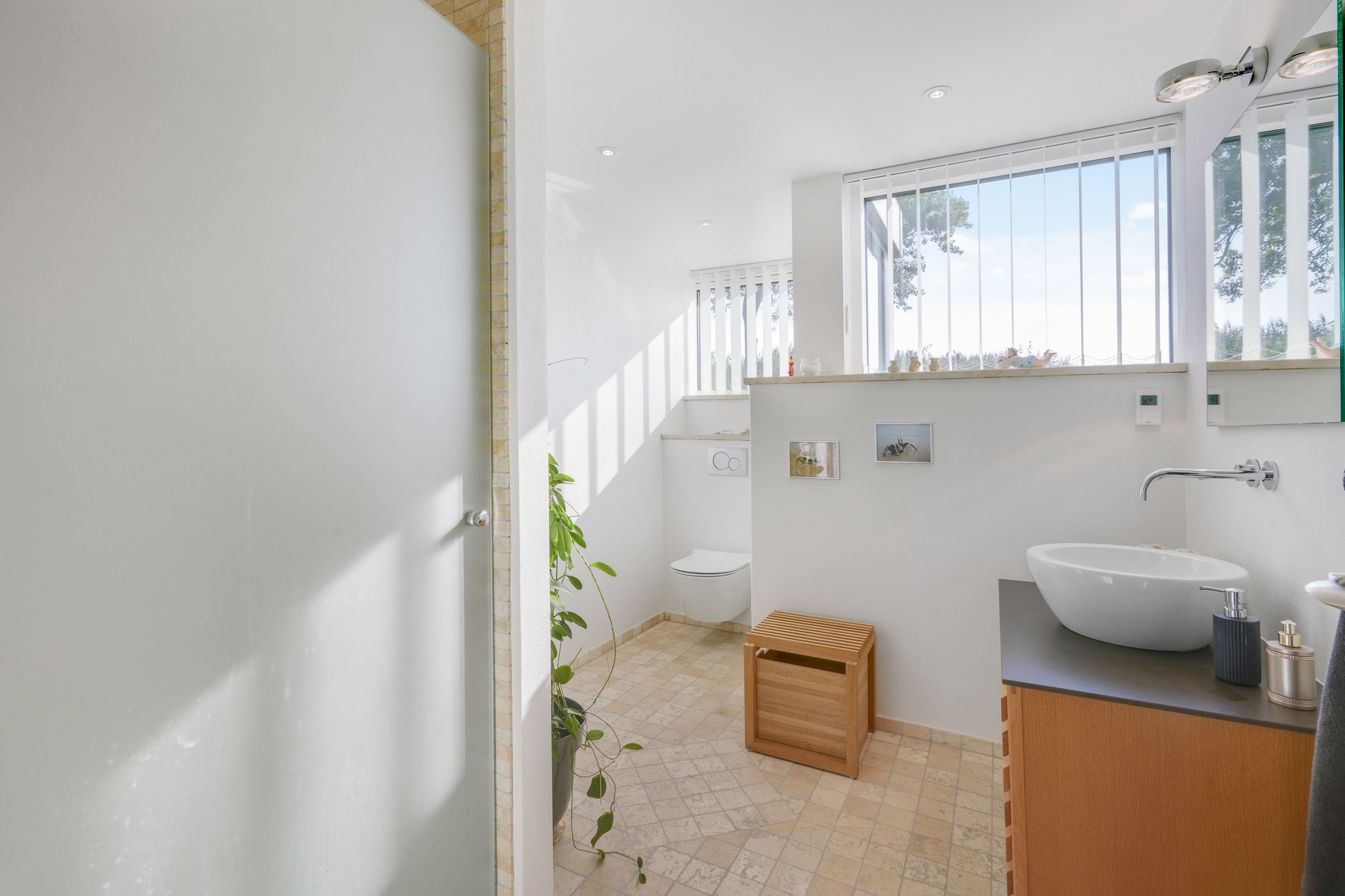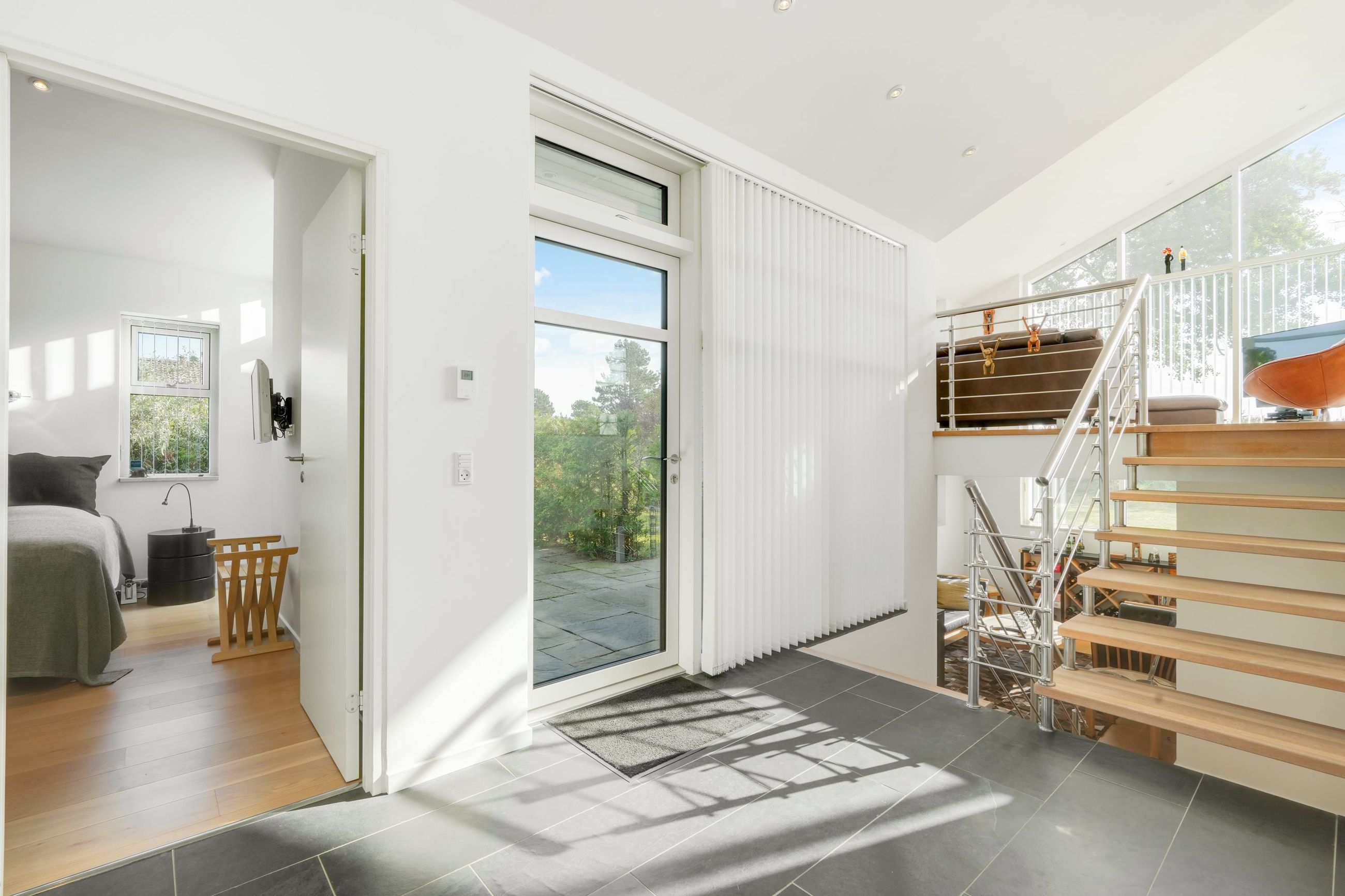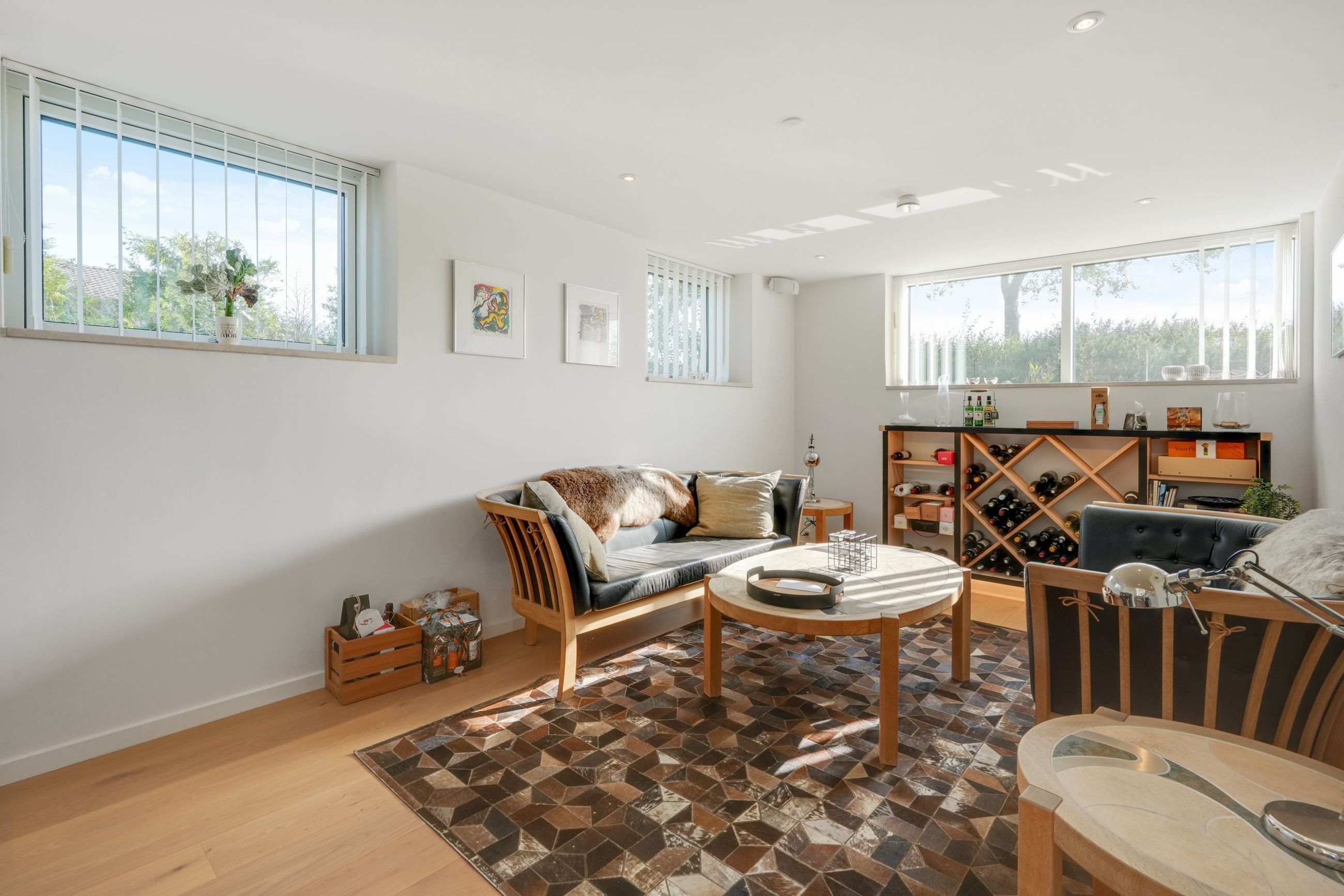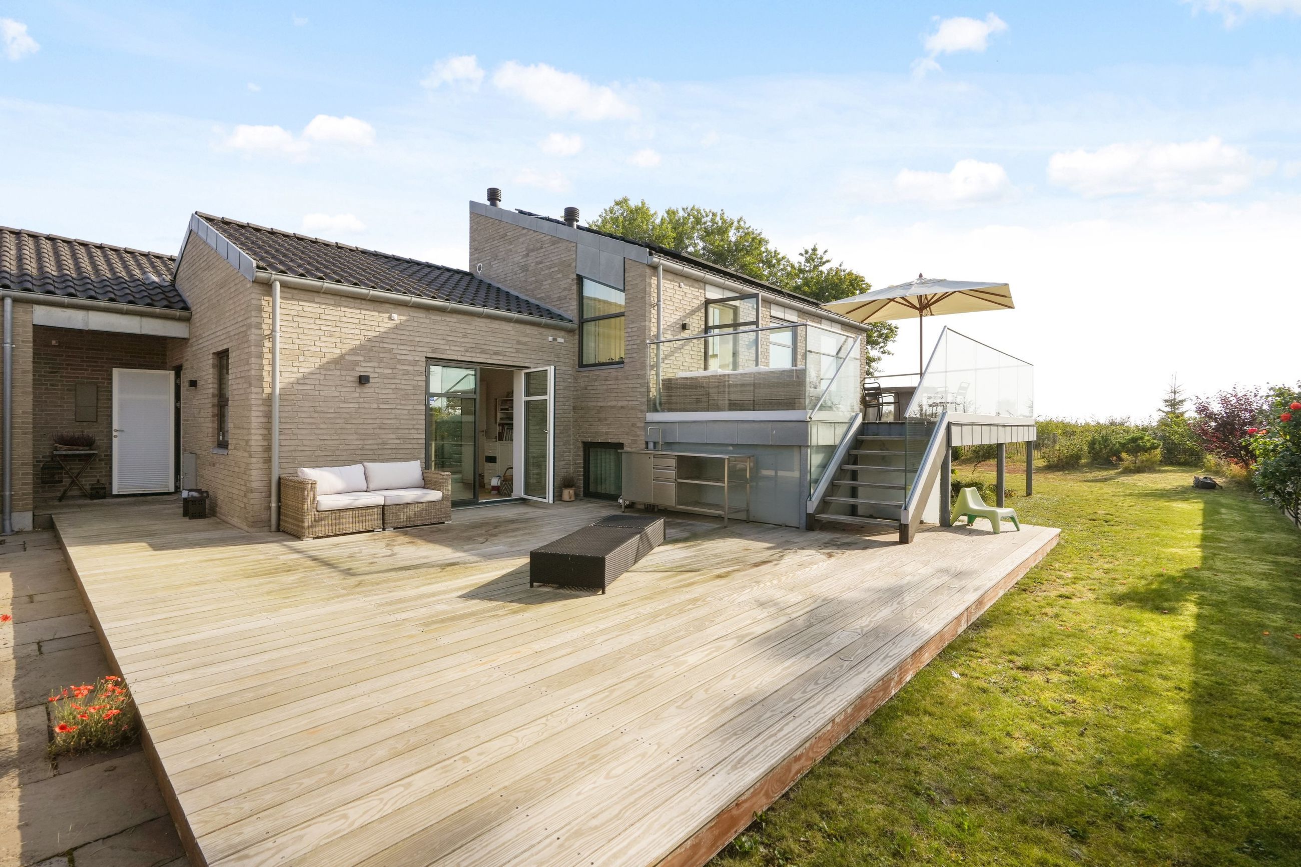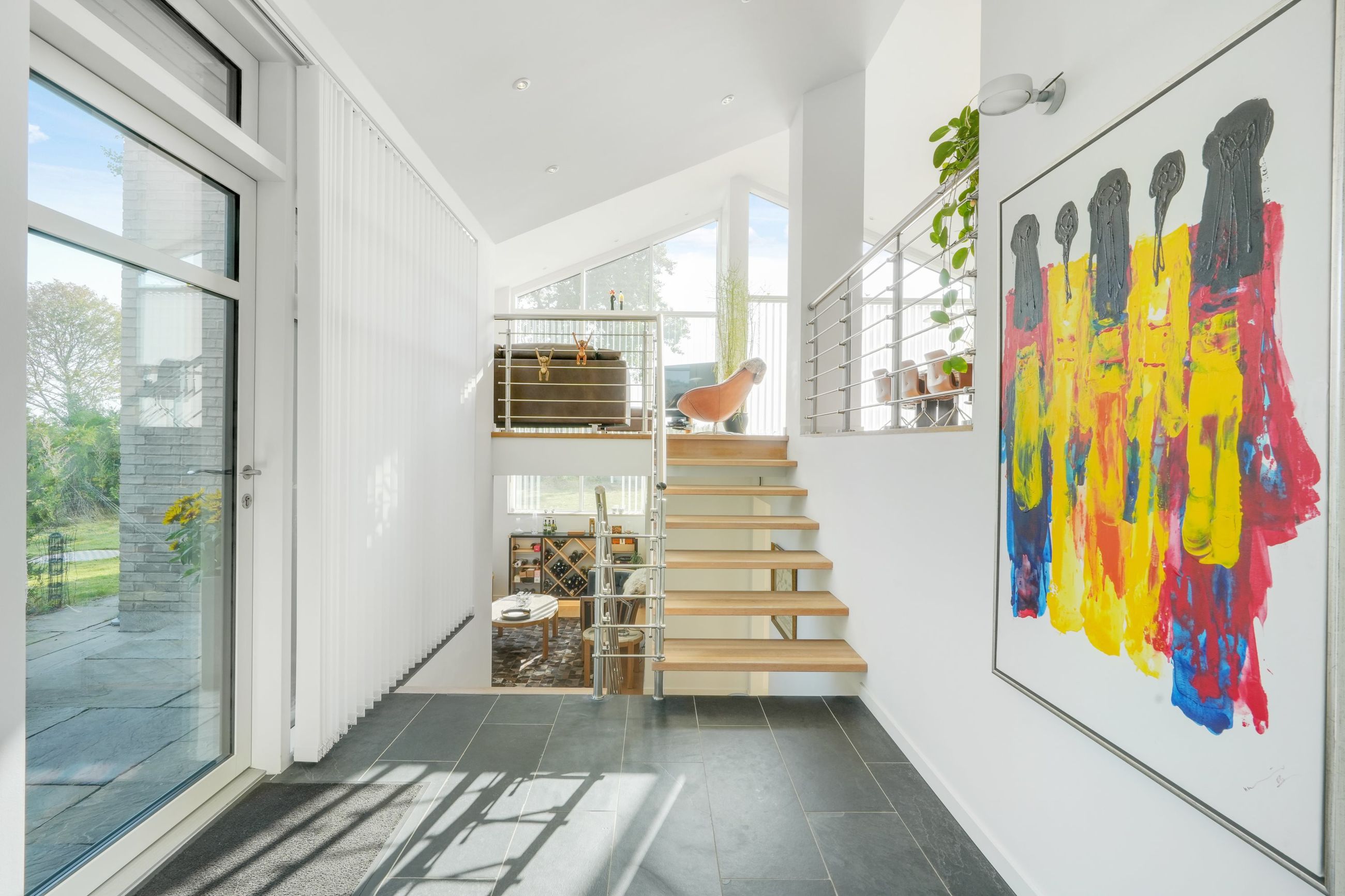 Huset er nærmest vedligeholdelsesfrit og bygget som et lavenergihjem med solceller og genvex-anlæg, der sørger for et sundt og behageligt indeklima året rundt. Gennem rummene breder massive egetræsplanker, marmor og fliser i natursten sig som et roligt bagtæppe for livet, og lyset bevæger sig let mellem planene. Den lyse entré åbner sig mod trappen og de forskudte niveauer – her mærker man straks den arkitektoniske tanke. Øverst udfolder husets hjerte sig i et stort leverum med lofter til kip, ovenlys og vinduer fra gulv til kip, hvor himmel og hav føles som en del af indretningen. Her er luft, højde og en enestående udsigt mod det blå. Sofaen finder naturligt sin plads i roen, mens langbordet samler familie og venner omkring sig – til hyggelige middage og lange snakke. Det elegante Unoform-køkken står som et samlingspunkt med smukke detaljer og luksushvidevarer fra Gaggenau. Ved den frie køkkenø er der plads til samtalerne, mens maden simrer og dagens tempo sænkes. Måske et glas vin i hånden, måske morgenkaffen, mens havet glimter i baggrunden. Forældreafdelingen er skabt til ro og nærvær – soveværelse med walk-in, eget badeværelse og direkte udgang til haven, hvor morgenbrisen står frisk gennem døren. Badeværelset er udført i Unoform-design med fritstående vask og stor bruseniche. Et ekstra værelse giver fleksibilitet – perfekt til gæster, børn eller hjemmearbejde. Syv trin fører til underetagen, som på papiret kaldes kælder, men som føles som en naturlig forlængelse af boligen. Her fortsætter de samme smukke gulve og det bløde lysindfald fra vinduerne. Et badeværelse i samme luksuriøse stil og tre disponible rum giver plads til teenageafdeling, hjemmekontor, alrum eller kreative projekter – mulighederne er mange.