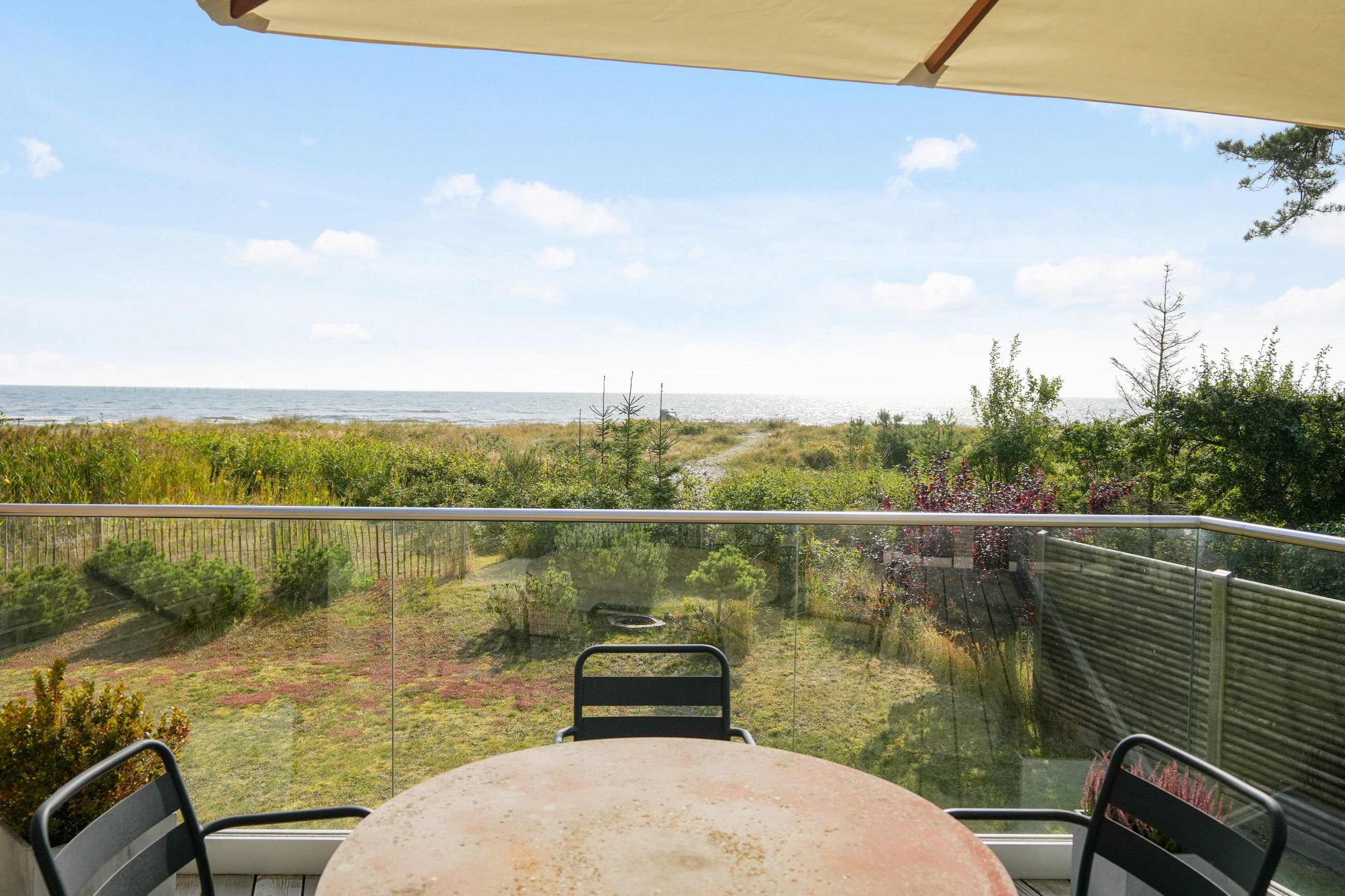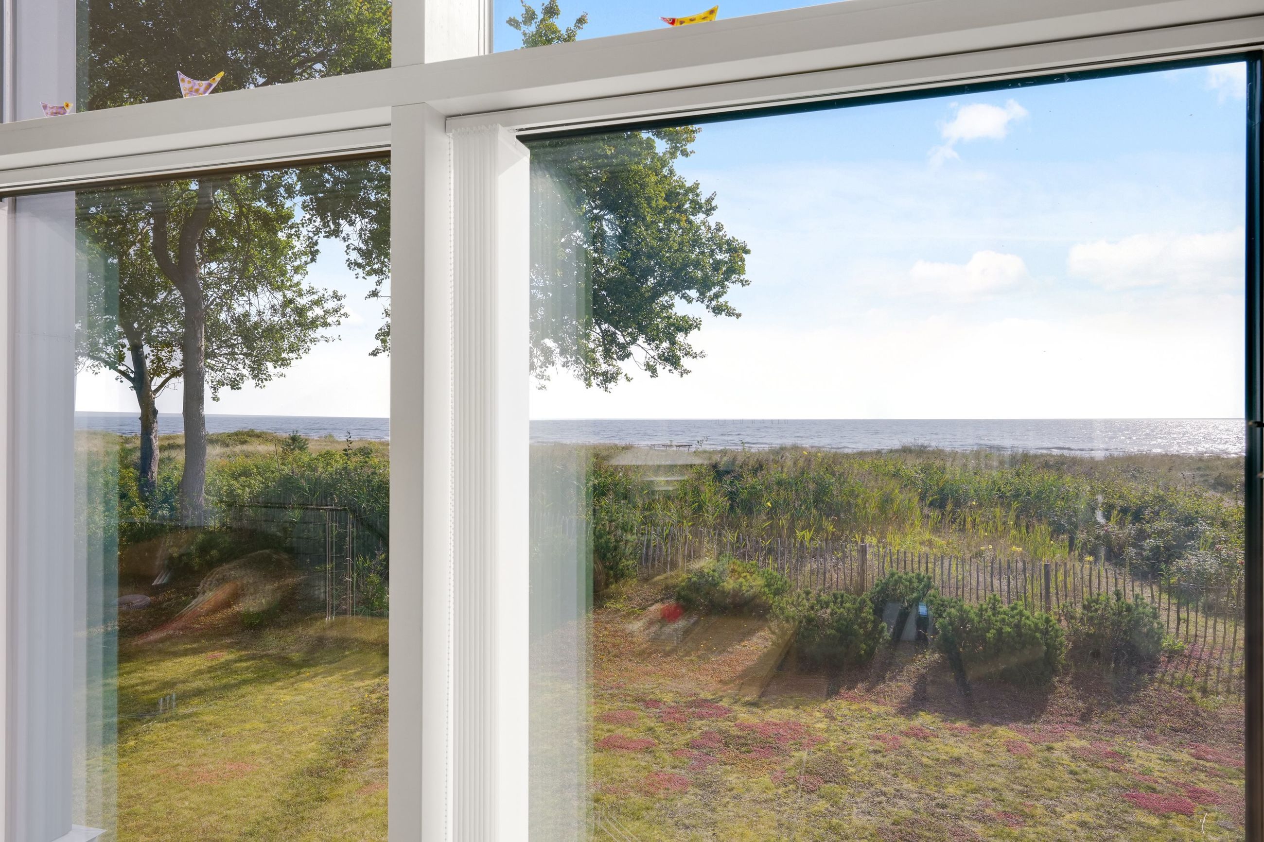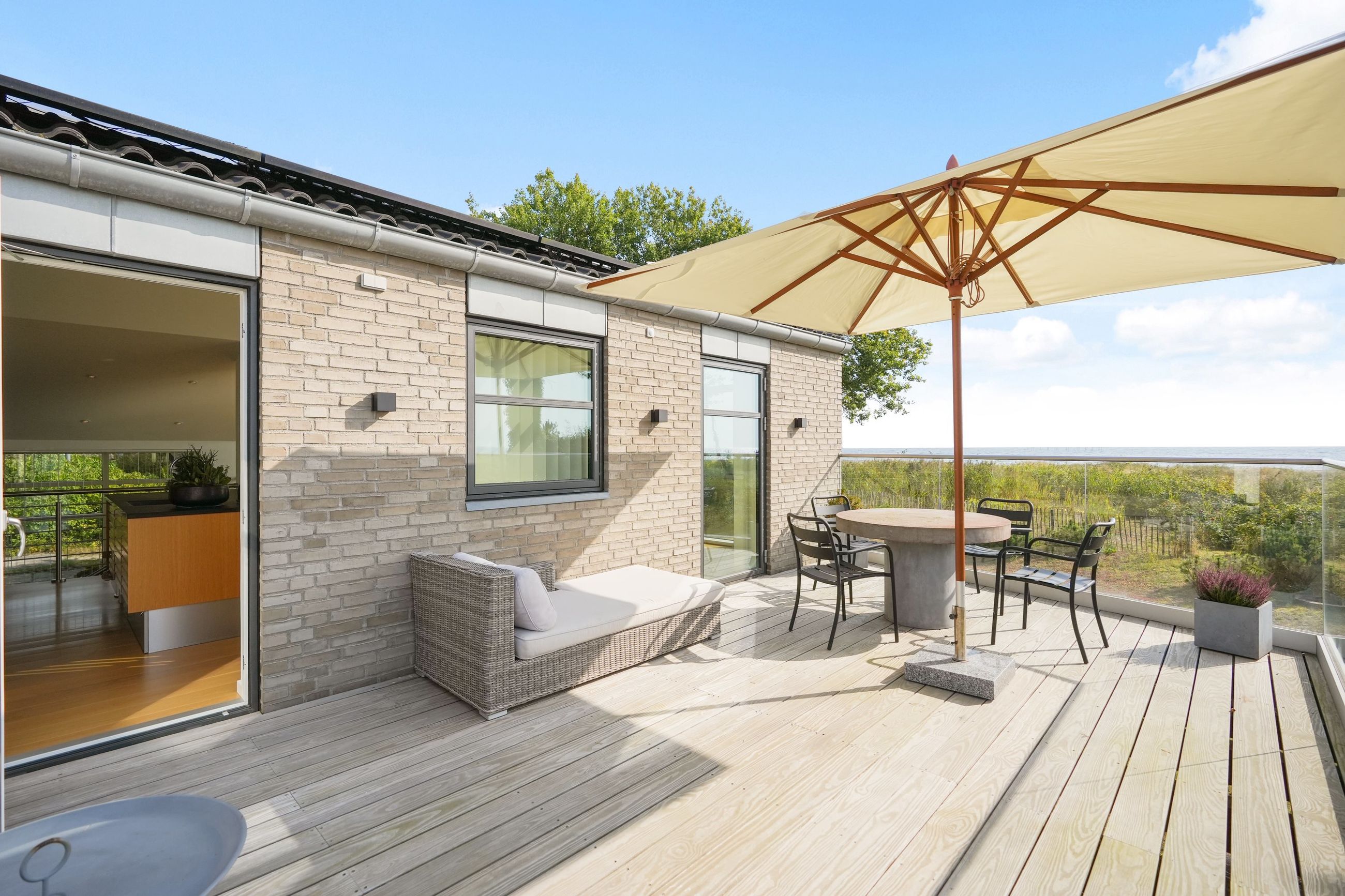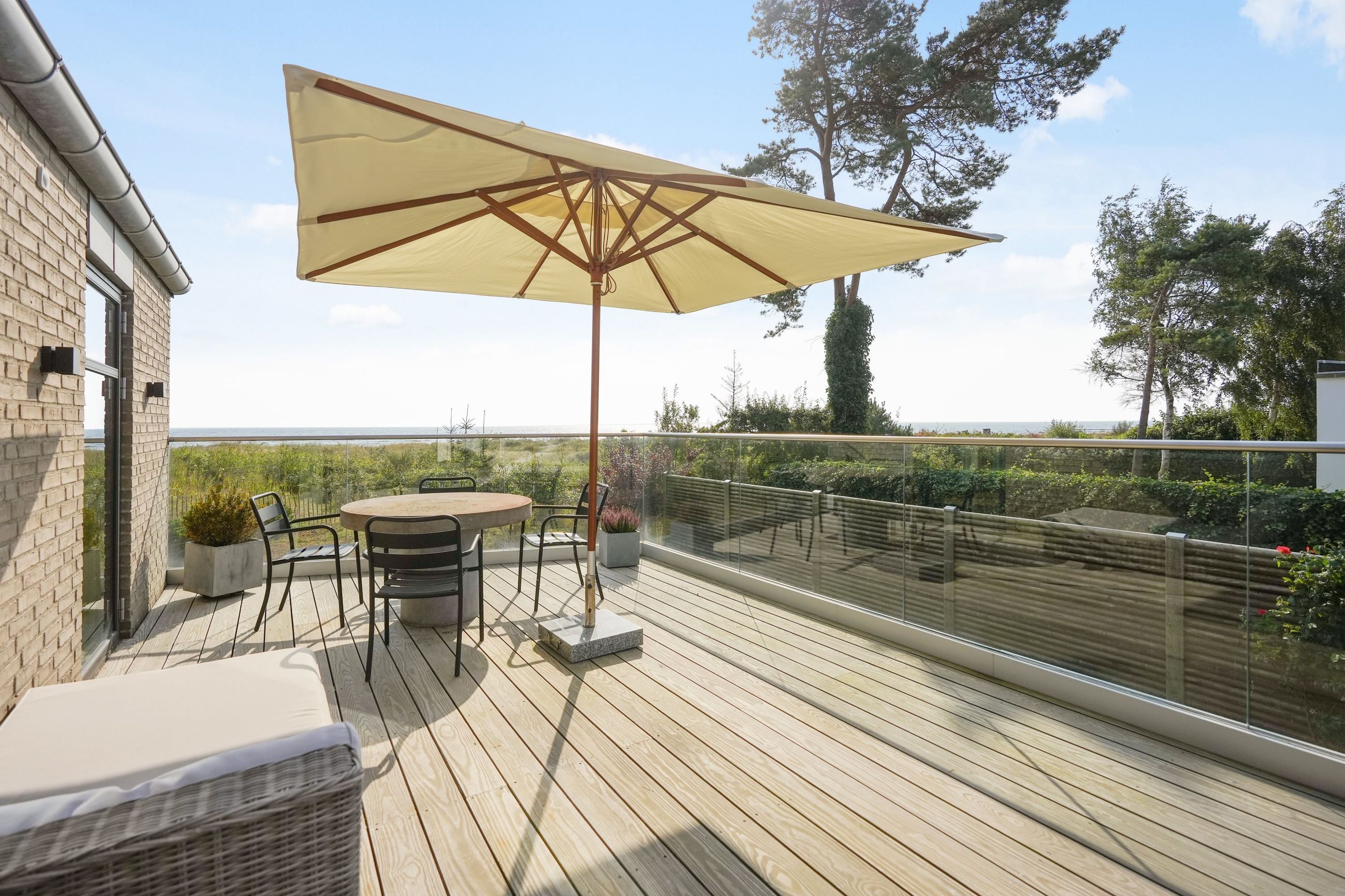 Fra terrassen møder blikket horisonten – udsigten strækker sig fra Københavns tårne i nord til bøgeskoven i syd, og midt imellem ligger havet, åbent og uforstyrret. Her, på den bedste badestrand langs bugten, er sandet fint og vandet klart, og du kan tage morgendukkerten direkte fra stranden eller glide ud på paddleboardet, mens solen står op over vandet. Naturgrunden flyder ud i det fredede strandareal, hvor marehalm, strandgræs og sand tager over. Den store sydvendte terrasse i Keybony – et bæredygtigt, varmebehandlet træ med gylden glød – strækker sig mod det åbne blå. Et uderum skabt til både sol og læ og hvor duften af saltvandet hænger i luften. Plads til liggestole, lounge og de lange middage under himlen. Duften af saltvand blander sig med lyden af bølger, mens aftensolen maler himlen gylden. Her findes også udekøkken og udendørsbruser med varmt og koldt vand – luksus på den mest naturlige måde. Flotte naturfliser i forhaven og den murede garage med værksted giver god plads til bilen og en ordentlig plads til alt det praktiske – og en ankomst, der føles rolig, ordnet og harmonisk.