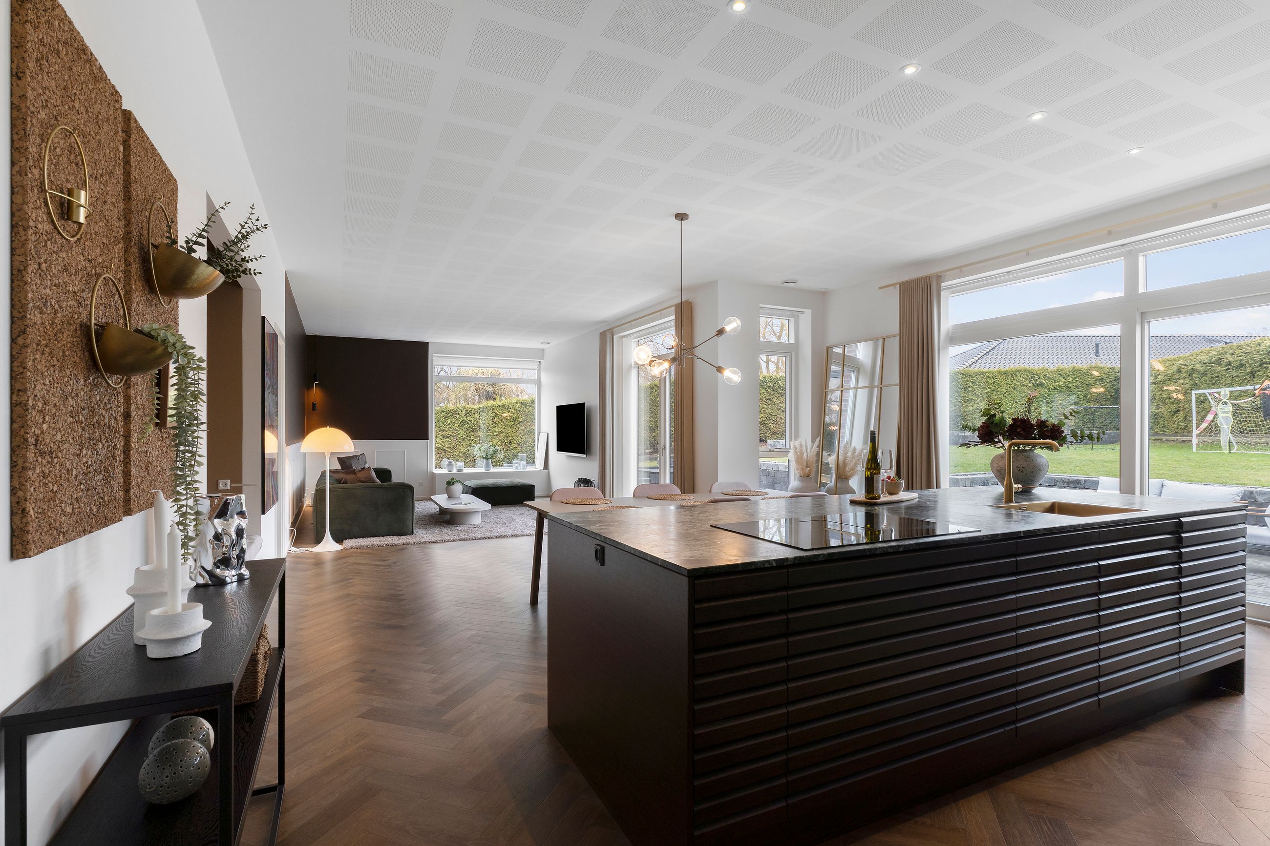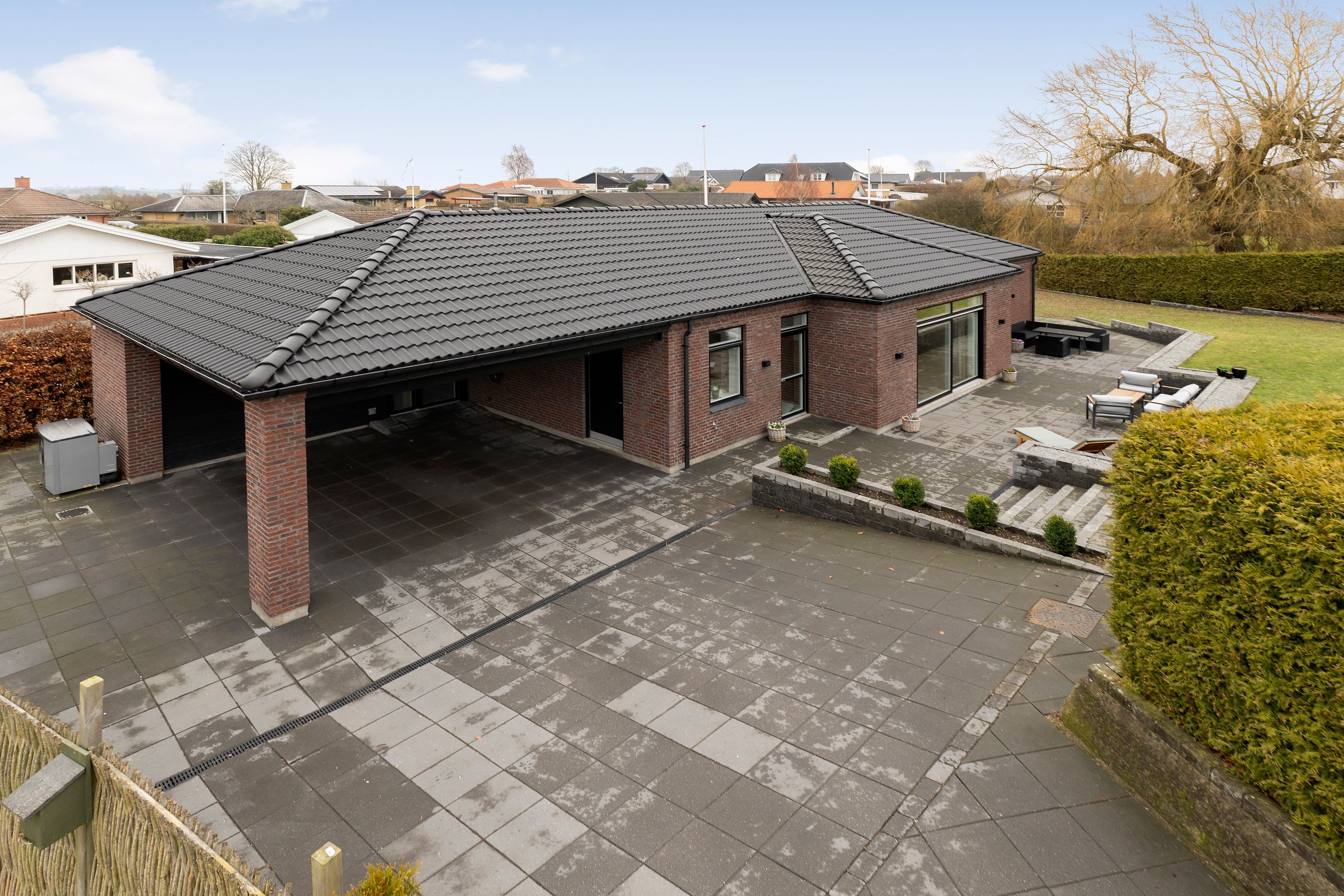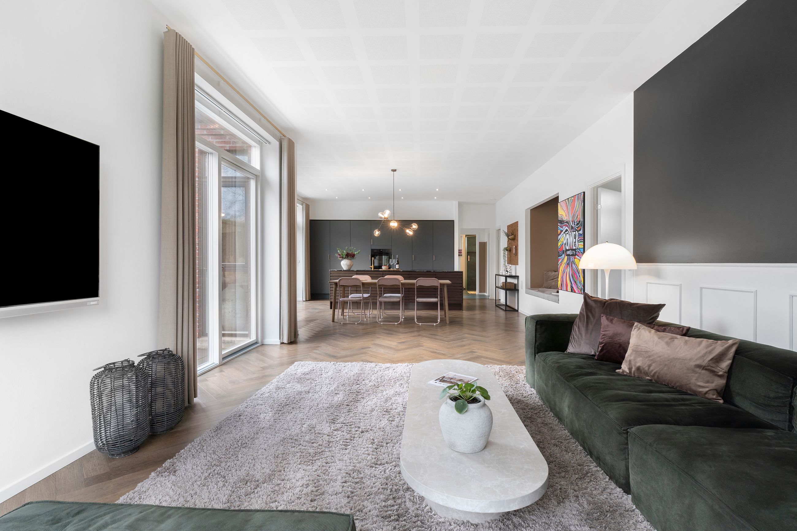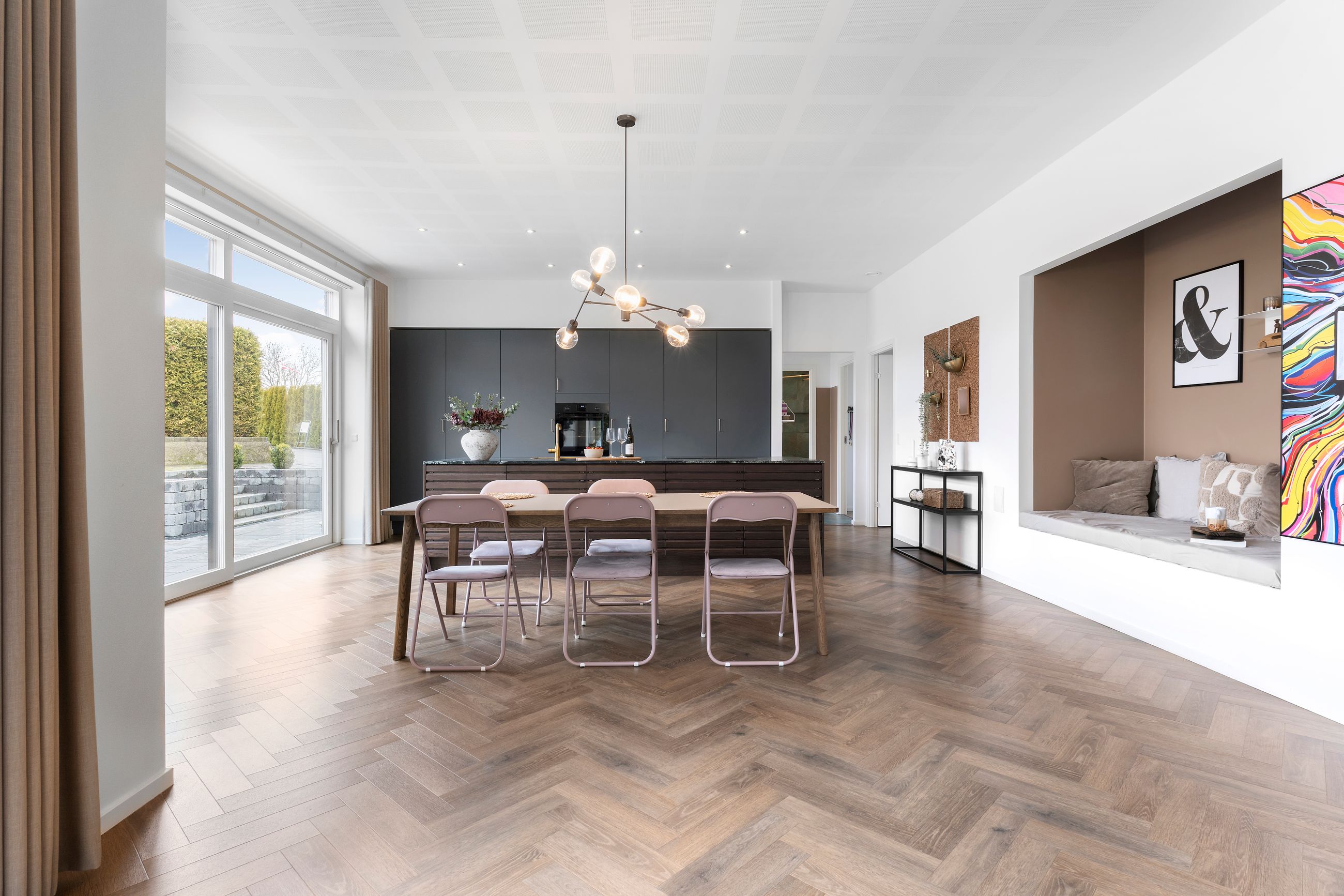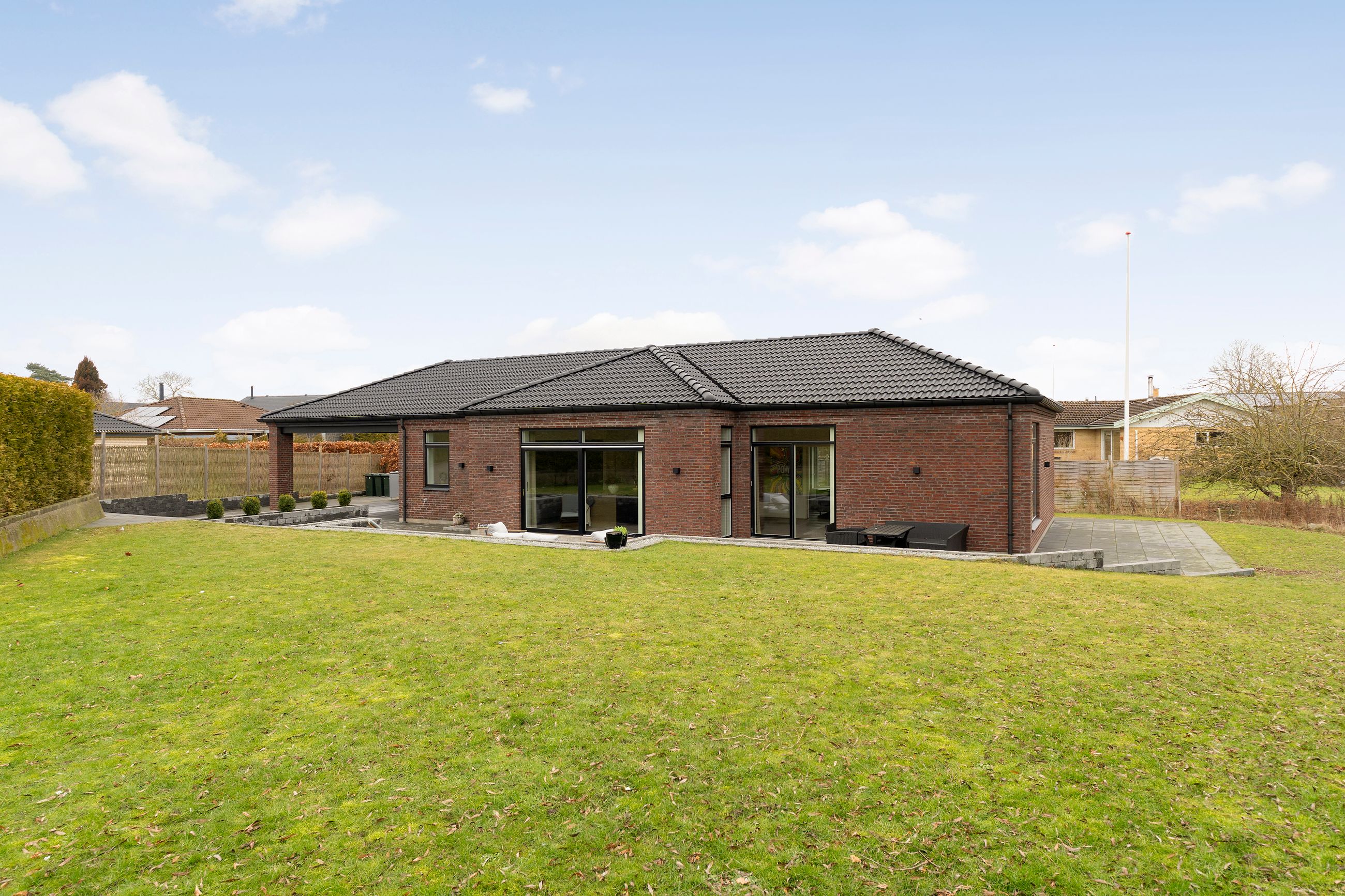 Det er så nyt som fra 2023. Wow, siger vi bare, sikken bolig. Alt er lækkert tænkt og bygget tæt på alt i byen. Stor er den ikke, byen, centrum og havnen er derfor lige om hjørnet. Her er højt til loftet, smukke parketgulve, lækkert køkken og ditto badeværelser med en planløsning, hvor forældrene har deres afdeling, børnene deres. Så er alle glade. Her er masser af lys og masser af sol på den 2.690 m2 store grund. Ikke alt er have, for søen fylder en del. Vi er ikke langt fra de rekreative områder i Ådalen, og der er stisystemer til institutioner og skole.