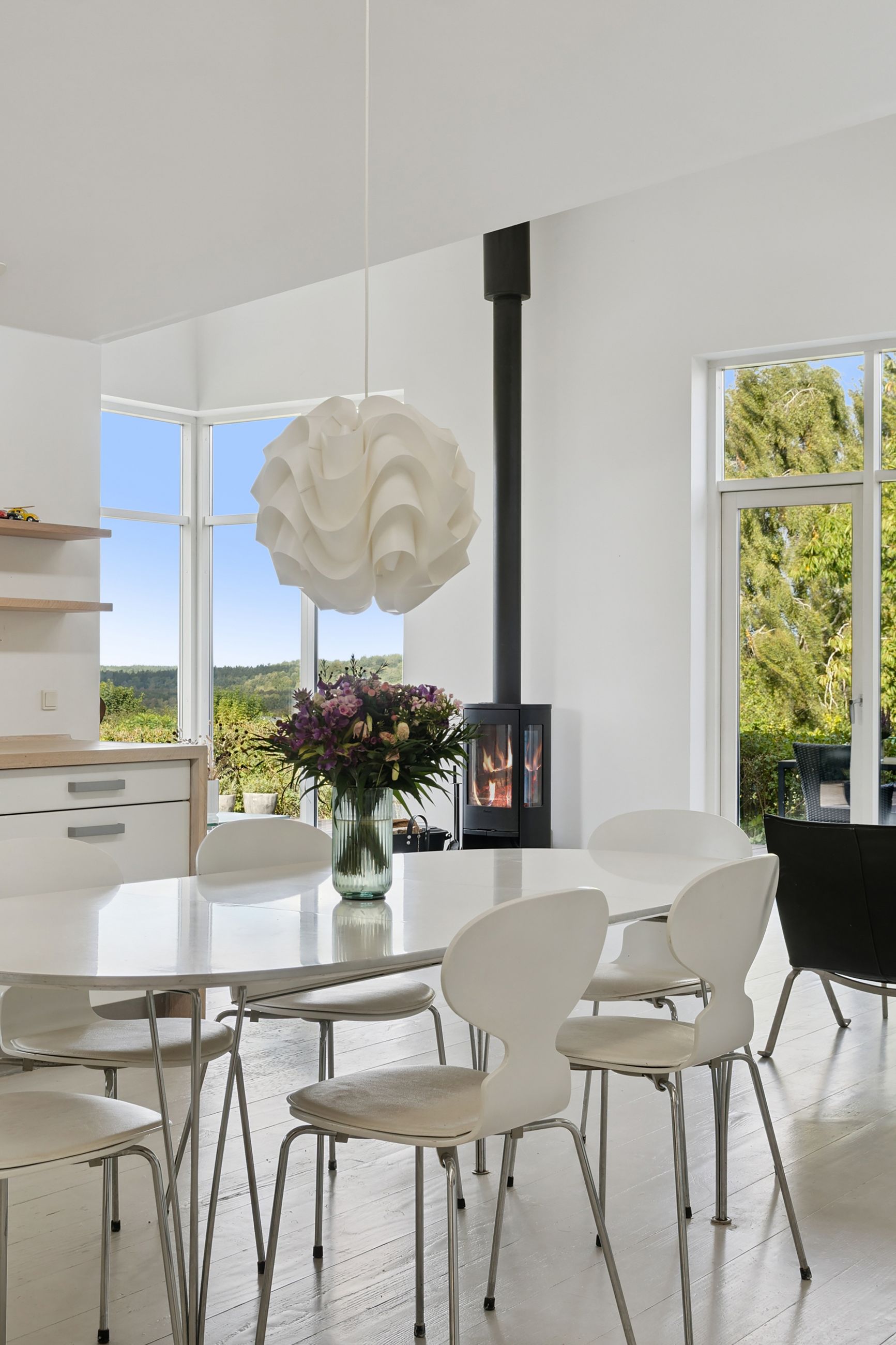 Alt i udsigten er grøn og dyb, for naturens 4 årstider fylder på disse kanter. Velplacerede vinduer og store gavlvinduer hjælper naturligvis. Huset er bygget i 1973, men har siden fået sin renaissance med en total renovering og loft til kip, altså højt til loftet. Med 188 etagemeter, hvor de 51 m2 ligger i underetagen, er det et ideelt hus til familien med børn. Der er også højt til loftet i underetagen, her er der plads til selvstændig teenageafdeling, kontor, fitness eller hobby. Grunden er på 1.143 m2 og huset ligger som det sidste på den lukkede vej med grønt fællesareal på den anden side af hækken. Nemlig, ikke meget trafik her.