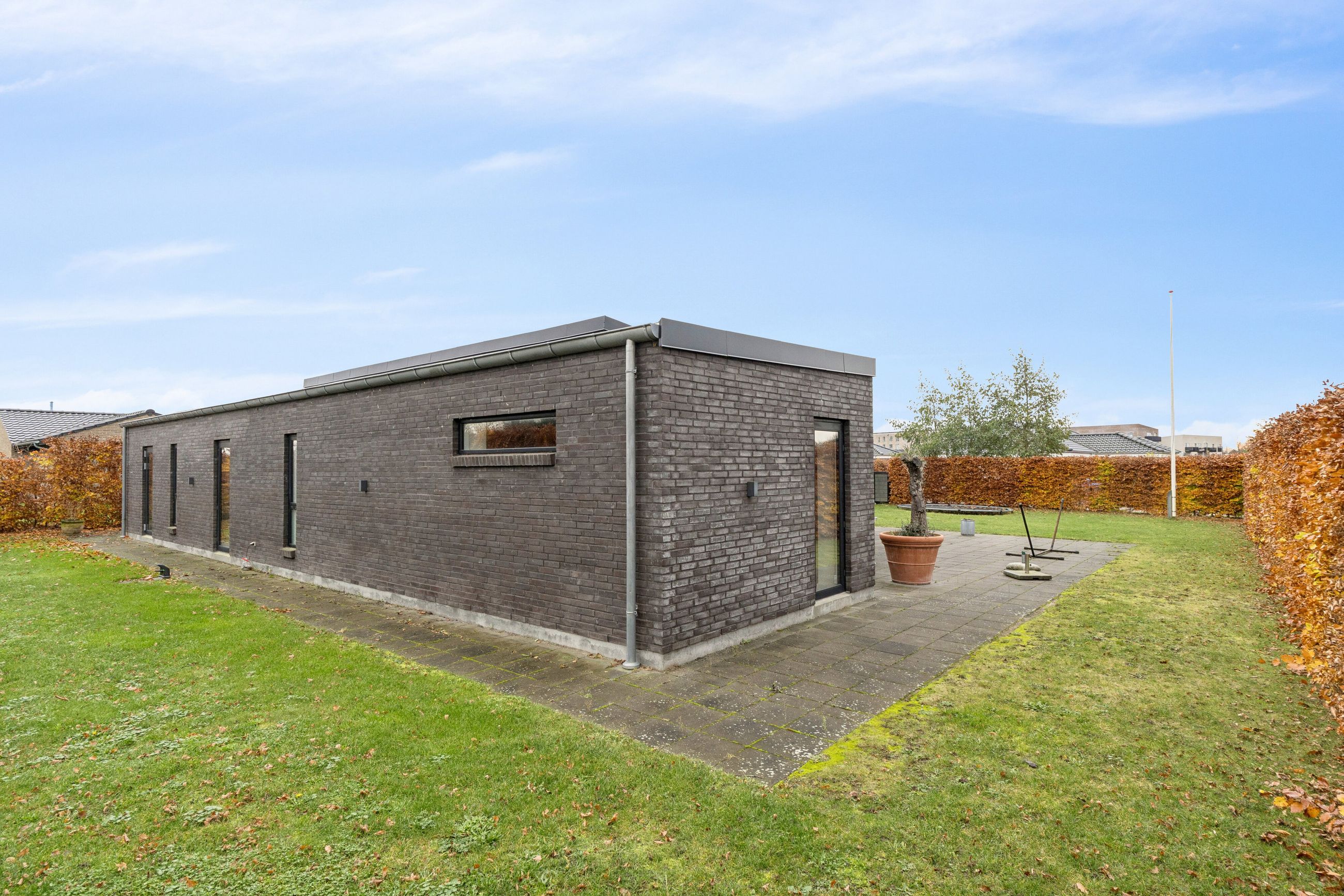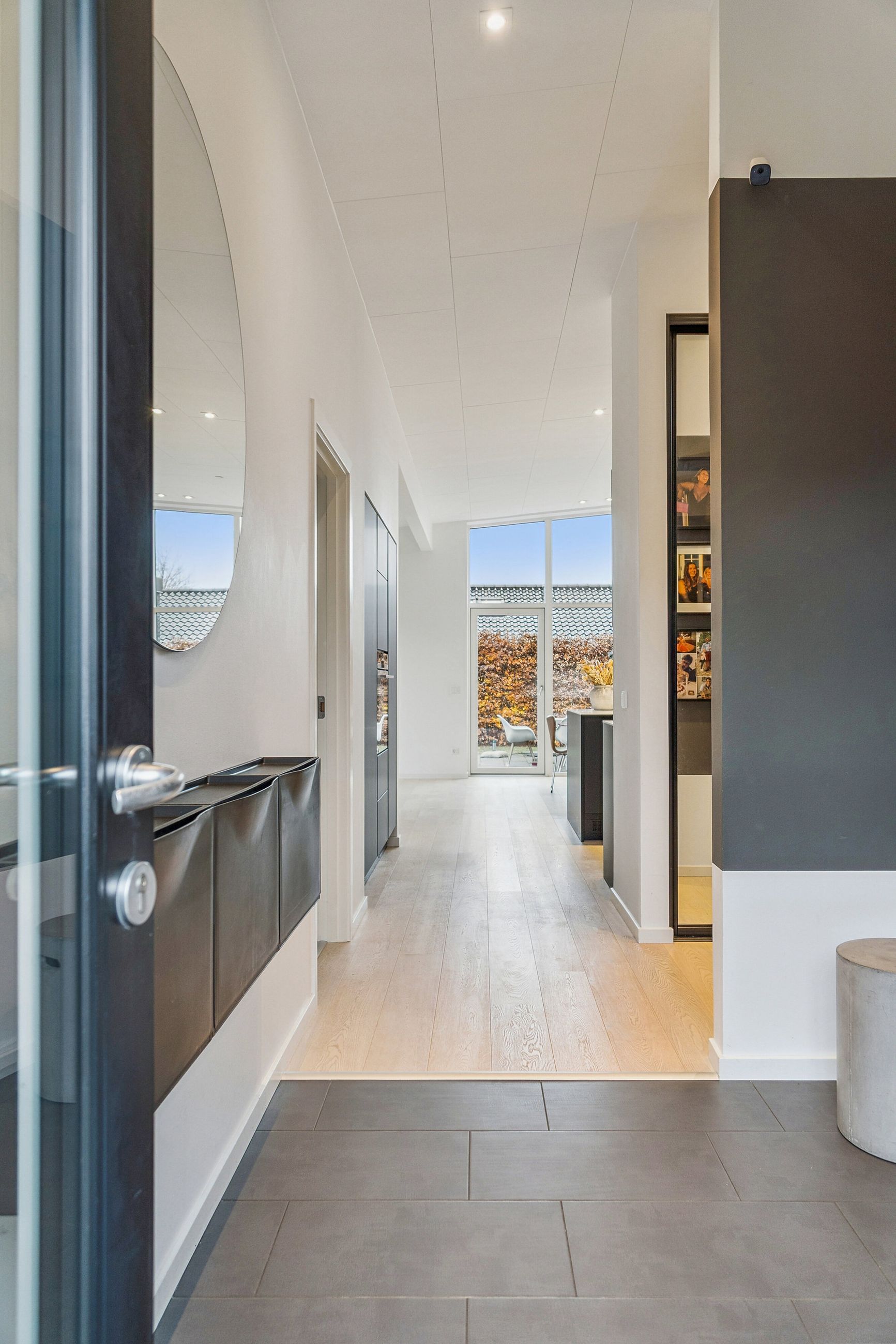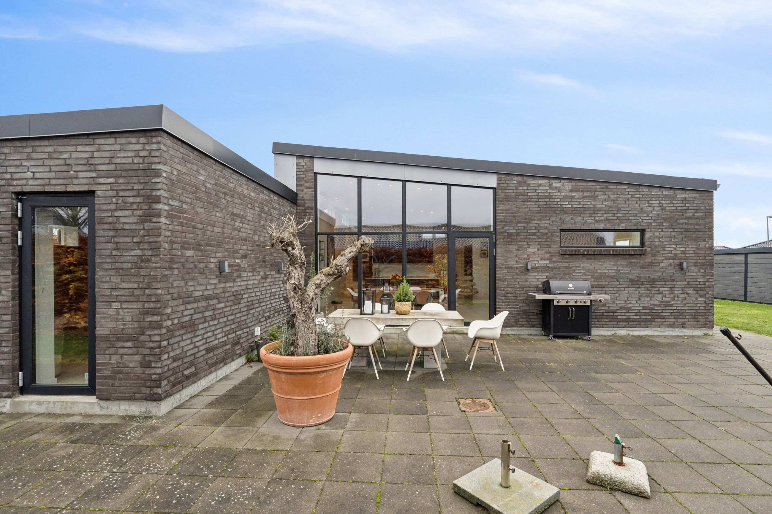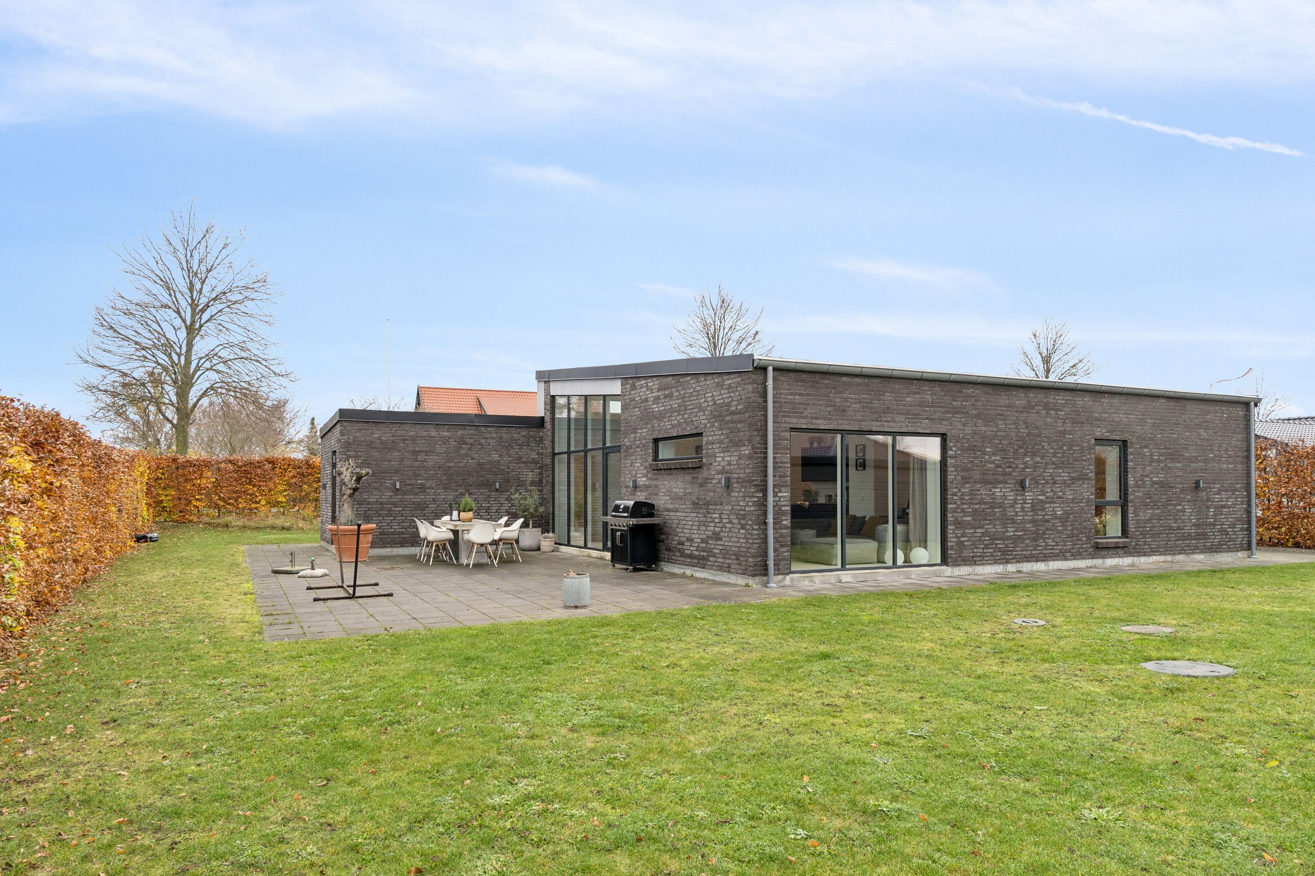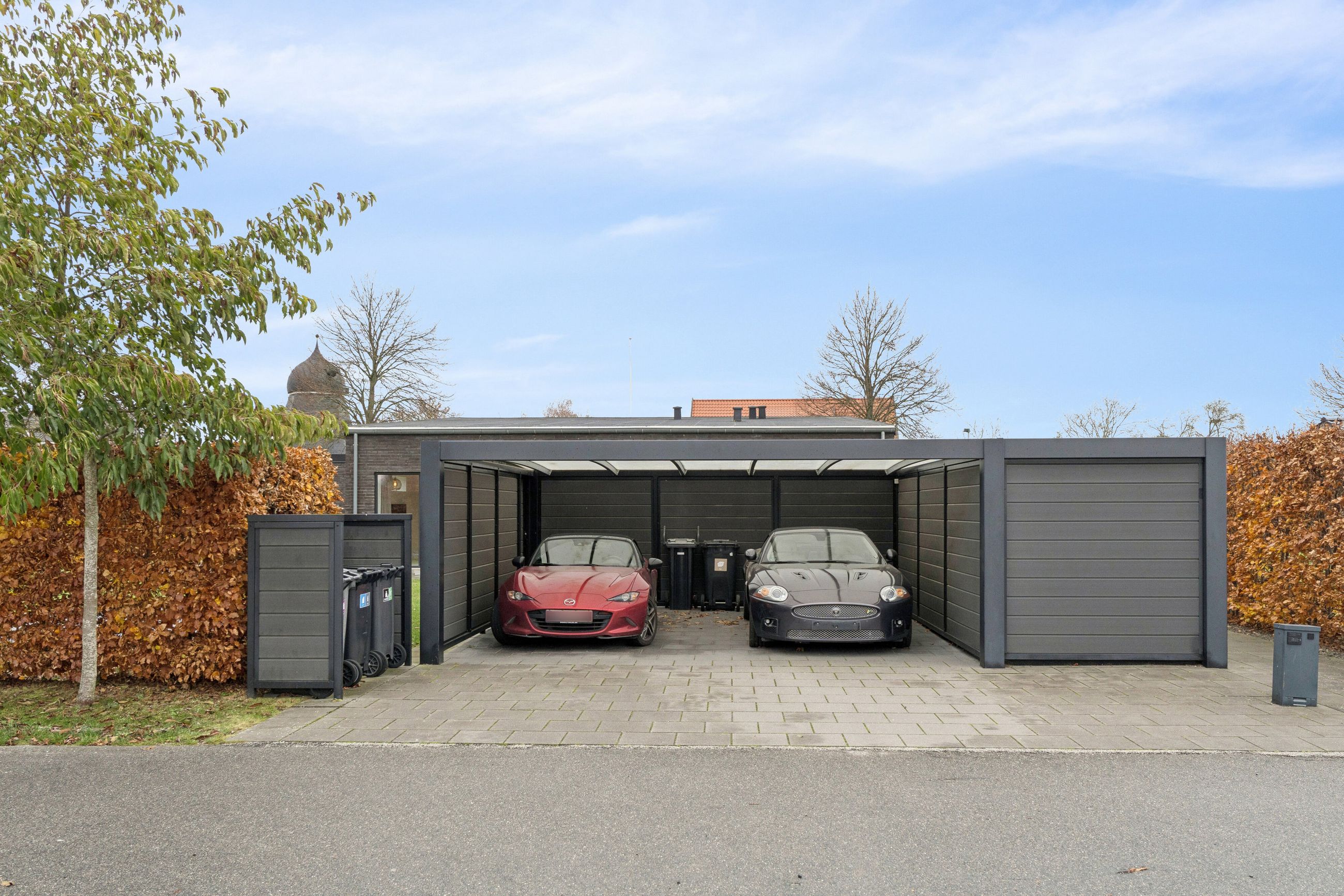 Huset er bygget for 8 år siden og står klar med moderne, nem luksus. Den slags med motoriserede skuffer, smarte systemer til at programmere lyset, og kvalitet i materialerne. Alt er i orden og designet til det bekvemme, afslappede liv. Med kæmpe carport og en professionelt anlagt have, der med vilje er minimalistisk, så der ikke er havearbejde. Gennemtænkt til de, der hellere hygger med drinks på terrassen, end luger ukrudt. Afdelingerne til børn og voksne skaber privatliv, og køkkenalrummet evner at samle hele familien, inklusive teenageren der ellers hellere ser på TikTok.
