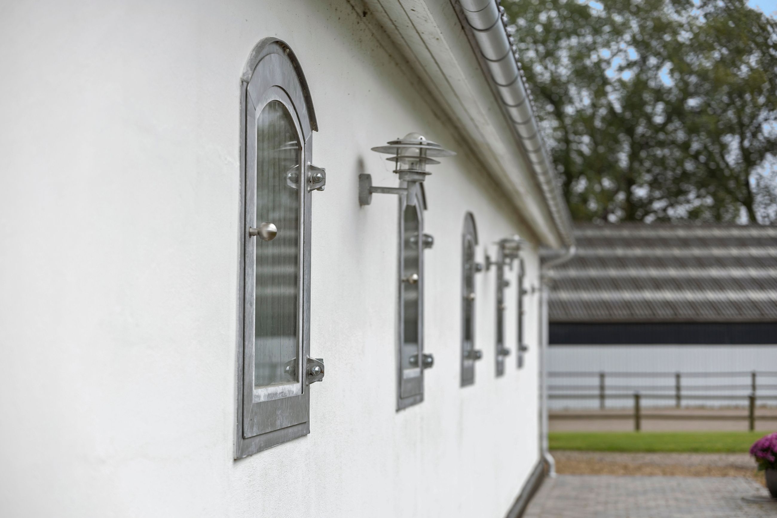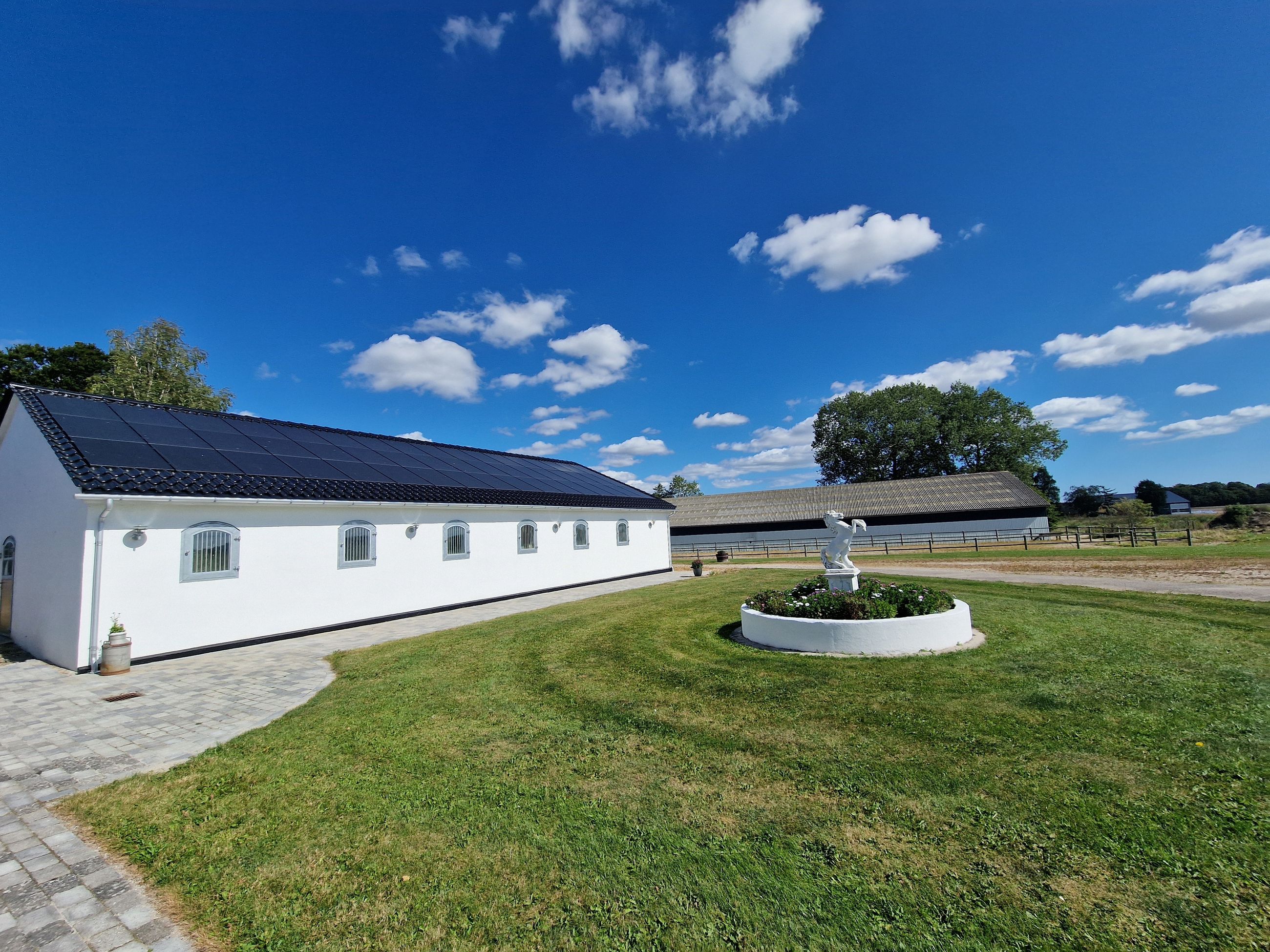 Der er stald med plads til 12 bokse – fuldt nyistandsat og designet med sikkerhed og klima øverst på listen. Her er både tremmer og sikkerhedsglas, og vinduer der kan åbnes og kippes, så hestene ikke får træk. Det oplyste ridehus på 1000 m2 har bund af ridebanesand og flis, plads til publikum og indbygget vanding i barrieren.