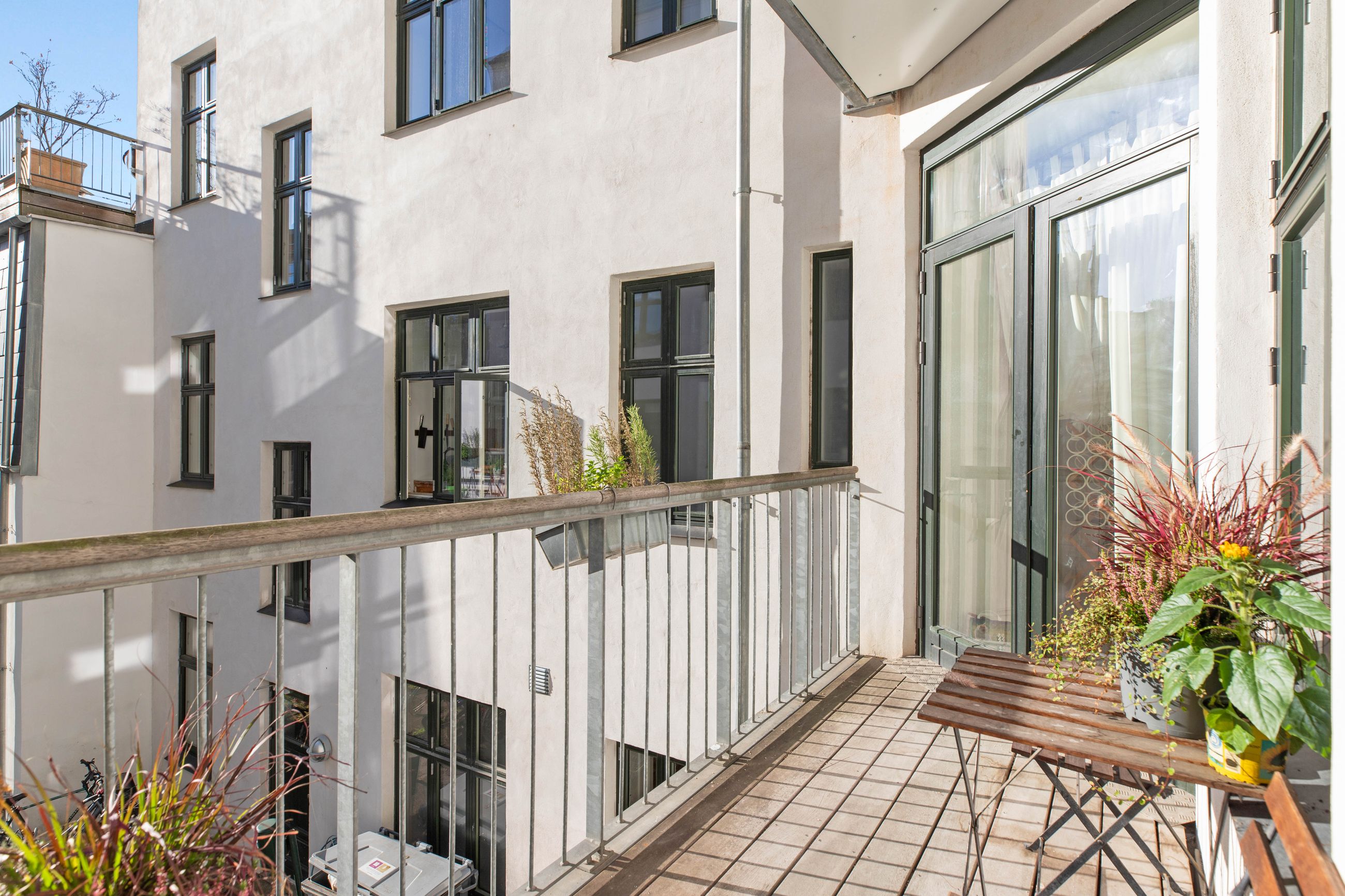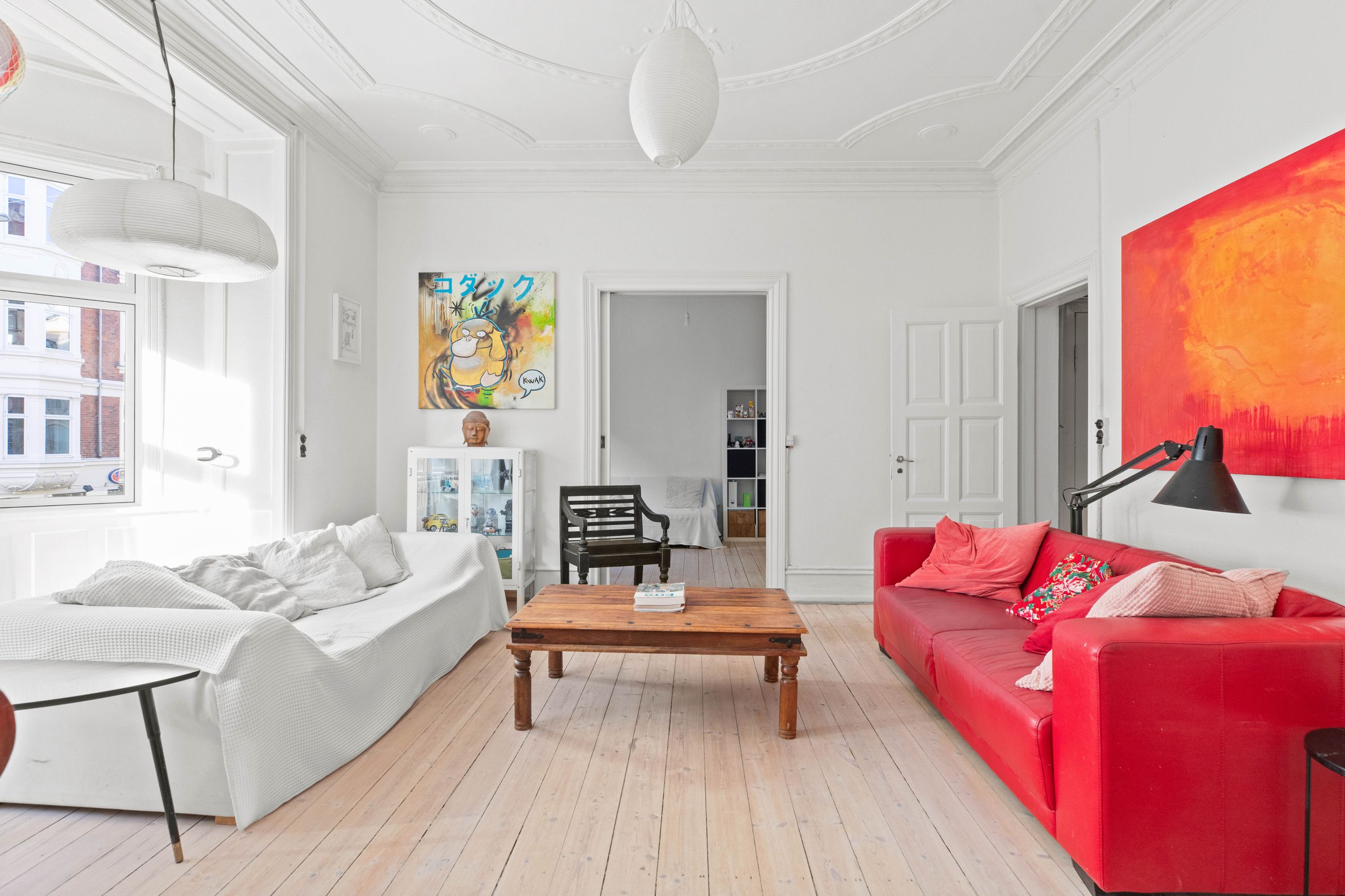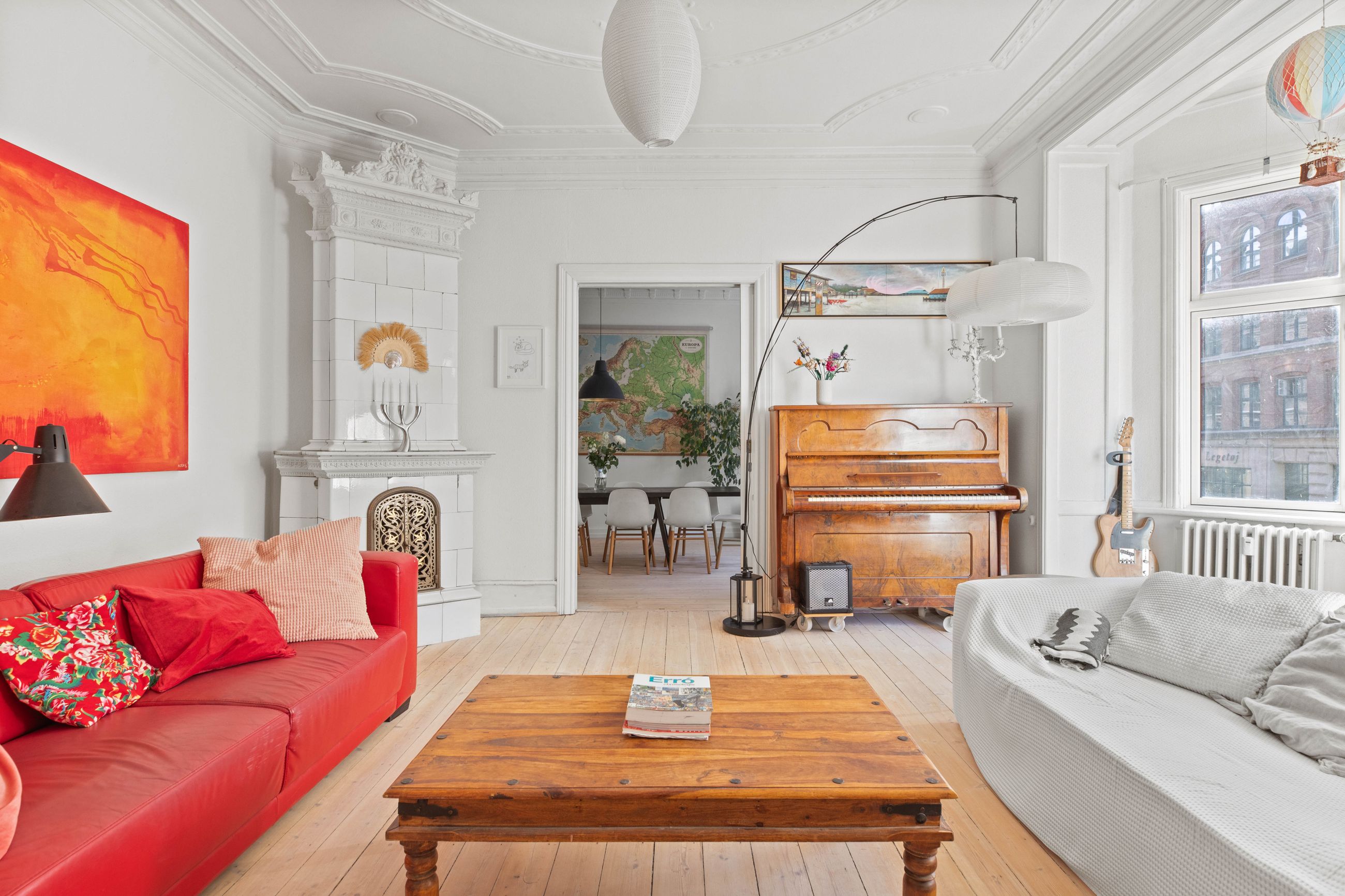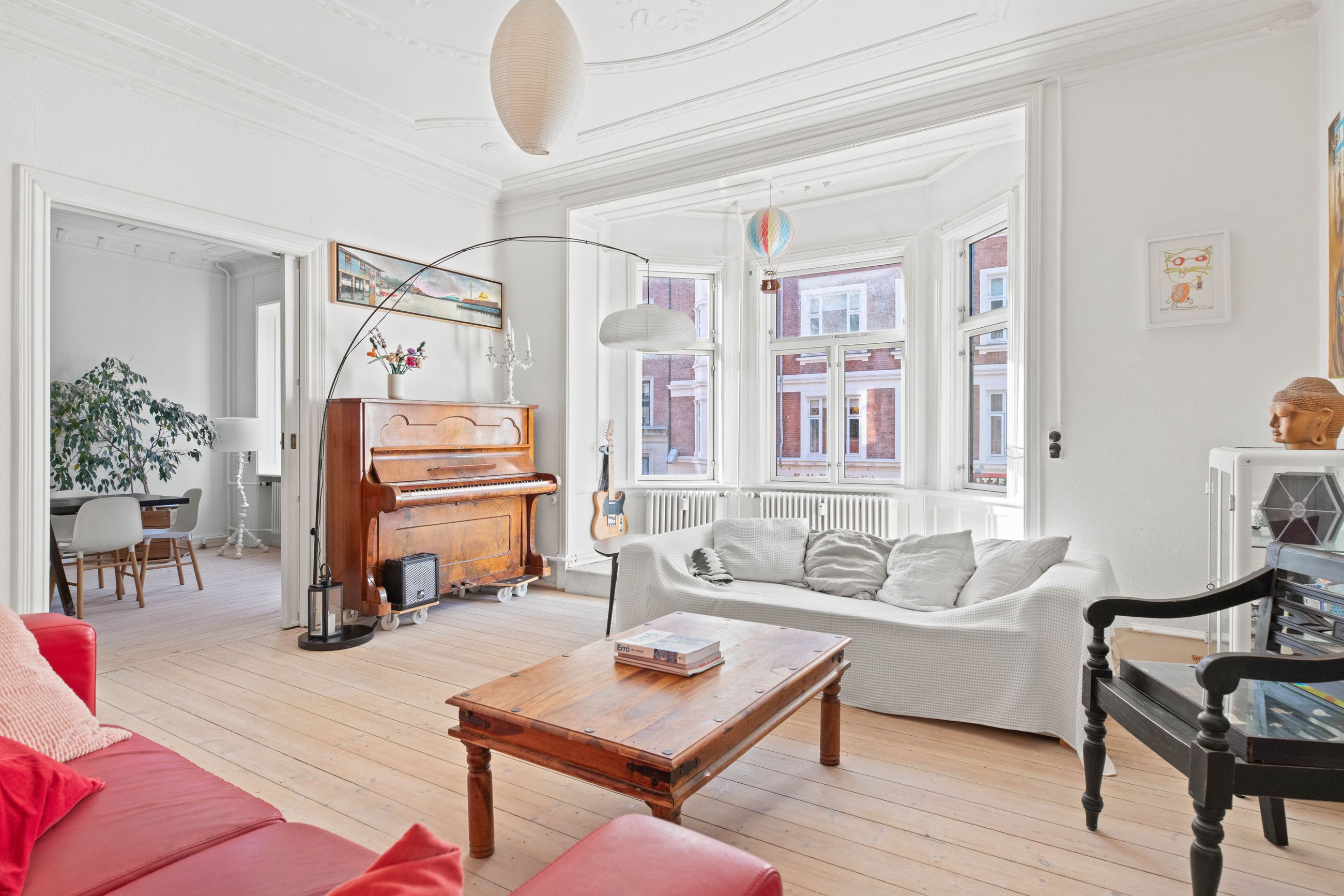 Ejendommen Nordre Frihavnsgade 26 er fra 1875, altså en ældre dame på 150 år. Men de holder sig godt, de ældre damer fra slutningen af 1800-tallet, for de er bygget i den historicistiske periode, hvor man havde modet til at genoptage de klassiske stilarter fra middelalderen, renæssancen og barokken. Altså stuk, rosetter, skydedøre, symmetri, højt til loftet og smukke bræddegulve. Lejligheden på 1. sal er på 183 m2 med mange værelser. Nemlig, her er plads til kontor, børneværelser, musikstue, læsestue, tv-stue, spisestue, svensk kakkelovn, hvad-som-helst-stue. Og så er her altan med morgen- og formiddagssol, tak for det. Som en af de få ejendomme i gaden er her karnapper, så man fra stuen kan kigge langt til højre og langt til venstre. Balkonen i soveværelset får morgensolen, mens stuerne får aftensolen.