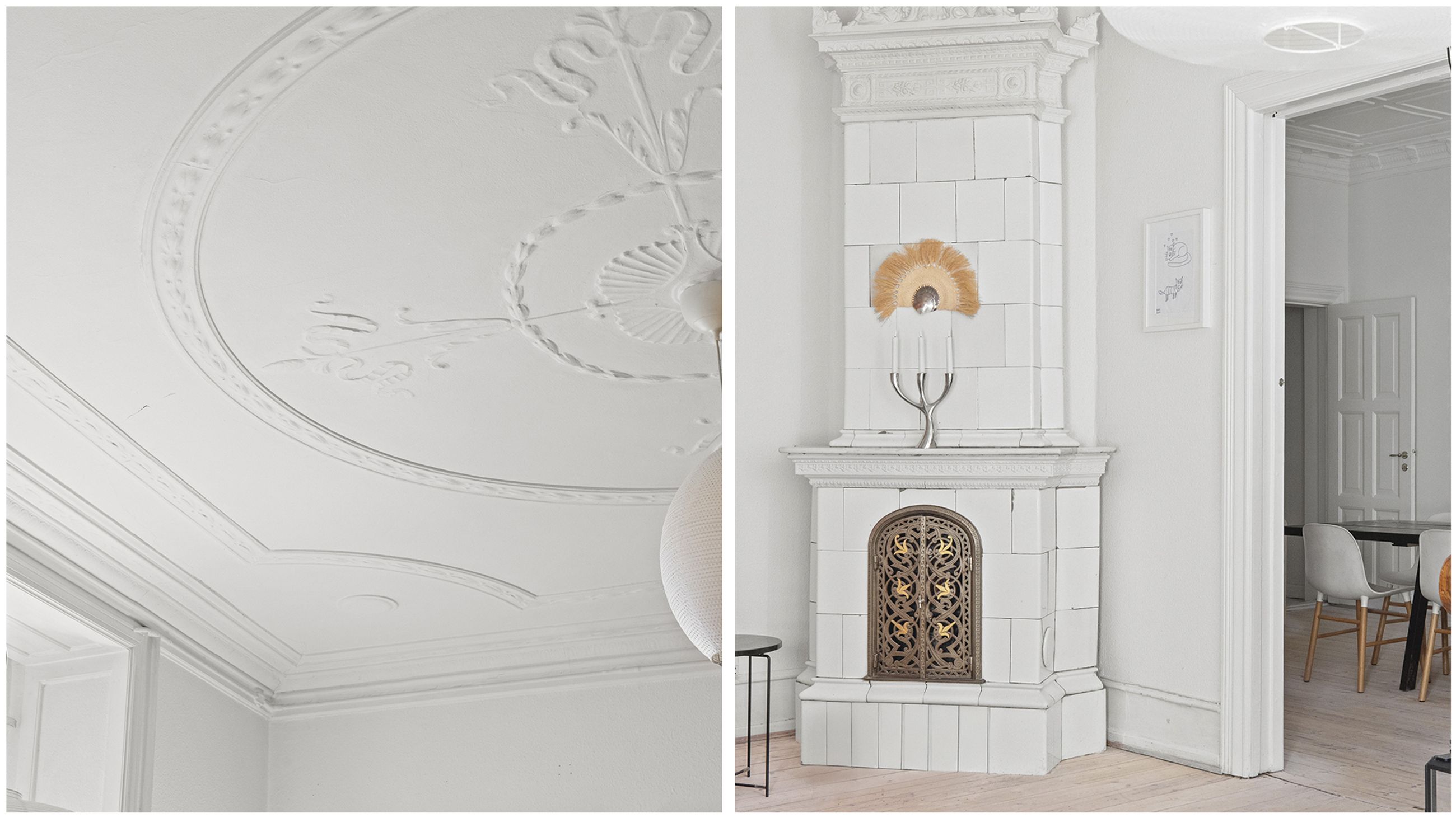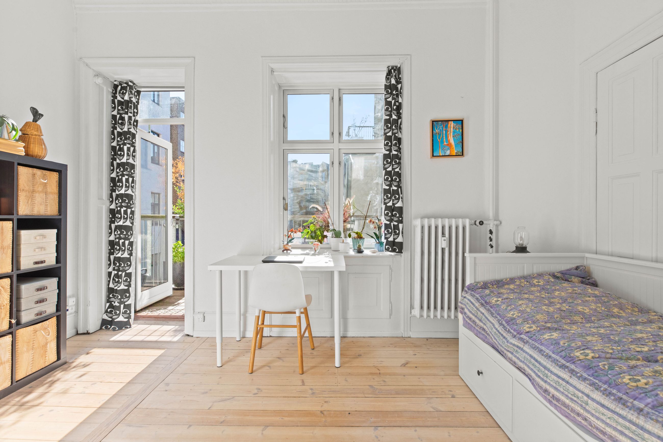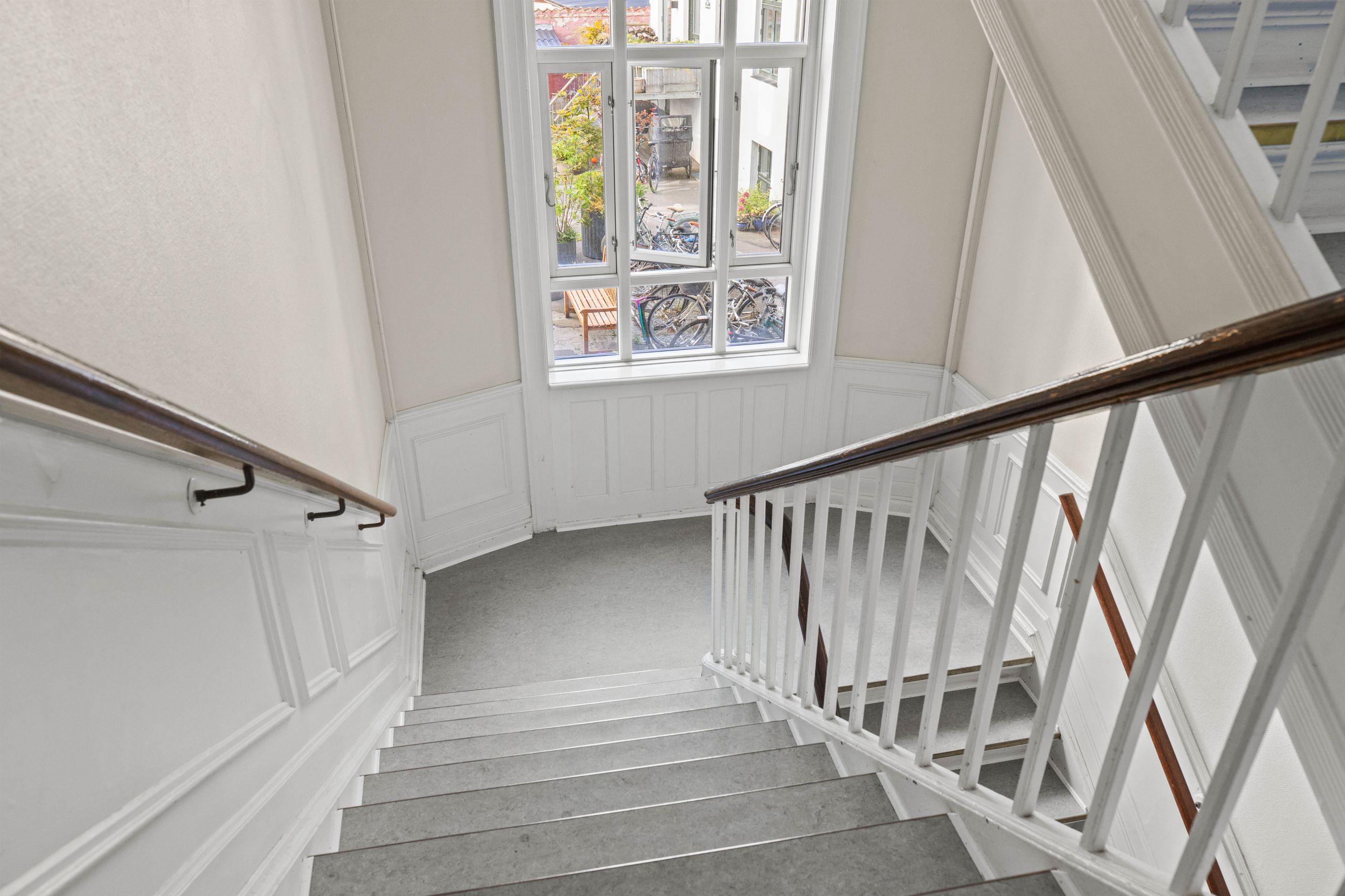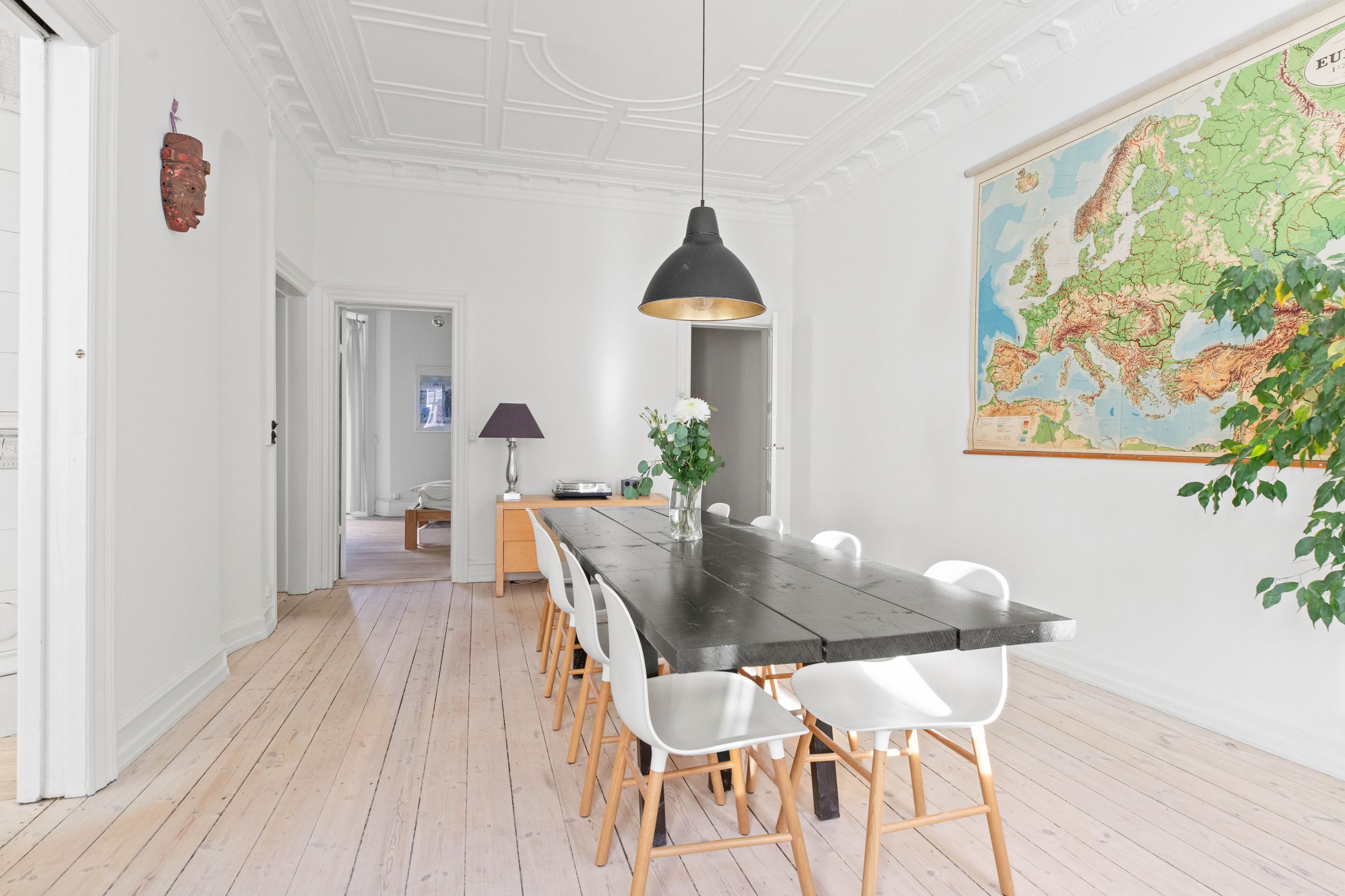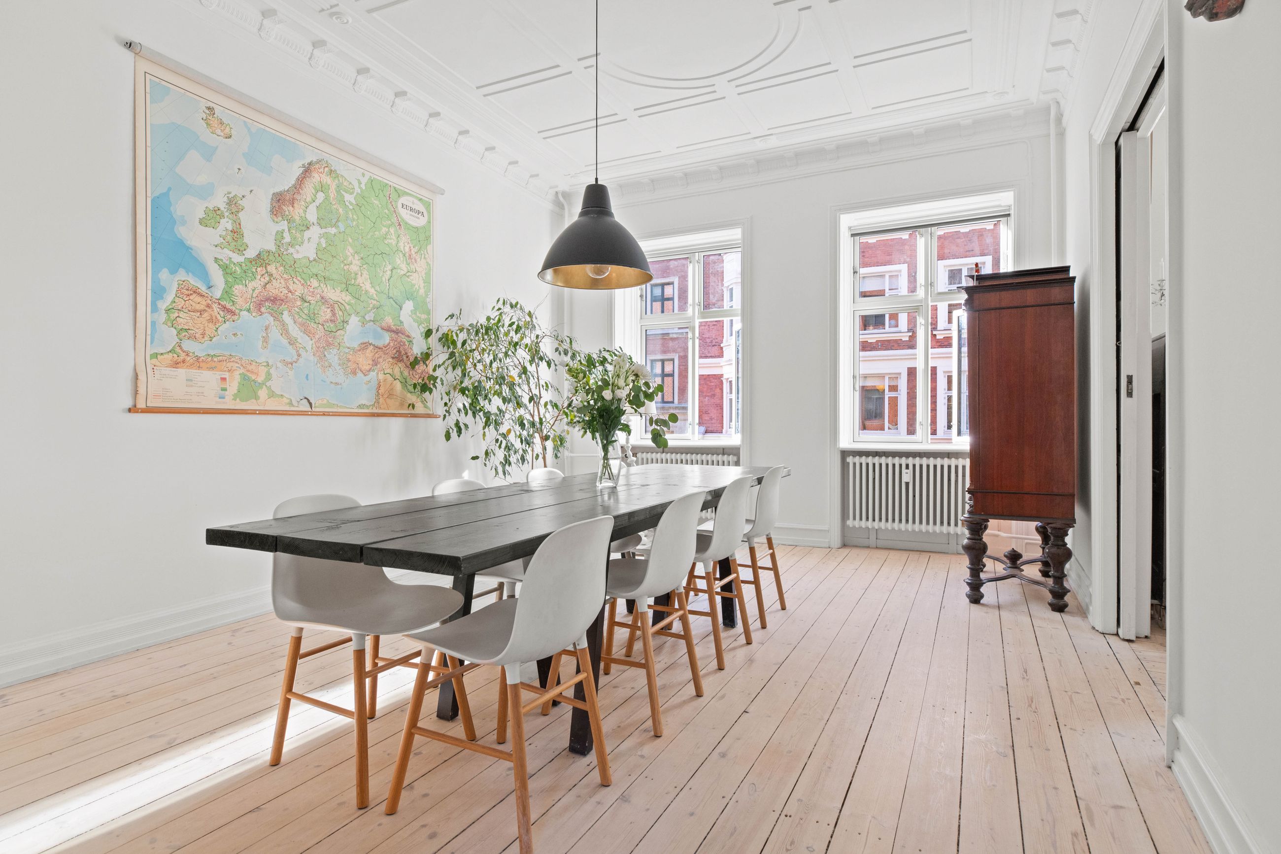 Ejendommen Nordre Frihavnsgade 26 er fra 1875, altså en ældre dame på 150 år. Men de holder sig godt, de ældre damer fra slutningen af 1800-tallet, for de er bygget i den historicistiske periode, hvor man havde modet til at genoptage de klassiske stilarter fra middelalderen, renæssancen og barokken. Altså stuk, rosetter, skydedøre, symmetri, højt til loftet og smukke bræddegulve. Lejligheden på 1. sal er på 183 m2 med mange værelser. Nemlig, her er plads til kontor, børneværelser, musikstue, læsestue, tv-stue, spisestue, svensk kakkelovn, hvad-som-helst-stue. Og så er her altan med morgen- og formiddagssol, tak for det. Som en af de få ejendomme i gaden er her karnapper, så man fra stuen kan kigge langt til højre og langt til venstre. Balkonen i soveværelset får morgensolen, mens stuerne får aftensolen.