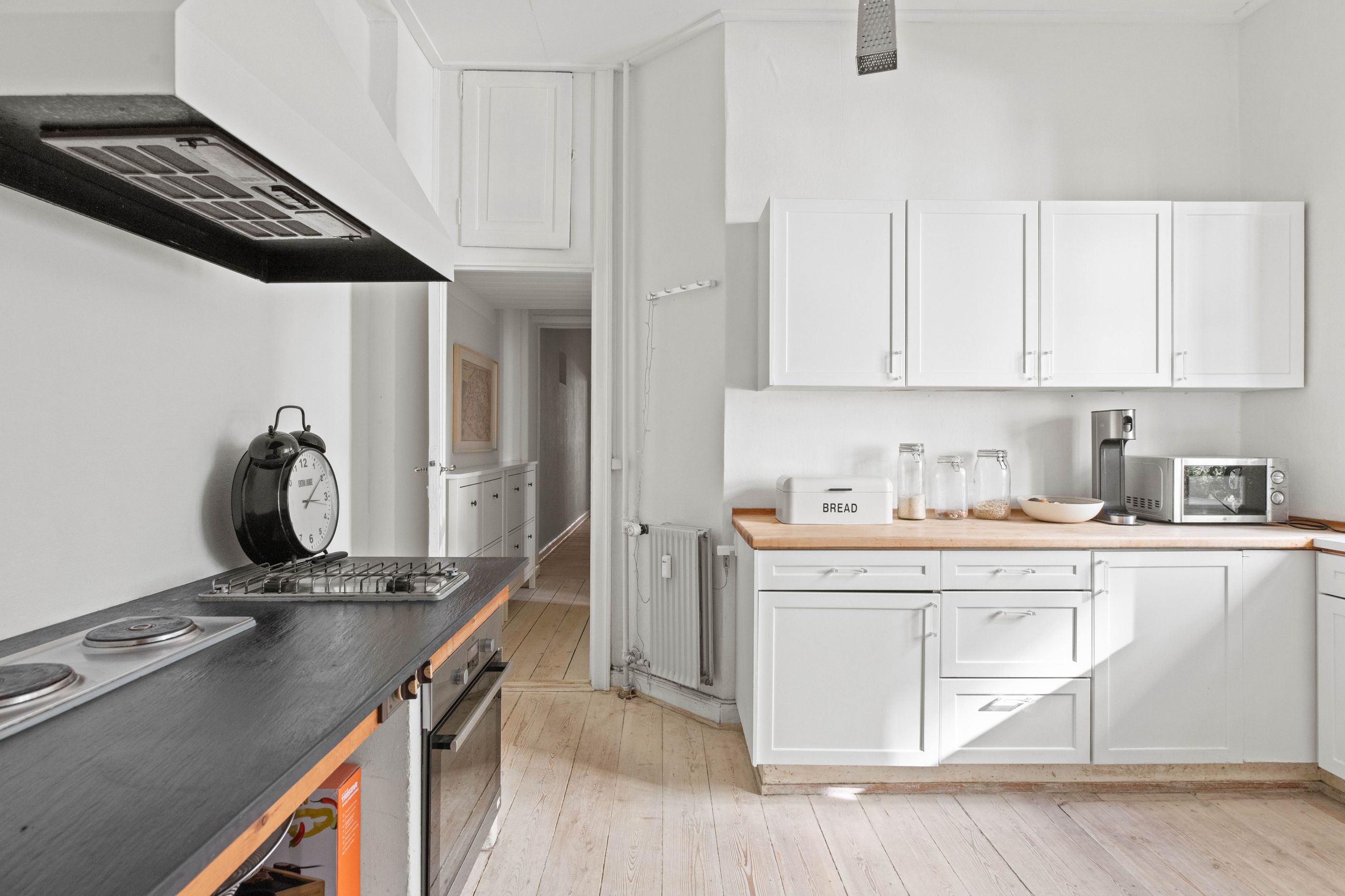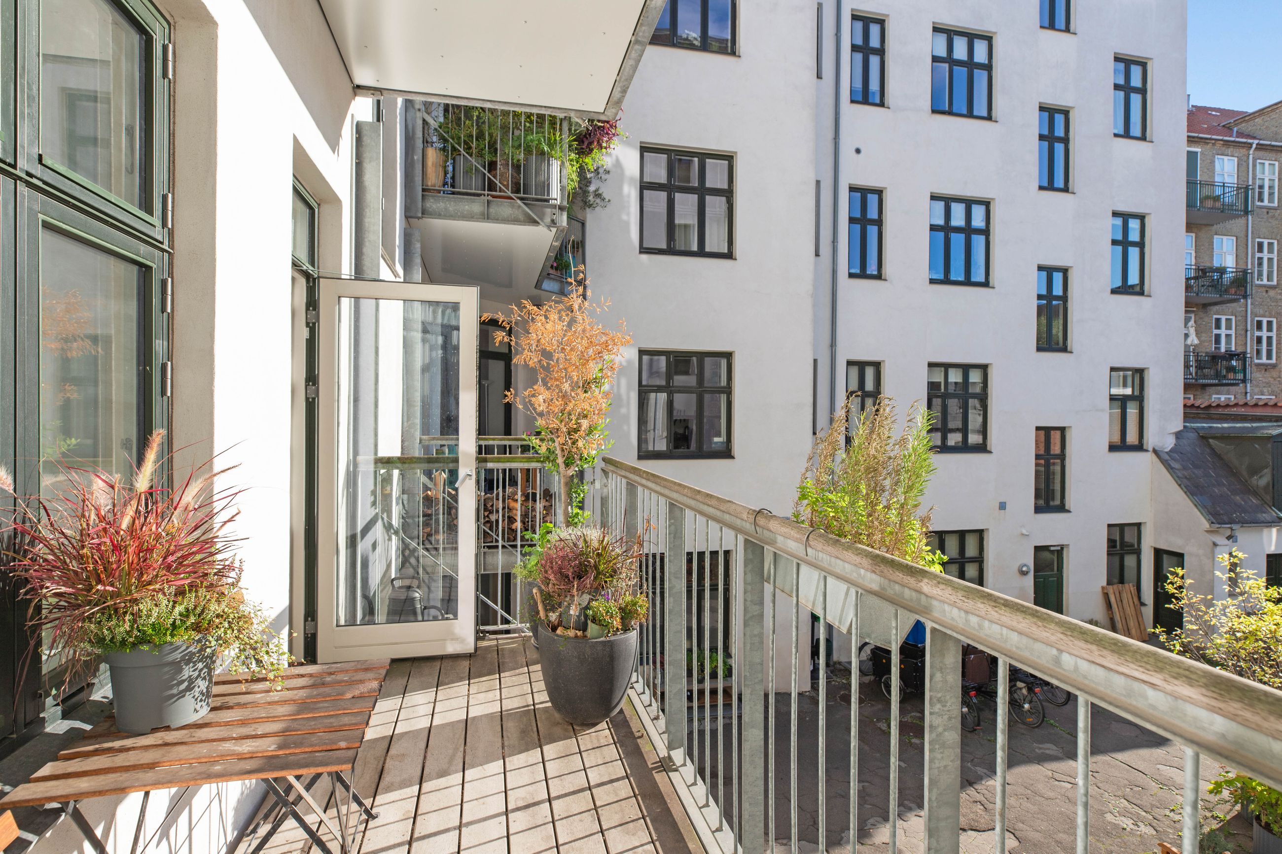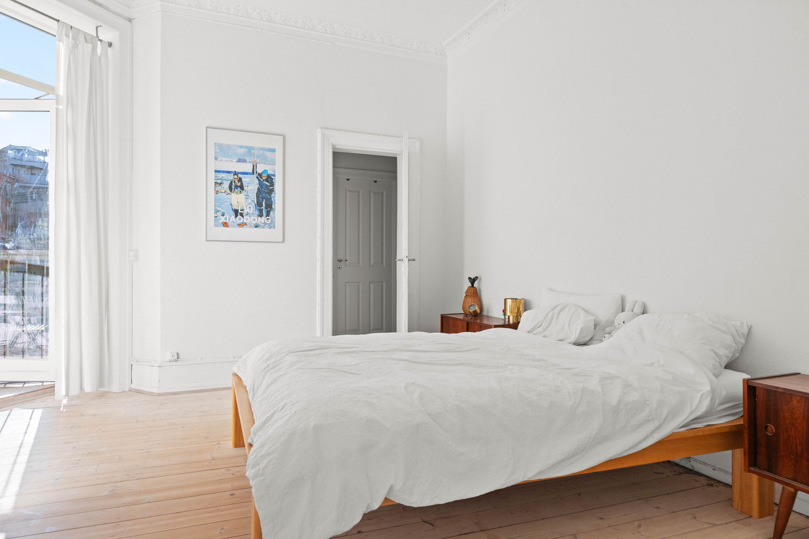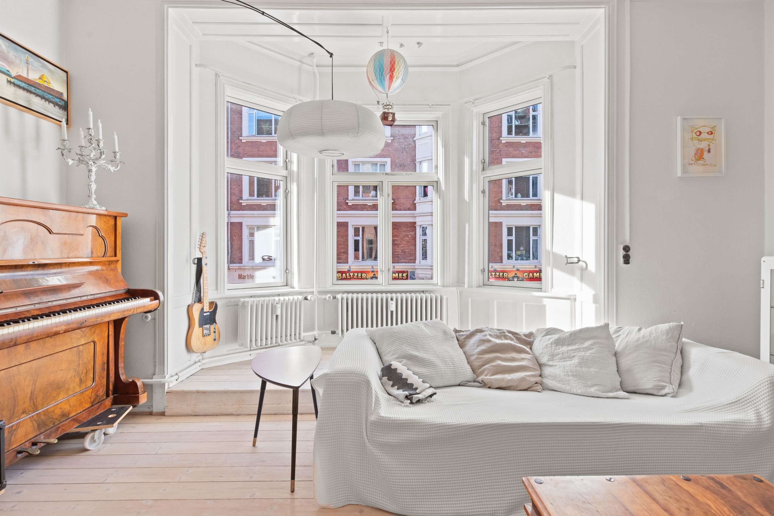 Ejendommen Nordre Frihavnsgade 26 er fra 1875, altså en ældre dame på 150 år. Men de holder sig godt, de ældre damer fra slutningen af 1800-tallet, for de er bygget i den historicistiske periode, hvor man havde modet til at genoptage de klassiske stilarter fra middelalderen, renæssancen og barokken. Altså stuk, rosetter, skydedøre, symmetri, højt til loftet og smukke bræddegulve. Lejligheden på 1. sal er på 183 m2 med mange værelser. Nemlig, her er plads til kontor, børneværelser, musikstue, læsestue, tv-stue, spisestue, svensk kakkelovn, hvad-som-helst-stue. Og så er her altan med morgen- og formiddagssol, tak for det. Som en af de få ejendomme i gaden er her karnapper, så man fra stuen kan kigge langt til højre og langt til venstre. Balkonen i soveværelset får morgensolen, mens stuerne får aftensolen.