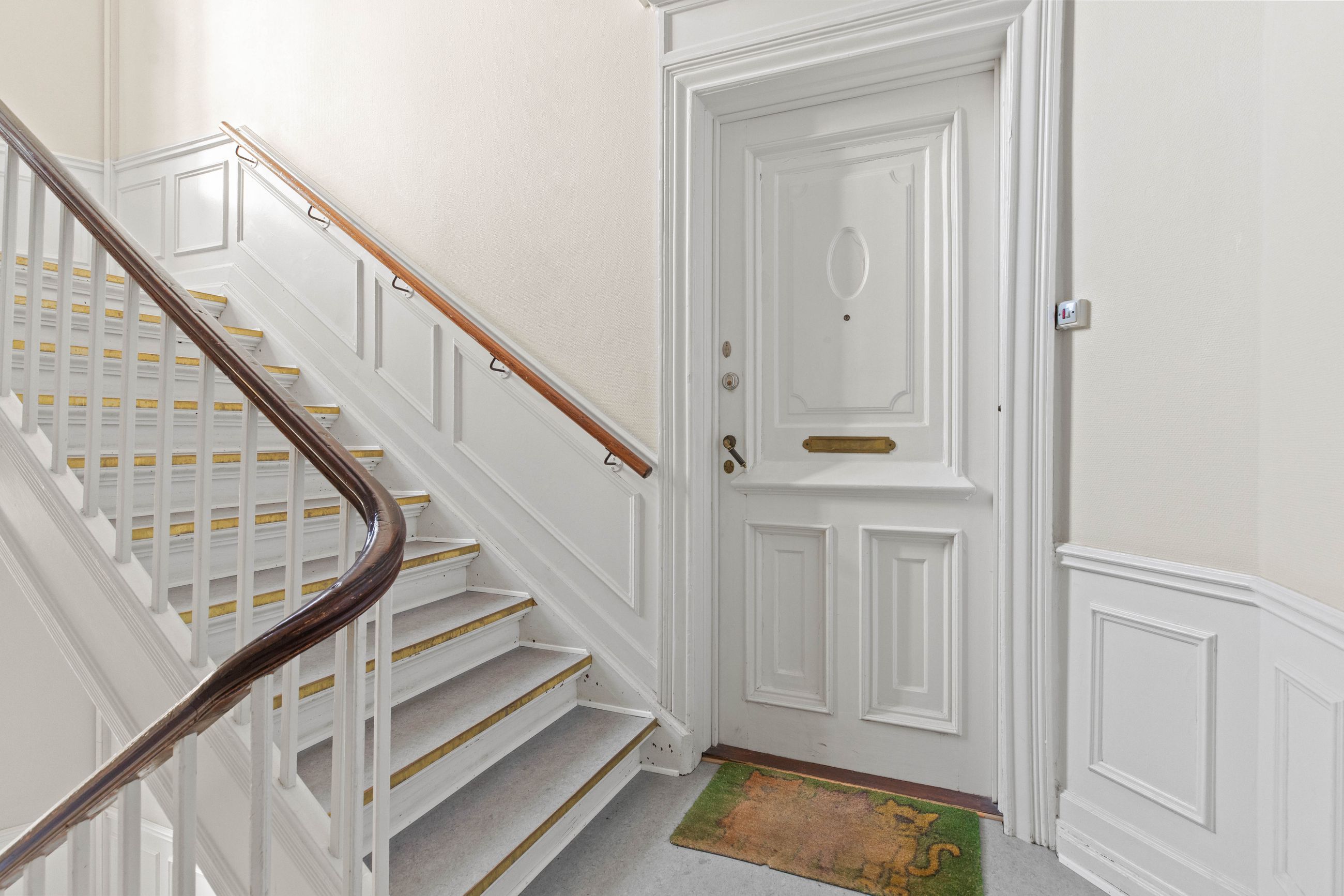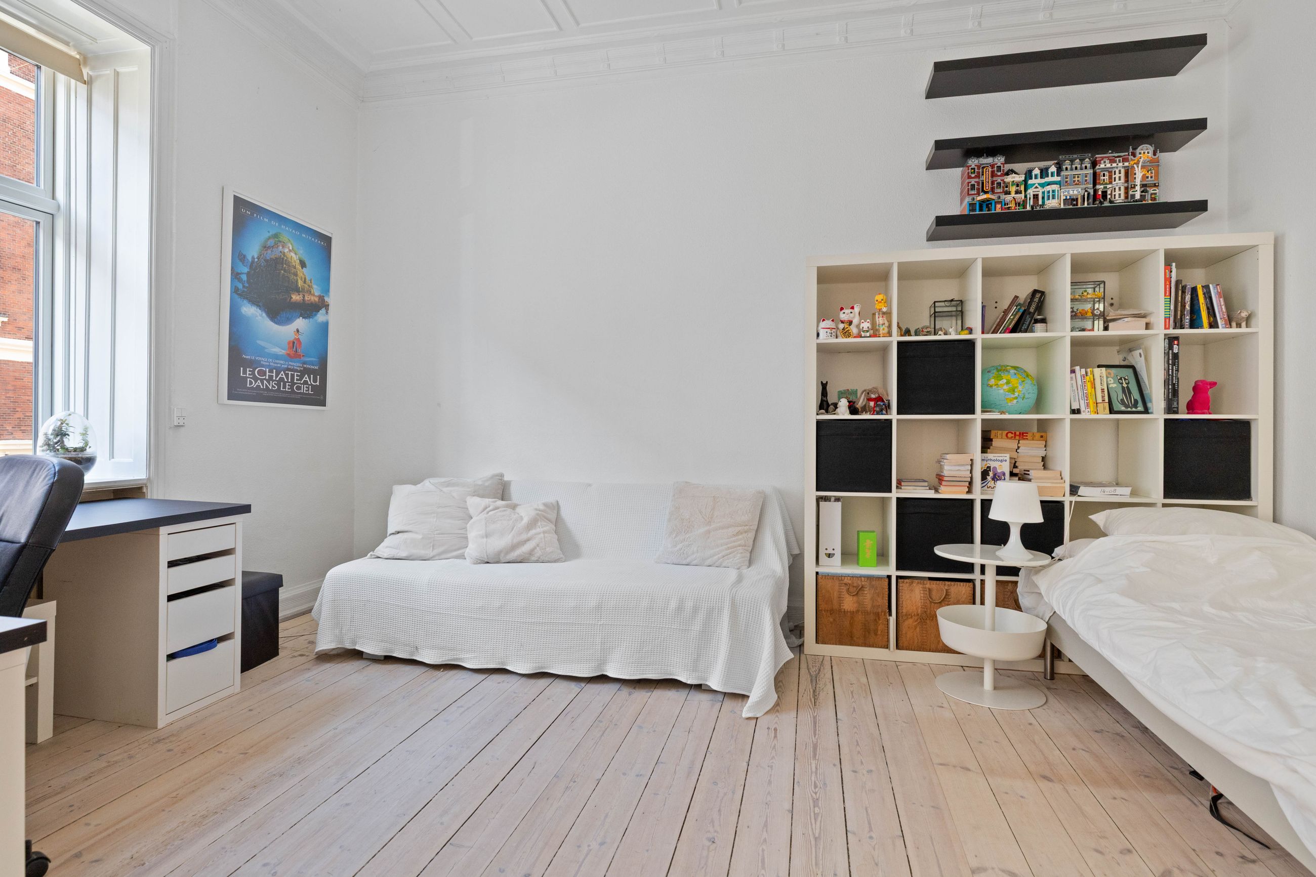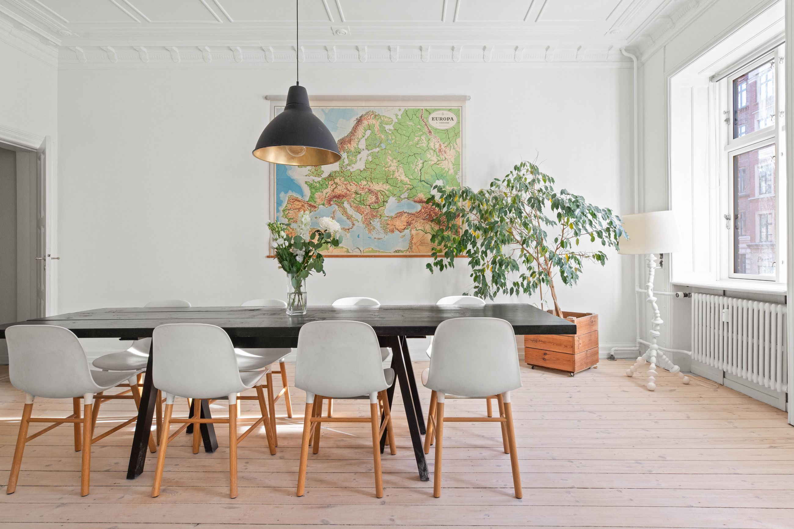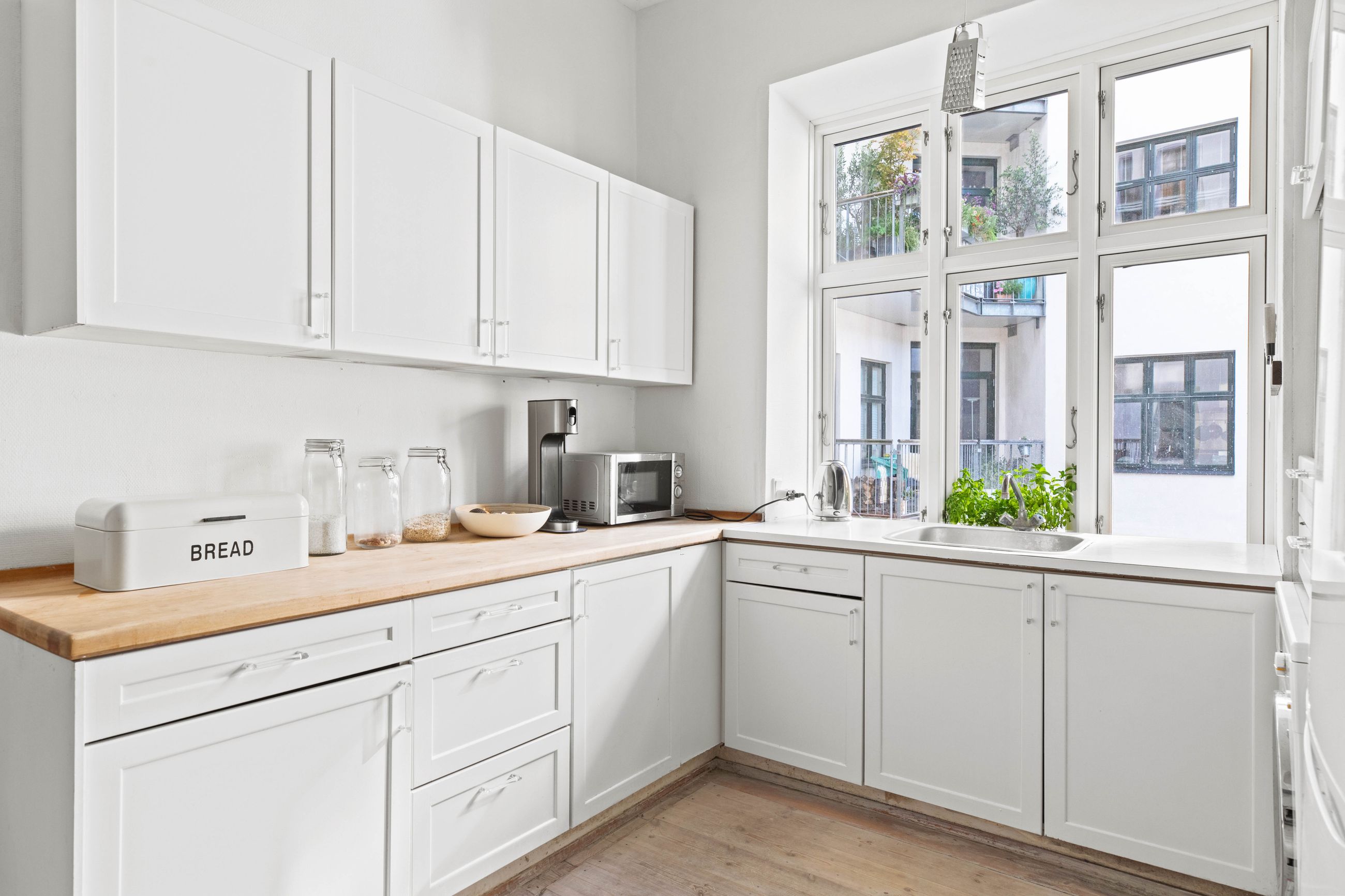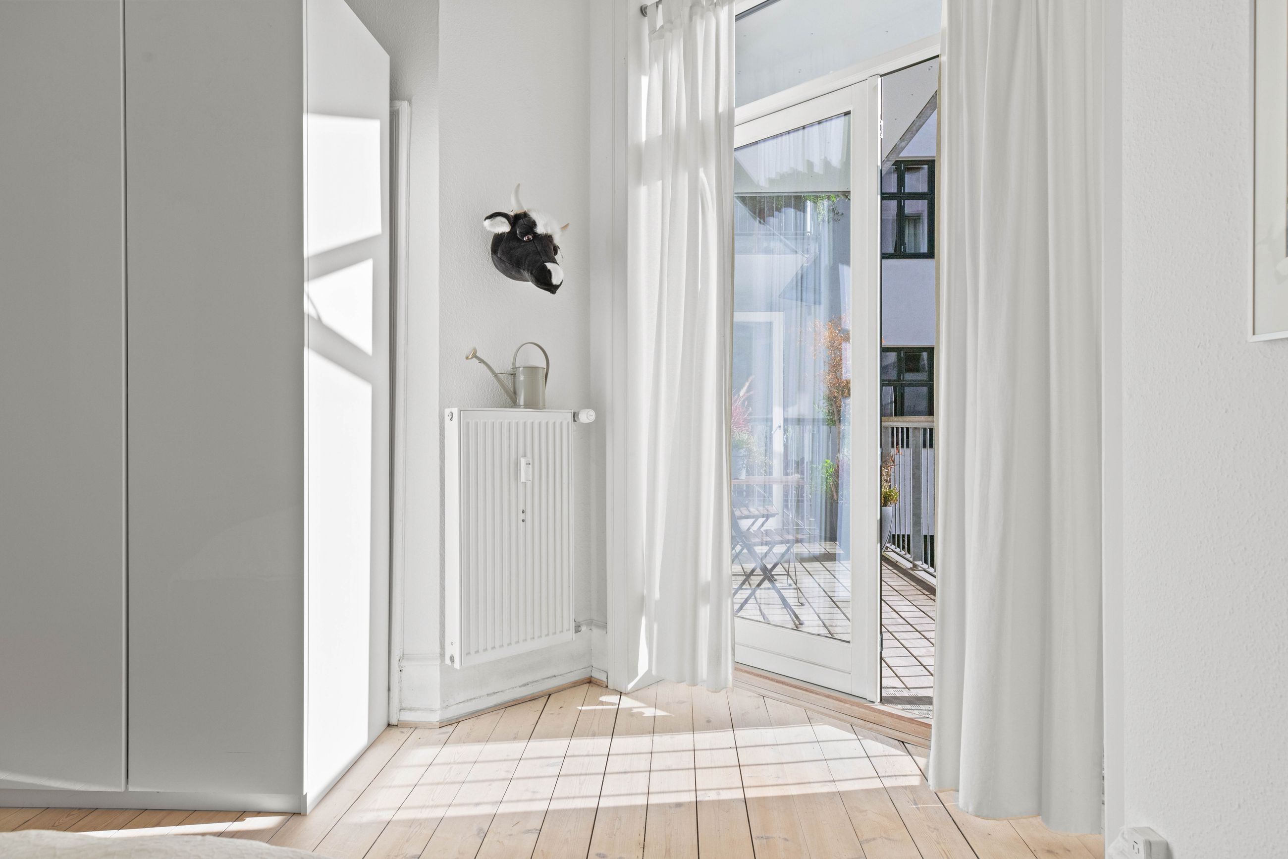 Ejendommen Nordre Frihavnsgade 26 er fra 1875, altså en ældre dame på 150 år. Men de holder sig godt, de ældre damer fra slutningen af 1800-tallet, for de er bygget i den historicistiske periode, hvor man havde modet til at genoptage de klassiske stilarter fra middelalderen, renæssancen og barokken. Altså stuk, rosetter, skydedøre, symmetri, højt til loftet og smukke bræddegulve. Lejligheden på 1. sal er på 183 m2 med mange værelser. Nemlig, her er plads til kontor, børneværelser, musikstue, læsestue, tv-stue, spisestue, svensk kakkelovn, hvad-som-helst-stue. Og så er her altan med morgen- og formiddagssol, tak for det. Som en af de få ejendomme i gaden er her karnapper, så man fra stuen kan kigge langt til højre og langt til venstre. Balkonen i soveværelset får morgensolen, mens stuerne får aftensolen.