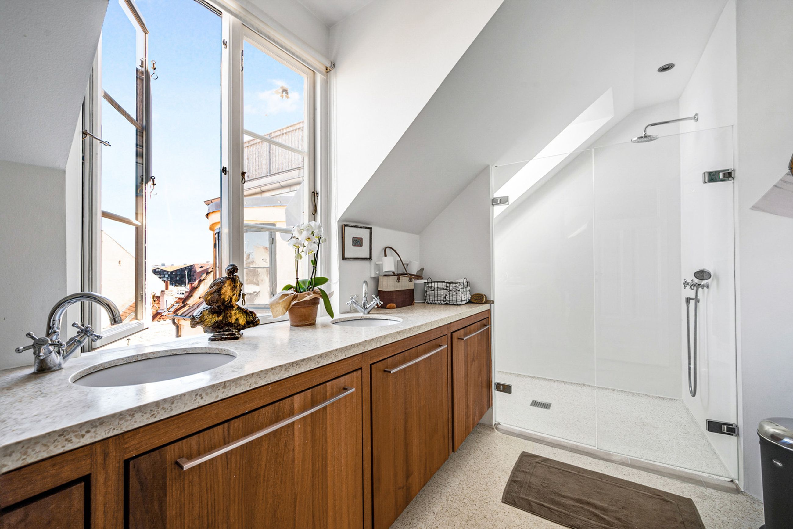 Ejendommen Nyhavn 53 er 270 år gammel. Den har med garanti oplevet lidt af hvert i sømændenes havn, og hvad mon den har tænkt, ejendommen, da håndværkere gik i gang med at renovere den og penthouselejligheden på 4. sal. Herinde og heroppe er der stille som den berømte knappenål, privat og ugeneret. Og udsigt, ikke mindst. Med elevator, med 303 fantastiske m2 fordelt på 2 etager, med vestvendt, privat tagterrasse og sol fra tidligt om dagen til solnedgang, ja, så forstår man for alvor, at fortiden baner vejen for et bedre liv.