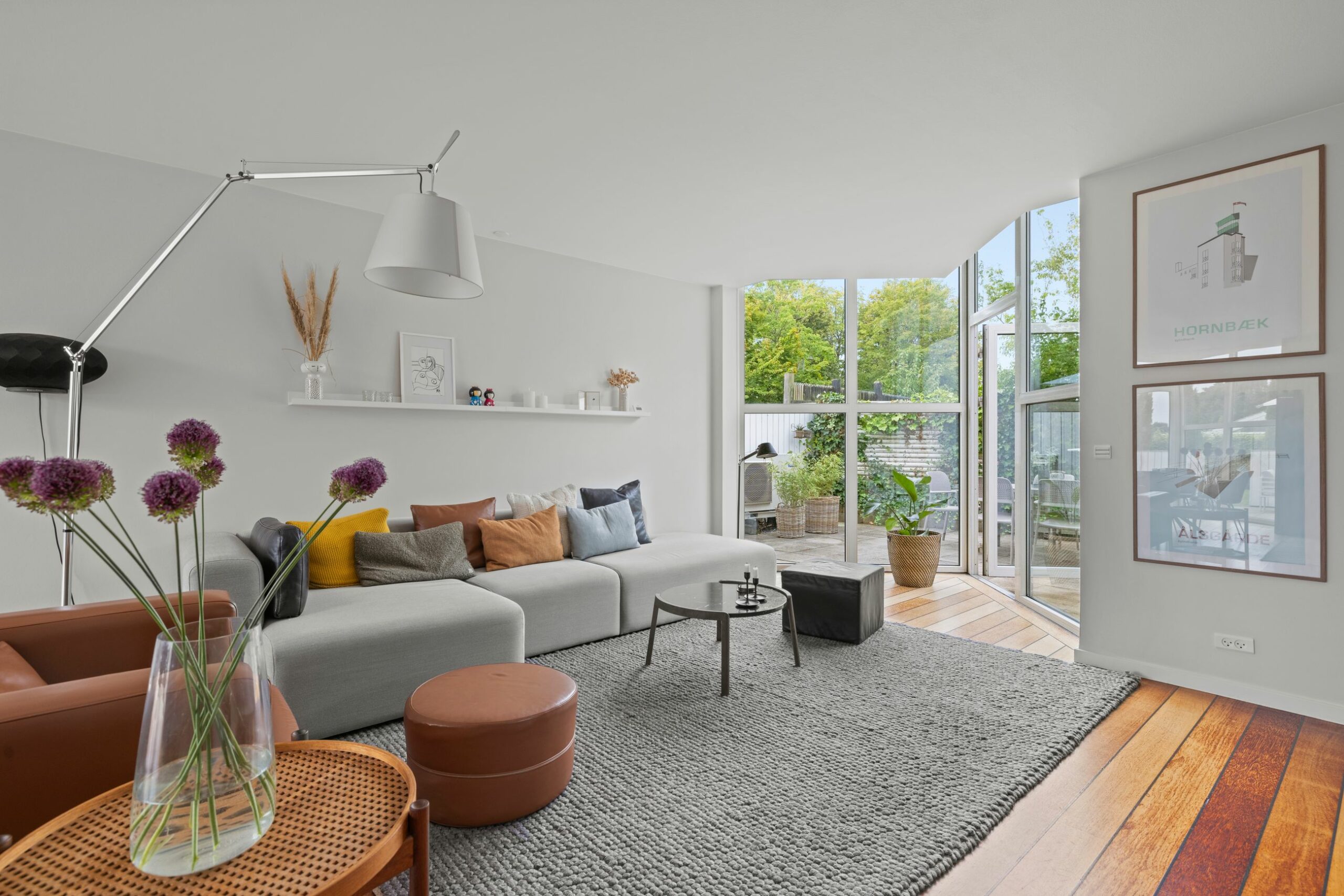 Odinhøjvej 2 ligger på en lille lukket vej bare 500 meter fra stationen og indkøb. Vi er oppe på skrænten som det 4. hus fra Nordre Strandvej. Det er et arkitekttegnet hus fra 1999, og er med sine 150 m2 det ideelle hus til det modne par, men bestemt også til familien med børn. Her er lyssugende karnapper og skæve vinkler, som bekendt giver masser af lys og spændende skygger. Odinshøjvej er en af de mest attraktive veje i Ålsgårde, her er fred og ro, her er rolige omgivelser uden trafikken fra Nordre Strandvej. Jo, man kan høre skibene tutte, når tågen blokerer udsigten, men sådan er det at bo ved vandet. Huset er renoveret gennem de sidste 5-6 år med blandt andet nyt køkken og varmepumpe, så det i dag står i nordisk stil lige til at flytte ind i. Grunden er på 631 overkommelige m2.