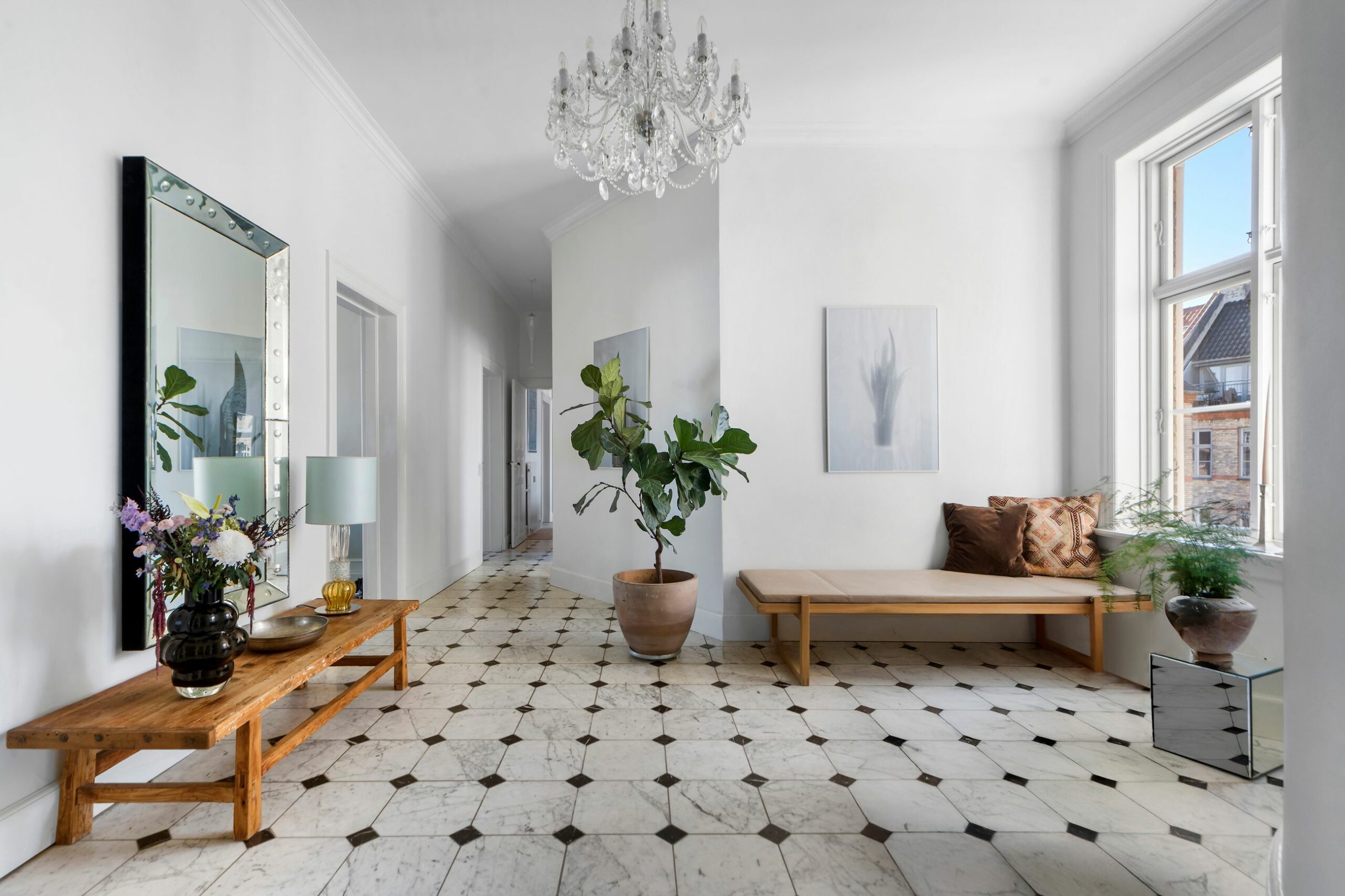 Hjørnelejligheder kan, ikke overraskende, se om hjørner. Men når man er hjørneejendom til Sankt Jakobs Plads, ja, så er det ok at skutte sig lidt, som man nu gør, når man sidder på bagsædet af en bil, hvor de kendte og populære i byen sidder bag rattet. Sankt Jakobs Plads er godt nok bare en musebid af Paris, ja, med franske Michelinkok Daniel Letz på Le Saint Jacques, med salg af gode vine og dristige oste fra den gamle tankstation og caféstemningen og de gode restauranter. Her er økologisk marked alle lørdage, og her får man sig en sludder med tjenerne, der pakker stolene ud for at begynde dagen, her går kokkene over pladsen i deres hvide kokketøj og henter varer på den fine tankstation.