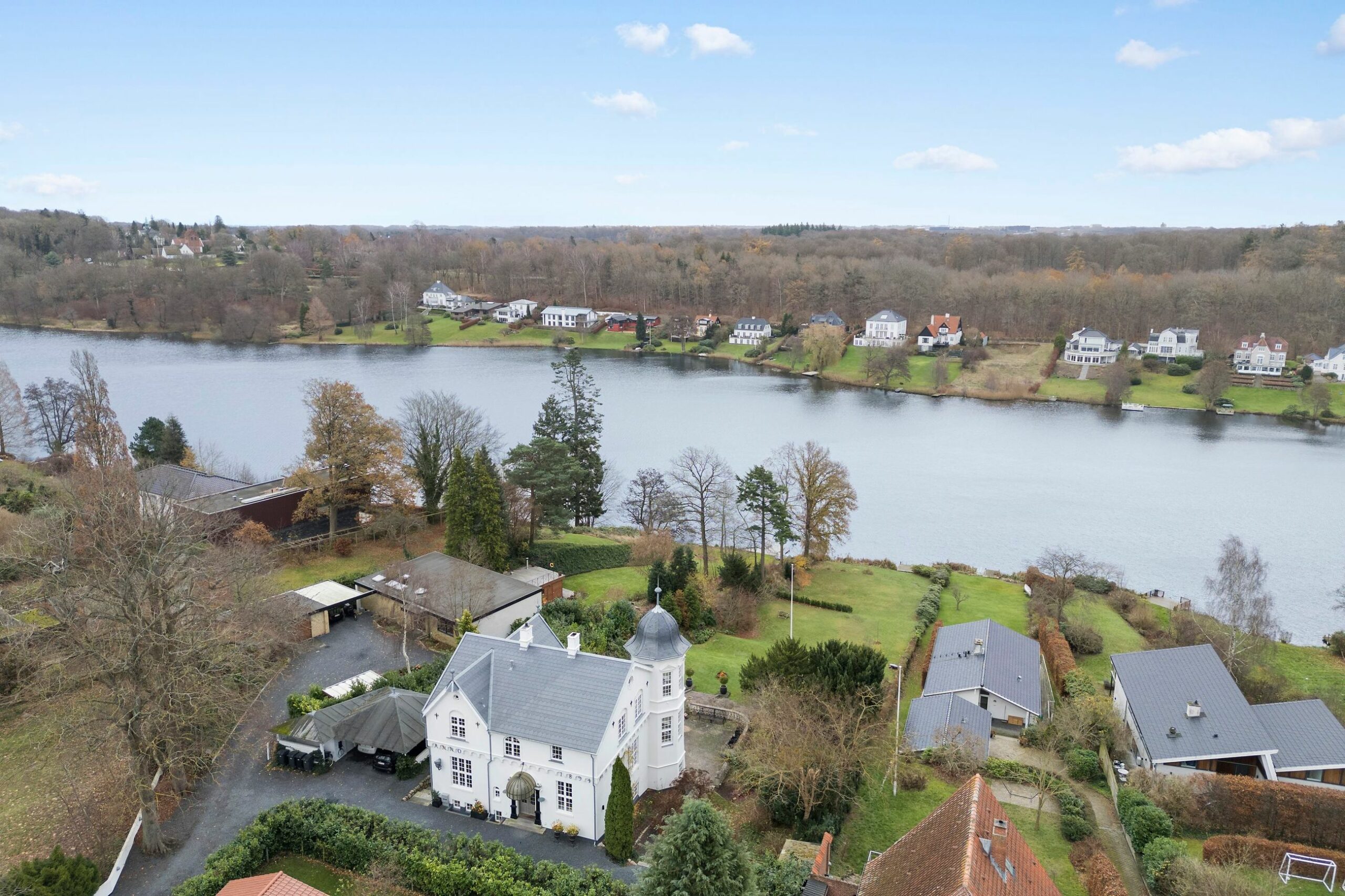 Øverødvej 44B ligger sydvendt på en 2.872 m2 stor grund lige ned til det hele, sø, badebro, rent vand, fisk, robåd. Ganske enkelt en markant ejendom, der med sol hele dagen ikke kunne ligge bedre. Grunden skråner med det fineste trappeløb ned mod søen. Der er vand, skov, landsbyen Søllerød og Søllerød Kirke i udsigten. Huset er på 362 etagemeter, hvor de 133 m2 ligger i underetagen. Her er masser af plads til familien med børn og familien med børnebørn. Det er bygget i 1894 som et slot med både tårn og spir. Her er de smukkeste håndværksdetaljer som rosetter og stuk, høje paneler, tunge fyldningsdøre og en uforskammet, smuk kakkelovn, hvis mage vi aldrig har set. Alt er renoveret fra skifertaget og spiret og hele vejen ned. Det ligger højt i terrænet, højt er godt, højt er udsigt.
