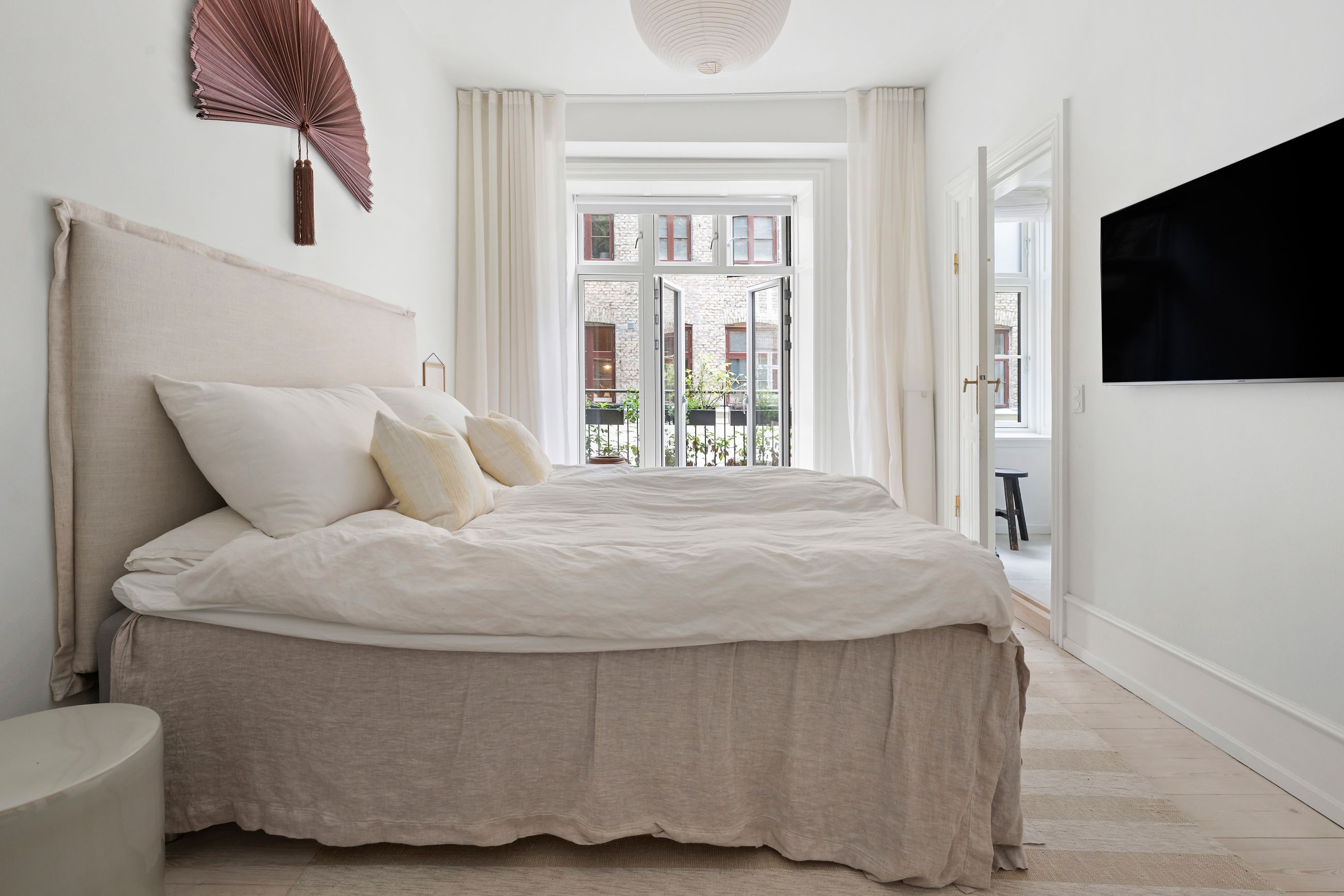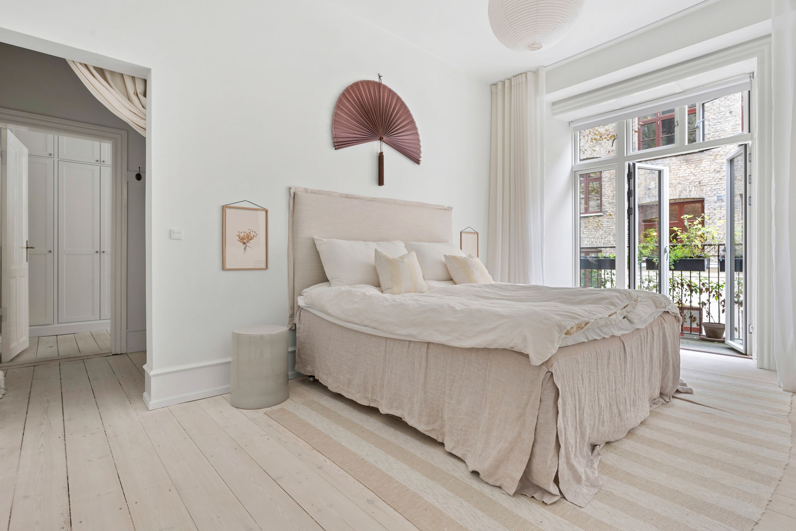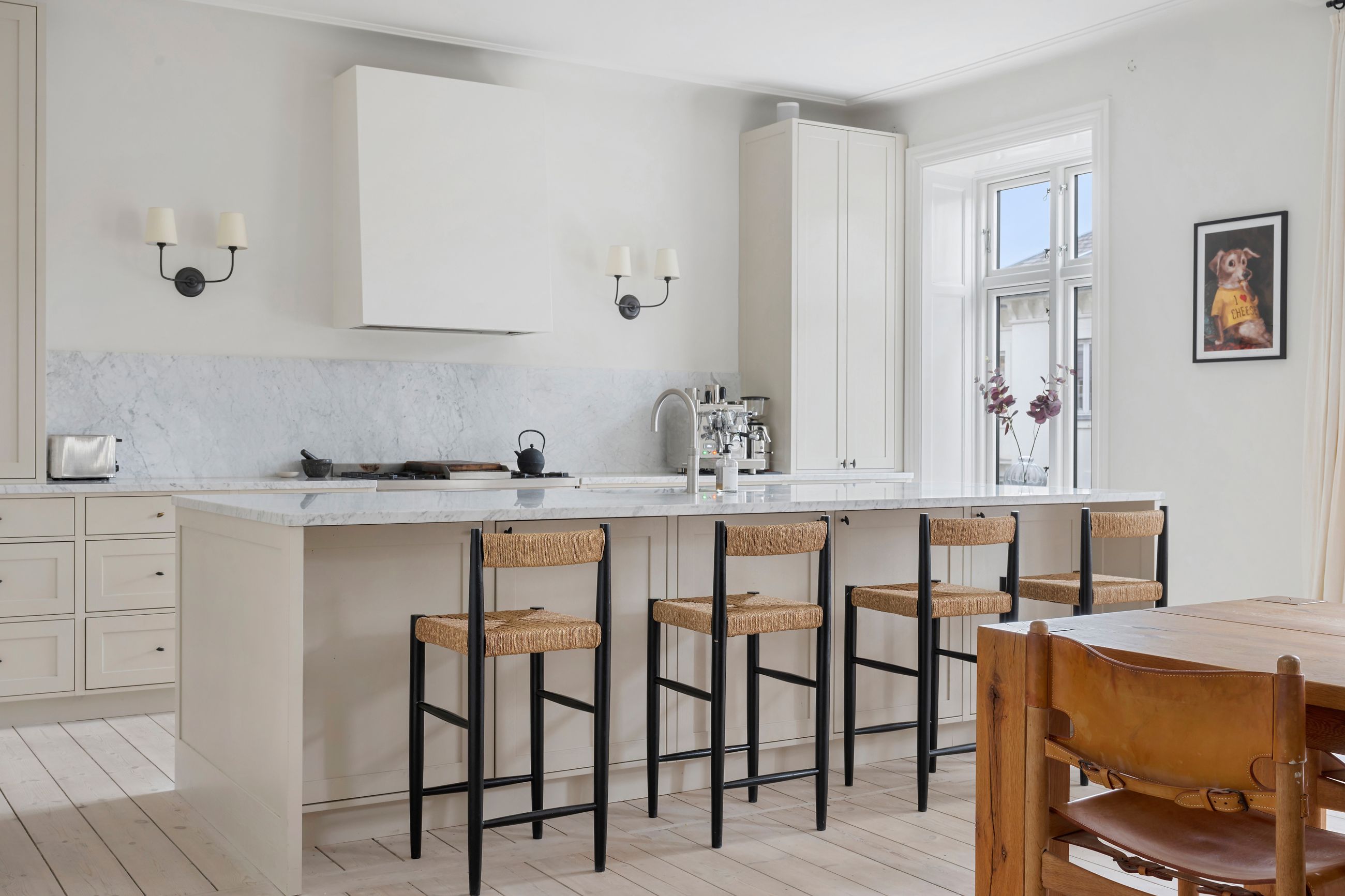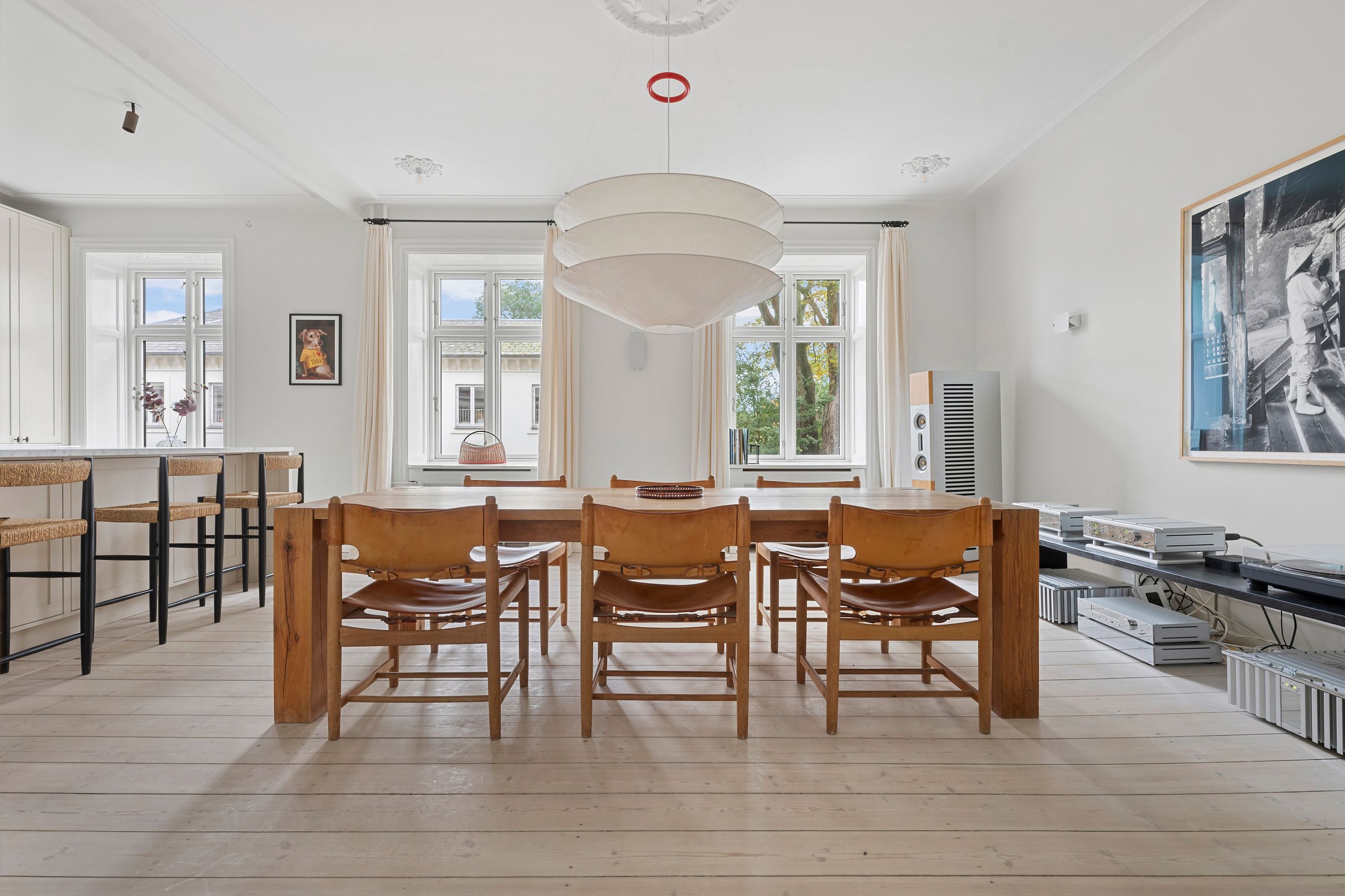Rosenvængets Sideallé lyder som en parentes, men altså, alléen er et åndedrag i hjertet af Østerbro. Det er en vej med liv, glade ansigter og ejendomme fra en tid, hvor man byggede med værdighed. Platantræerne på alléen råber ikke, de ved, at opmærksomhed godt kan gå på listesko. Ejendommen i nummer 3 er fra 1901 og ligger på 1. sal, hvor alle 220 m2 er renoveret til den toplækre og moderne lejlighed, den er i dag. Slet ikke til at forstå, at her kan være så stille på Østerbro. Gennemtænkt med masser af plads, lækkert køkken og lækre badeværelser i en sund ejerforening. Gården er også renoveret for 3 år siden, et helt vidunderligt fristed med spiseplads under det store platantræ. Gennem bagtrappen er der direkte adgang til lejlighedens private kælderrum.