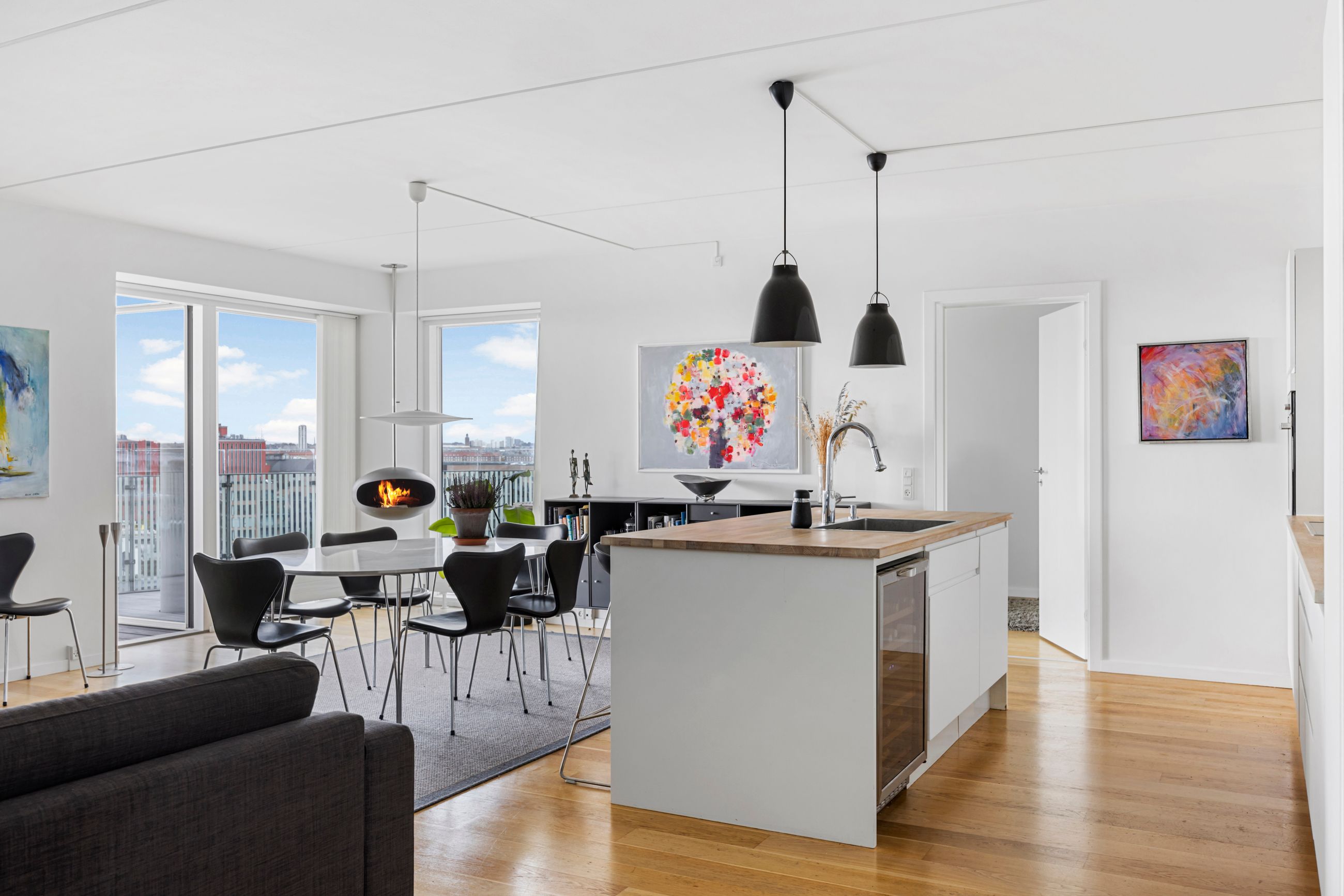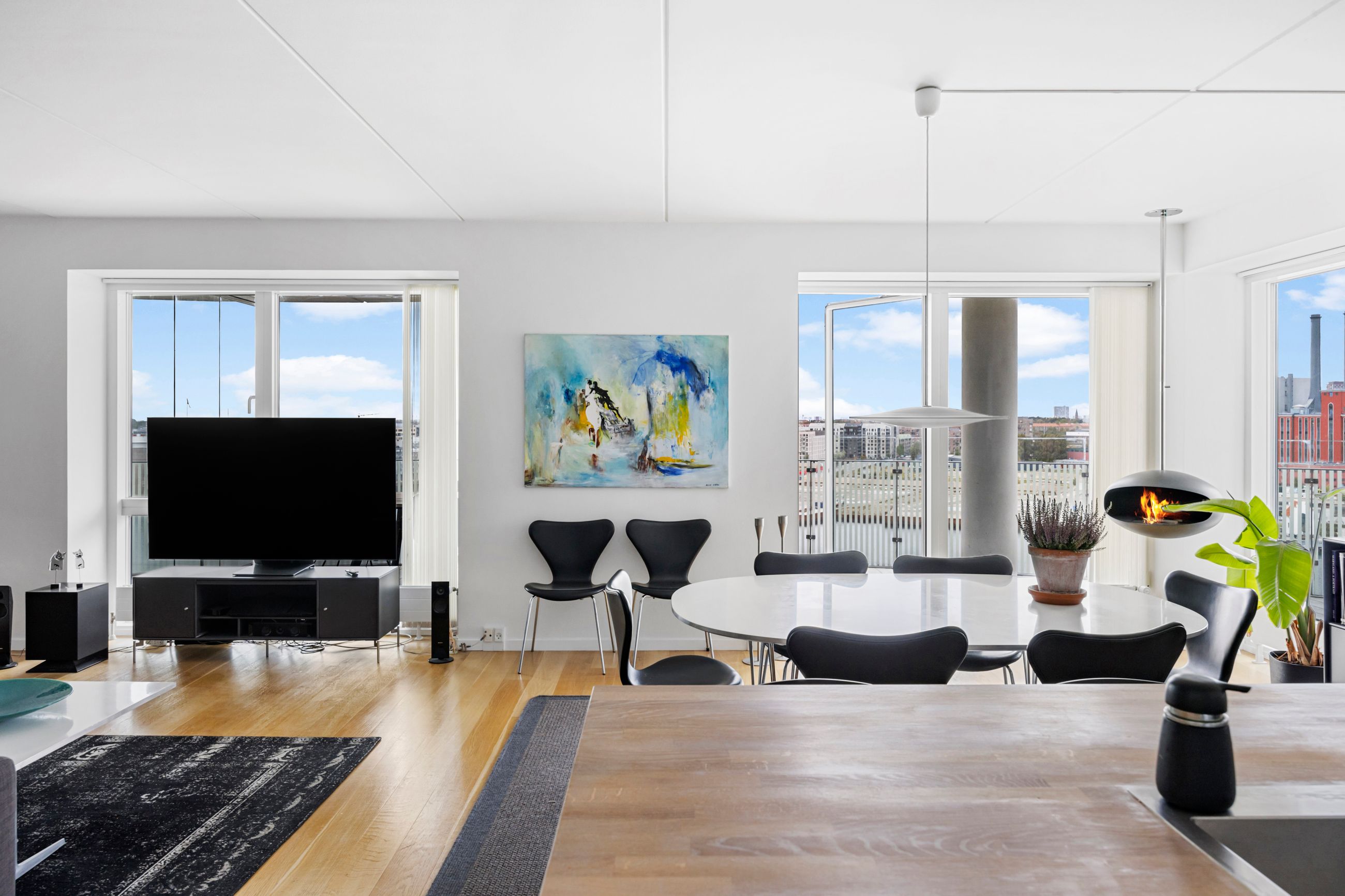 Udsigten over Sydhavnen, den københavnske skyline og Amager Fælled er fantastisk. Her kan man sidde ugeneret og blive helt væk, selv mågerne gider ikke flyve herop. Ejendommen er den højeste af 3 tårne bygget i 2014 i den sydlige del af Islands Brygge med natur, havn og byliv. Her er plads nok til familien med børn, som får hver deres afdeling. Privat parkering i kælderen med elevator hele vejen op.